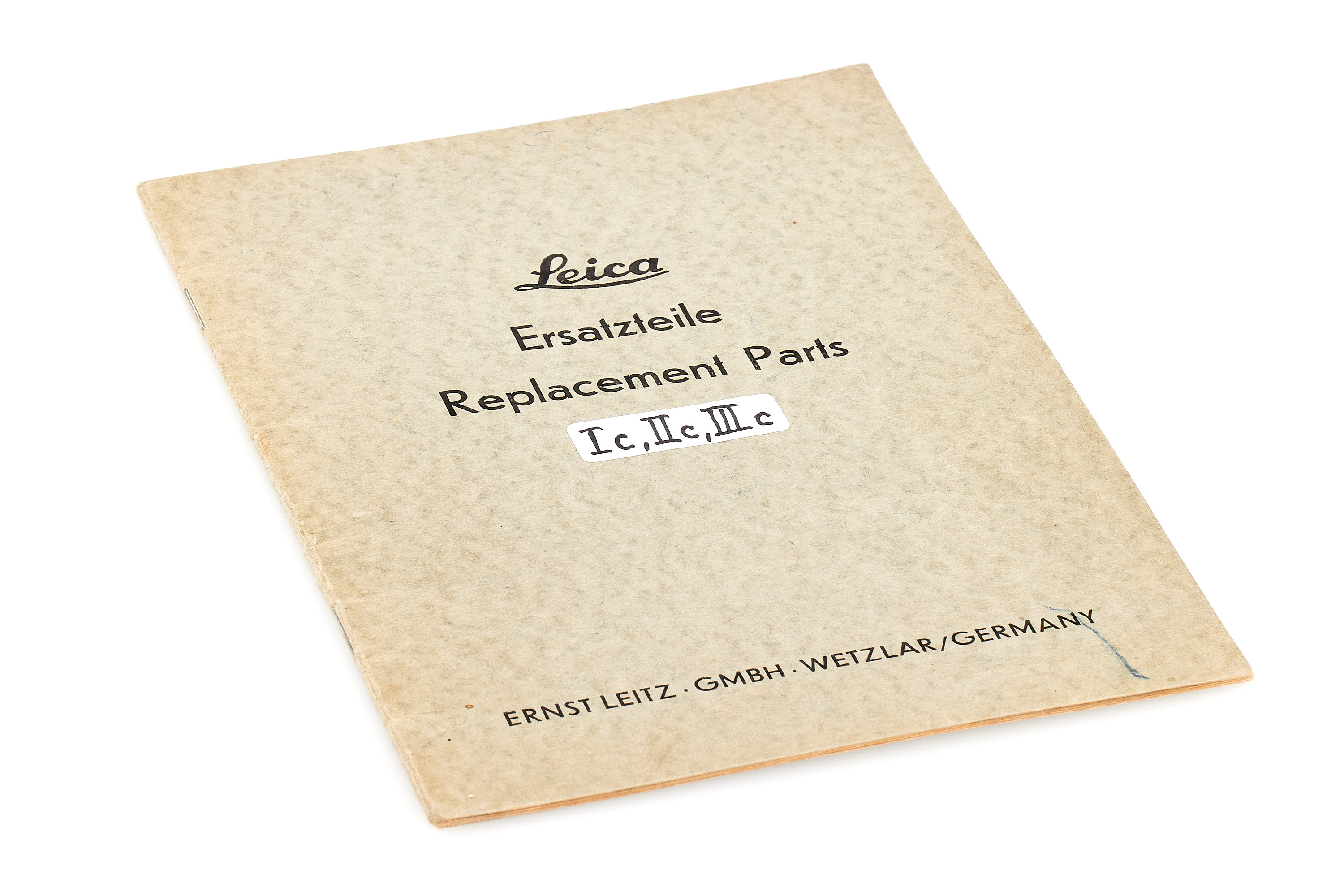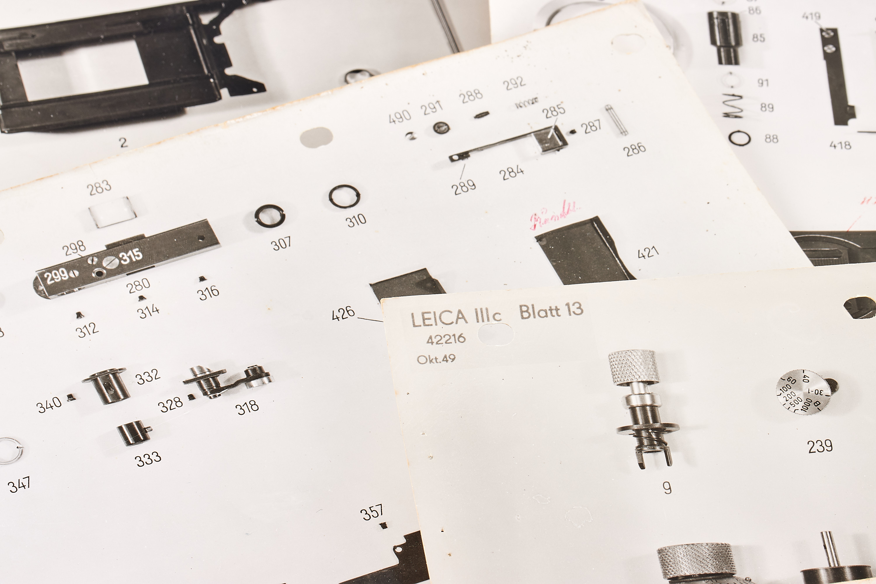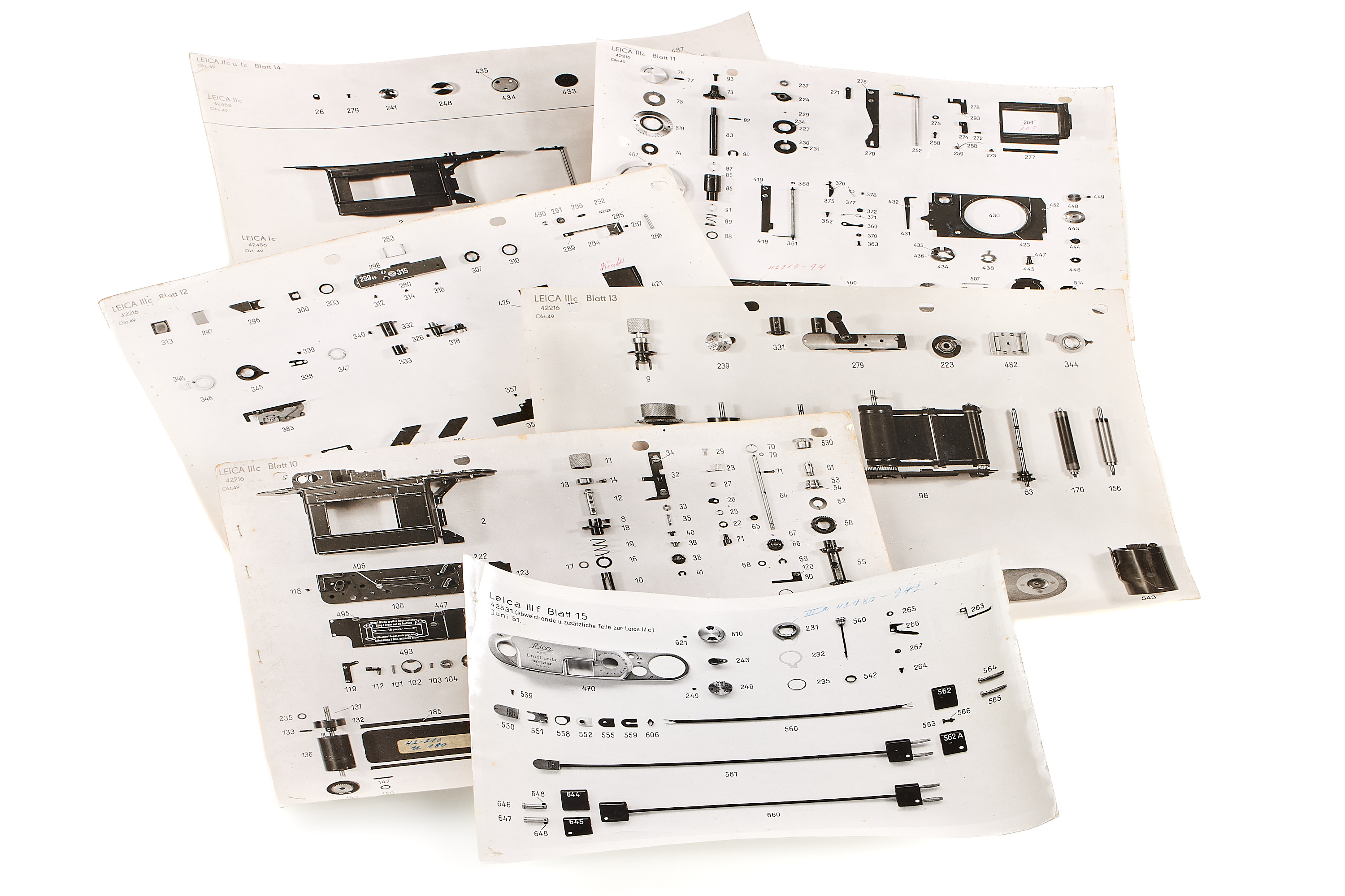 A very attractive list of Leica I to IIIc spare parts in excellent condition, for internal use by Leitz, including photo pages 10-15 (a complete set) with exploded views of the cameras, and Leica IIIg photo book with exploded views of all components.