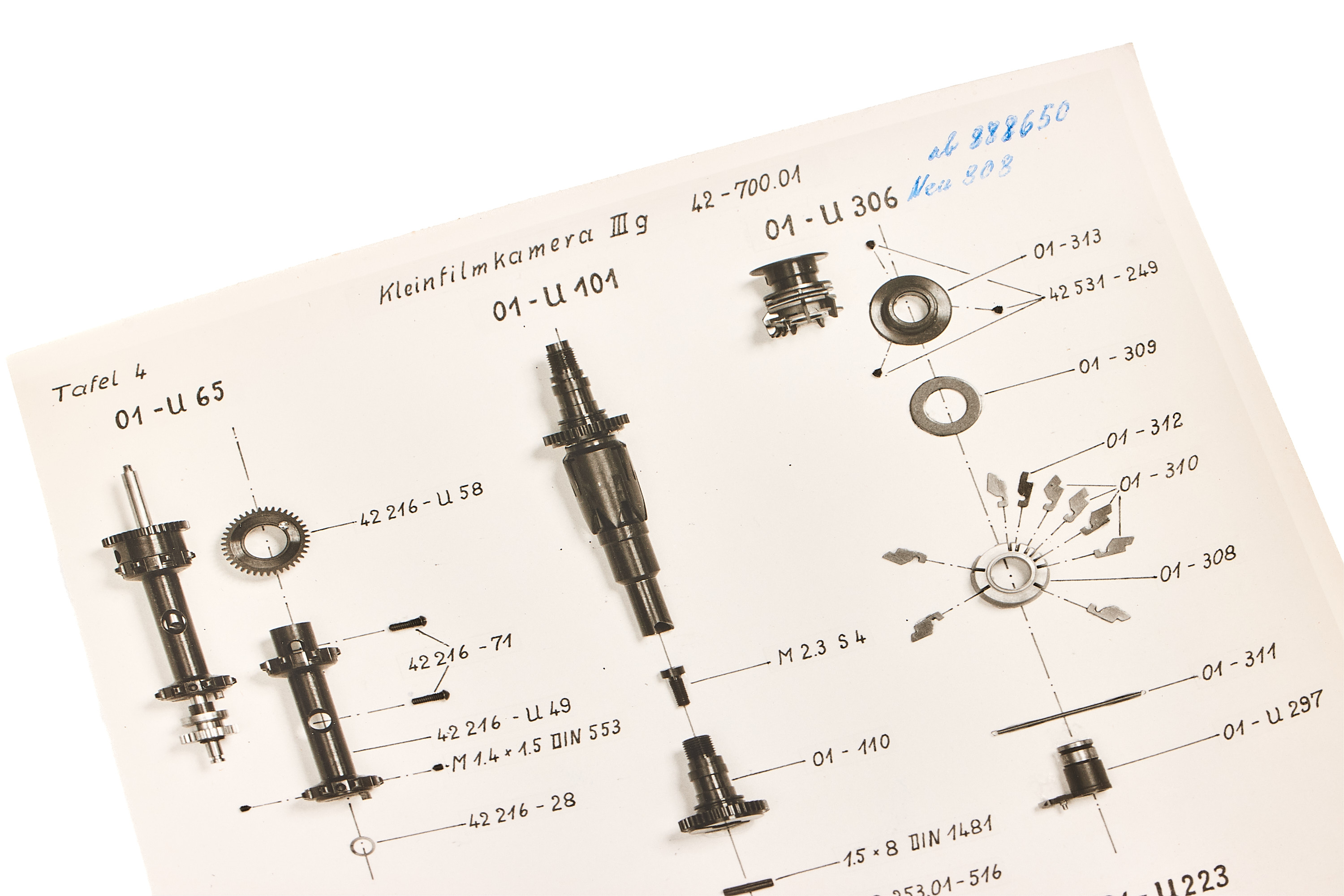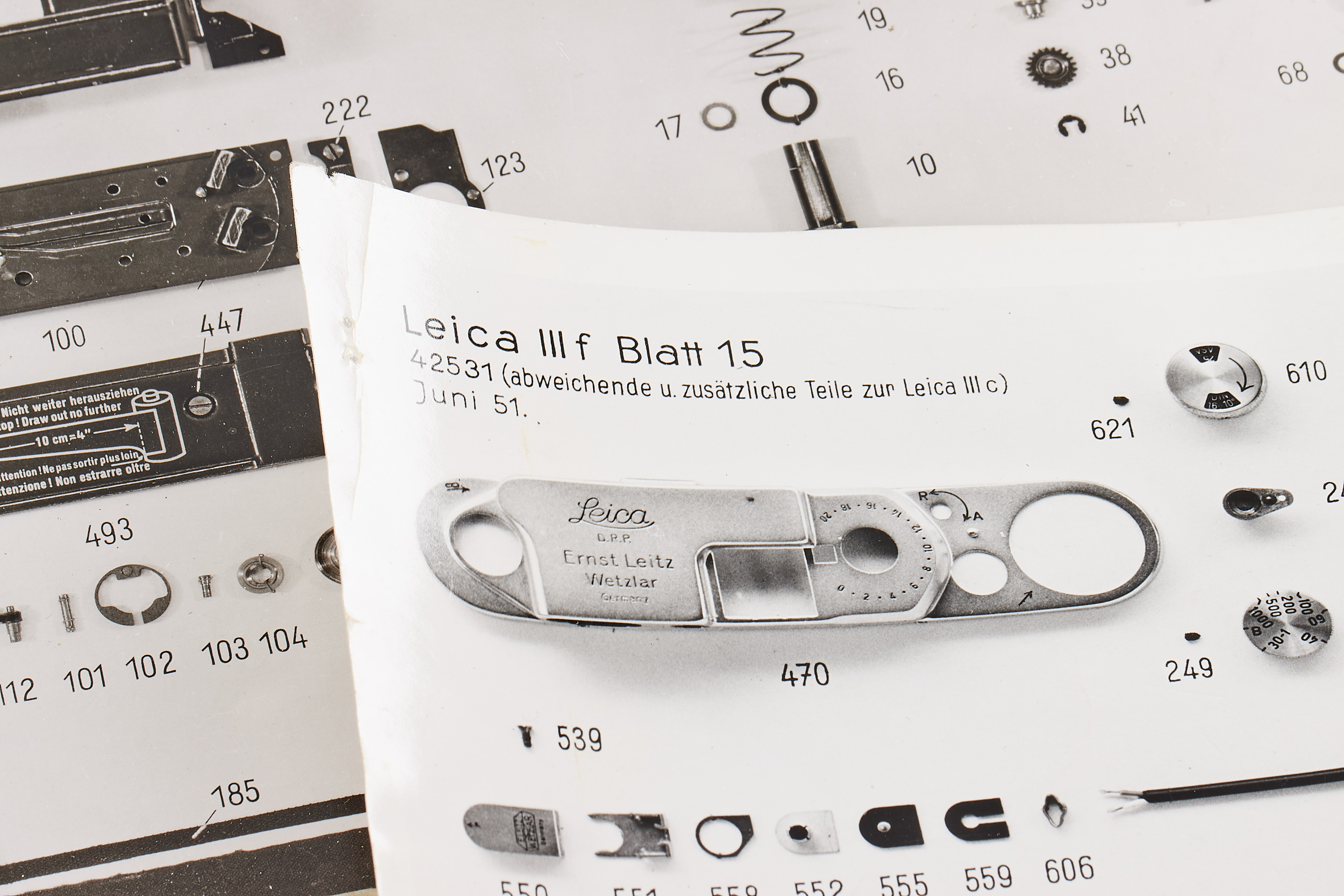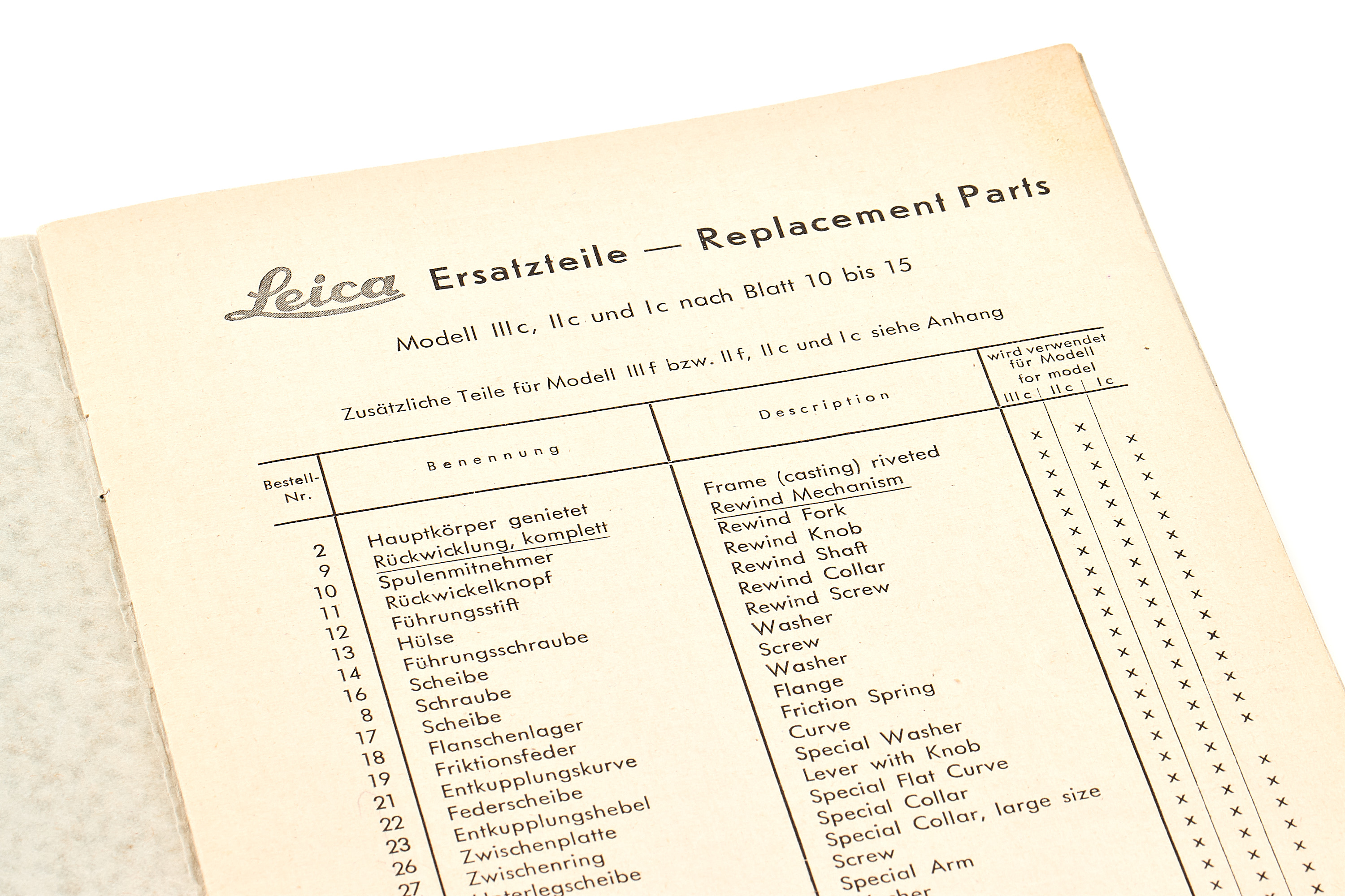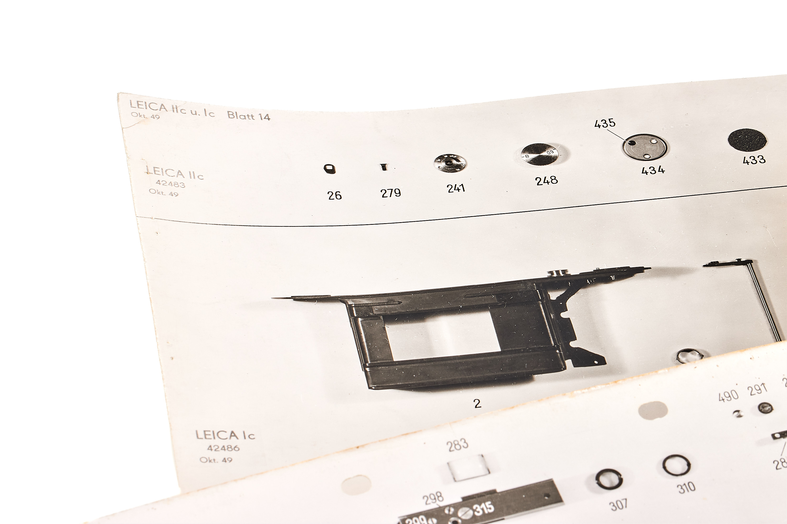 A very attractive list of Leica I to IIIc spare parts in excellent condition, for internal use by Leitz, including photo pages 10-15 (a complete set) with exploded views of the cameras, and Leica IIIg photo book with exploded views of all components.
