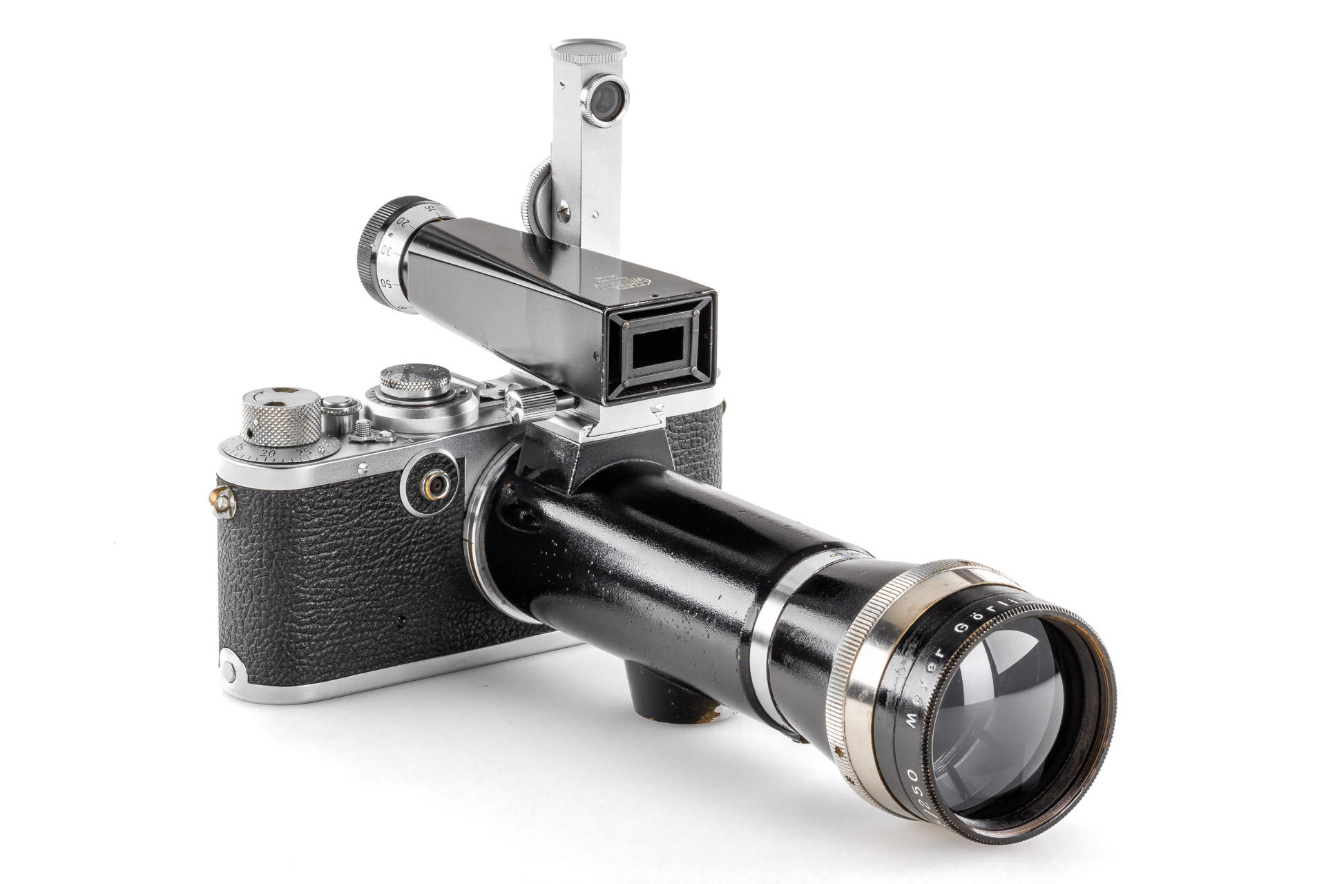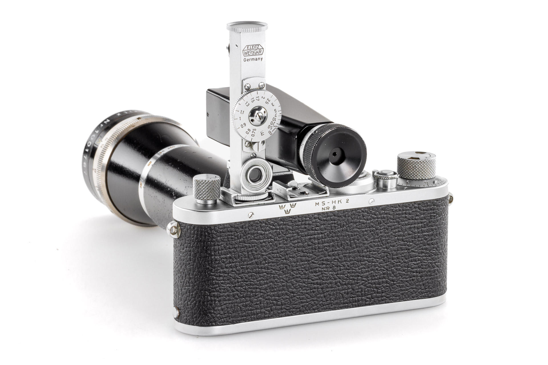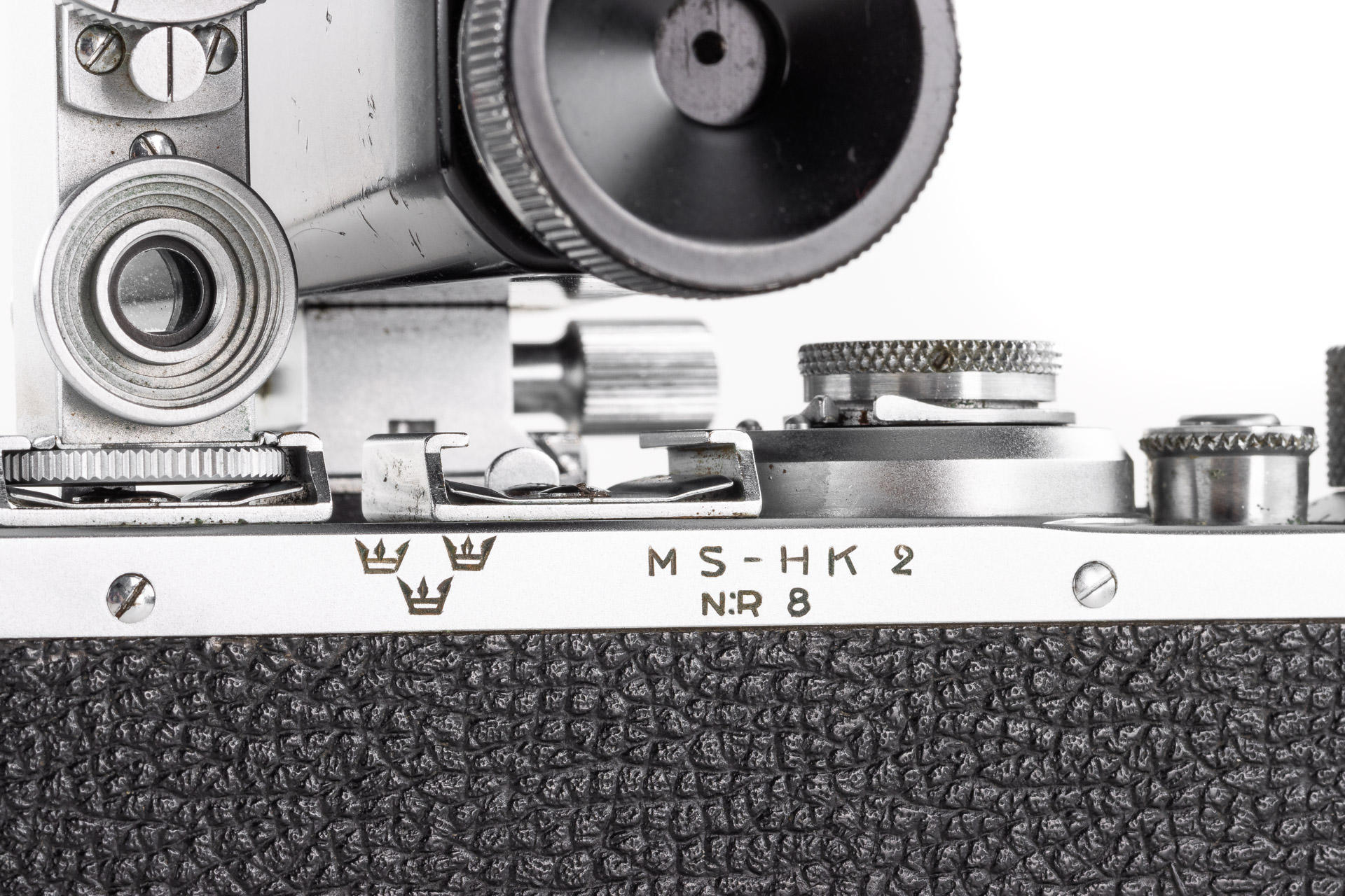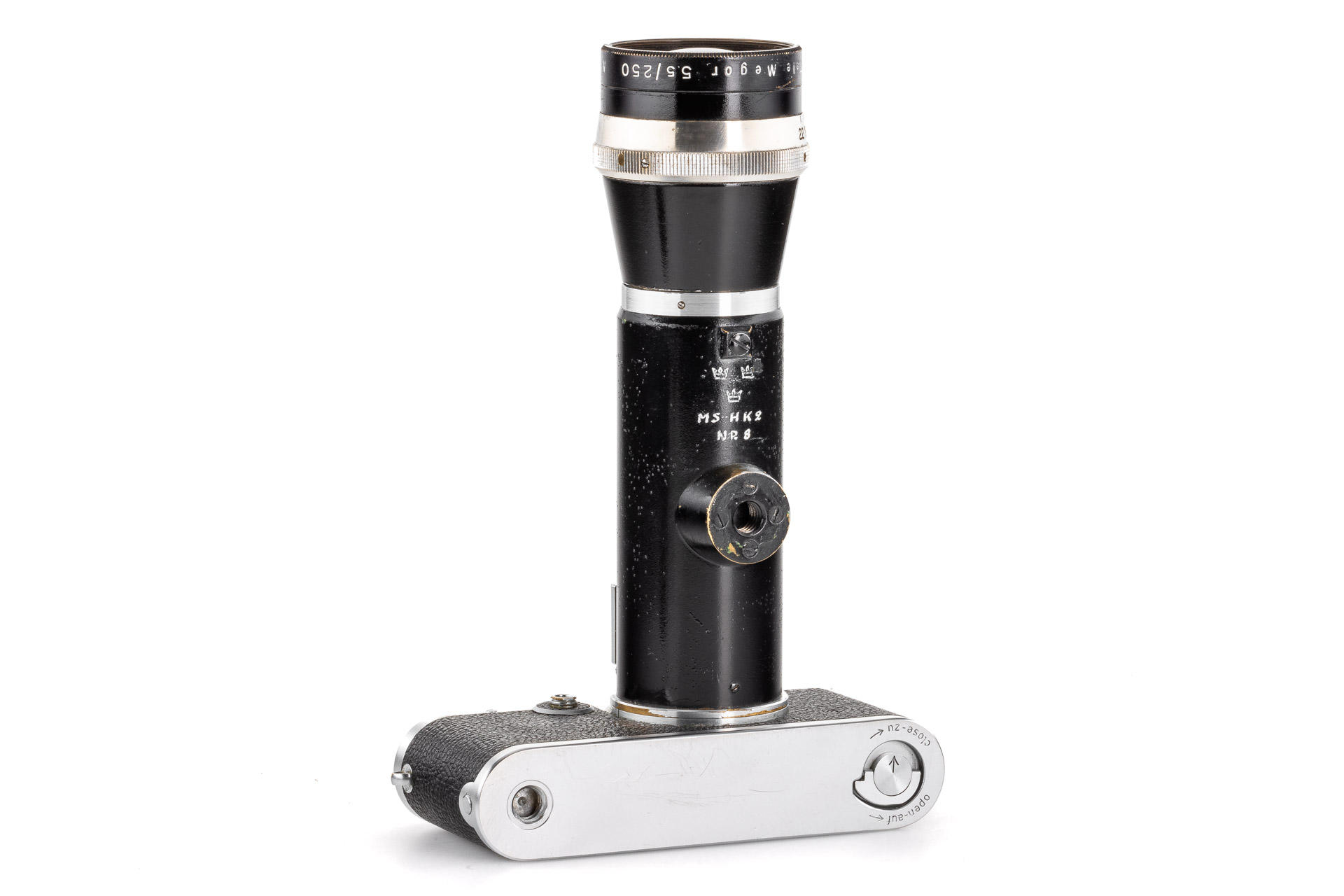 original and extremely rare military outfit, one of the first of only approx. 50 made, body no.578081 engraved on the rear of the top plate with 3 crowns and 'MS-HK2 NR 8', with matching special Meyer Tele Megor 5.5/250mm no.1001767 engraved with 3 crowns + 'MS-HK2 N:R 8', original hood with built-in yellow filter, SFTOO finder with special mask for 250mm, chrome FOKOS rangefinder, cable release, two spools, strap, all in original outfit case (Molander & son dealer in Stockholm special plate with N:R 8) and copy of the Swedish instructions - one of the rarest military outfits, here in excellent condition