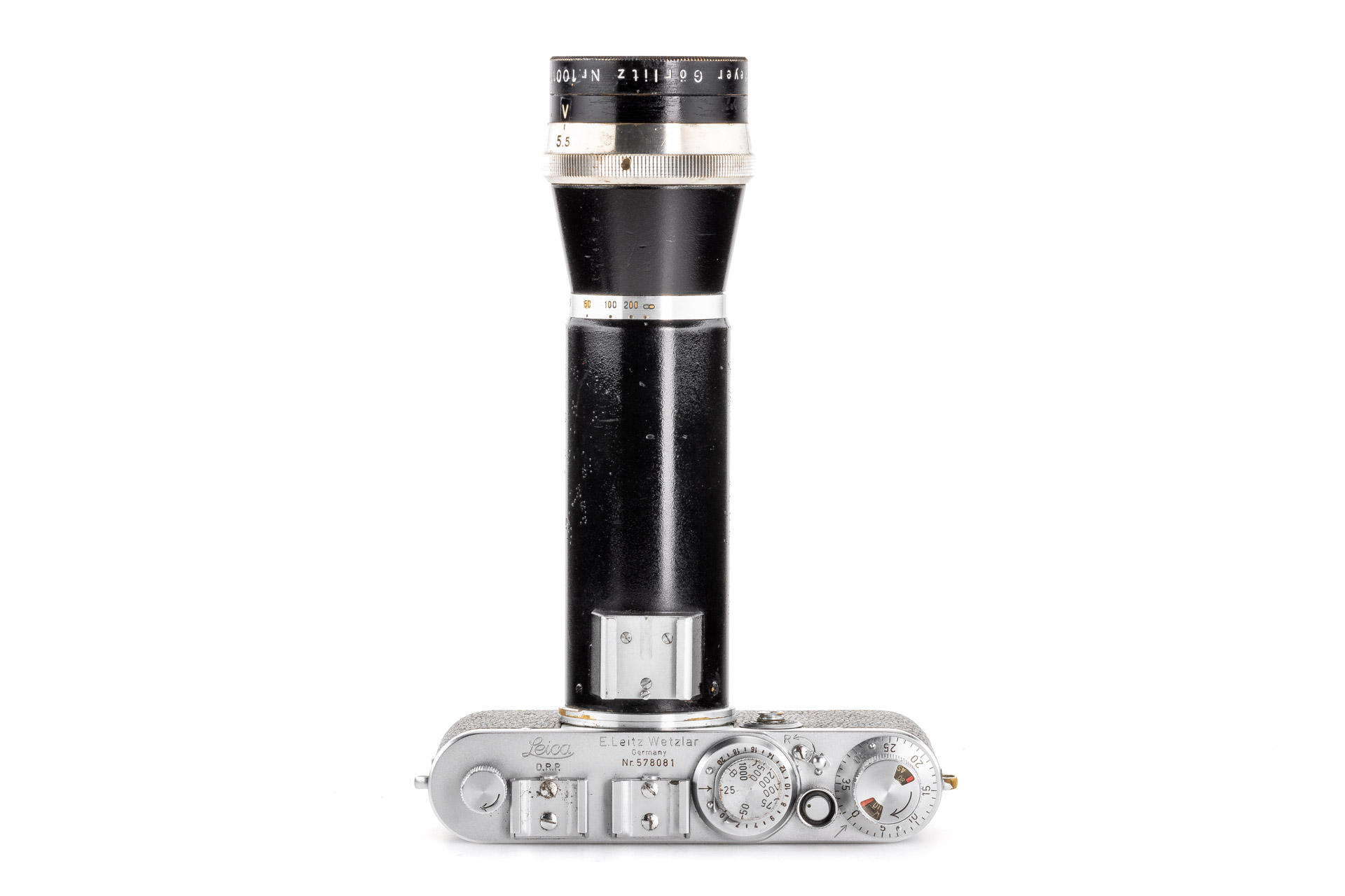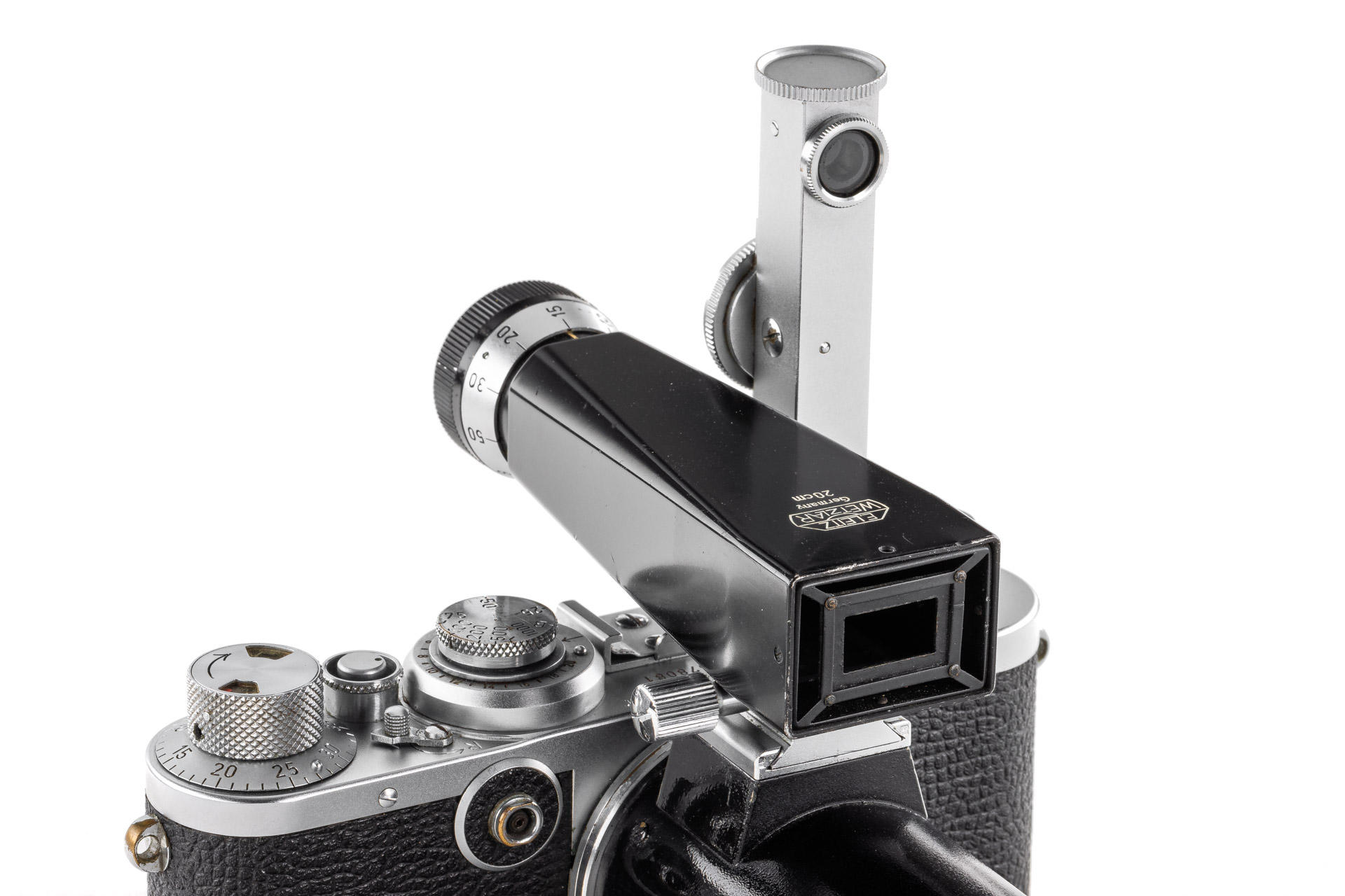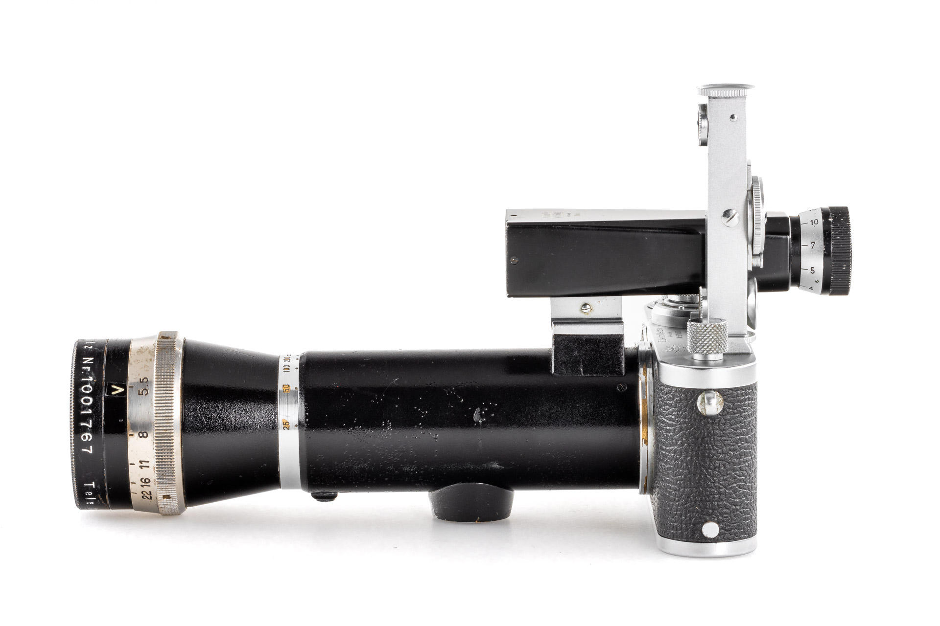 original and extremely rare military outfit, one of the first of only approx. 50 made, body no.578081 engraved on the rear of the top plate with 3 crowns and 'MS-HK2 NR 8', with matching special Meyer Tele Megor 5.5/250mm no.1001767 engraved with 3 crowns + 'MS-HK2 N:R 8', original hood with built-in yellow filter, SFTOO finder with special mask for 250mm, chrome FOKOS rangefinder, cable release, two spools, strap, all in original outfit case (Molander & son dealer in Stockholm special plate with N:R 8) and copy of the Swedish instructions - one of the rarest military outfits, here in excellent condition