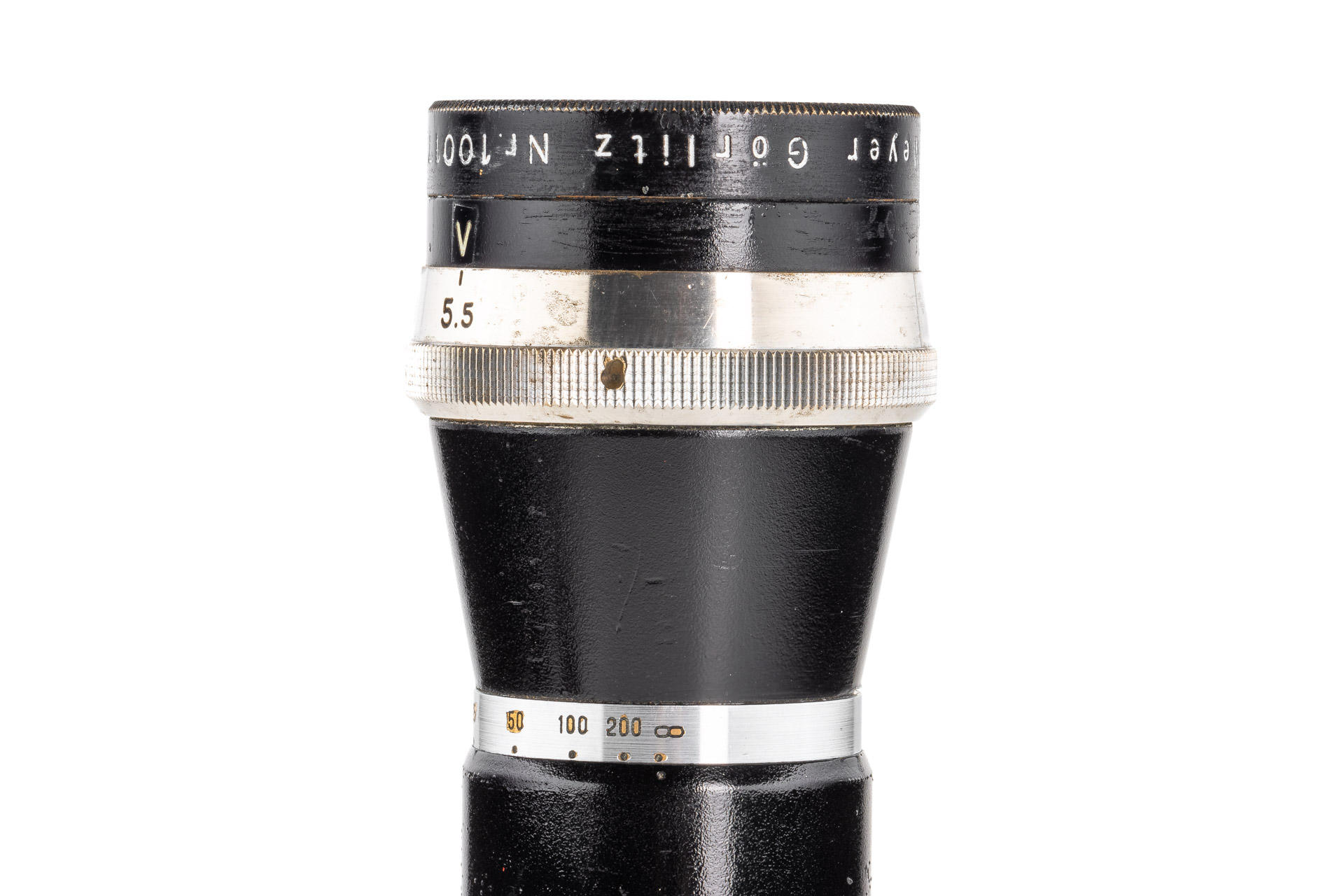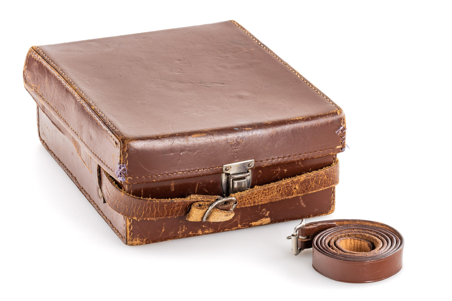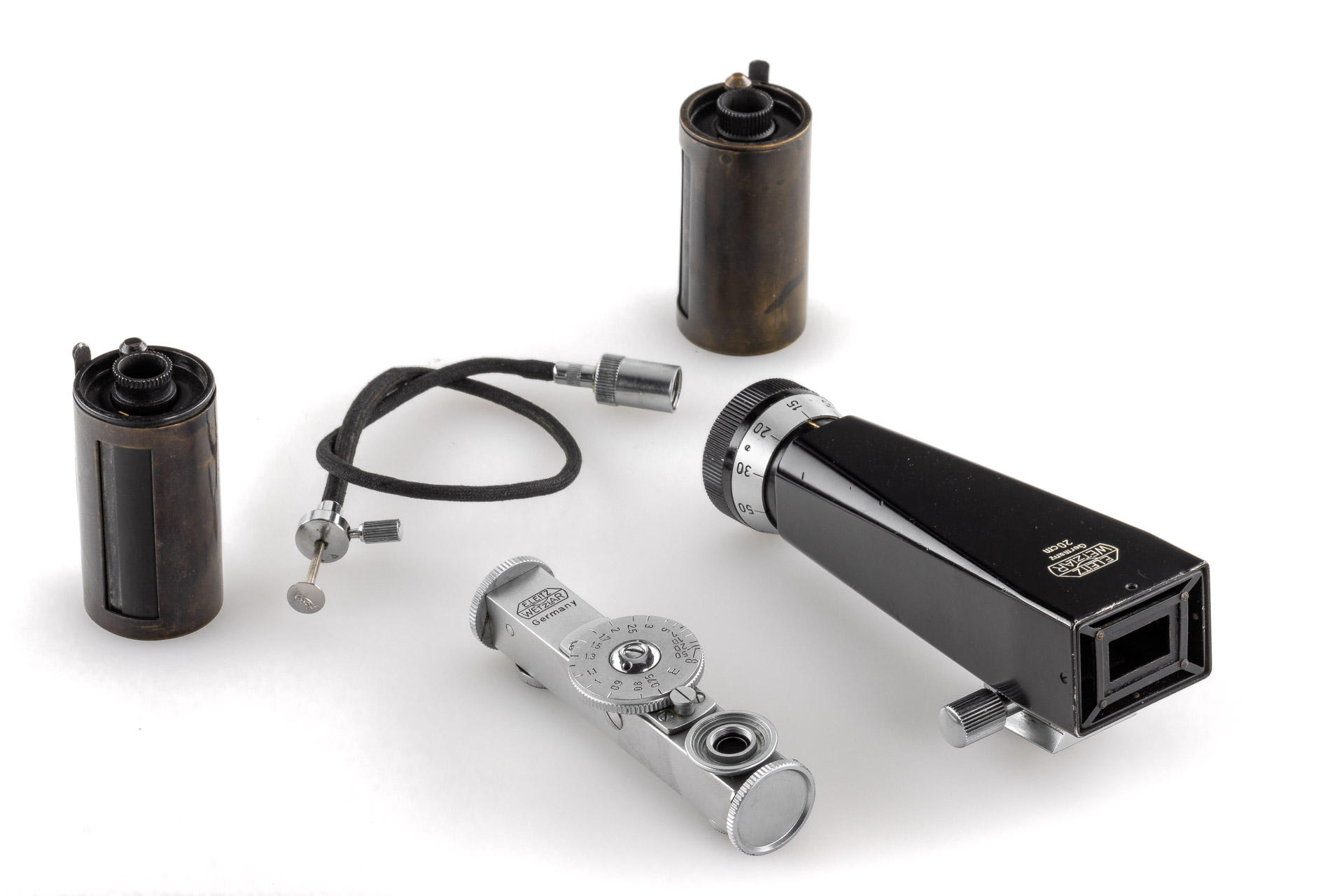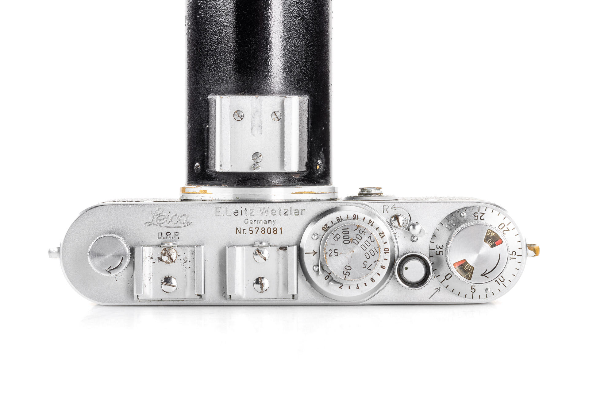 original and extremely rare military outfit, one of the first of only approx. 50 made, body no.578081 engraved on the rear of the top plate with 3 crowns and 'MS-HK2 NR 8', with matching special Meyer Tele Megor 5.5/250mm no.1001767 engraved with 3 crowns + 'MS-HK2 N:R 8', original hood with built-in yellow filter, SFTOO finder with special mask for 250mm, chrome FOKOS rangefinder, cable release, two spools, strap, all in original outfit case (Molander & son dealer in Stockholm special plate with N:R 8) and copy of the Swedish instructions - one of the rarest military outfits, here in excellent condition