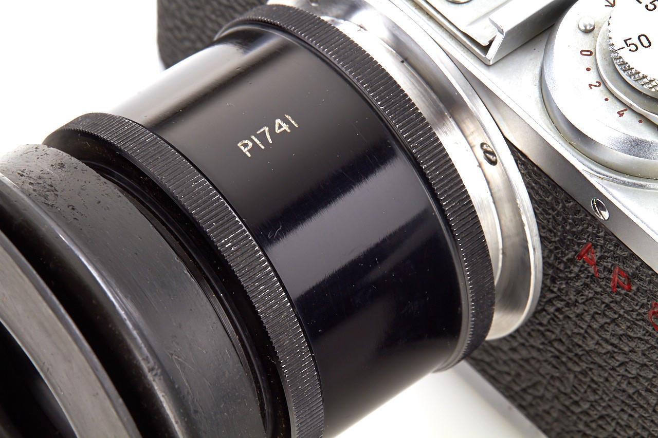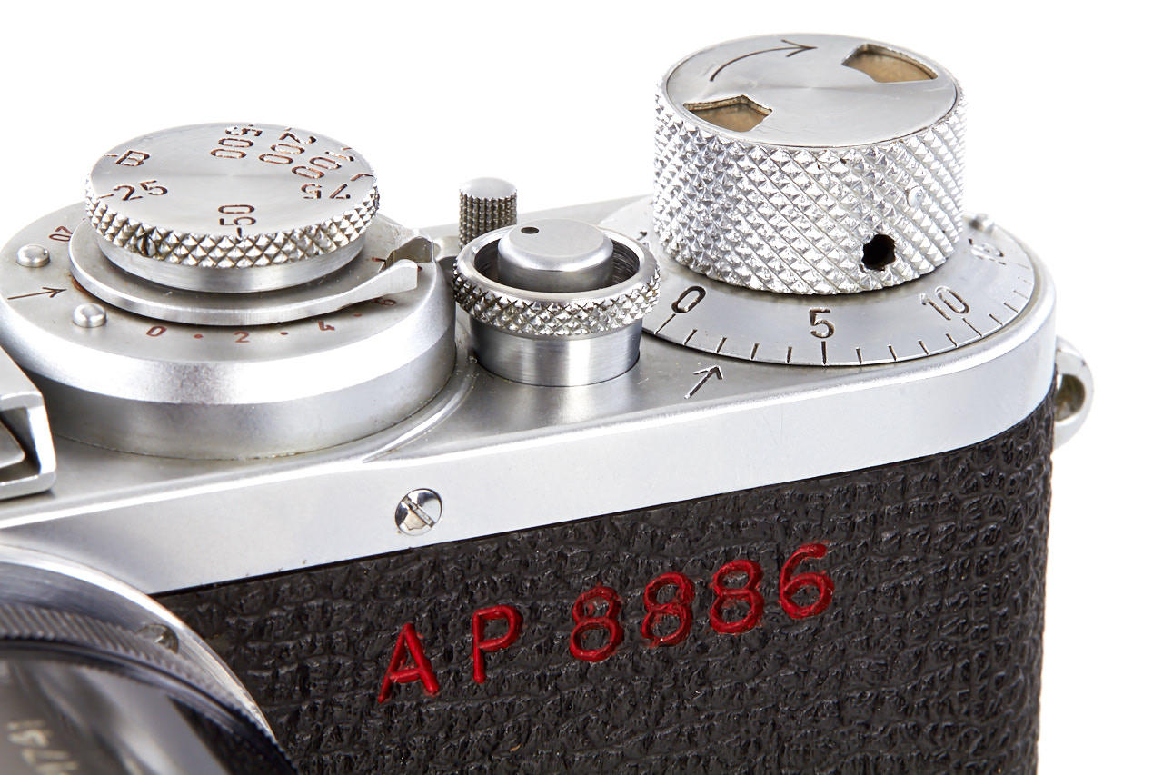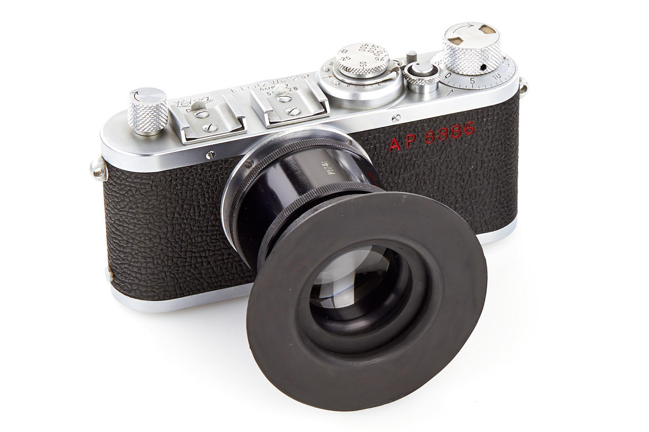 very rare If red dial body modified for the British Navy for use with periscopes, body engraved 'A.P.8886' in red letters on back vulcanite covering, special focusing finder no.P1741 for screwing on the modified back, caps for the camera and finder, IR and red filter, original fitted leather case stamped 'Case for AP.8886 Camera'