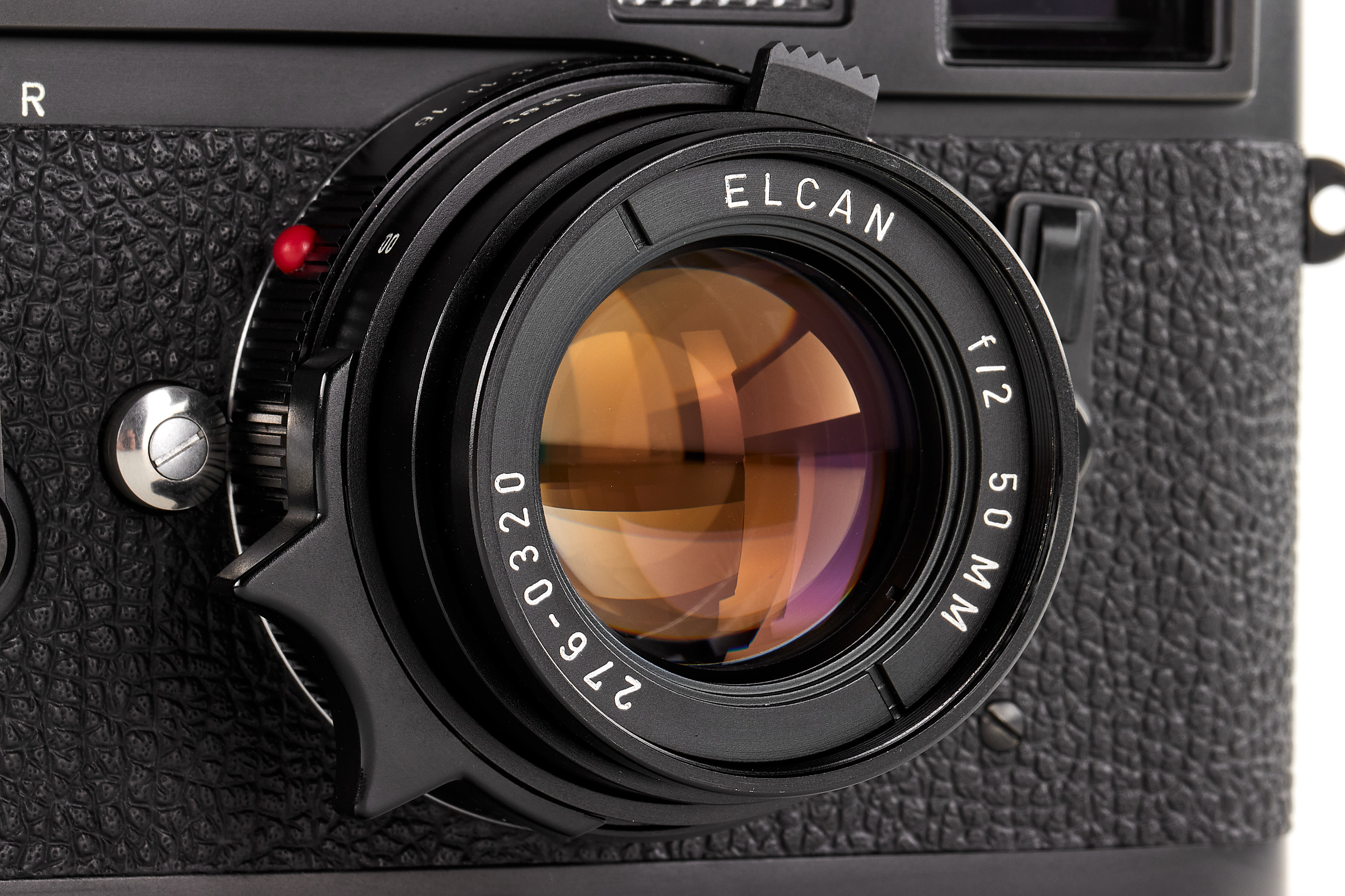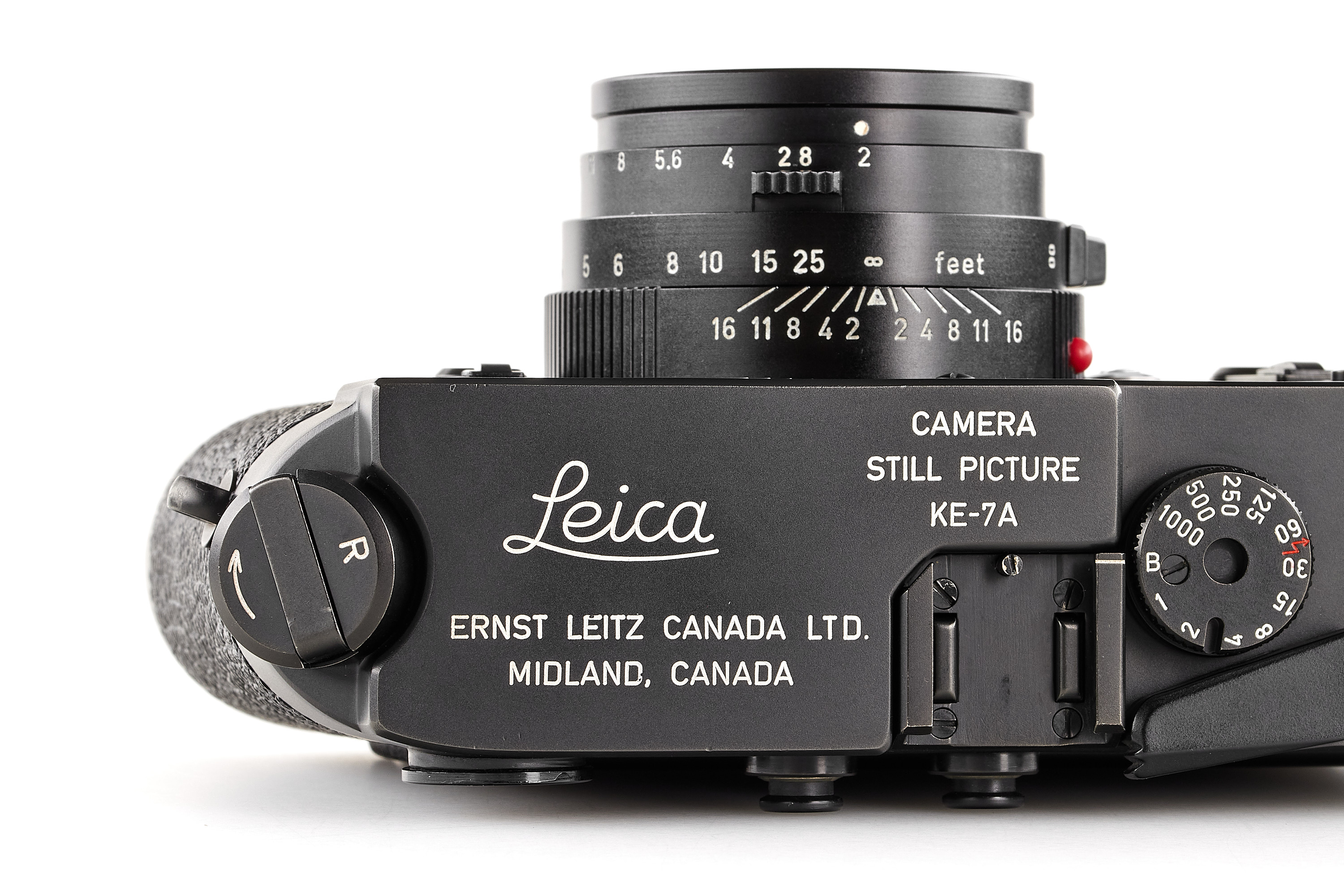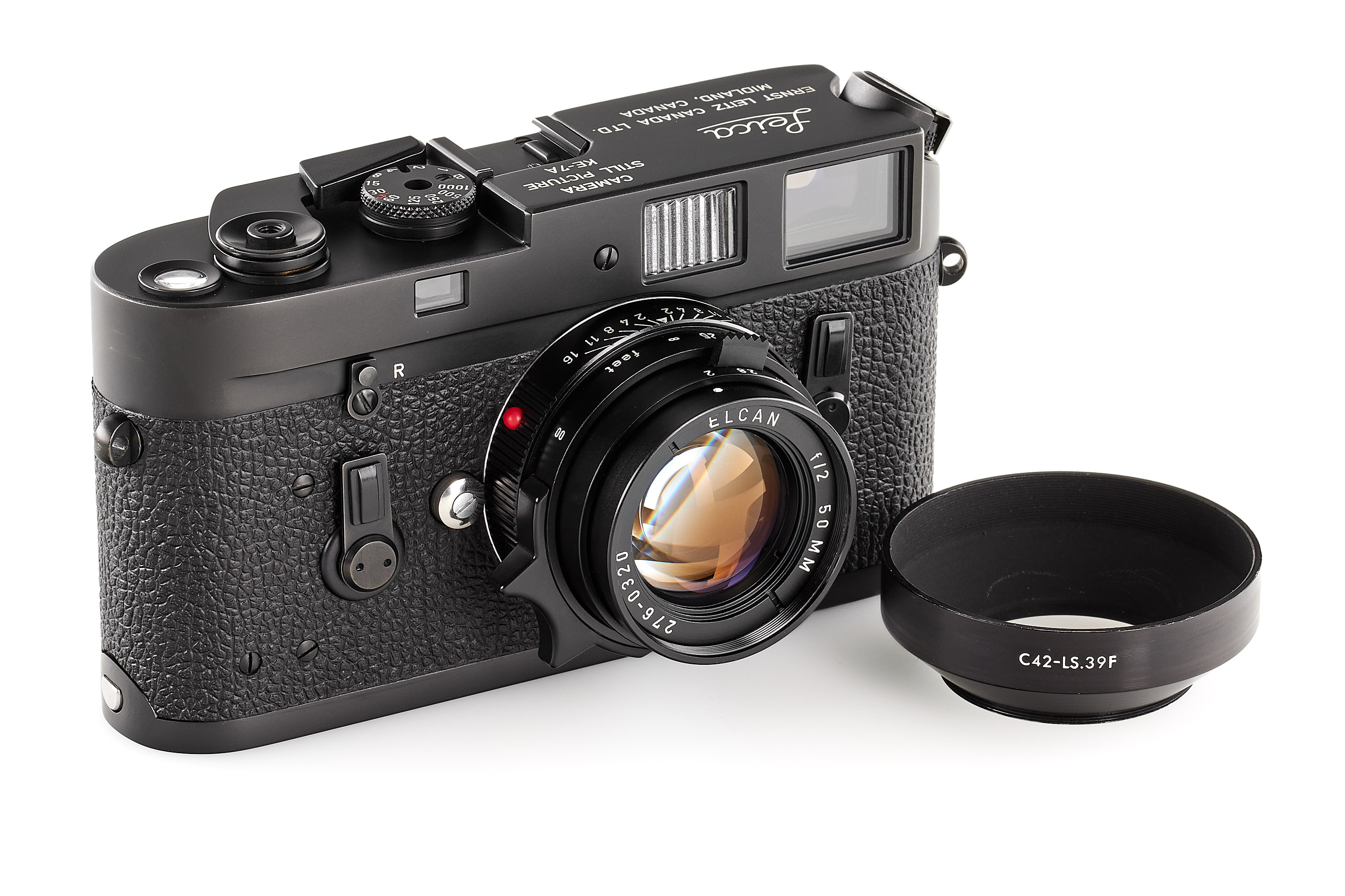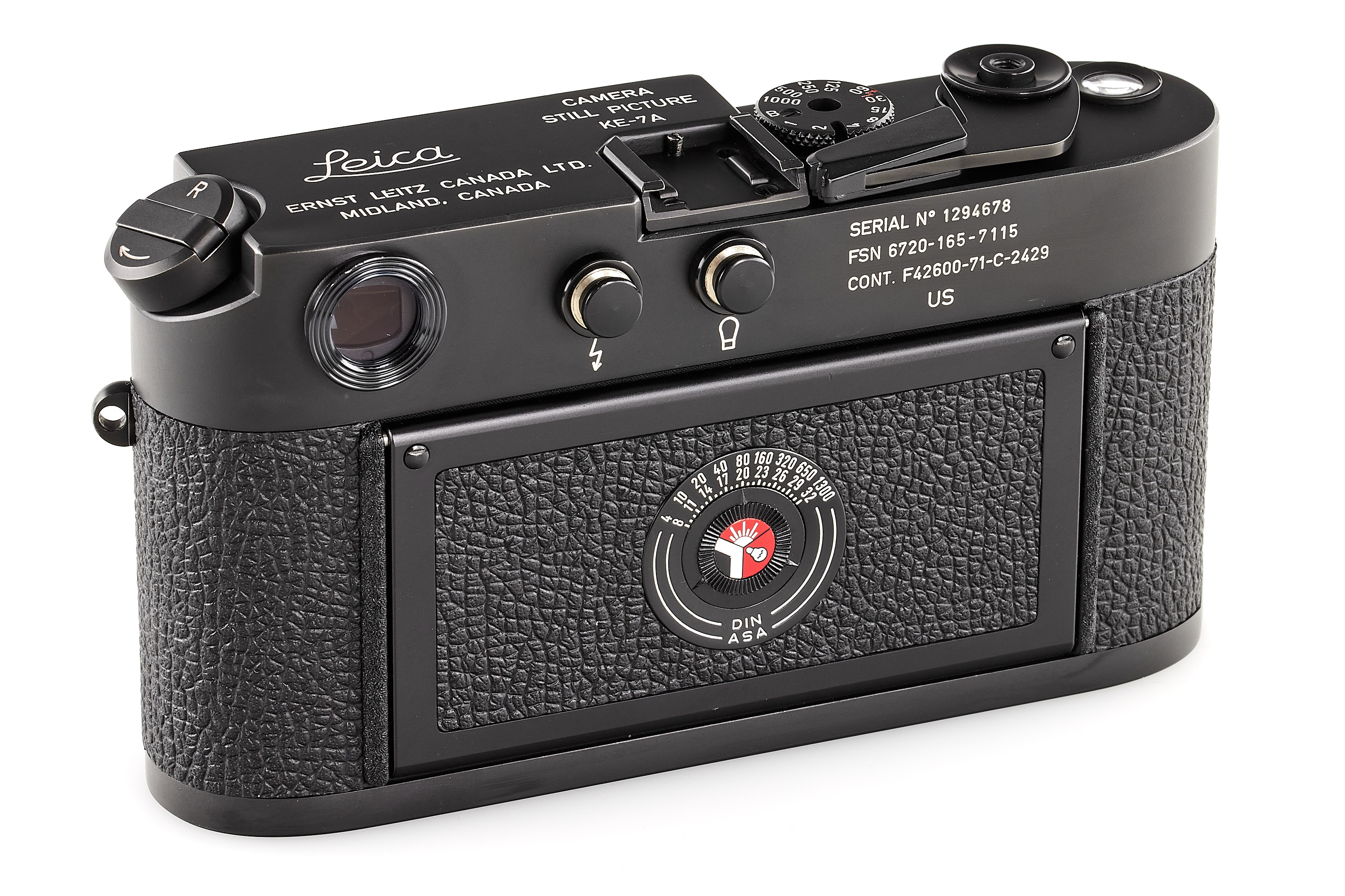 A rare variant of the black Leica M4, produced by Ernst Leitz Canada for the U.S. military. In excellent condition and good working order, body engraved with the military contract numbers, including a sought-after Elcan 2/50mm no.276-0320 (good optics, with special hood).