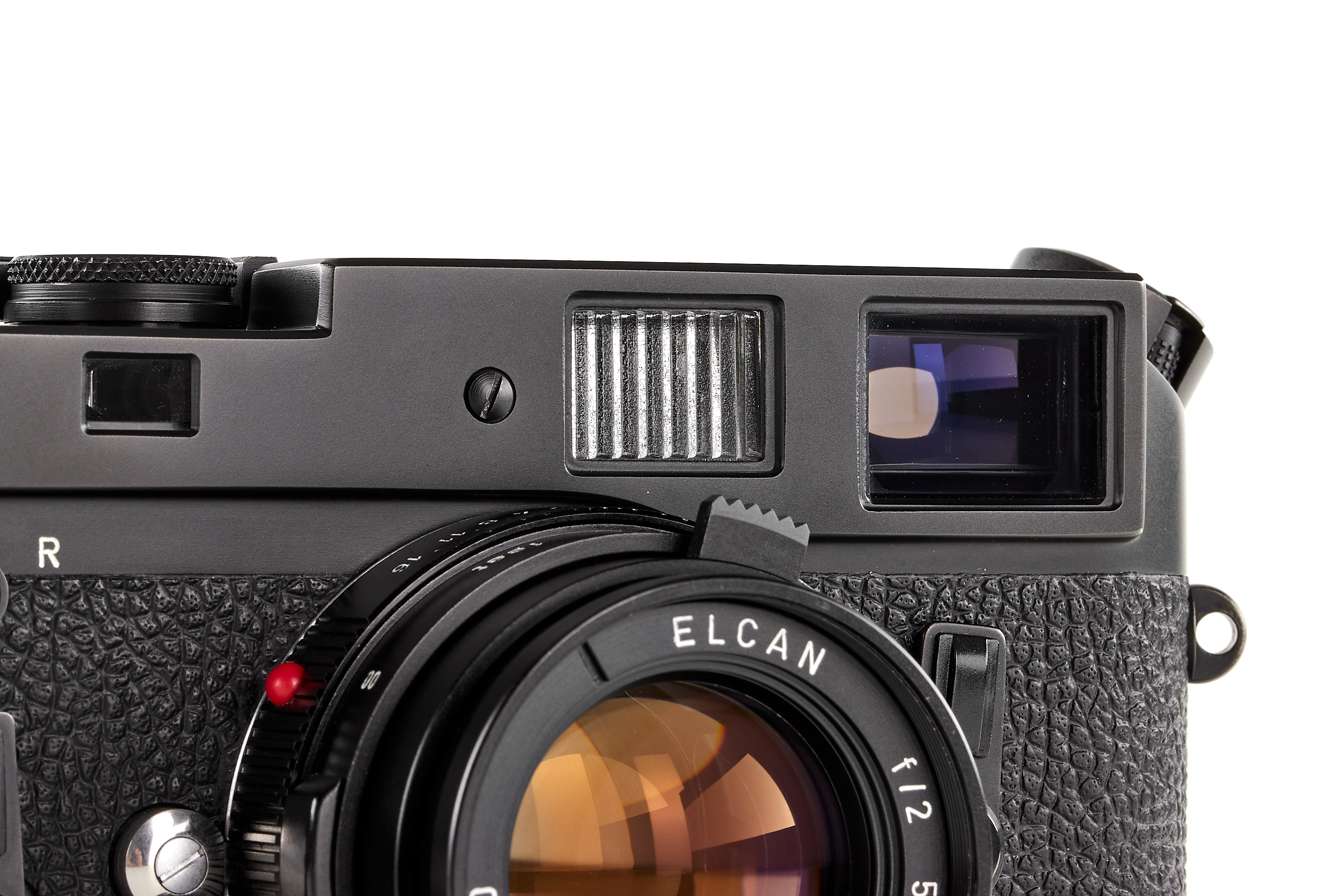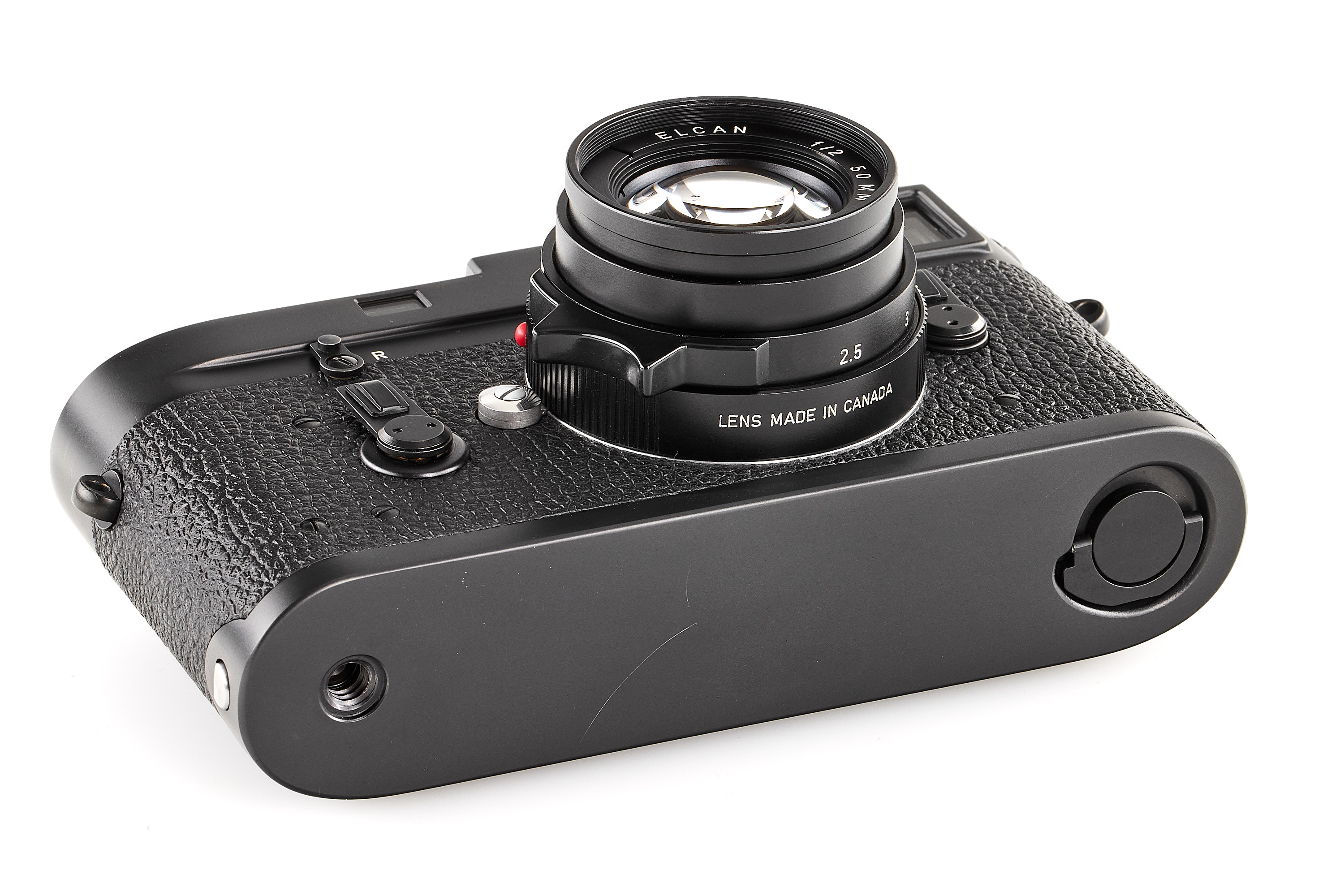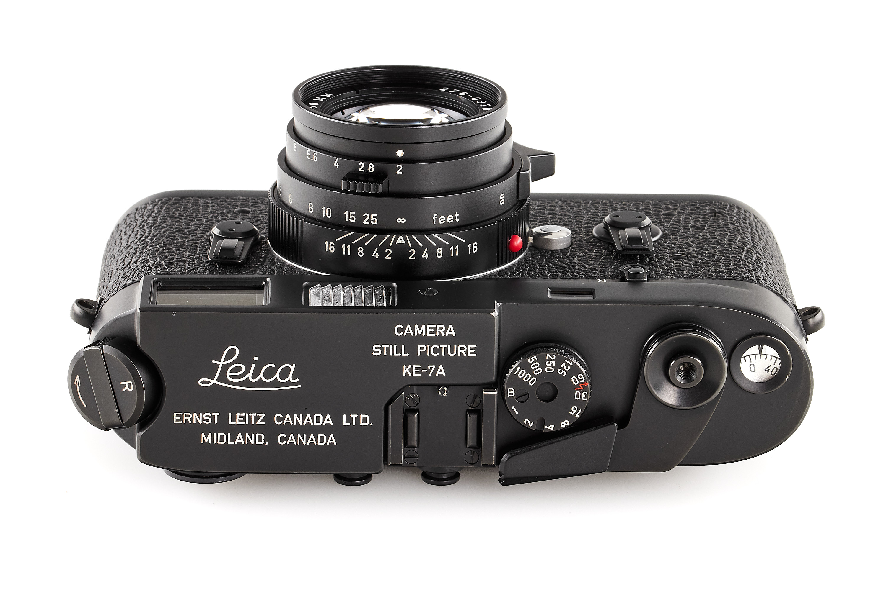 A rare variant of the black Leica M4, produced by Ernst Leitz Canada for the U.S. military. In excellent condition and good working order, body engraved with the military contract numbers, including a sought-after Elcan 2/50mm no.276-0320 (good optics, with special hood).