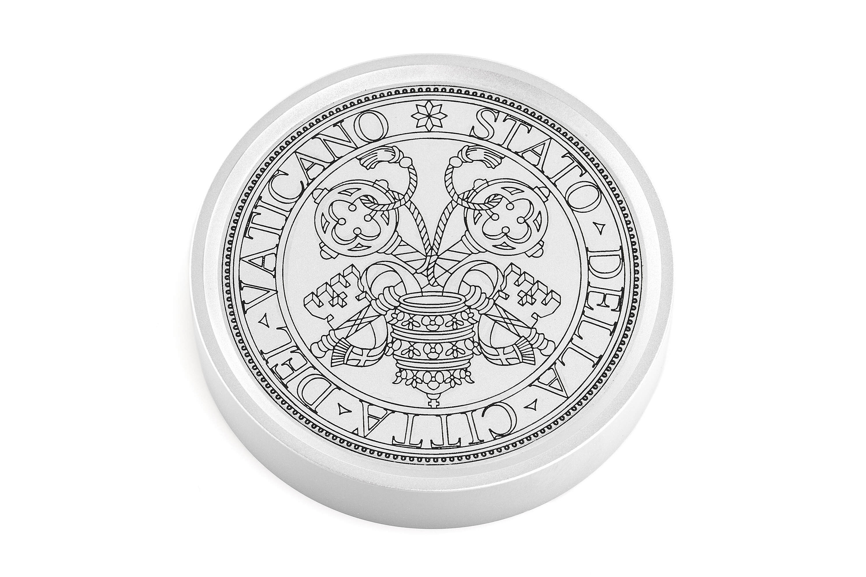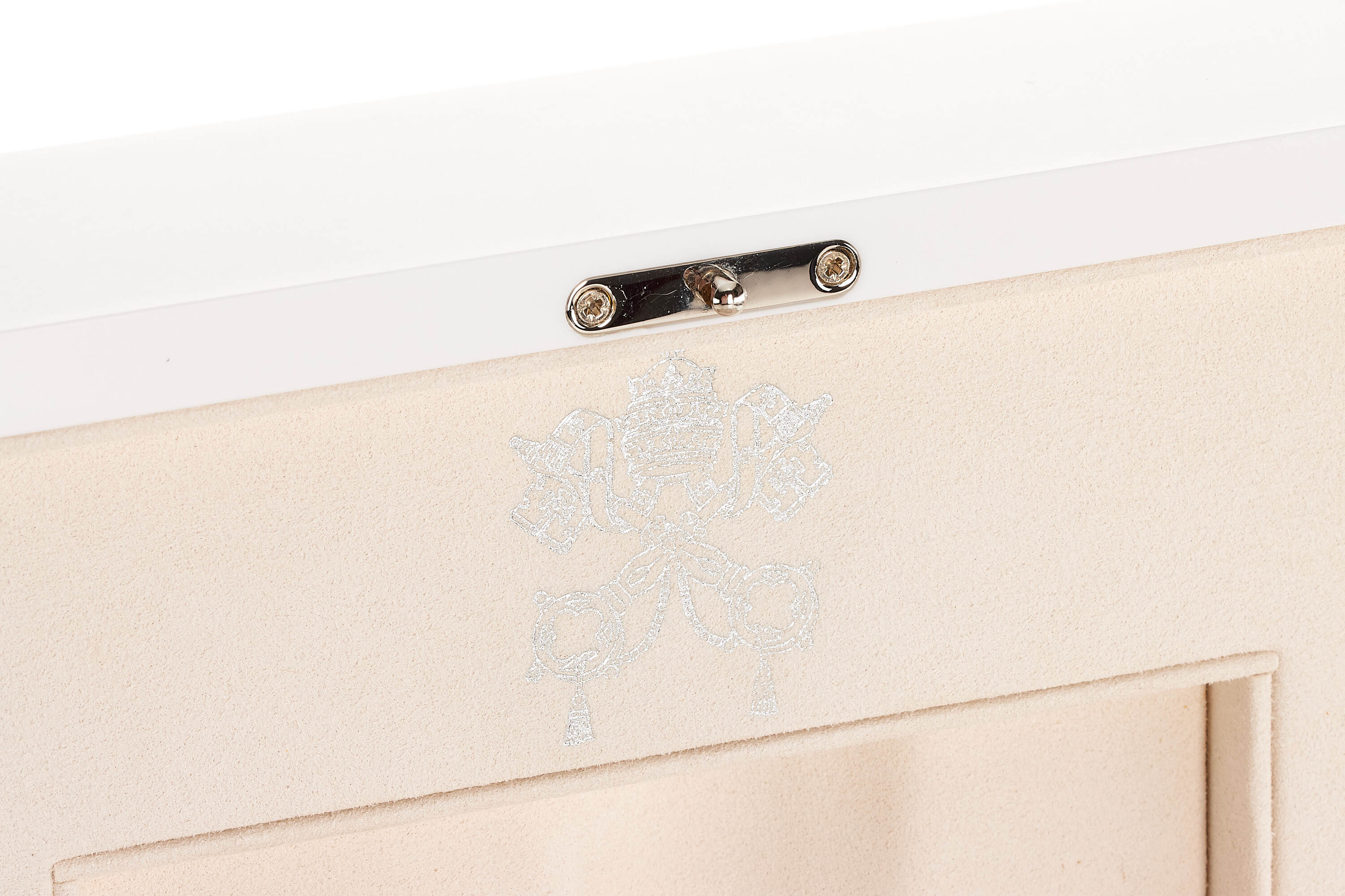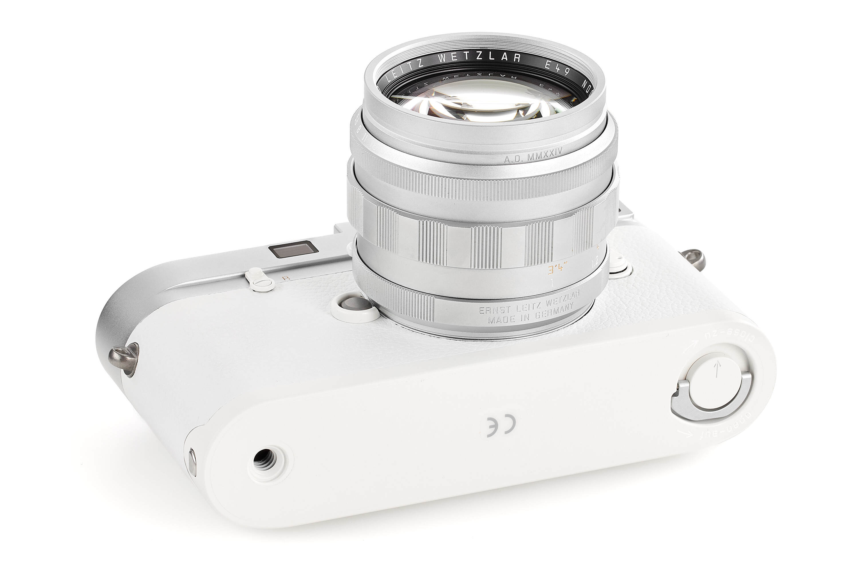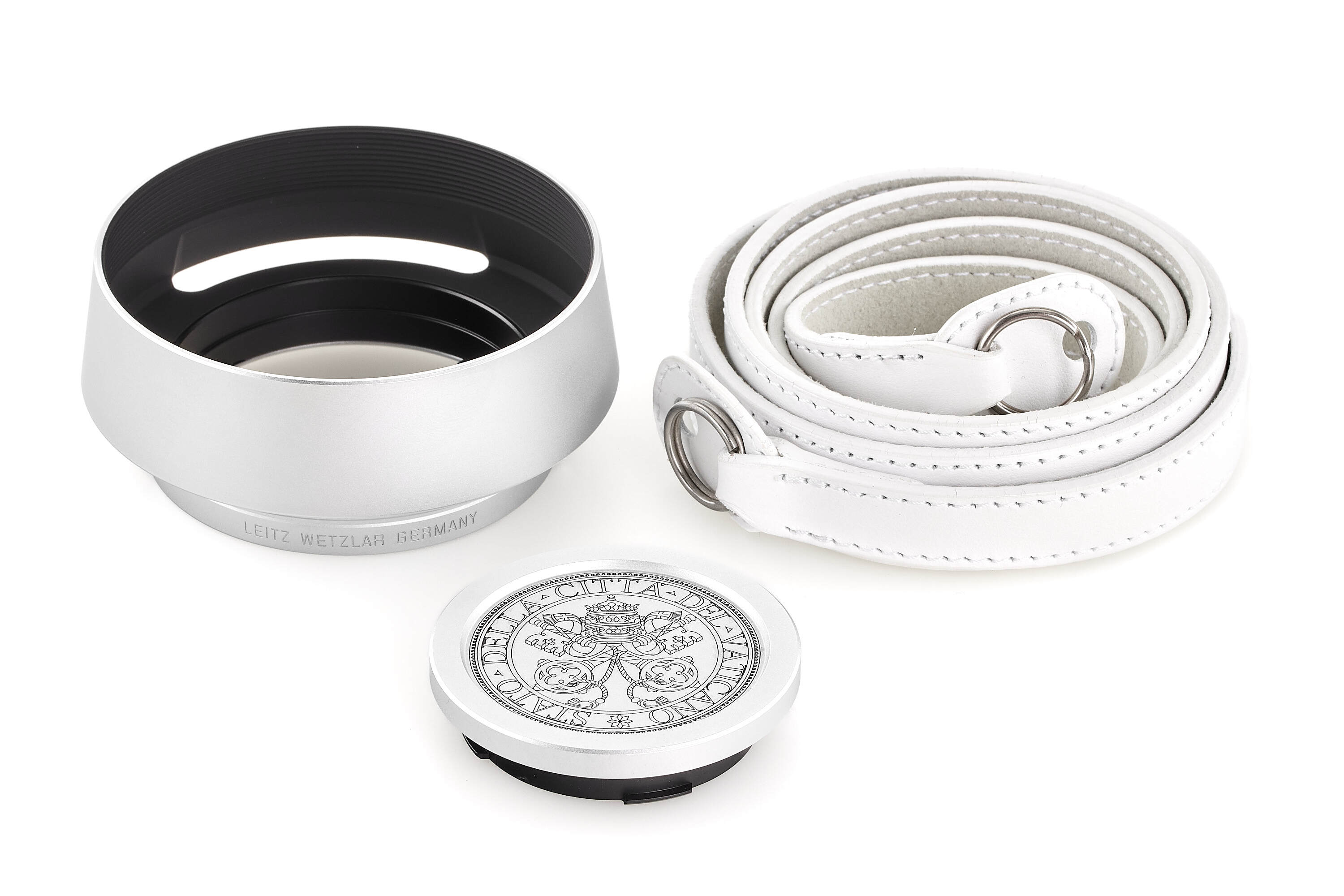 Das dazugehörige Noctilux-M 50 mm f/1.2 Objektiv ist ebenfalls in Chrom gefertigt, mit Gravuren in Gold und Weiß. Auf dem Gehäusedeckel wie auch auf dem Objektivdeckel ist das Wappen des Vatikanstaates eingraviert. Kamera und Objektiv tragen die exklusive Seriennummer 5000000 und zusätzlich die Gravur des Jahres der Schenkung an Seine Heiligkeit Papst Franziskus in römischen Ziffern: A.D. MMXXIV.