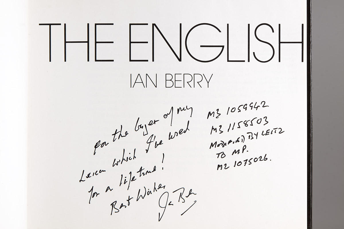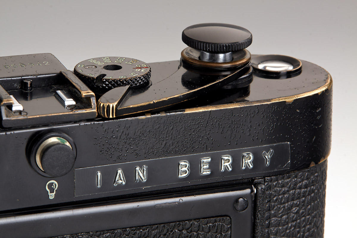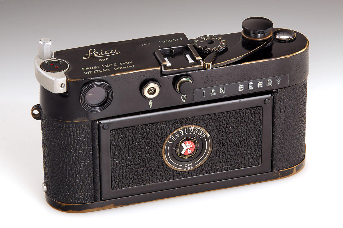 (1) Leica M3 black paint no. 1059942 (1962, 100% original, with rapid winding crank), (2) very special and late M3 (MP) black paint no. 1158503, with Leicavit MP, black rapid winding crank. The Leica M3 cameras of the late series lack the lens lock release guard. This version only appears within the very last batch of M cameras from 1967 (serial nos.1158501-1158510). It represents a very interesting factory conversion into a Leica MP. In order to add the long coupling shaft for the Leicavit MP, the automatically resetting frame counter of the M3 had to be sacrificed. The original M3 top plate was kept, in which the former frame counter-window has been closed. Such conversions are extremely rare. (3) Leica M2 black paint no. 1075026 (1963) with Leicavit MP, black rapid winding crank. All cameras with ‘IAN BERRY’ stickers on rear top plate. With the book The English, ed. 1978, signed “For the buyer of my Leicas which I’ve used for a lifetime” and with a large-size (30x40cm) vintage print Fulham Jubilee celebrations, London, published on page 71 of the book The English (stamped “Magnum Photo Libary Print New York”,signed). Ian Berry (born 1934 in England) moved to South Africa in 1952, where he soon taught himself photography. After working for the new African Sunday newspaper eGoli and the Benoni City Times, he soon became more interested in freelance work. In the early 1960s he worked for the Daily Mail. Later Tom Hopkinson, previously editor of the British Picture Post, hired Berry to work for Drum magazine. He was invited by Henri Cartier-Bresson to join Magnum Photos in 1962 when he was based in Paris; five years later he became a full member. In 1964 he moved to London and began working for Observer Magazine. He has since travelled the globe, documenting social and political strife in China, Republic of Congo, Czechoslovakia, Ethiopia, Israel, Ireland, Vietnam, and the former Soviet Union. He has contributed to publications including Esquire, Fortune, Geo, Life, National Geographic, Paris-Match, and Stern. Ian Berry (geb. 1934 in England) zog 1952 nach Südafrika, wo er sich alsbald das Fotografieren beibrachte. Nachdem er für die neue afrikanische Sonntagszeitung eGoli und die Benoni City Times gearbeitet hatte, interessierte er sich bald eher für freiberufliche Arbeit. Anfang der 1960er Jahre arbeitete er für die Daily Mail. Später stellte Tom Hopkinson, der ehemalige Redakteur der British Picture Post, Berry ein, um für das Magazin Drum zu fotografieren. 1962 lud Henri Cartier-Bresson ihn ein, Magnum beizutreten, als er in Paris lebte; fünf Jahre später wurde er ein Vollmitglied. 1964 zog er nach London und begann, für das Oberserver Magazine zu arbeiten. Seitdem hat er die Welt bereist und soziale und politische Konflikte in China, der Republik Kongo, der Tschechoslowakei, in Äthiopien, Israel, Irland, Vietnam und der ehemaligen Sowjetunion dokumentiert. Seine Werke sind in Publikationen wie Esquire, Fortune, Geo, Life, National Geographic, Paris-Match und Stern abgedruckt worden.