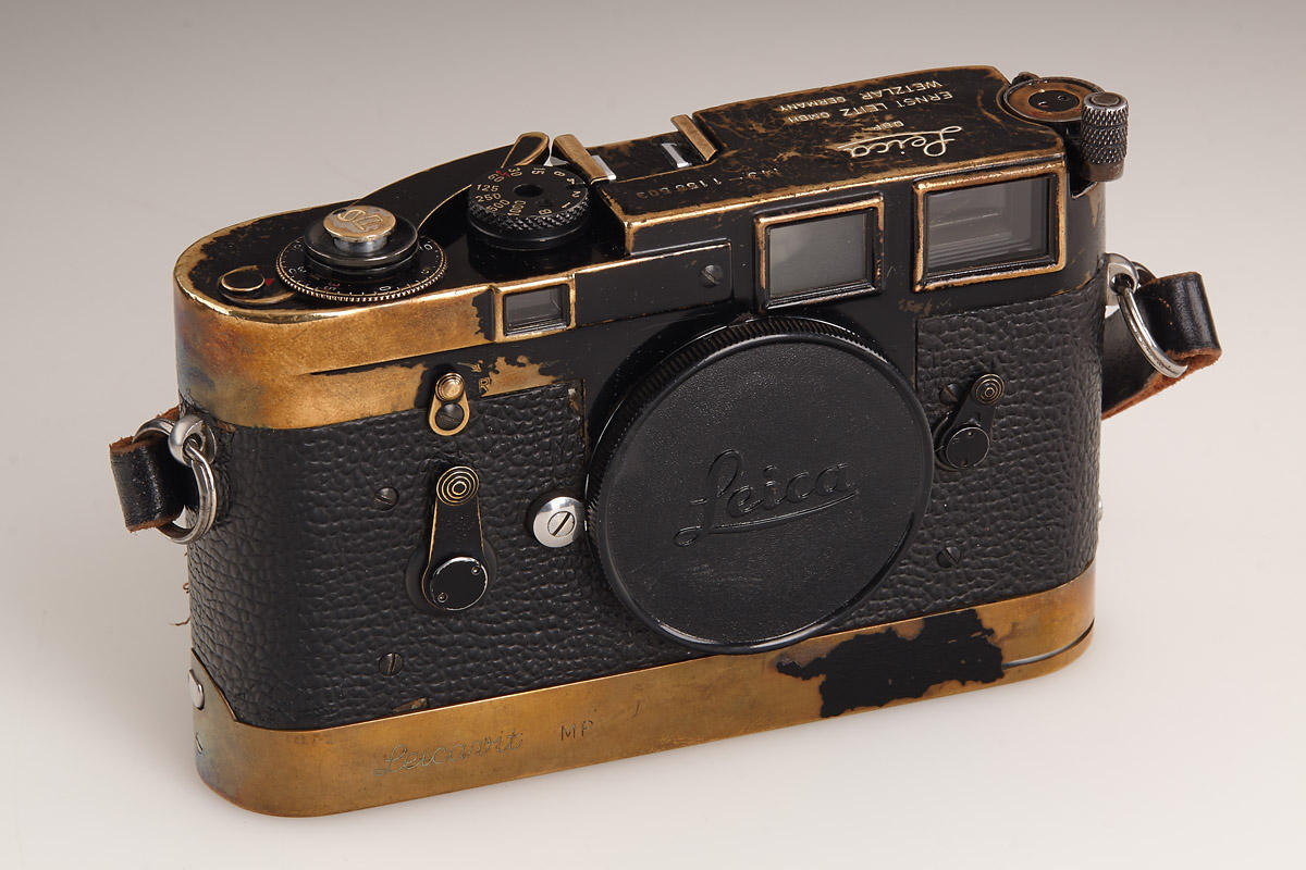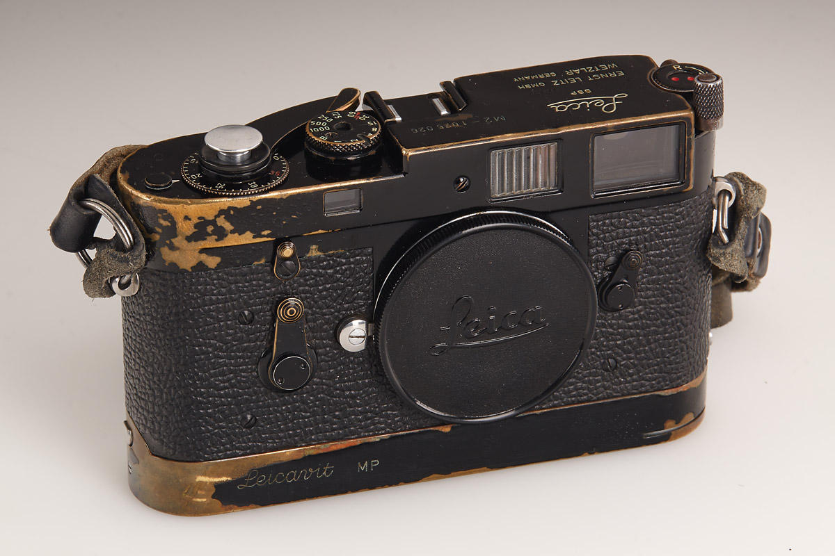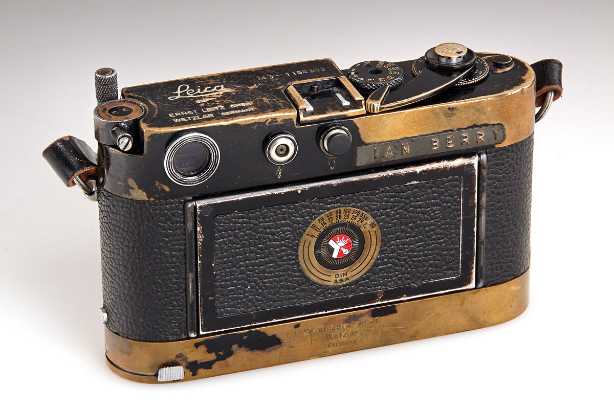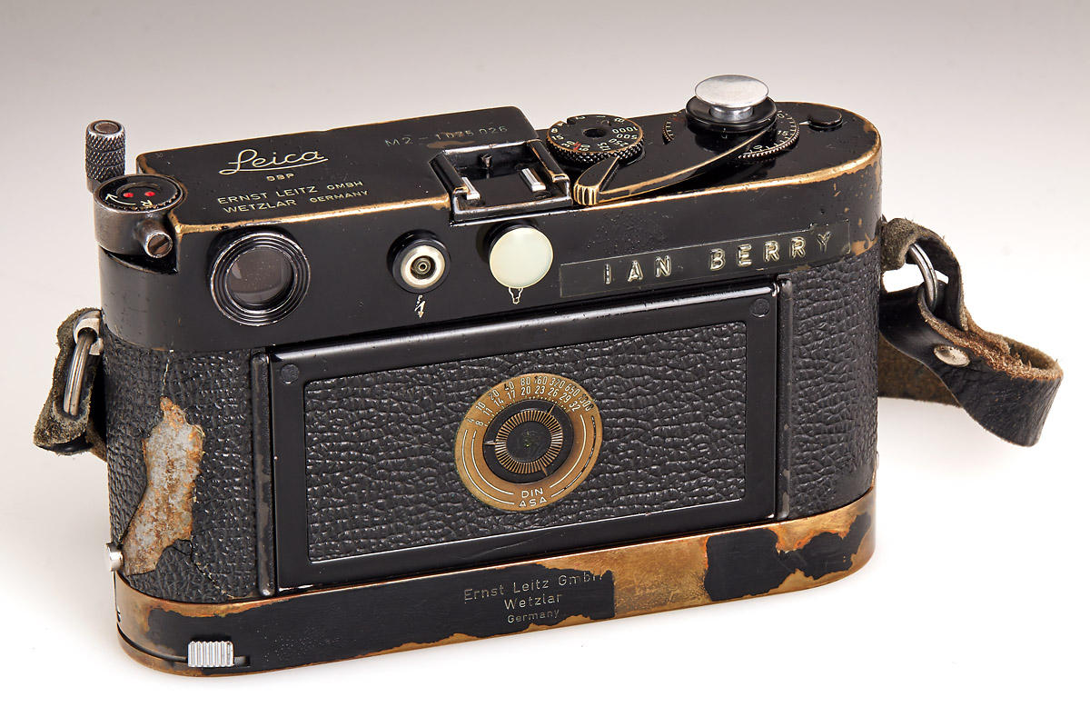(1) Leica M3 black paint no. 1059942 (1962, 100% original, with rapid winding crank), (2) very special and late M3 (MP) black paint no. 1158503, with Leicavit MP, black rapid winding crank. The Leica M3 cameras of the late series lack the lens lock release guard. This version only appears within the very last batch of M cameras from 1967 (serial nos.1158501-1158510). It represents a very interesting factory conversion into a Leica MP. In order to add the long coupling shaft for the Leicavit MP, the automatically resetting frame counter of the M3 had to be sacrificed. The original M3 top plate was kept, in which the former frame counter-window has been closed. Such conversions are extremely rare. (3) Leica M2 black paint no. 1075026 (1963) with Leicavit MP, black rapid winding crank. All cameras with ‘IAN BERRY’ stickers on rear top plate. With the book The English, ed. 1978, signed “For the buyer of my Leicas which I’ve used for a lifetime” and with a large-size (30x40cm) vintage print Fulham Jubilee celebrations, London, published on page 71 of the book The English (stamped “Magnum Photo Libary Print New York”,signed). Ian Berry (born 1934 in England) moved to South Africa in 1952, where he soon taught himself photography. After working for the new African Sunday newspaper eGoli and the Benoni City Times, he soon became more interested in freelance work. In the early 1960s he worked for the Daily Mail. Later Tom Hopkinson, previously editor of the British Picture Post, hired Berry to work for Drum magazine. He was invited by Henri Cartier-Bresson to join Magnum Photos in 1962 when he was based in Paris; five years later he became a full member. In 1964 he moved to London and began working for Observer Magazine. He has since travelled the globe, documenting social and political strife in China, Republic of Congo, Czechoslovakia, Ethiopia, Israel, Ireland, Vietnam, and the former Soviet Union. He has contributed to publications including Esquire, Fortune, Geo, Life, National Geographic, Paris-Match, and Stern. Ian Berry (geb. 1934 in England) zog 1952 nach Südafrika, wo er sich alsbald das Fotografieren beibrachte. Nachdem er für die neue afrikanische Sonntagszeitung eGoli und die Benoni City Times gearbeitet hatte, interessierte er sich bald eher für freiberufliche Arbeit. Anfang der 1960er Jahre arbeitete er für die Daily Mail. Später stellte Tom Hopkinson, der ehemalige Redakteur der British Picture Post, Berry ein, um für das Magazin Drum zu fotografieren. 1962 lud Henri Cartier-Bresson ihn ein, Magnum beizutreten, als er in Paris lebte; fünf Jahre später wurde er ein Vollmitglied. 1964 zog er nach London und begann, für das Oberserver Magazine zu arbeiten. Seitdem hat er die Welt bereist und soziale und politische Konflikte in China, der Republik Kongo, der Tschechoslowakei, in Äthiopien, Israel, Irland, Vietnam und der ehemaligen Sowjetunion dokumentiert. Seine Werke sind in Publikationen wie Esquire, Fortune, Geo, Life, National Geographic, Paris-Match und Stern abgedruckt worden.