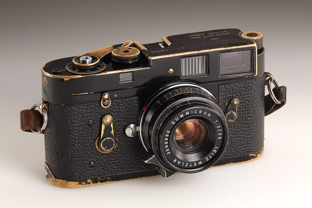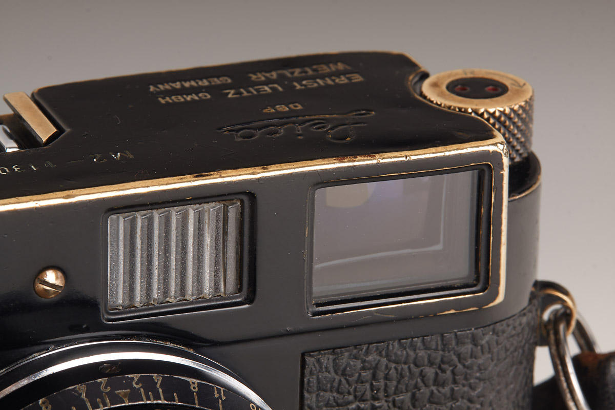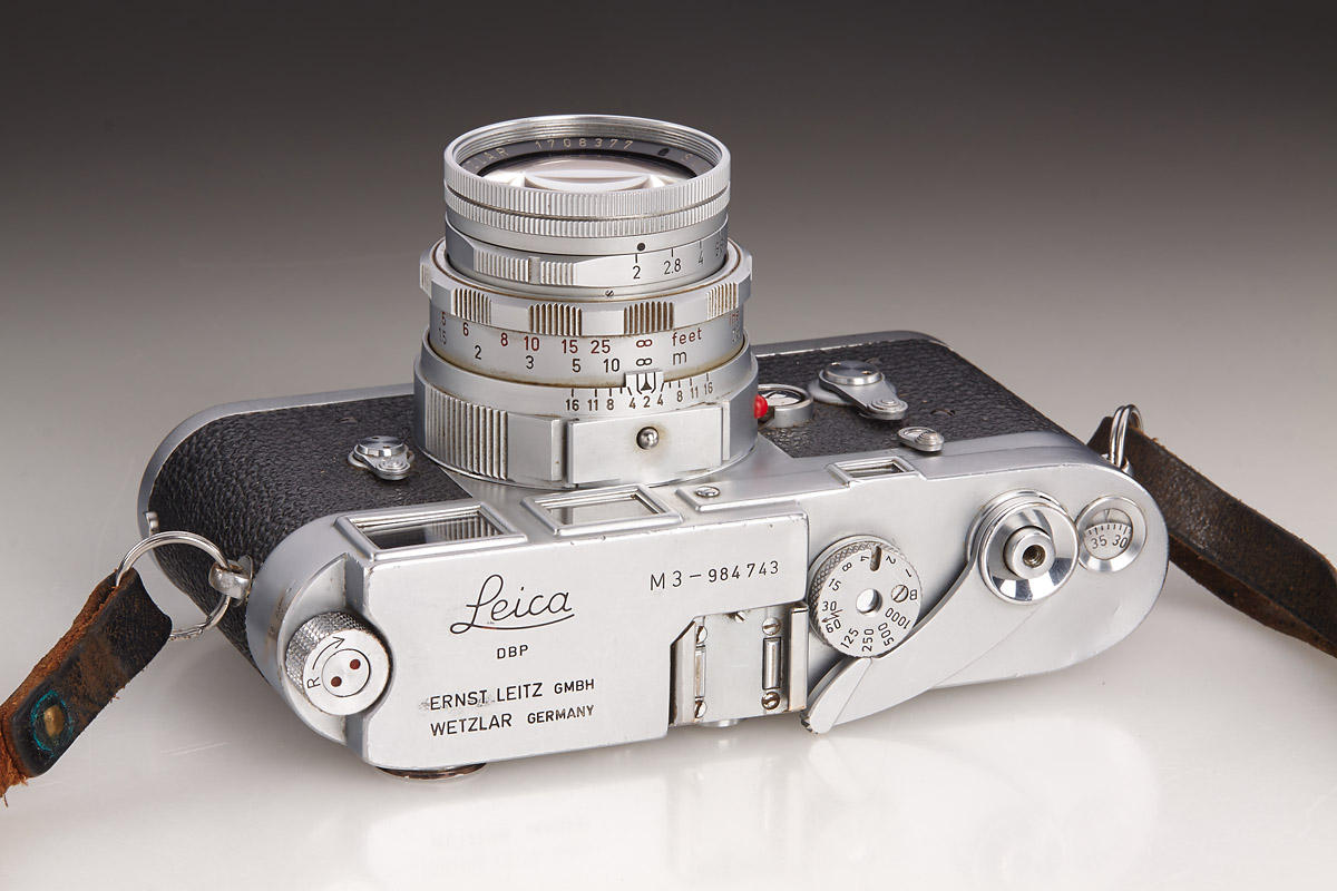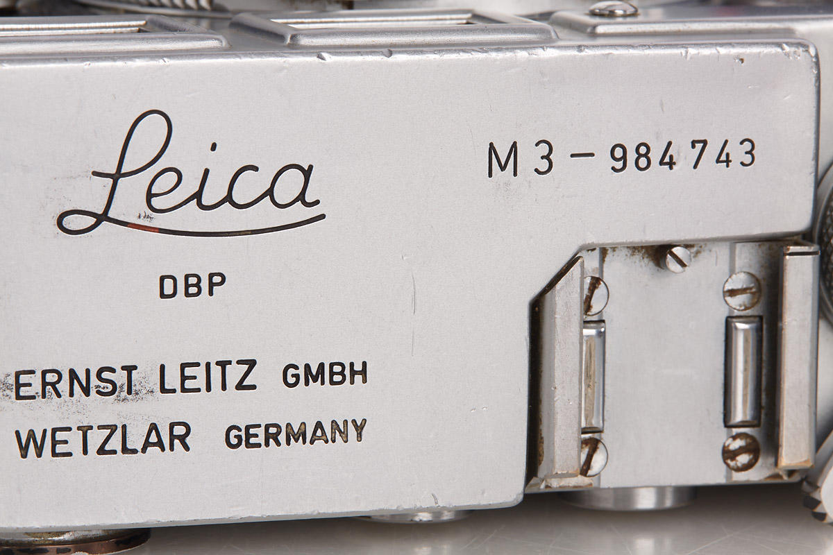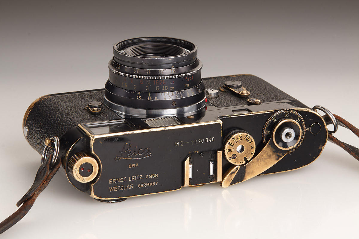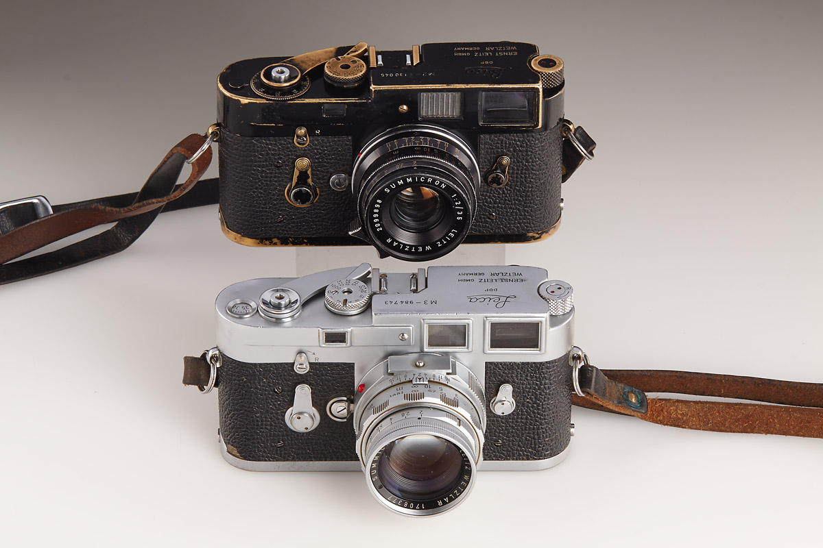 M2 black paint no. 1130045 in original condition with rare black paint 8-element Wetzlar Summicron 2/35 mm no. 2099898, M3 chrome no. 984743 with Summicron 2/50 mm no. 1708377. René Burri used these cameras for over 30 years, taking many of his iconic photographs with them. This M3 he also used for shooting Che Guevara. Comes together with an early and very rare silver print (24 x 30 cm) of Che Guevara signed by the photographer and a beautiful collage by Burri. René Burri (b. 1933) took his first photograph of a prominent person in Zurich when he was 13 – the subject was Winston Churchill. Starting in 1950, he studied to become a photographer at the School of Applied Arts in Zurich. Apart from working as a photo journalist, he also made documentary films. His first photo features were published in Swiss magazines such as Du and Camera, then increasingly by internationally renowned magazines such as Look, Paris Match, Life, Stern and GEO. In 1960 René Burri went public with a sensational reportage and exhibition entitled The Germans. His “neutrality” as a Swiss citizen had enabled him to take photographs both in the GDR and in West Germany, thus portraying both sides of the divided country from a unified, neutral and unprejudiced perspective. In 1962 he published the material in book form, adding further up-to-date images. Thereby, he probably became the only one to succeed in showing a valid image of Germany before and after the construction of the Wall, at least before the Wall came down again. He is particularly well-known for his images of Ernesto Che Guevara smoking a cigar, taken in 1963. Further personalities he portrayed include Pablo Picasso, Alberto Giacometti, Jean Tinguely and Le Corbusier. René Burri is considered a “people photographer”, meaning that his images always put the human being centre-stage, always focusing on the human element. Since 1959, Burri is member of Magnum. In 2011 he was awarded the Swiss Press Photo Lifetime Achievement Award. See lot 166 for a vintage print of the famous “Che” image. Sein erstes Foto einer prominenten Person machte René Burri (geboren 1933) im Alter von 13 Jahren in Zürich von Winston Churchill. Zum Fotografen ausbilden ließ er sich ab 1950 an der Kunstgewerbeschule in Zürich. Neben bildjournalistischen Arbeiten machte er auch Dokumentarfilme. Seine ersten Bildberichte wurden in Schweizer Zeitschriften wie Du und Camera gedruckt, später immer mehr in international renommierten Magazinen wie Look, Paris Match, Life, Stern und GEO veröffentlicht. 1960 trat René Burri mit einer aufsehenerregenden Reportage und Ausstellung Die Deutschen an die Öffentlichkeit. Durch seine „Neutralität“ als Schweizer hatte er die Möglichkeit, Bilder sowohl in der DDR als auch in Westdeutschland aufzunehmen und so die beiden Seiten des geteilten Deutschland aus einem einheitlichen, neutralen und unvoreingenommenen Blickwinkel darzustellen. Dieses Material verarbeitete er 1962 zu einem Buch, dessen Neuauflagen er um aktuelle Fotos ergänzte. Damit ist ihm bis nach dem Mauerfall wohl als Einzigem der Versuch geglückt, ein gültiges Bild Deutschlands vor und nach dem Mauerbau zu zeigen. Besonders bekannt geworden ist er 1963 durch seine Bilder des Zigarre rauchenden Ernesto Che Guevara. Weitere Persönlichkeiten, die er porträtiert hat, sind Pablo Picasso, Alberto Giacometti, Jean Tinguely und Le Corbusier. René Burri gilt als Menschenfotograf, was besagen will, dass er in seinen Bildern immer den Menschen in den Mittelpunkt stellt bzw. immer auch die menschliche Seite zeigt. Seit 1959 ist Burri Mitglied von Magnum. 2011 wurde er mit dem „Swiss Press Photo Lifetime Achievement Award“ für sein Lebenswerk ausgezeichnet. Siehe Los 166 für einen Vintageprint des berühmten „Che“ Portäts.