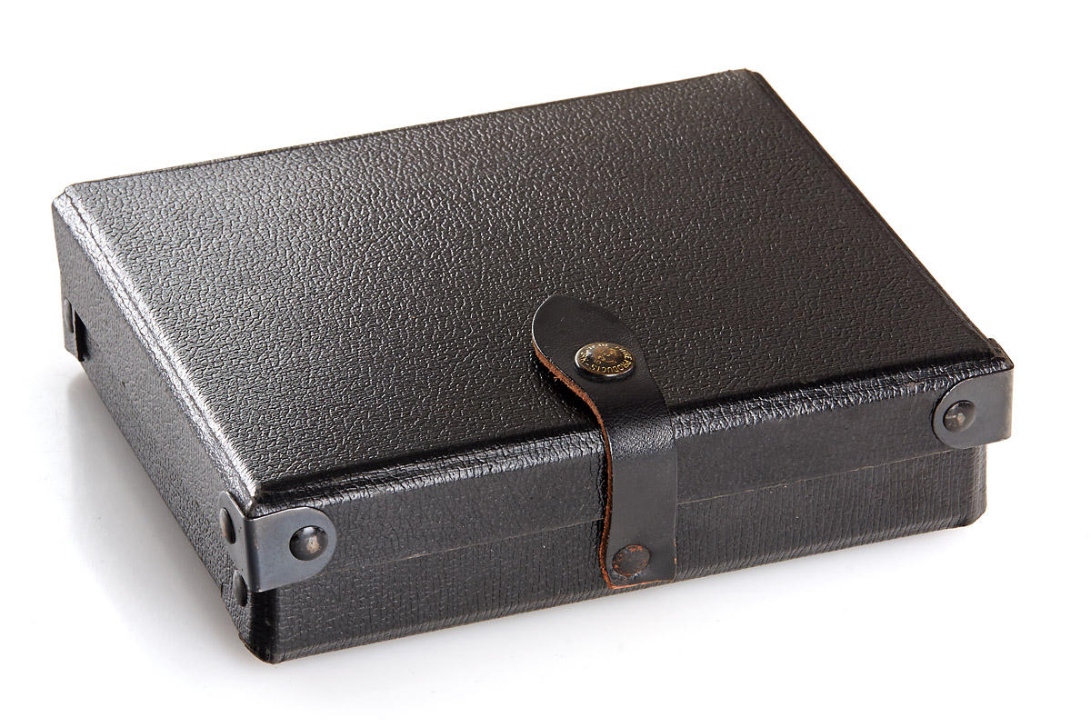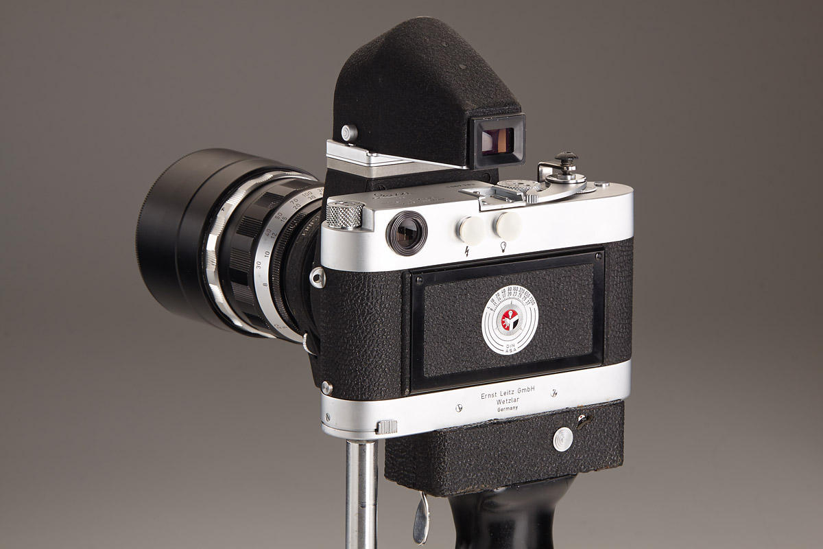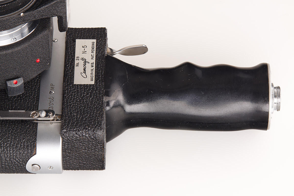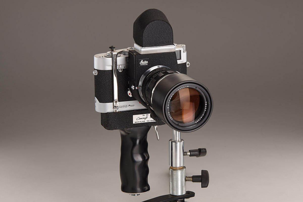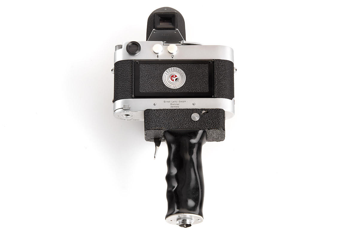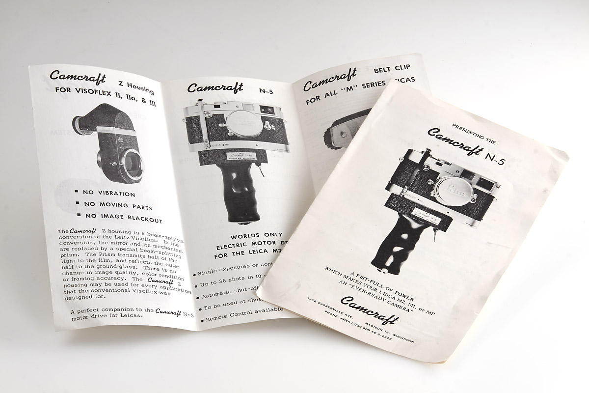 Rare outfit with electric prototype motor “Camcraft N-5” no. 28 in excellent condition, the hand grip with some small cracks, with original battery case with connection cord and strap, Camcraft maker’s case, with mint M1 no. 1067783, modified “Camcraft Z Housing” Visoflex III with pellical mirror, 90° magnifier, 16466M adapter and Telyt 4/20 cm no. 1899918, two original brochures. Provenance: Don Goldberg (son of Norman Goldberg), to the present vendor (with letter of confirmation by Don Goldberg). LITERARTUR E James L. Lager (ed), Leica Illustrated History, Vol. III, 1998, p. 67, 175. Soon after the Leica M came out, attempts were made to design an electrical motor drive for the new camera by Leitz Wetzlar. Earliest experimental units of motorized M3 cameras were completed by Leitz designer Werner Hilgendorf in 1957, which turned into the development of the motorized Leica MP2 by Adam Wagner in 1958. Neither ever went into commercial production. What was later sold as Leitz New York’s electrical motor drive for Leica M2-M and M4-M/MOT cameras from 1965 originated with Norman Goldberg in the early 1960s. Goldberg designed, manufactured and marketed his early motor called “Camcraft N-5”, based on a Leicavit-MP with a grip that contained the motor. Only less than 30 units of this version seem to have been completed. A more streamline version followed in 1964 and was sold to TPI in California, who announced it as REMODRIVE in spring 1965, before E. Leitz Inc. purchased all rights and formally announced the Leica Motor in late 1965. Schon bald nach der Einführung der Leica M wurden bei Leitz Wetzlar Versuche für einen elektrischen Motorantrieb zu der neuen Kamera unternommen. Frühe Versuchsmuster einer motorisierten M3 Variante gehen auf Leitz Konstrukteur Werner Hilgendorf und das Jahr 1957 zurück, woraus Adam Wagner 1958 schließlich die Leica MP2 entwickelte. Keine dieser beiden Varianten wurden jemals in Serie gefertigt. Was im Jahr 1965 schließlich als Leitz New York Elektromotor für die Leica Modelle M2-M und später M4-M/MOT eingeführt wurde, geht auf Norman Goldberg und die frühen 1960er Jahre zurück. Goldberg entwickelte seinen frühen Motorantrieb, genannt „Camcraft N-5“, den er auch selbst herstellte und vertrieb. Dieser bestand aus einem modifiziertem Leicavit-MP, an dem ein Griff angebracht war, in dem der Motor Platz fand. Vermutlich wurden insgesamt weniger als 30 Exemplare von dieser Version gefertigt. Darauf folgte eine Konstruktion mit einer kompakteren, gefälligeren Form, die an TPI in Kalifornien verkauft wurde und von dort als REMODRIVE im Frühjahr 1965 vorgestellt wurde, bevor E. Leitz Inc. alle Rechte daran erwarb und den „Leica-Motor“ schließlich Ende 1965 offiziell ankündigte.