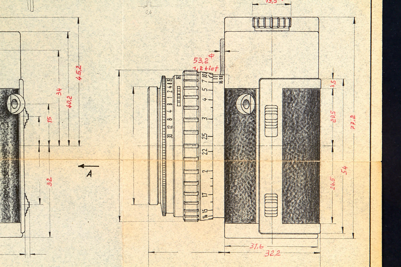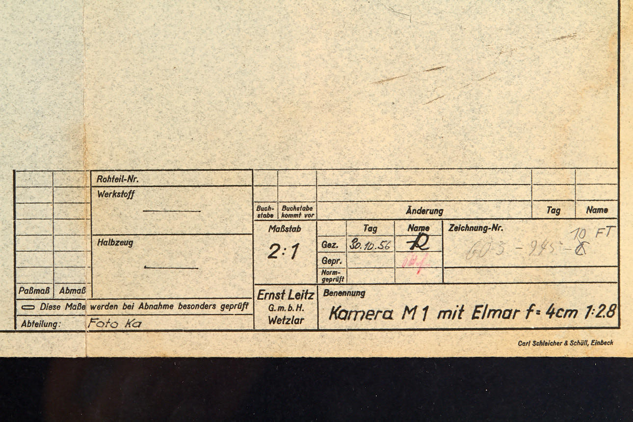 Mid of the fifties Leica developed an M prototype with coupled selenium meter and a fixed Elmar 2.8/4cm lens with Compur shutter, only one functional prototype survived - this the original blueprint (42x59cm) from October 1956, scale 2:1, framed - see: '10 Jahre Leica Historica' page 34/35