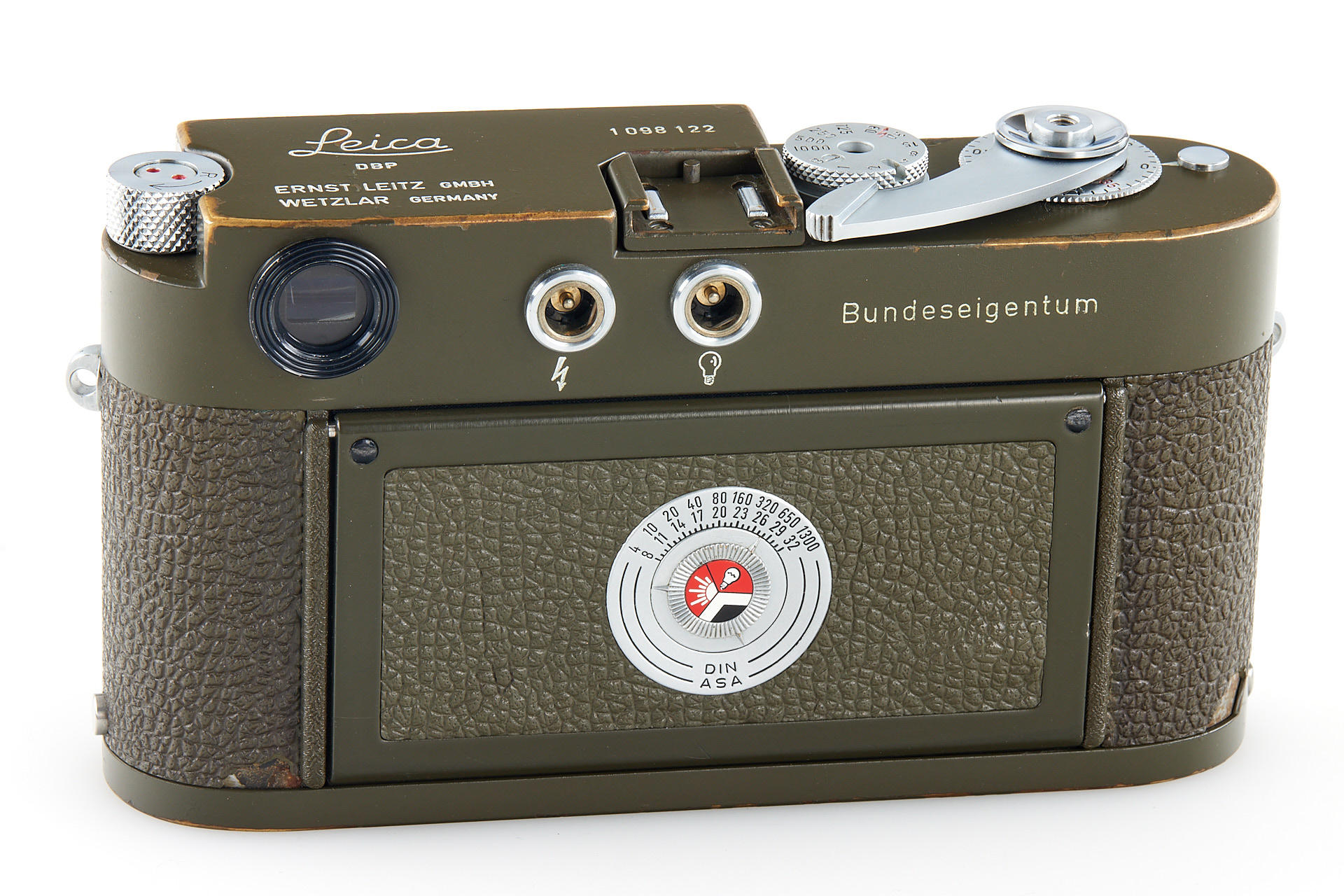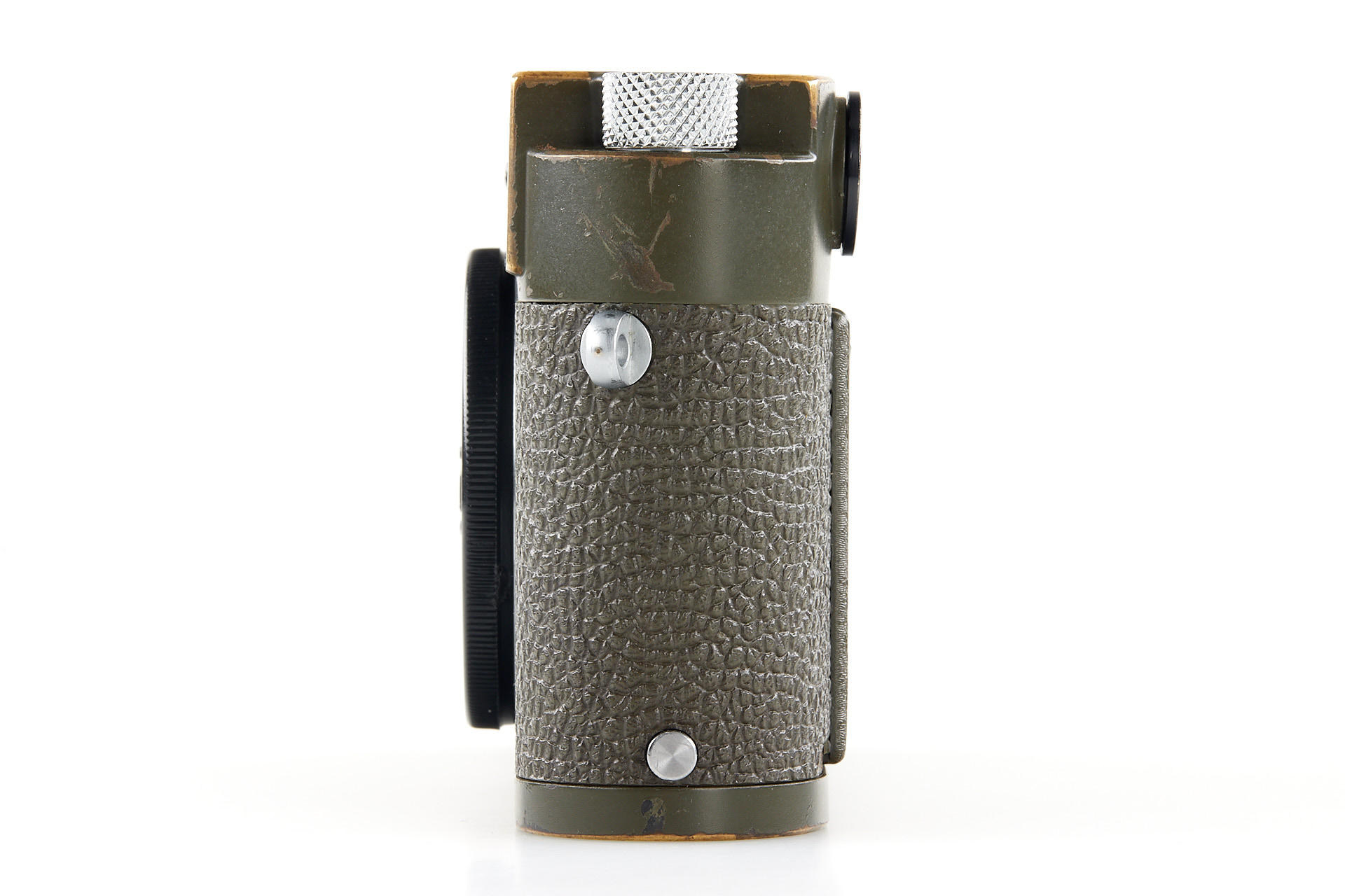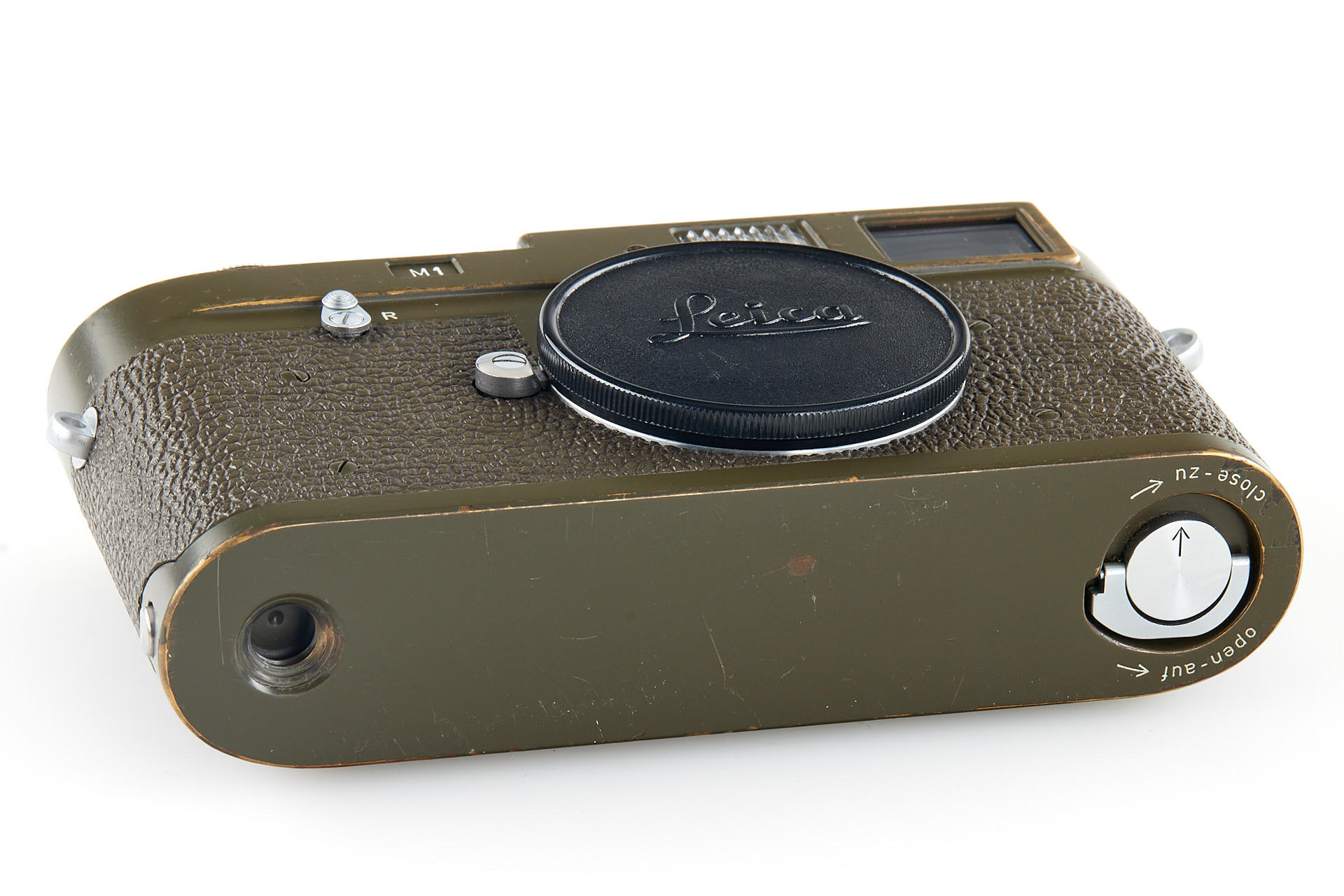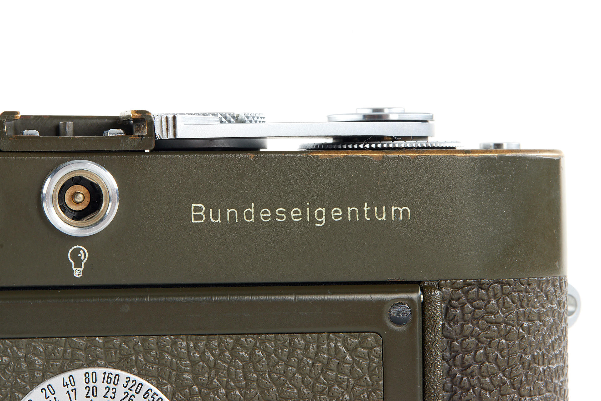 original Leica M1 olive, late version engraved on the rear of the top plate with 'Bundeseigentum' only, in very good condition, (two small pieces of Vulkanite missing), including written expertise from Mr. Ottmar Michaely