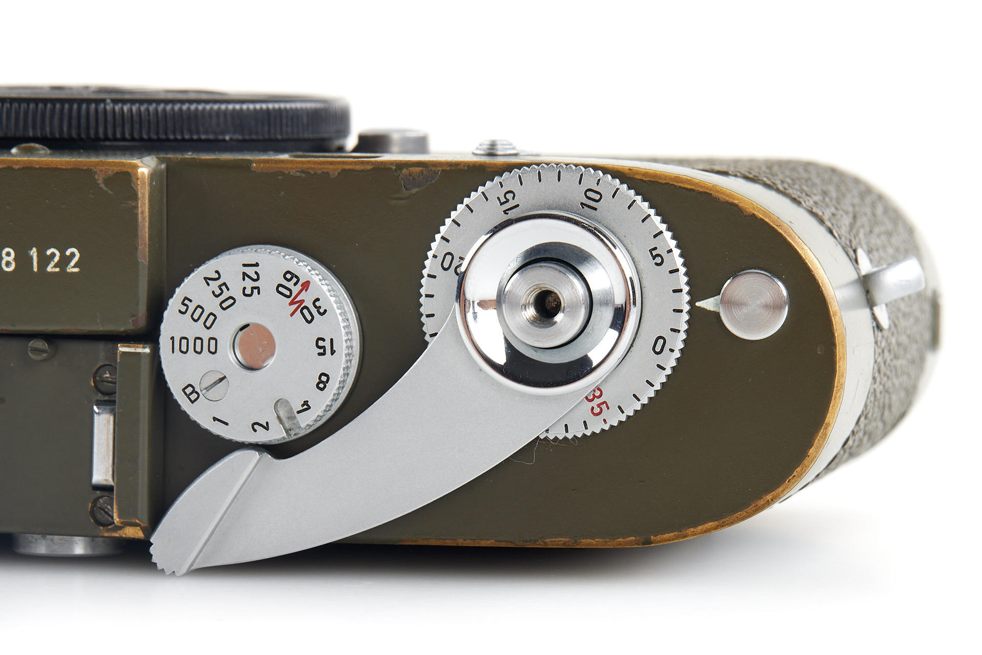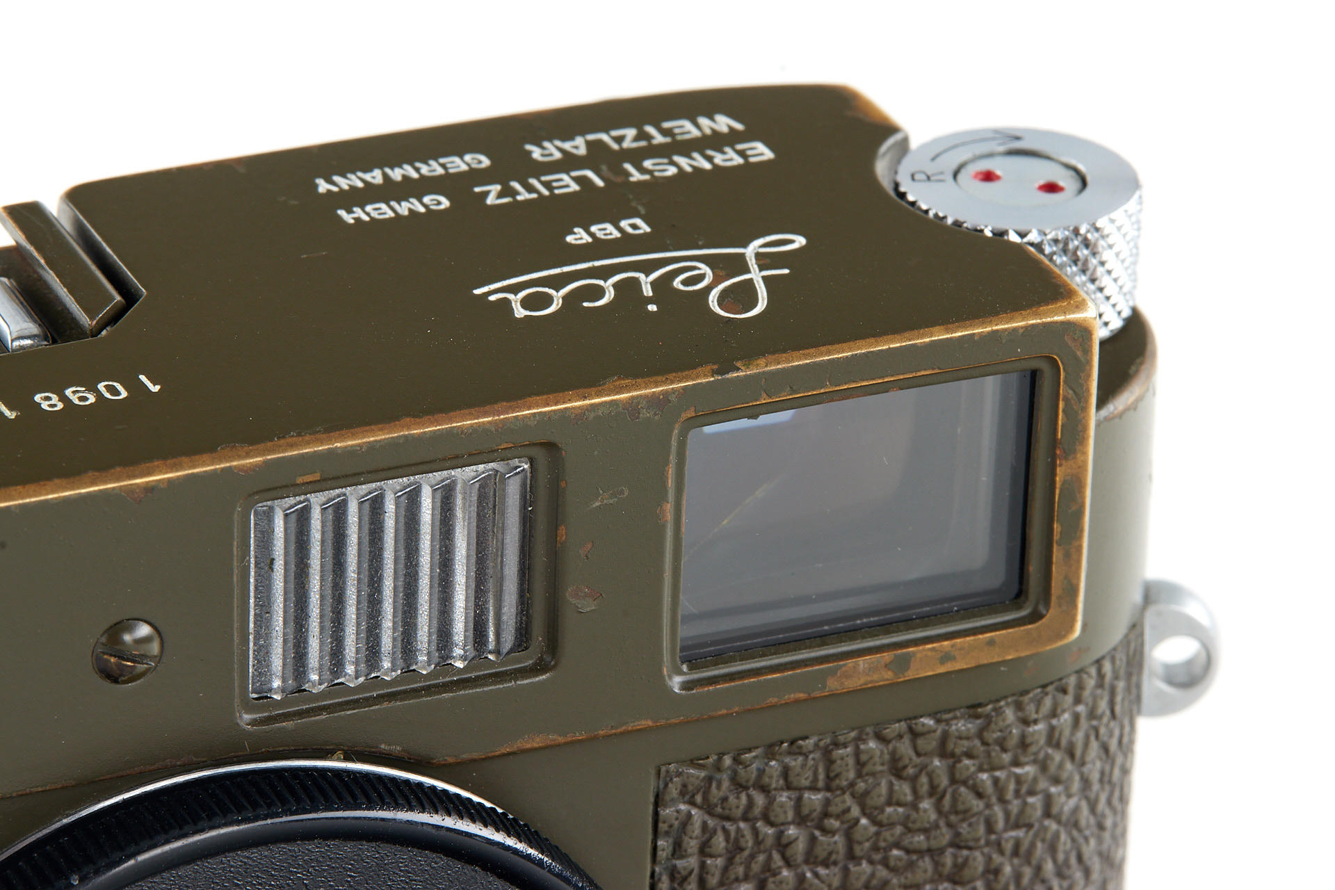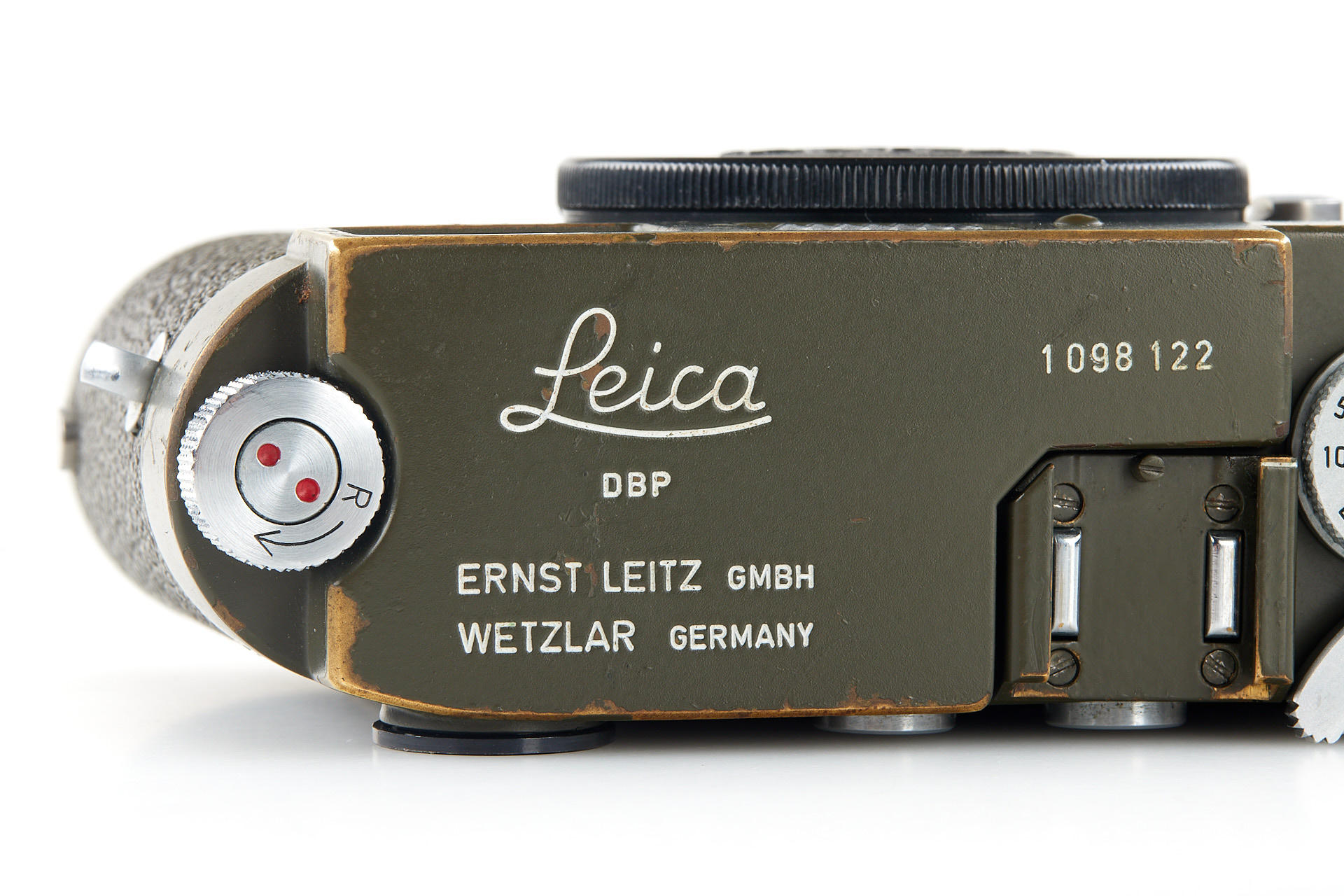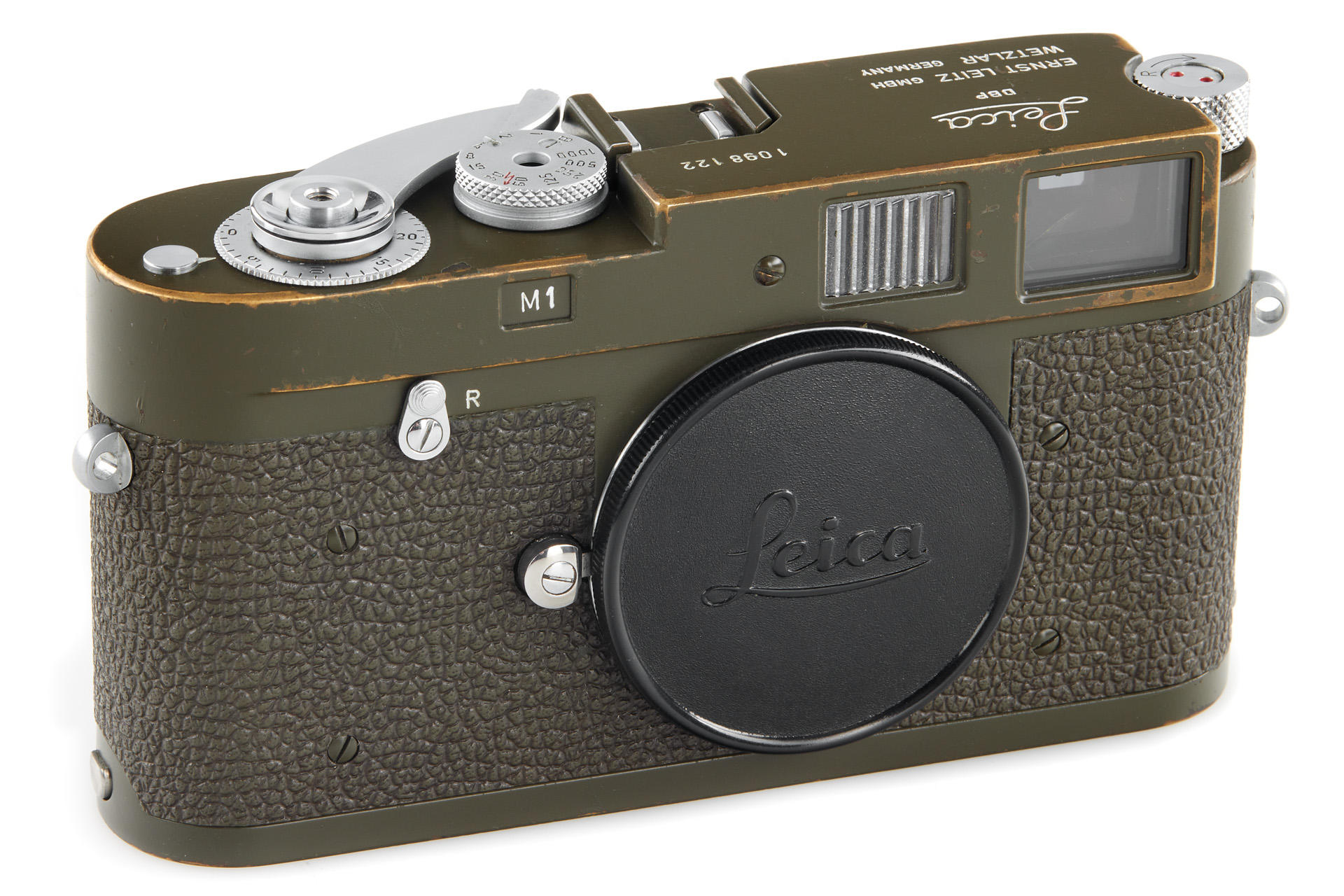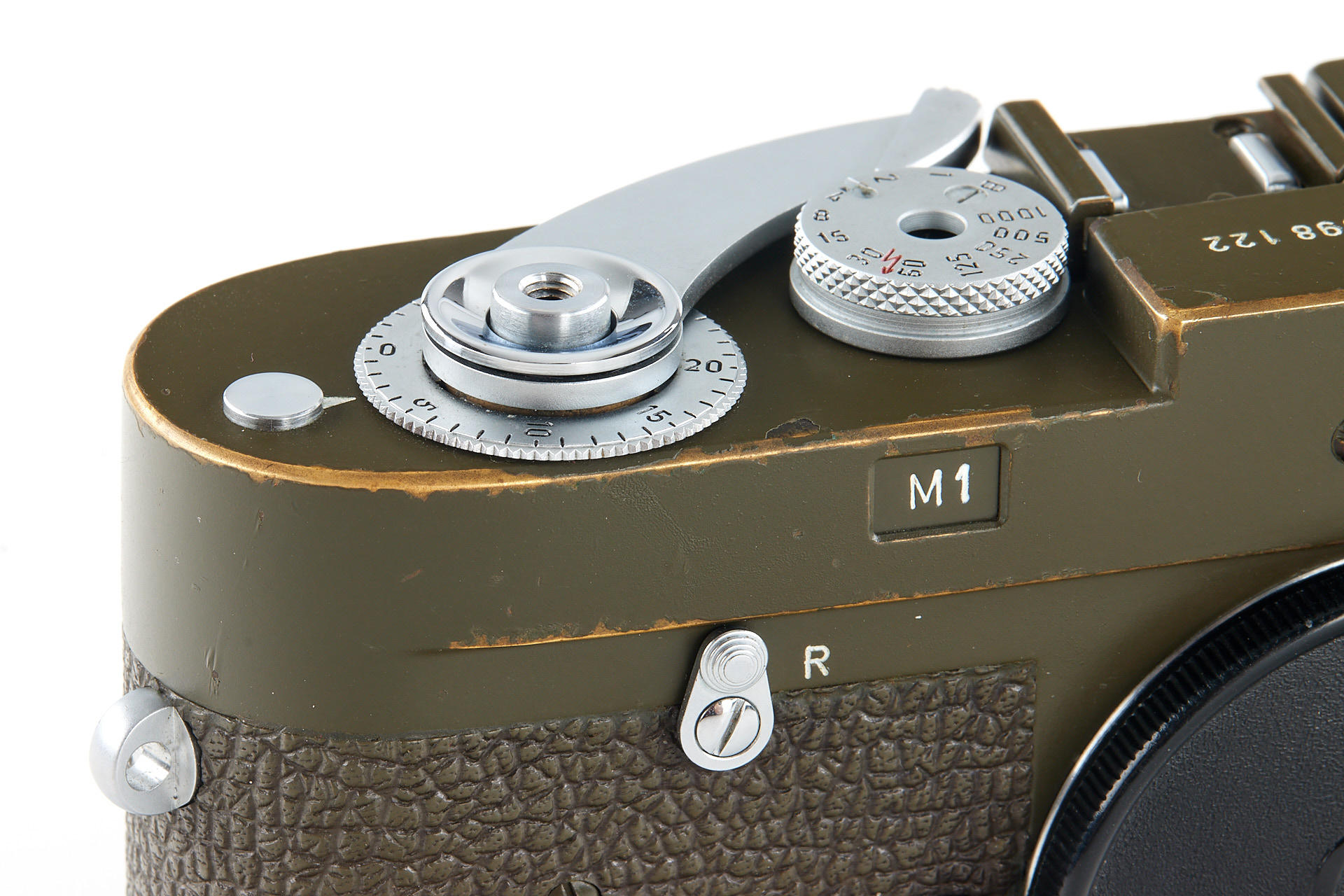 original Leica M1 olive, late version engraved on the rear of the top plate with 'Bundeseigentum' only, in very good condition, (two small pieces of Vulkanite missing), including written expertise from Mr. Ottmar Michaely