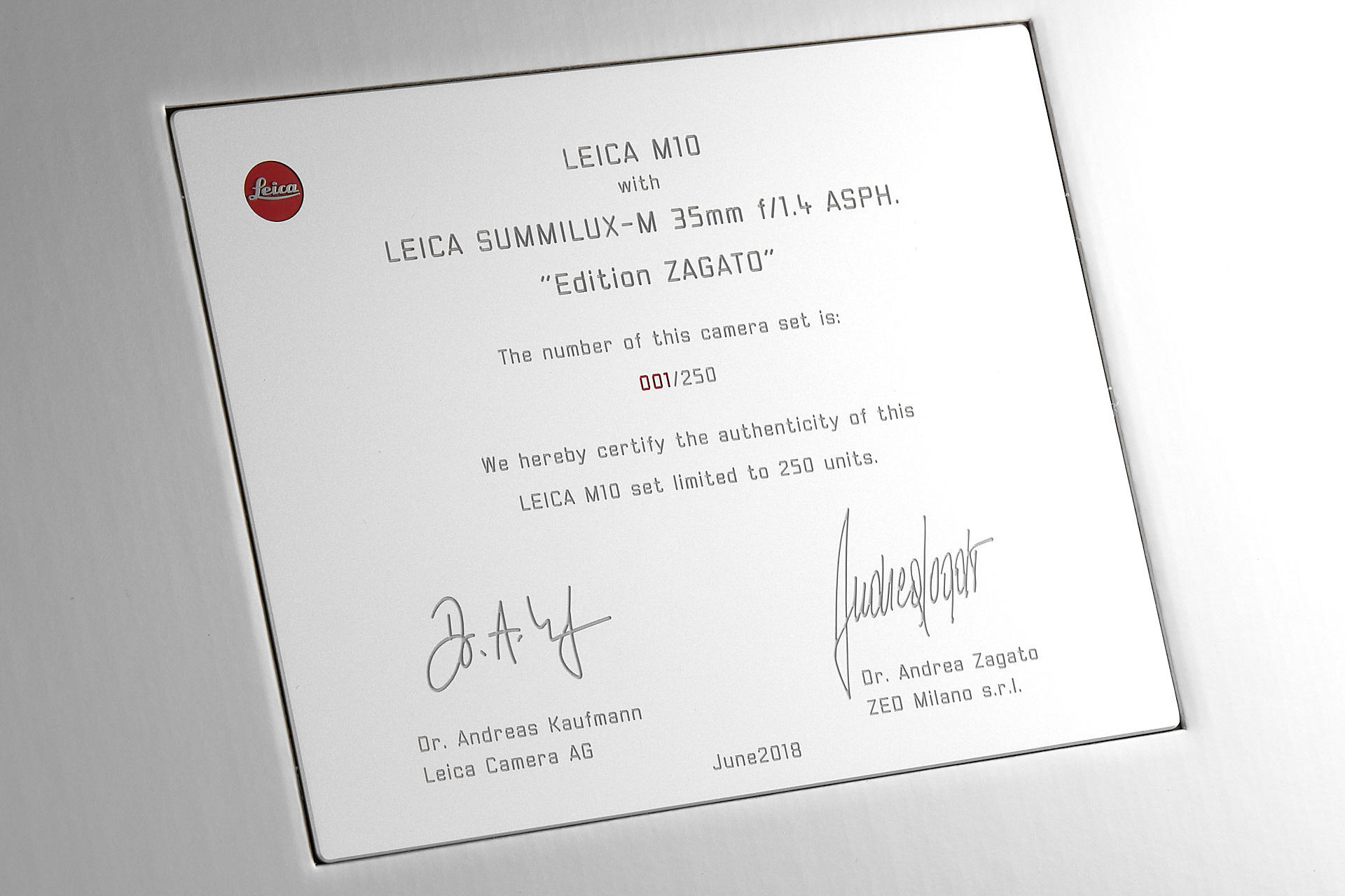 One of the most striking and sought after special editions of Leica, designed by Andrea Zagato, it was the debut special edition Leica M10. The offered set bears the special serial number 001/250, includes the camera body no.5324000, Summilux-M 1.4/35mm ASPH. no.4728400 and all accessories, papers and boxes. It is in perfect, unused condition.