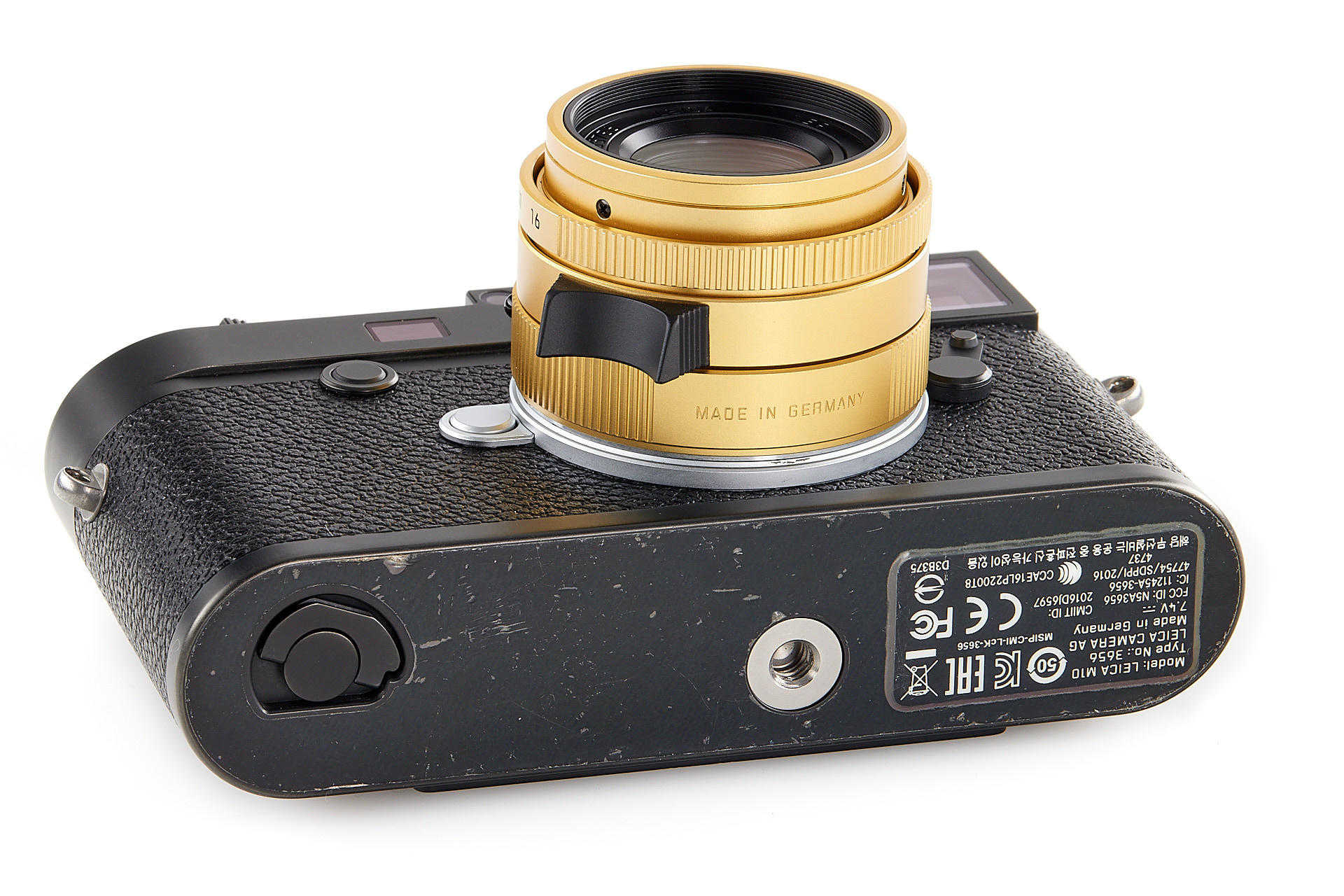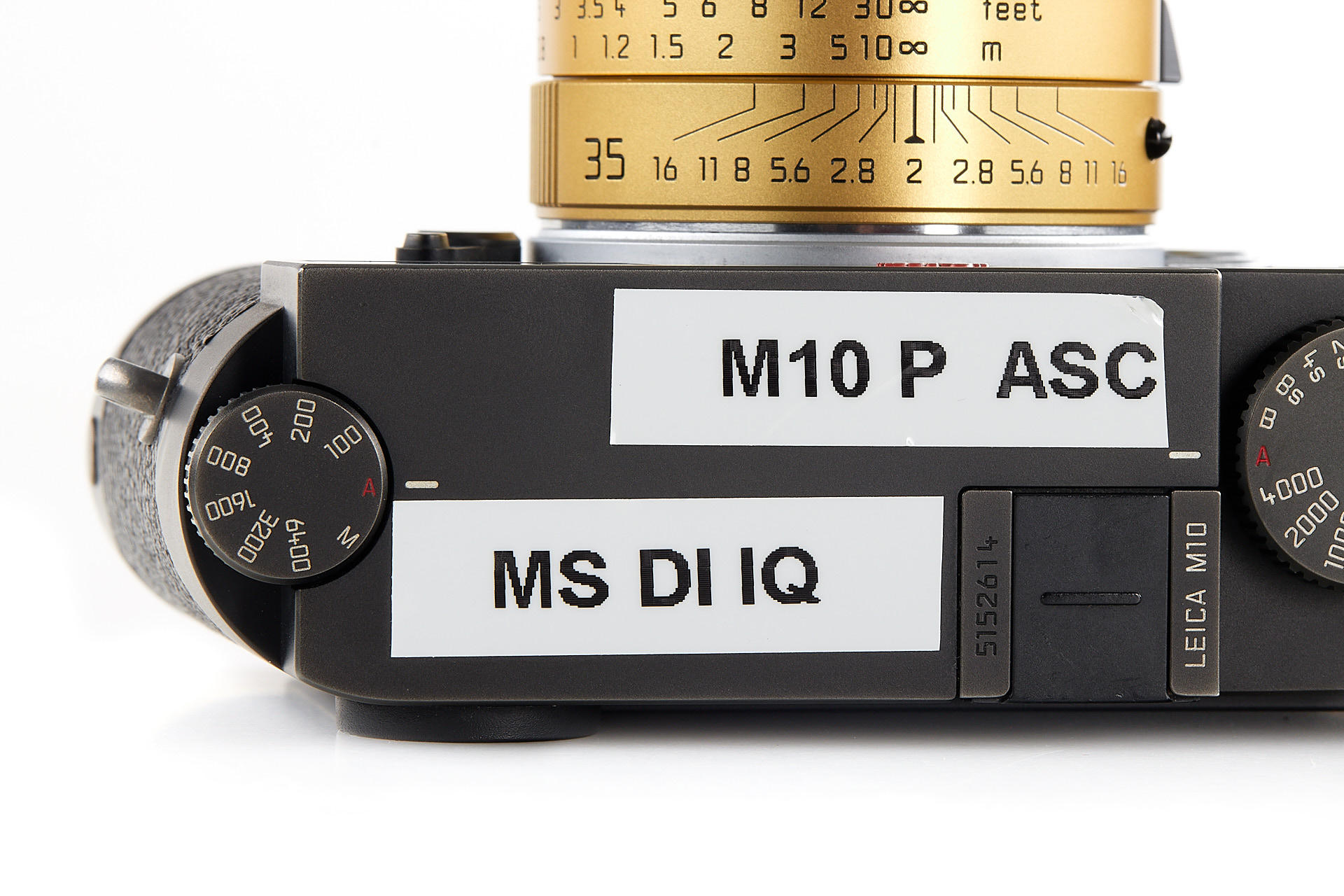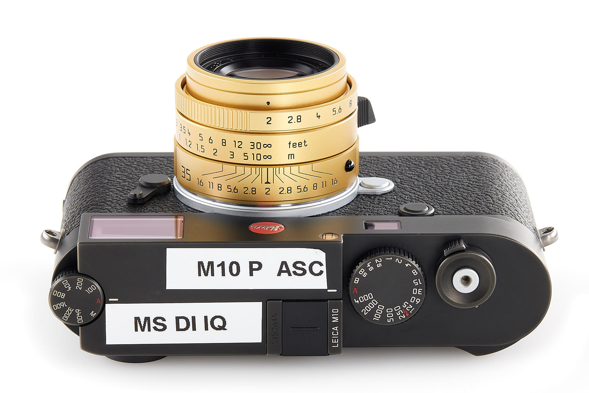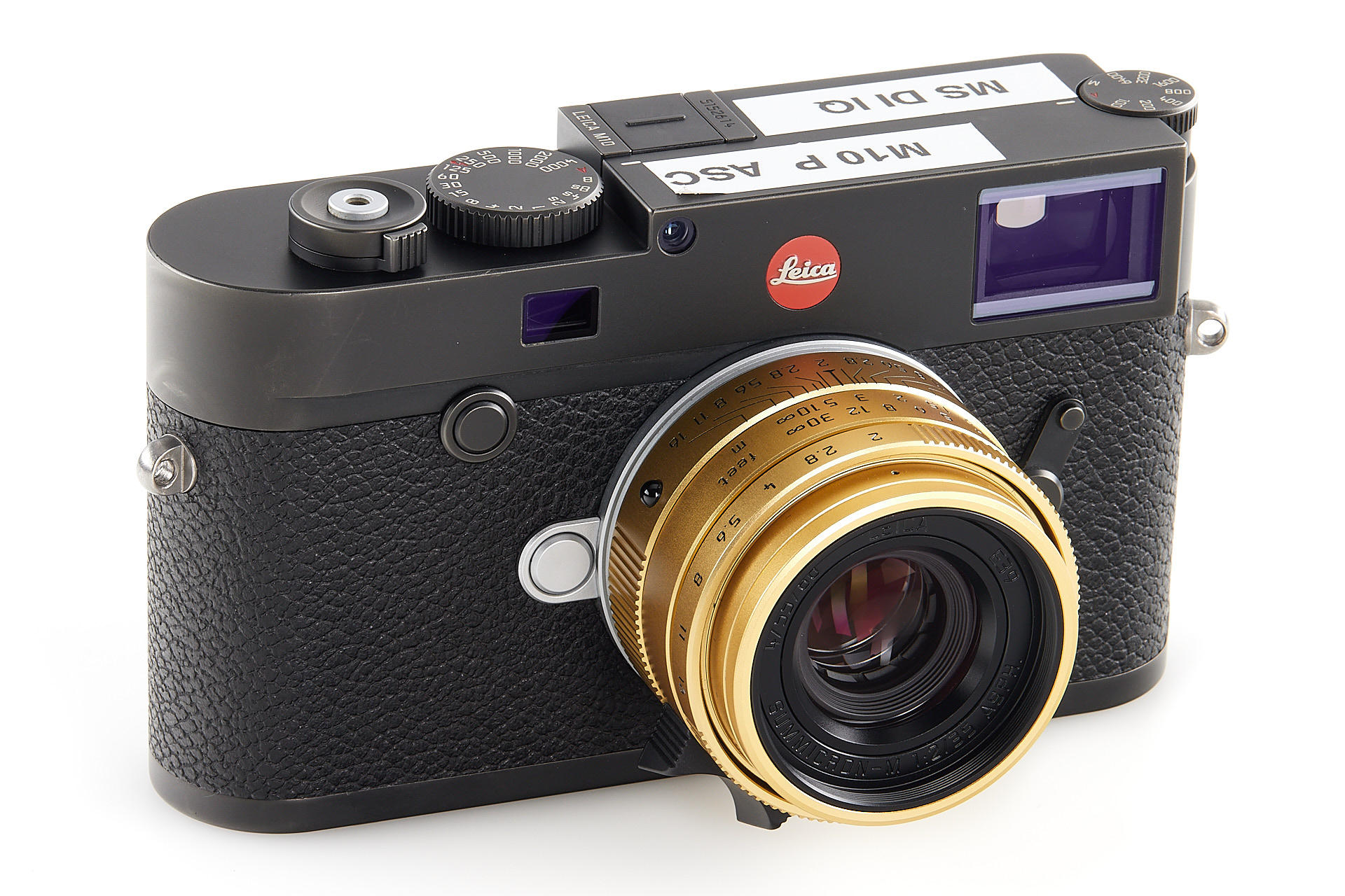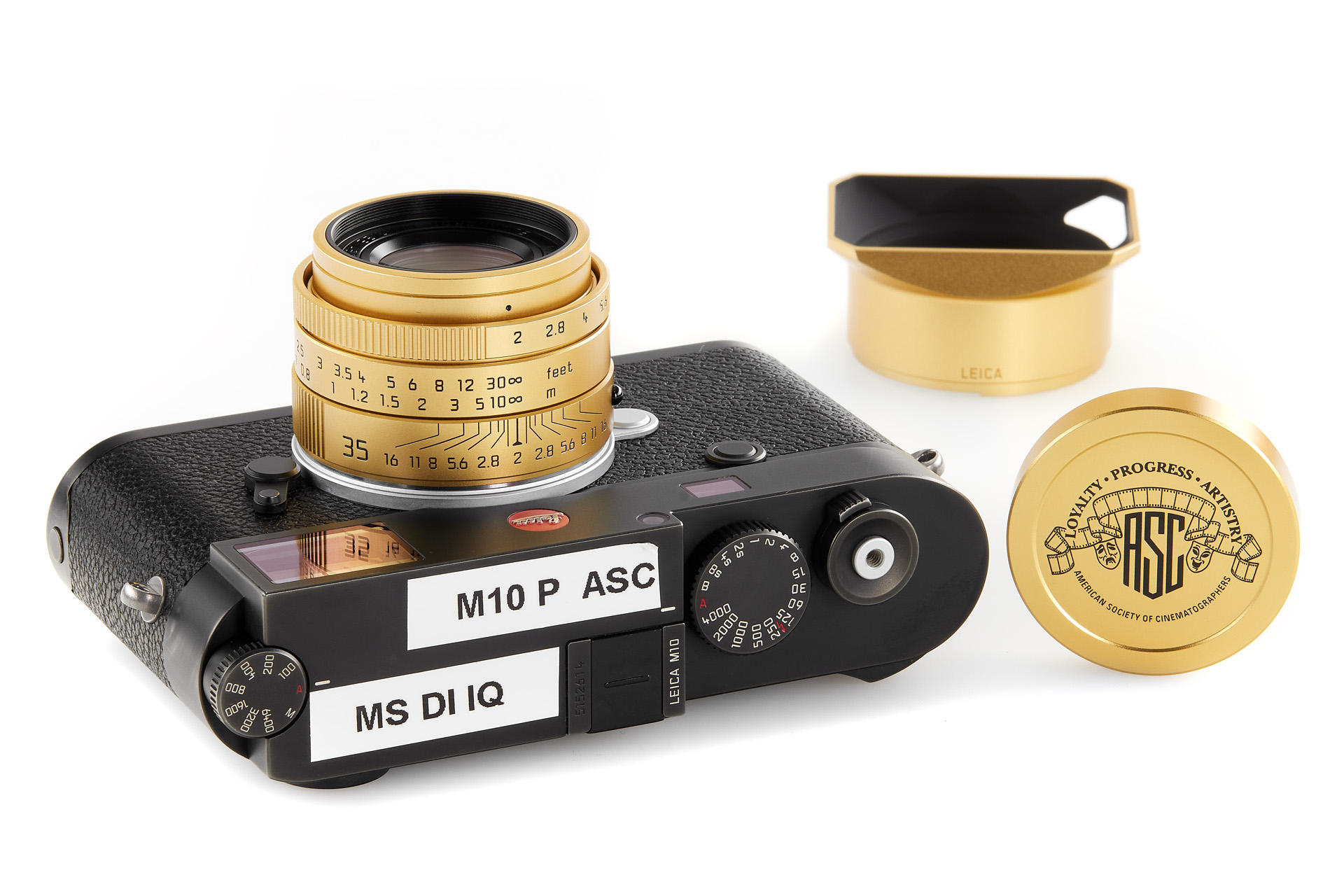To celebrate the 100th anniversary of the founding of the American Society of Cinematographers, Leica brought in 2019 an exclusive rendition of the M10-P. The offered camera is a unique prototype from this special series, electronically modified to enable the special ASC camera firmware to be used. The top of the camera shows special factory-internal stickers with prototype designation. It comes with a battery, charger, body cap, in an M10 box. Included is a matching ASC edition, mint, golden-coloured Summicron-M 2/35mm ASPH (with golden front cap and hood, in unmarked maker's box)