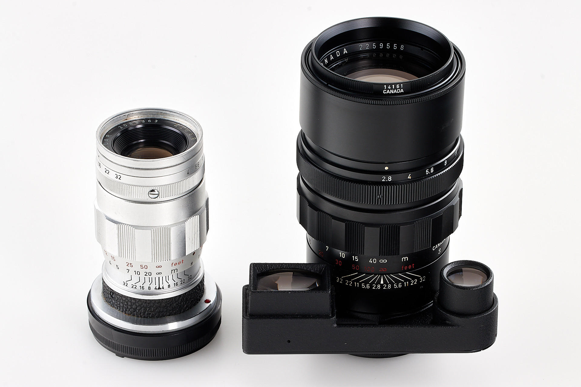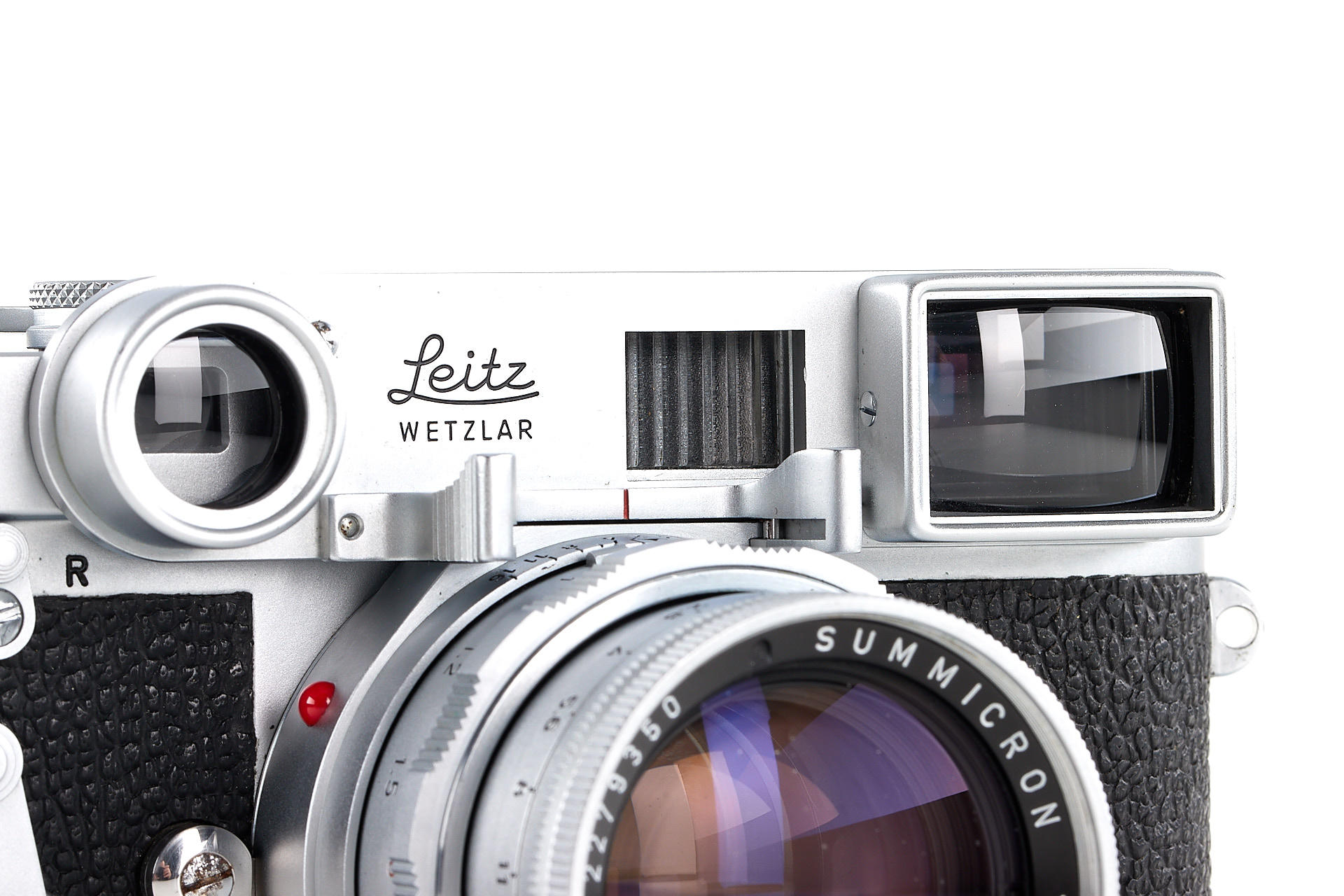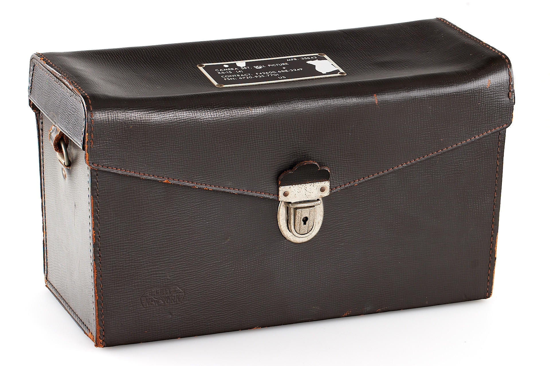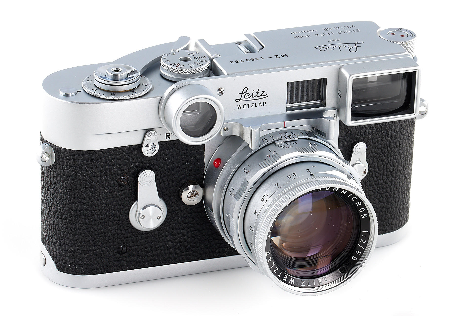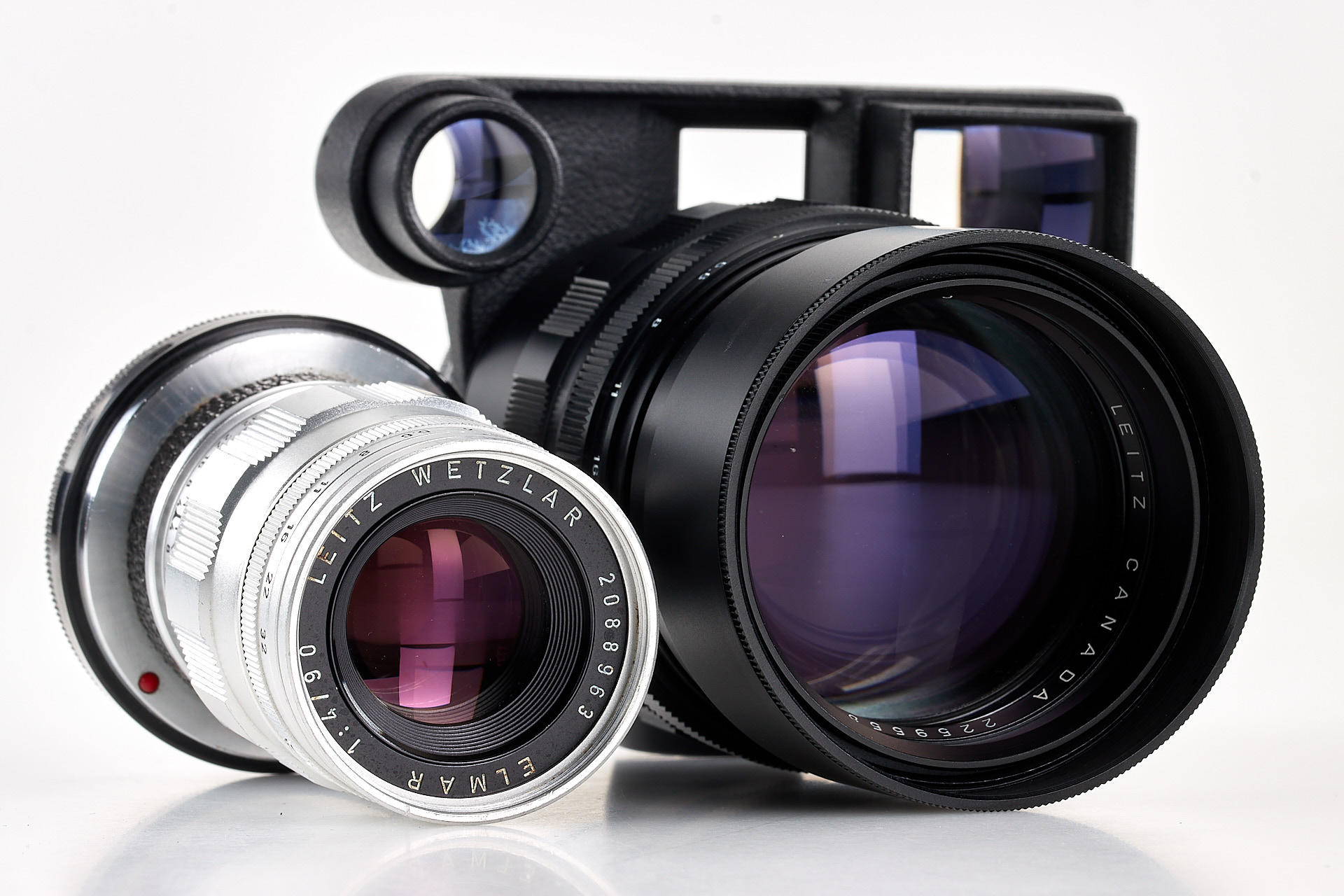 an authentic military outfit, issued by Leitz for the U.S. Army. Including a M2 body with M4 three-prong rapid load system - a modification requested by the U.S. Army, close-focus Summicron 2/50mm no.2279350, 3-element Elmar 4/90mm no.2088963 and Elmarit 2.8/135mm no.2259558, as well as an original outfit case, with a special plaque 'Camera Set, Still Picture KS-15'
