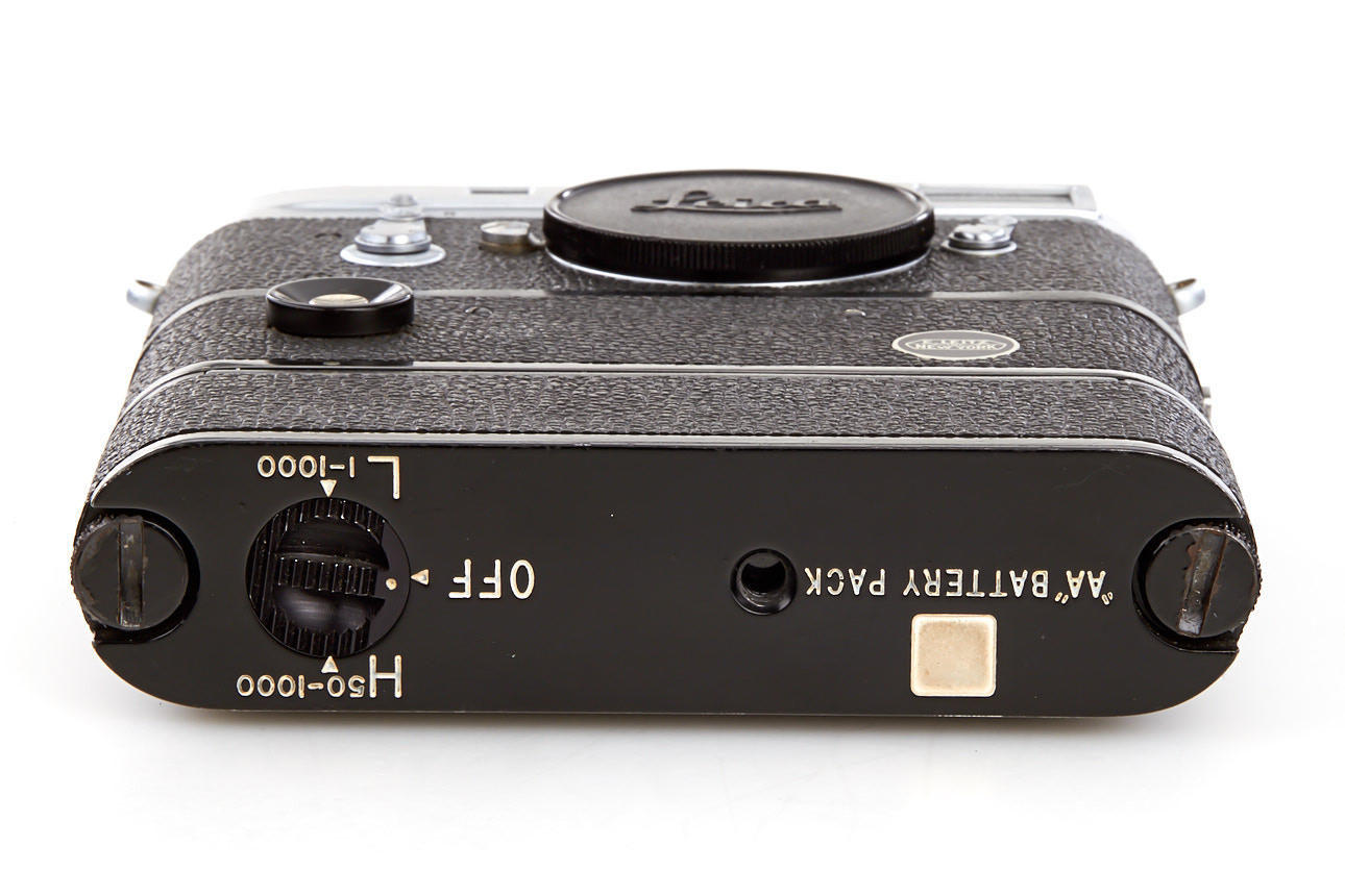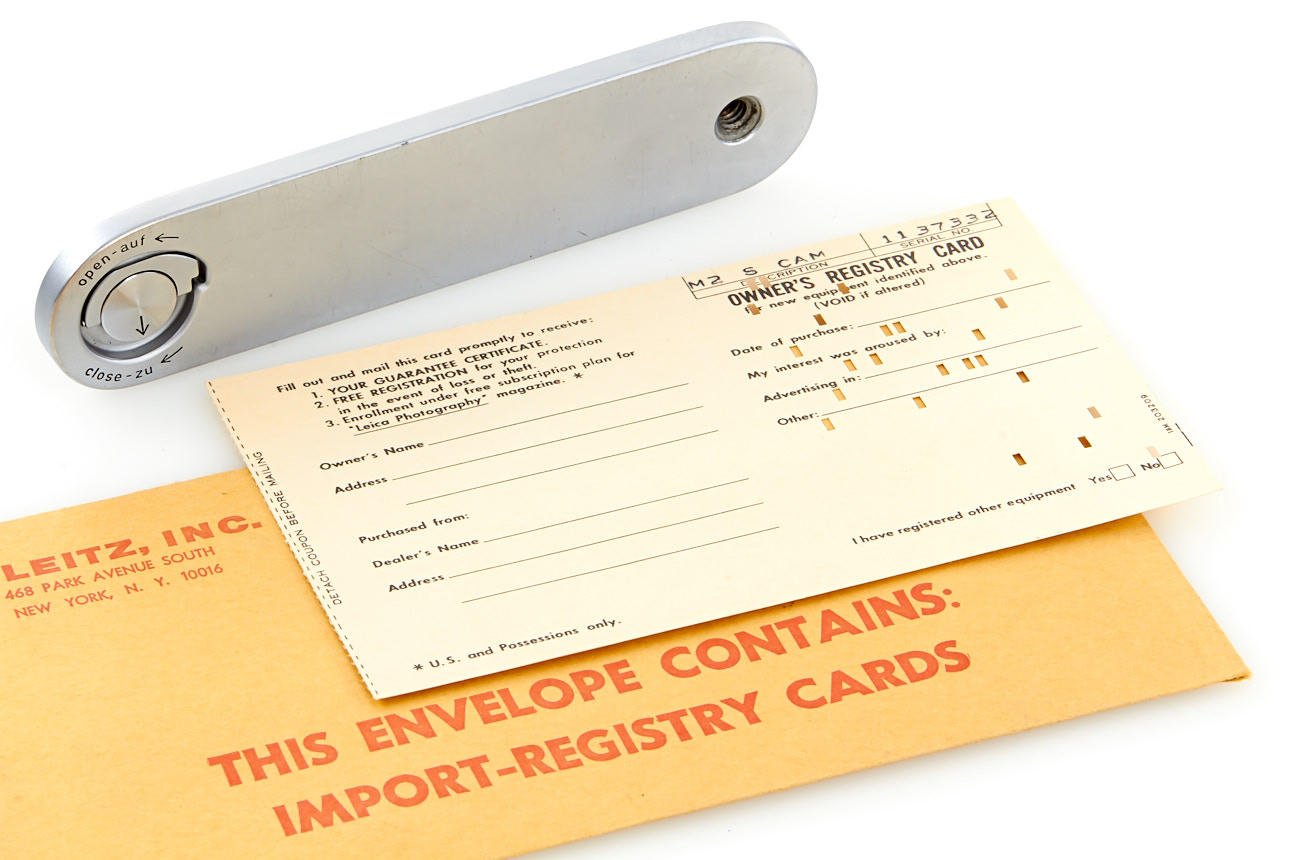 chrome body with factory-installed motor drive coupling, in very good working condition, with NY Motor drive no.02471 in very good condition and perfect working order, incl. AA Battery Pack, normal base plate for the camera, import documents for the camera from Leitz NY