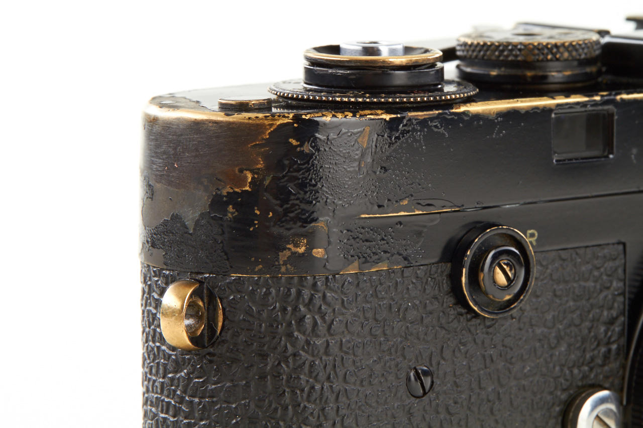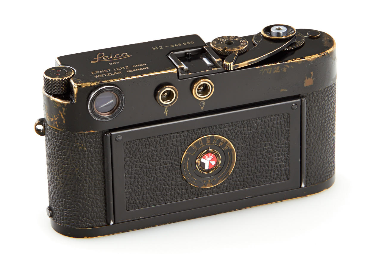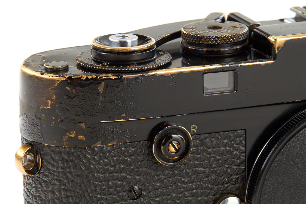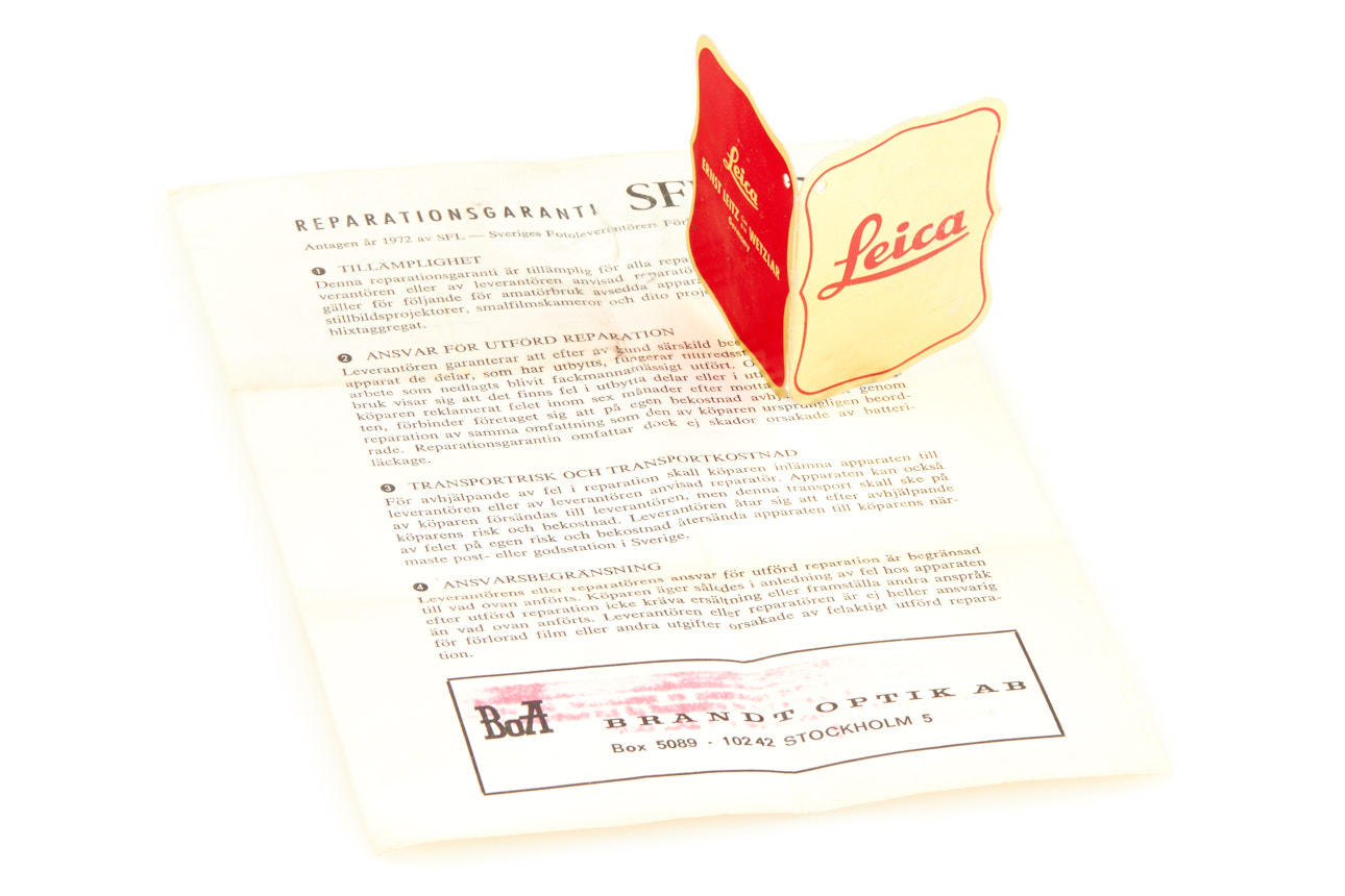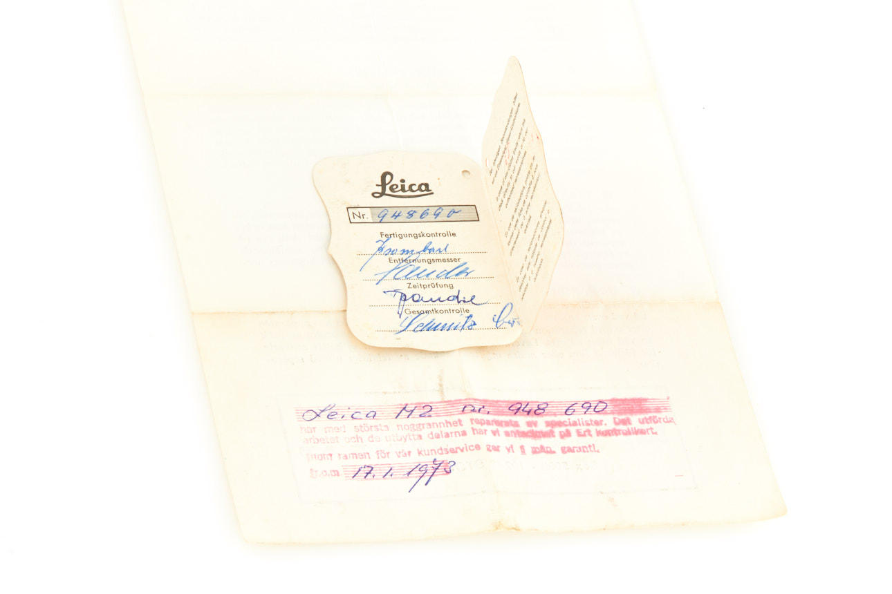 Rare camera from the very first batch of 500 black-paint M2 cameras (nos. 948601-949100) with button rewind unlock, in original condition and perfect working order, with all early features like frame line illumination window with real glass, no self-timer, black paint base plate lock etc. - the rare camera is in perfect working condition with nice patina, incl. service letter from 1973 and original control tag