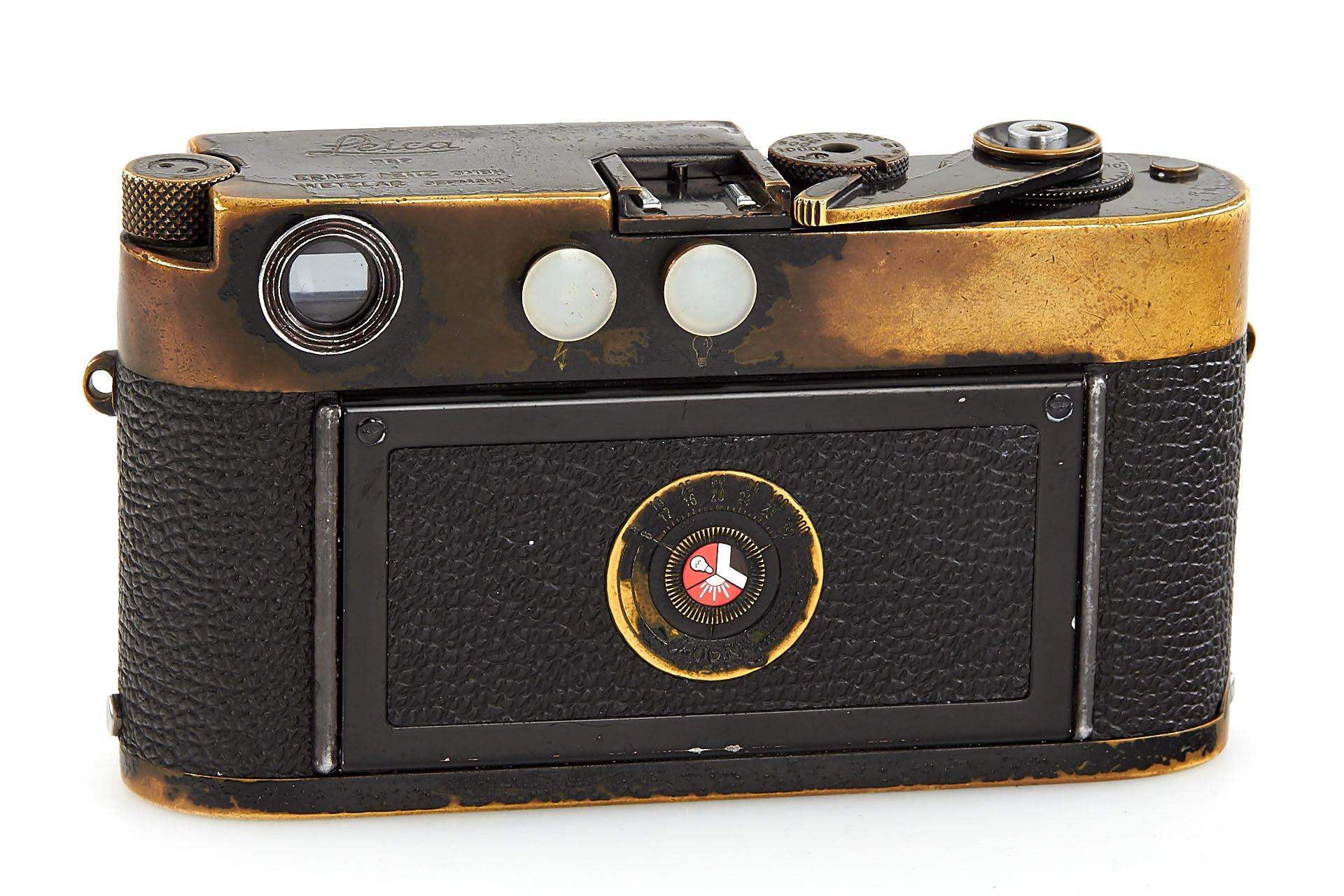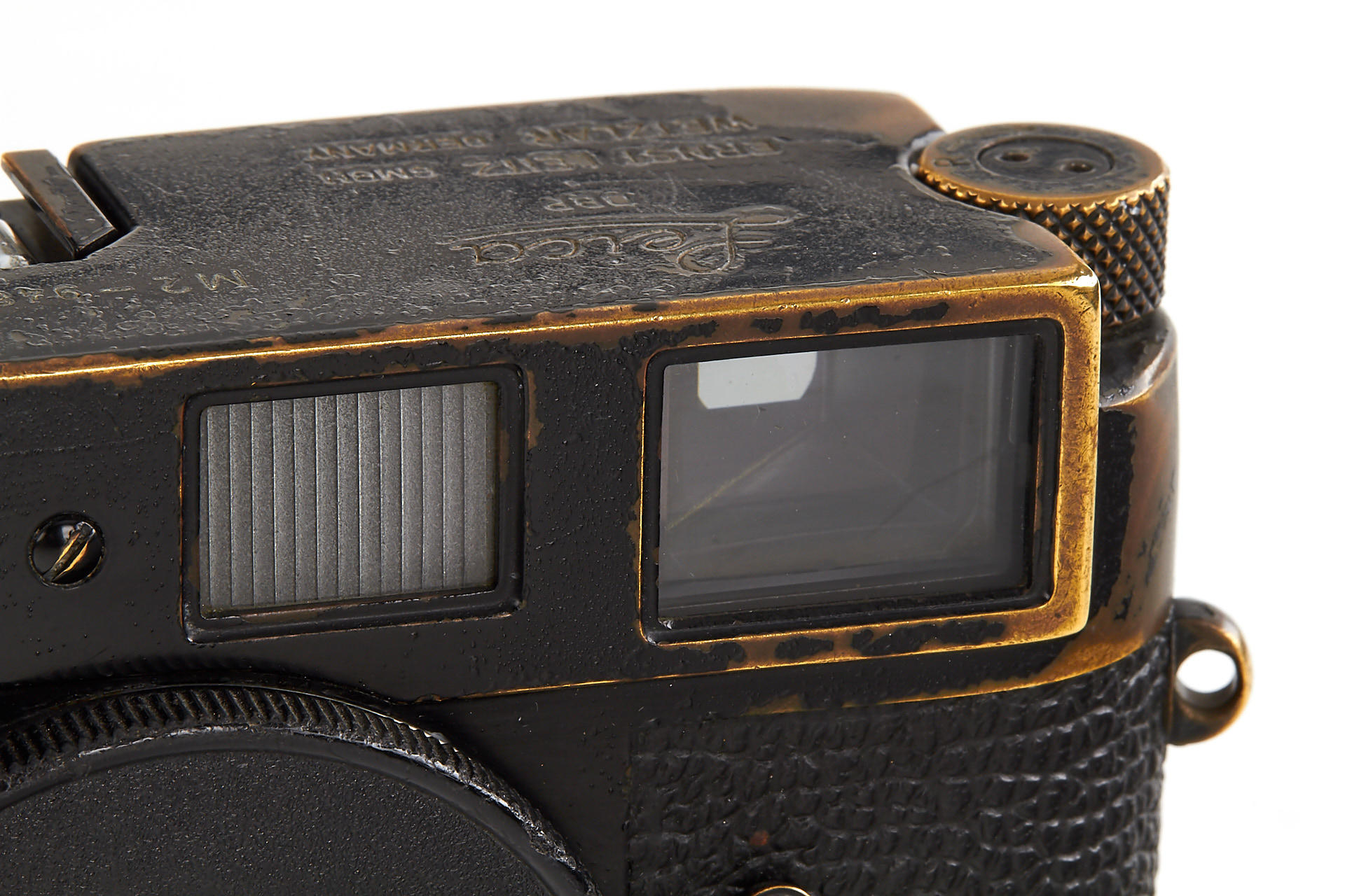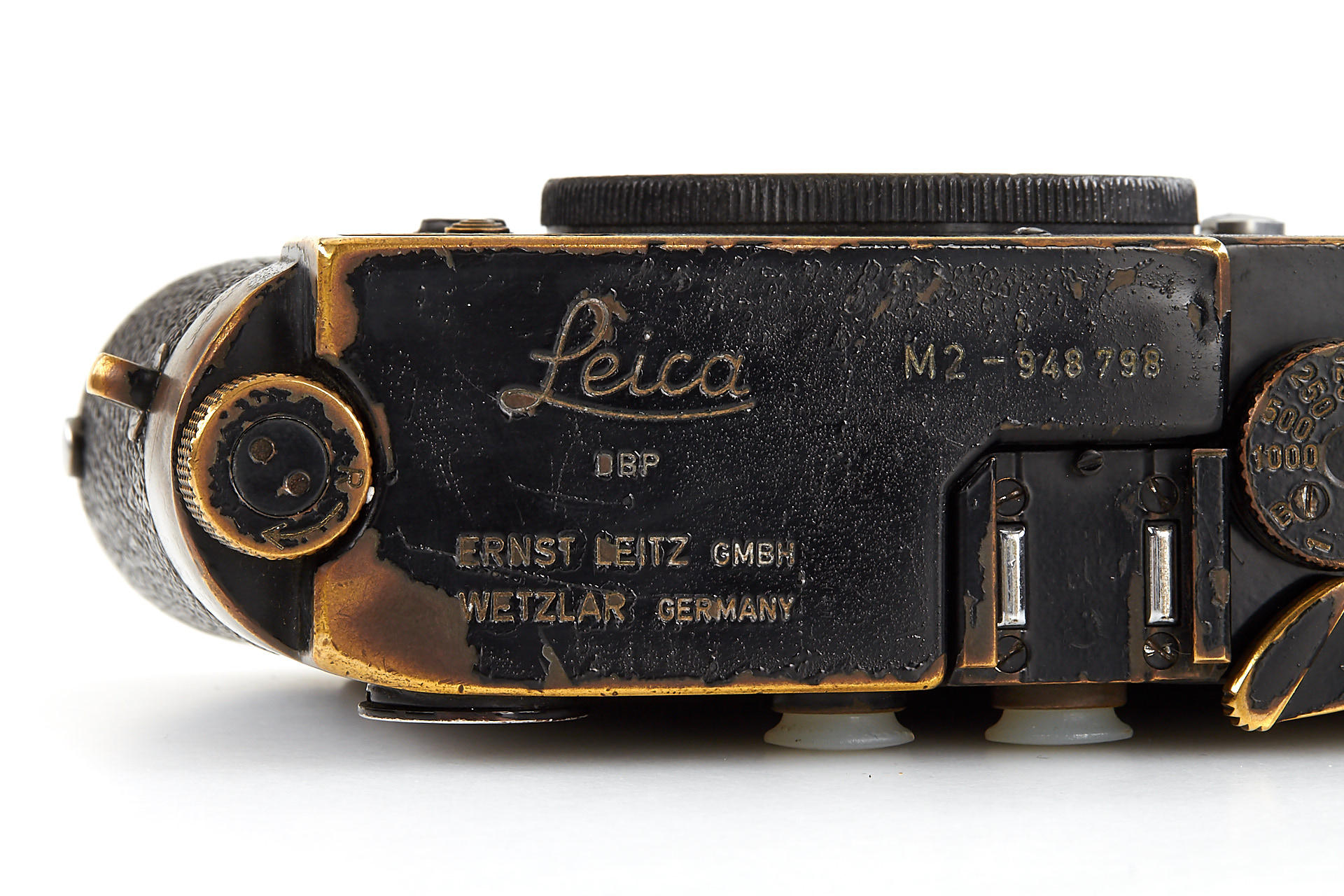 rare camera from the very first batch of 500 black paint M2 with button rewind unlock (serial number range 948601-949100). With all the original features: all-black bottom-plate lock, frame line illumination window with real glass and no self-timer. In fine condition and good working order.