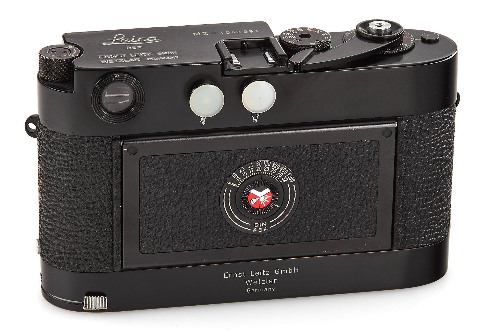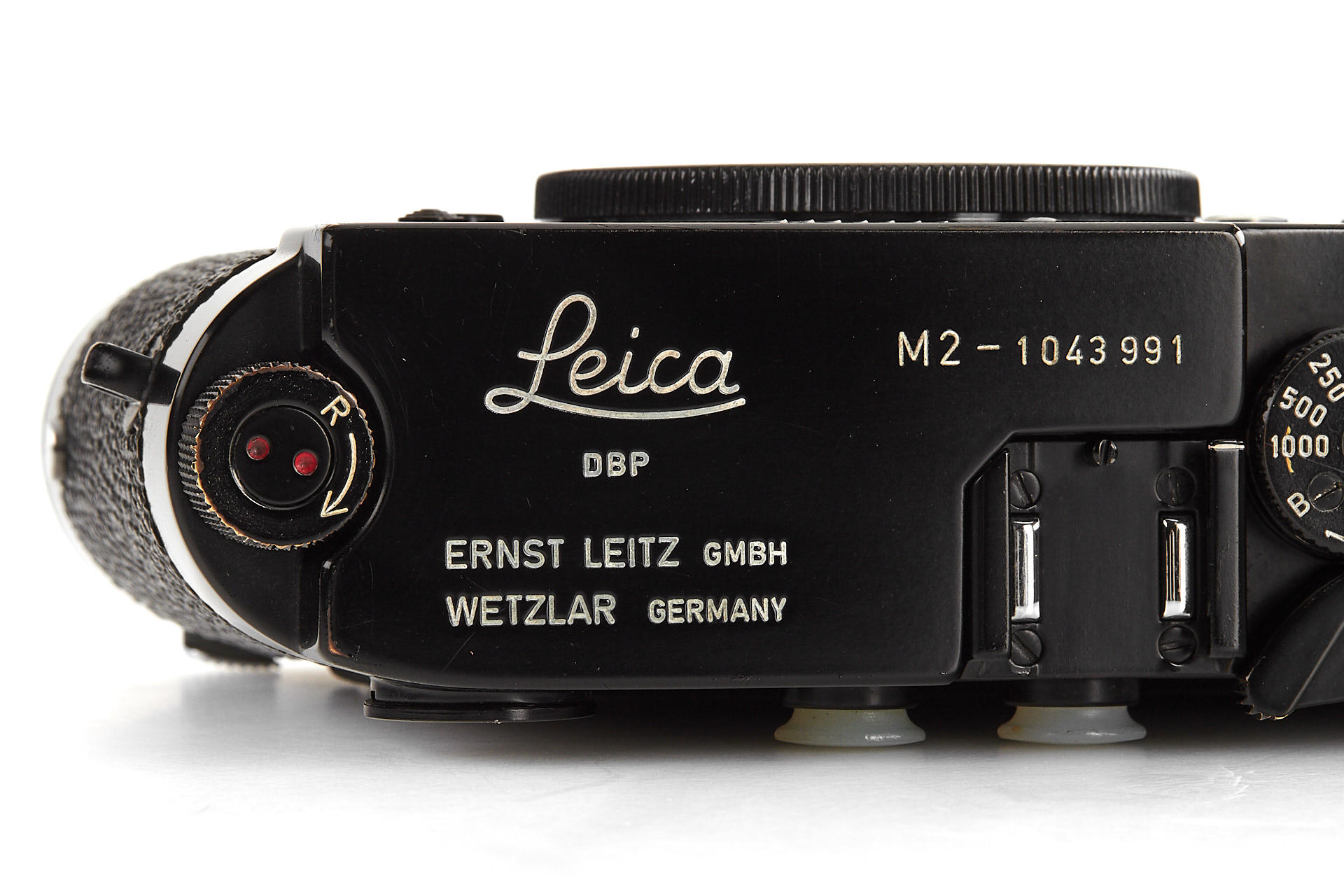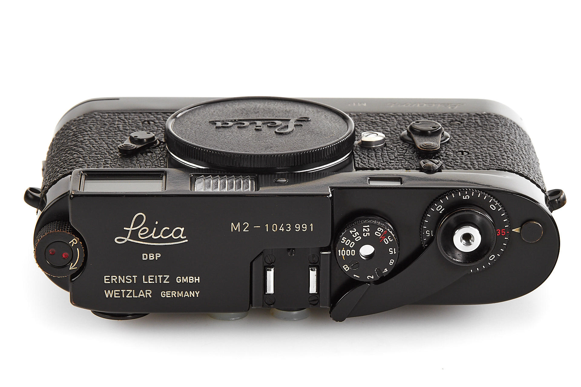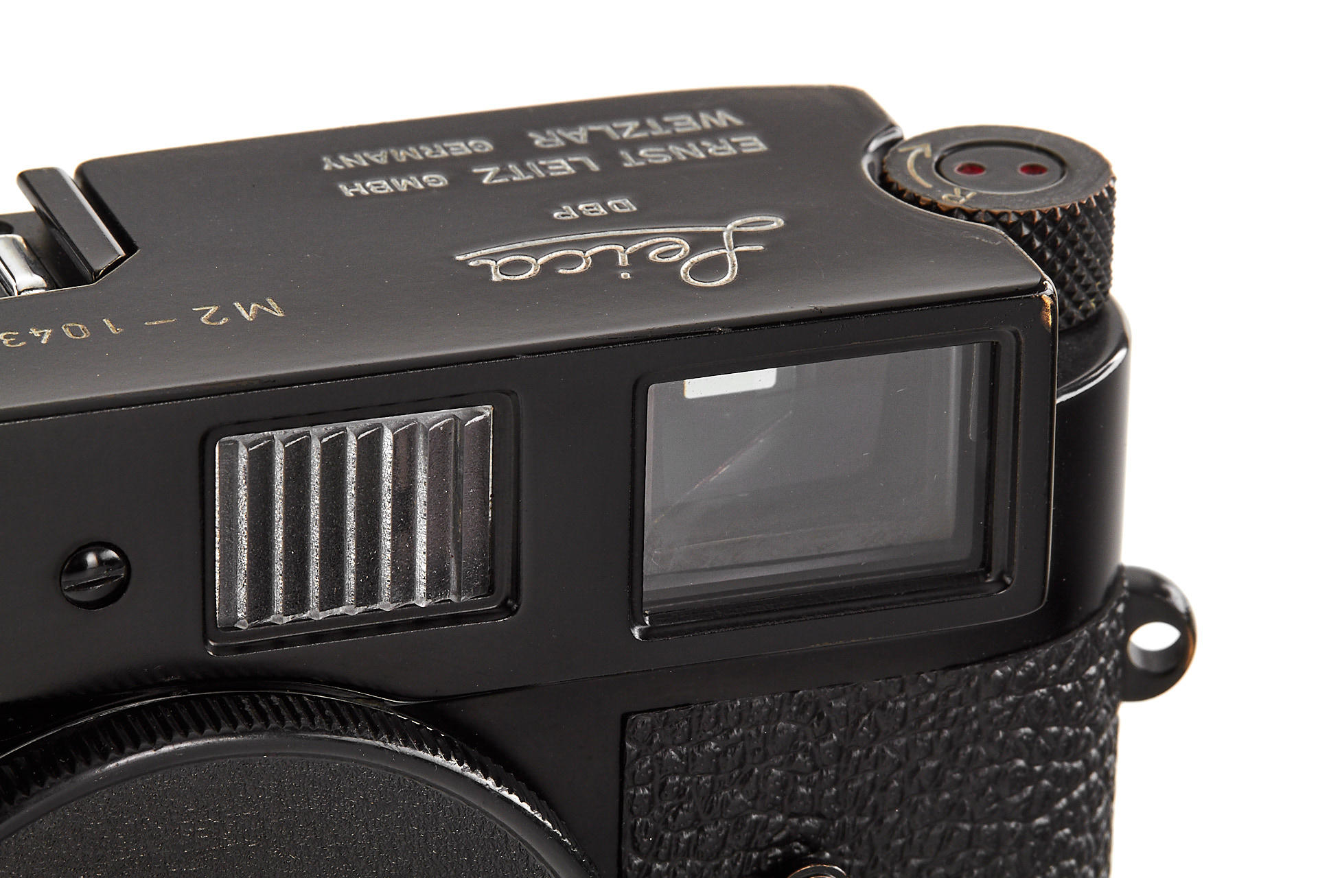 original black paint M2 from an official batch of 200 cameras with serial numbers 1043801-1044000, delivered on May 11th, 1962, in beautiful condition, only minimal signs of use, with sought-after black paint Leicavit MP (paint restored)