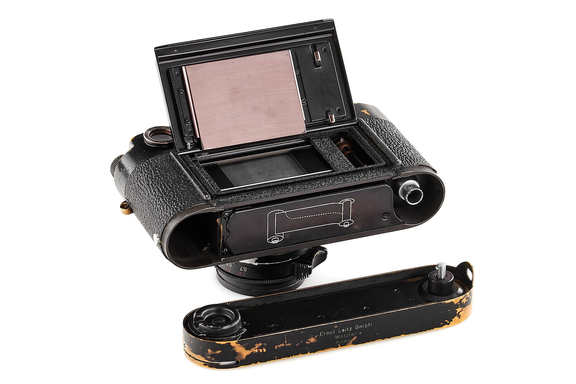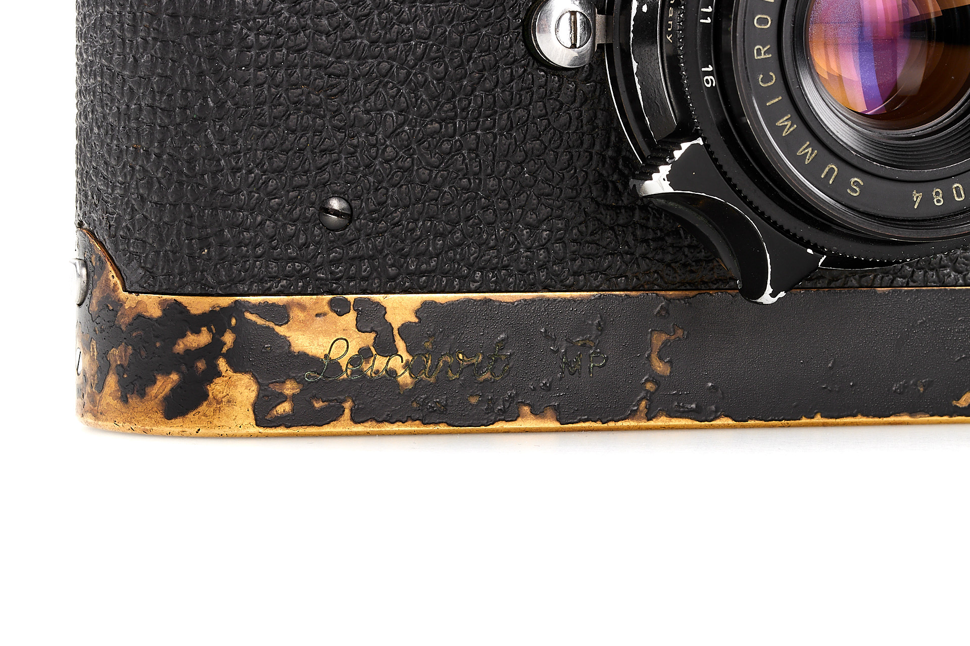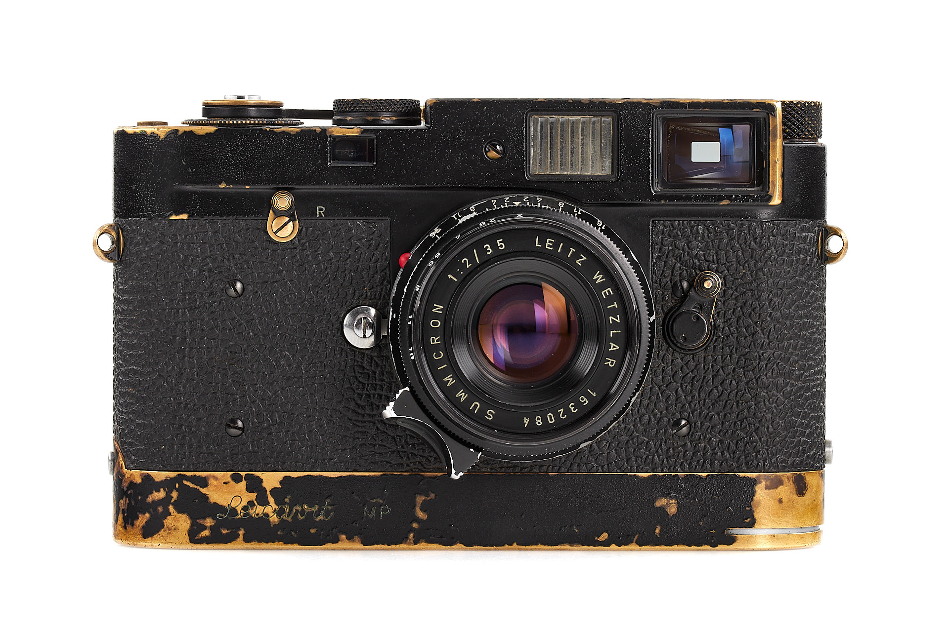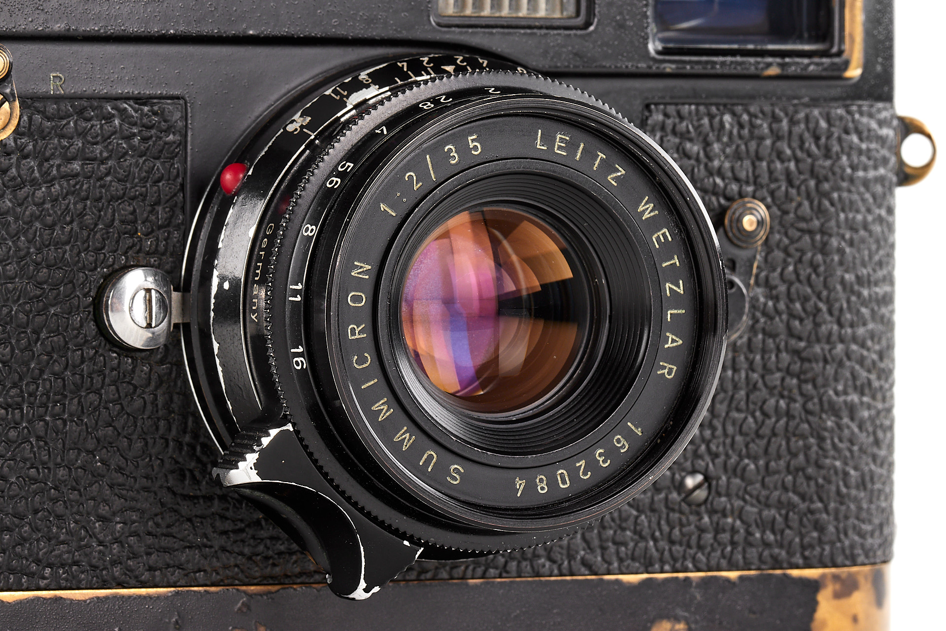 Ein wunderschönes M2 Schwarzlack Outfit, bestehend aus einem Gehäuse mit attraktiver Patina und kleinen Bläschen im Lack, einem Schwarzlack Leicavit MP und dem begehrten 8-Elemente Summicron 2/35mm Nr.1632084 in Schwarzlack (korrekte schwarze Lackierung auf Aluminium, Messingfassung, sehr gute Optik mit nur wenigen Haarrissen). Die Kamera wurde am 26.09.1960 an Leitz Hamburg und das Objektiv am 13.05.1960 nach Wetzlar geliefert.