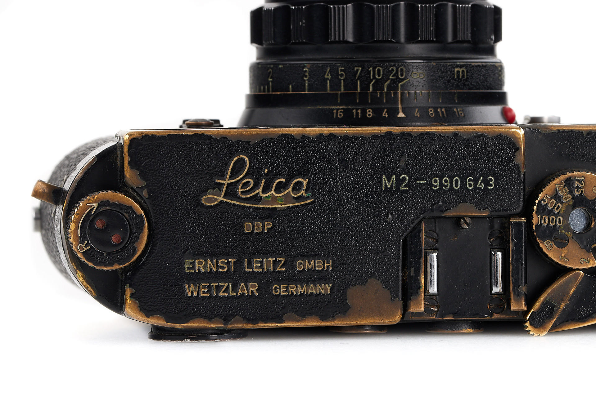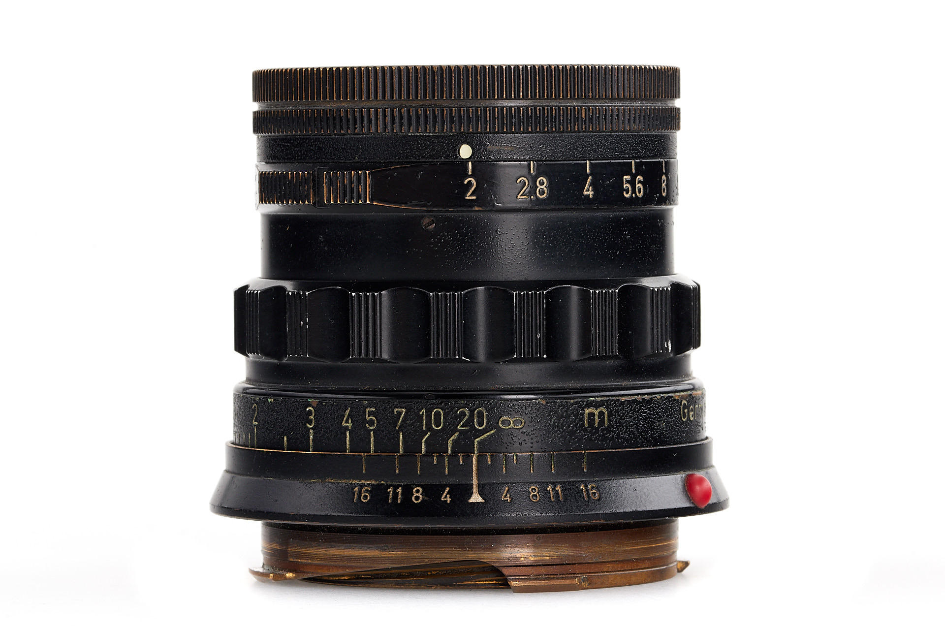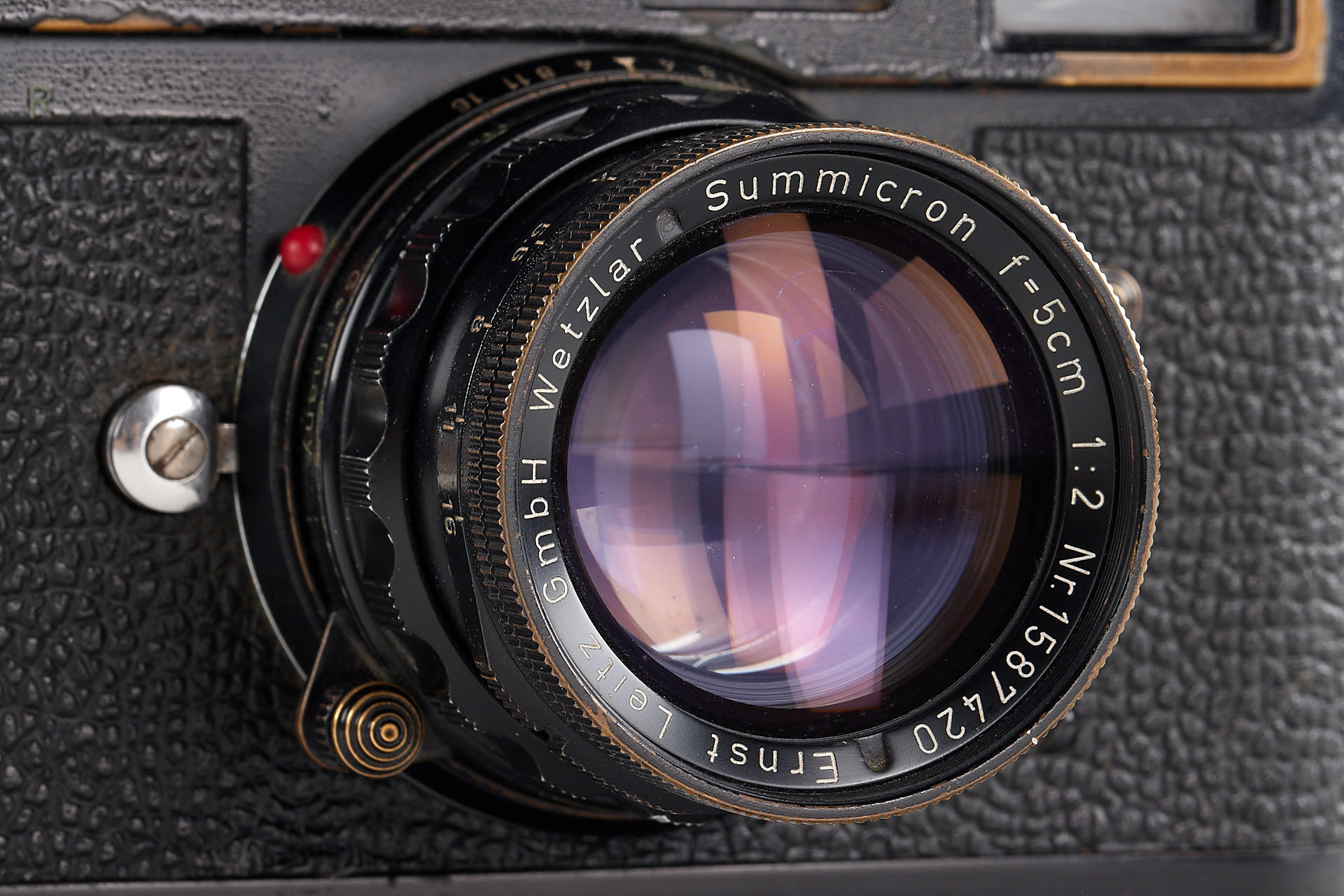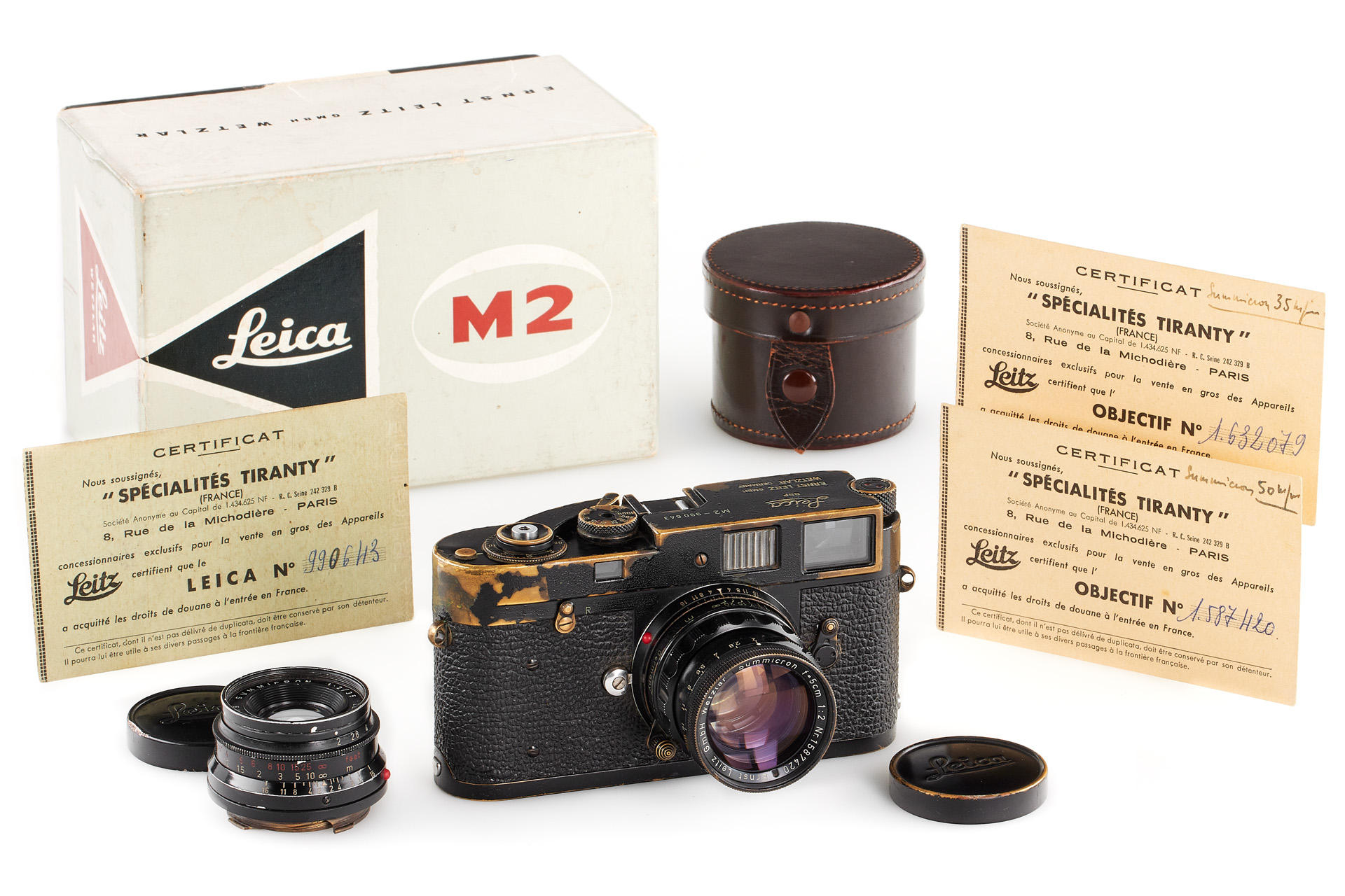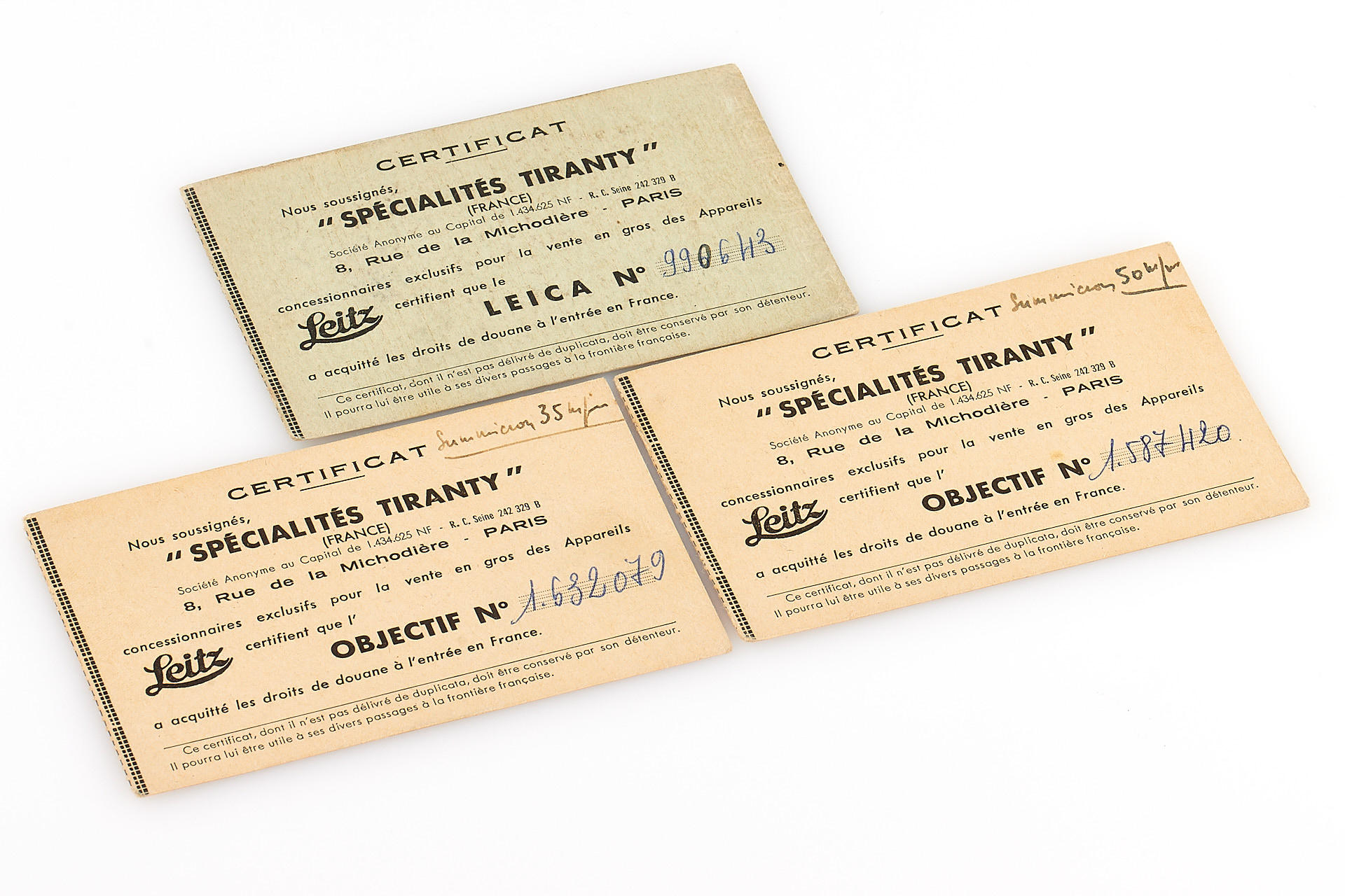 This is the most impressive black paint outfit we have seen. It includes an early Leica M2 body with visible patina, still perfectly working, an early black paint / brass mount Summicron 2/5cm no.1587420 (very good optics, including a black paint cap), a very rare and sought-after black paint / brass mount Summicron 2/35mm no.1632079 (the most desirable version with all parts black painted and not partially black chromed, very good optics with only a few marks on the front element, with matching black paint aluminium front cap). All Parts of the set were delivered to to Tiranty, Paris, the M2 on 28.04.1960, the Summicron 50mm on 07.11.1960, the Summicron 35mm on 28.04.1960. All the parts were then sold to a single owner and kept together since. According to the previous owner the set was initially purchased by Henri Cartier-Bresson, it was then resold, because Bresson preferred to work with a 50mm lens on a M3. The essential quality of this set is that it includes all three original export certificates from Tiranty Paris! It is the first time we've seen such an extensive black paint set and this well documented!