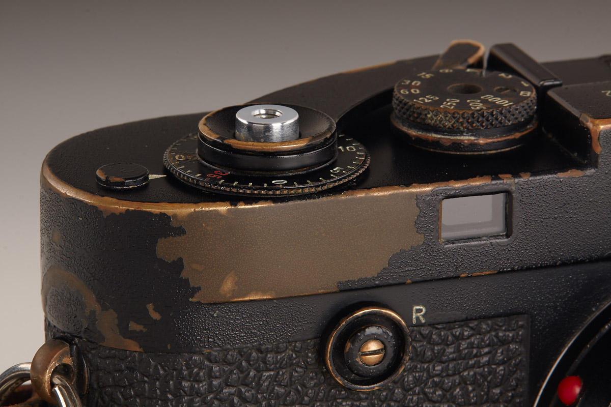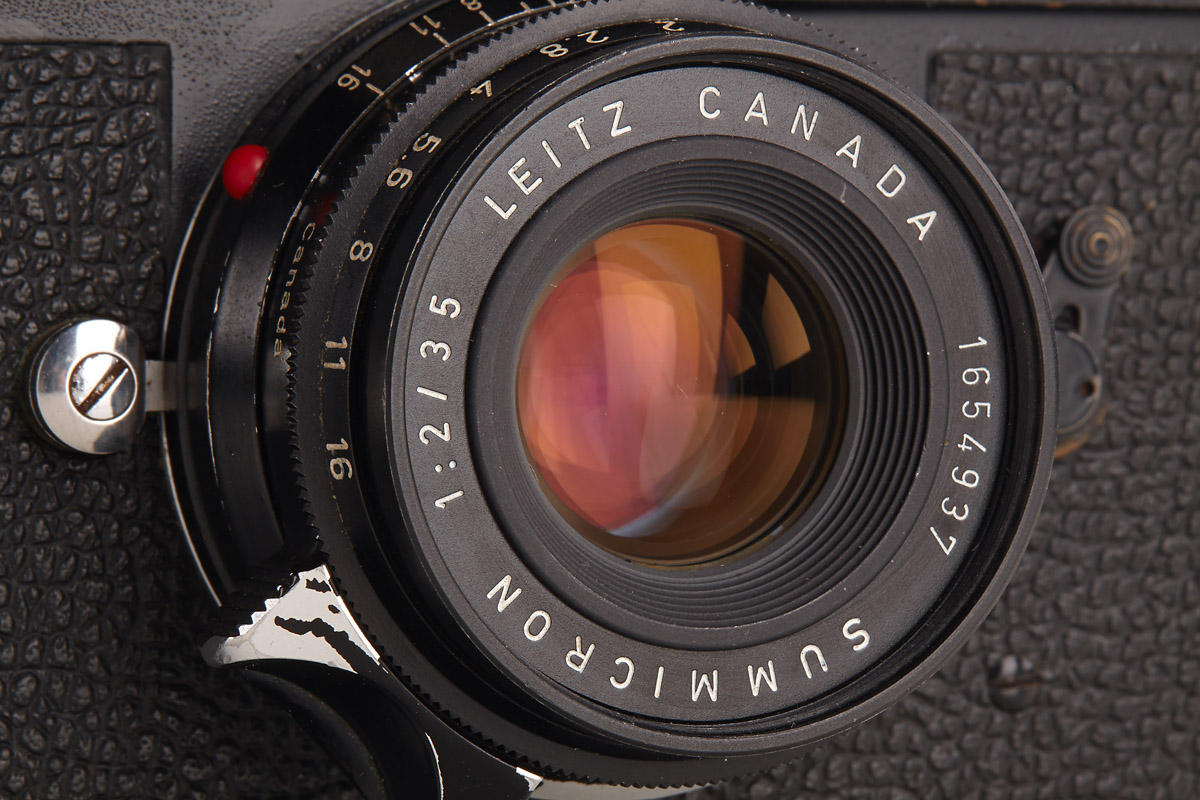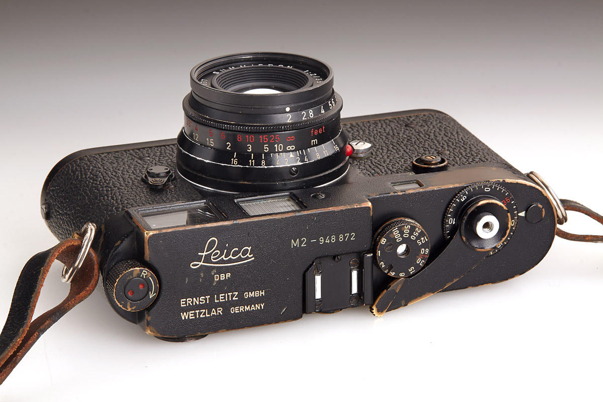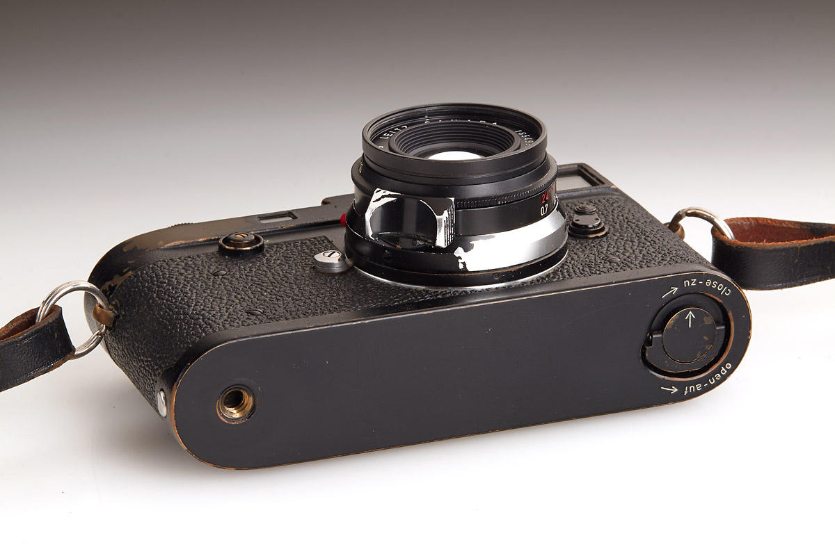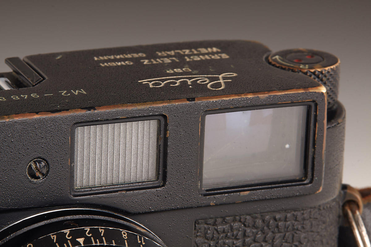 In good and perfect working condition, with a very rare and early (1959) black-painted 8-element “dual mount” 35 mm Summicron f/2 lens no. 1654937 with black bayonet (lens with clean optics and black-paint lens cap), strap. Small quantities of the Leica M2 were also delivered in a black paint finish, mostly for professional photographers. In total, there were only 2,451 pieces, compared to a total production of more than 80,000 units of the Leica M2. Only the very first batch of 500 black-paint M2 cameras (Nos. 948601-949100) were equipped with a push-button rewind unlock, before the design was changed to the lever version. Here a rare Leica M2 black-paint camera from this very first batch with all the original features: all-black bottom-plate lock, frameline illumination window with real glass and camera without self-timer. See lot 064 for an identical lens with consecutive serial number. Auch von der Leica M2 wurden – überwiegend an Berufsfotografen – kleine Stückzahlen in schwarz lackierter Ausführung geliefert. Insgesamt waren es nur 2.451 Exemplare von insgesamt über 80.000 produzierten Leica M2. Nur die Kameras der allerersten schwarz lackierten Serie (948601-949100) hatten noch einen Freigabeknopf anstelle des späteren Hebels zur Freigabe der Rückwicklung. Hier eine seltene schwarz lackierte Leica M2 Kamera aus dieser ersten Serie mit allen Originalmerkmalen: ganz schwarz lackierte Verriegelung im Bodendeckel, Beleuchtungsfenster in Echtglas und Kamera ohne Selbstauslöser. Siehe Los 064 für ein identisches Objektiv mit aufeinanderfolgender Seriennummer.
