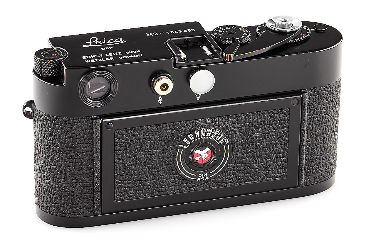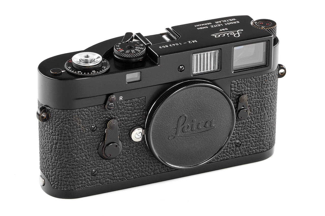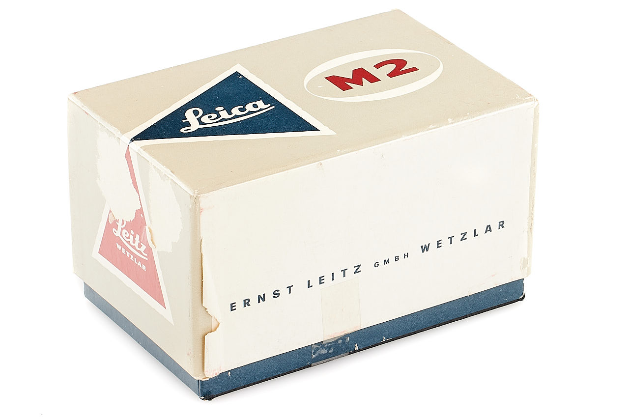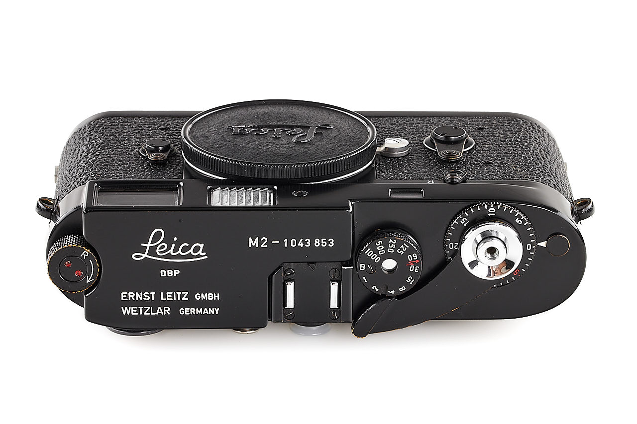 An original black paint M2 from an official batch of 200 cameras with self-timer (numbers 1043801 to 1044000), in outstanding condition and working order, almost no signs of use, with body cap and maker's box, hard to find in this good condition!