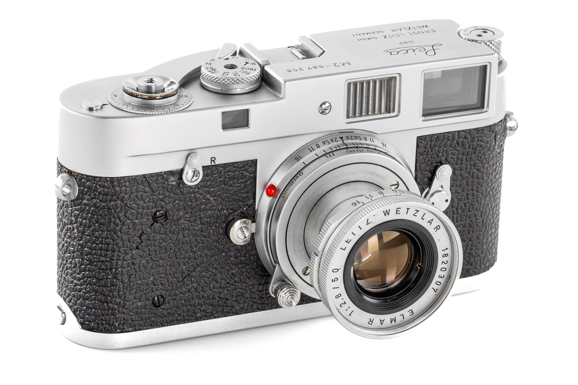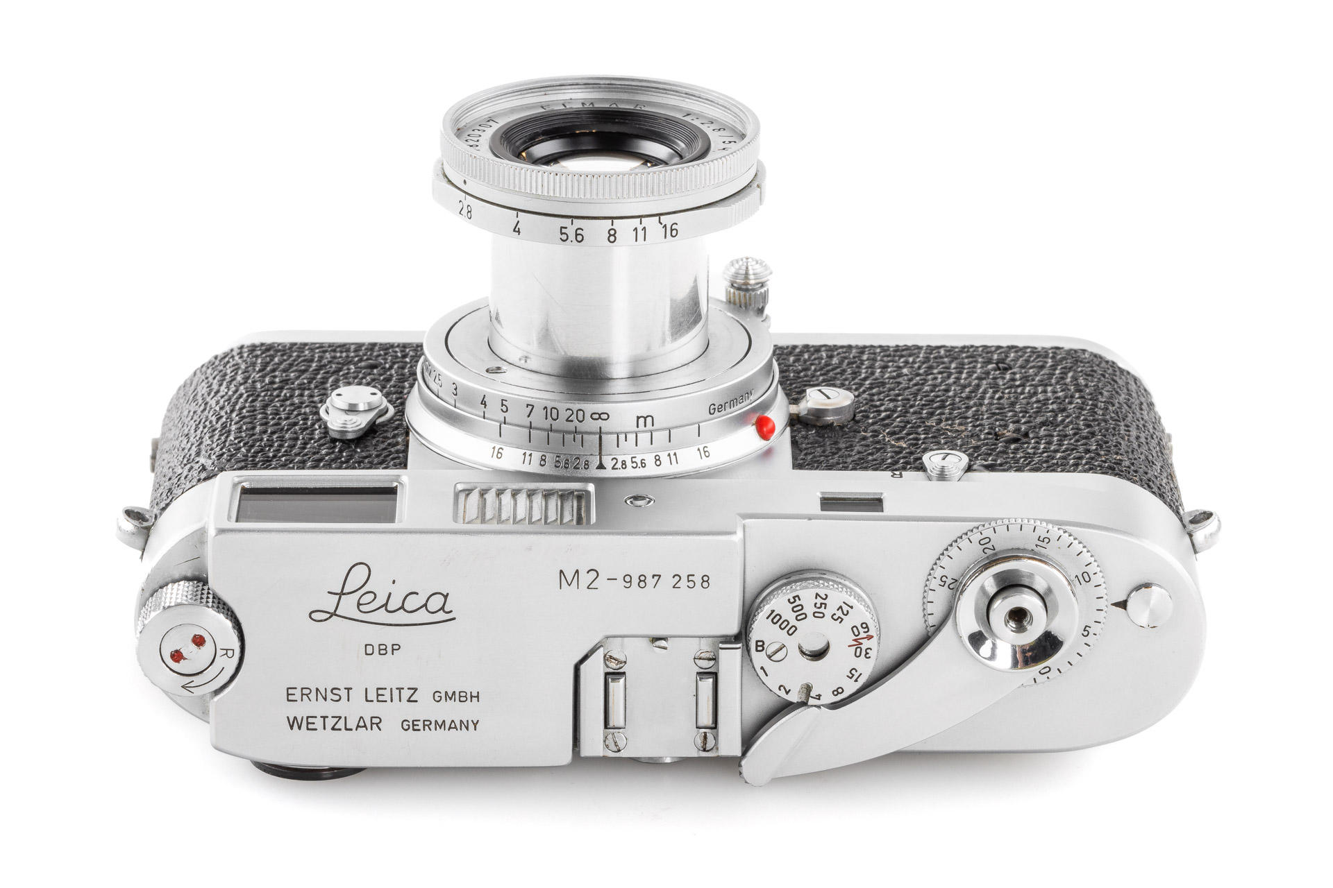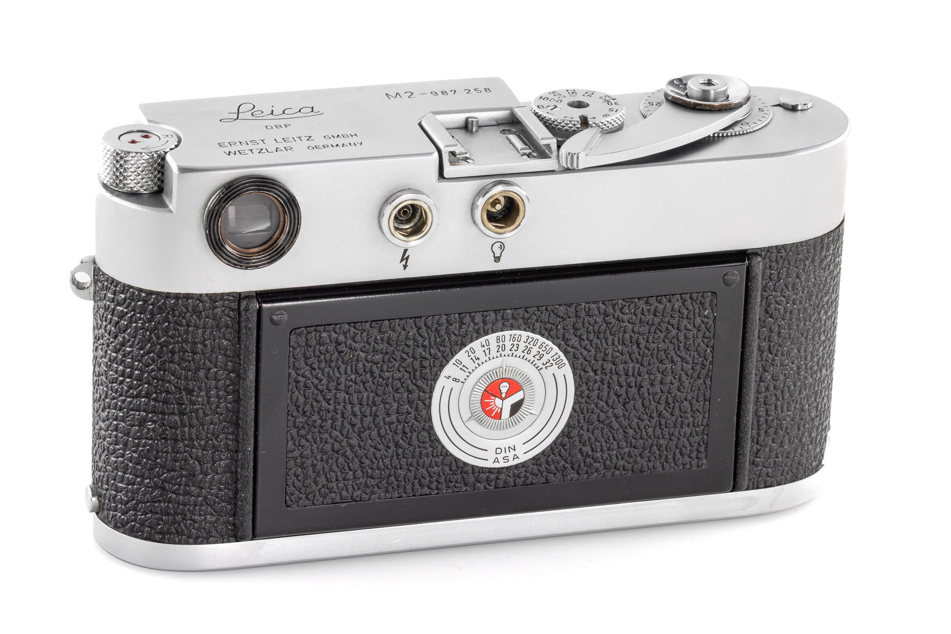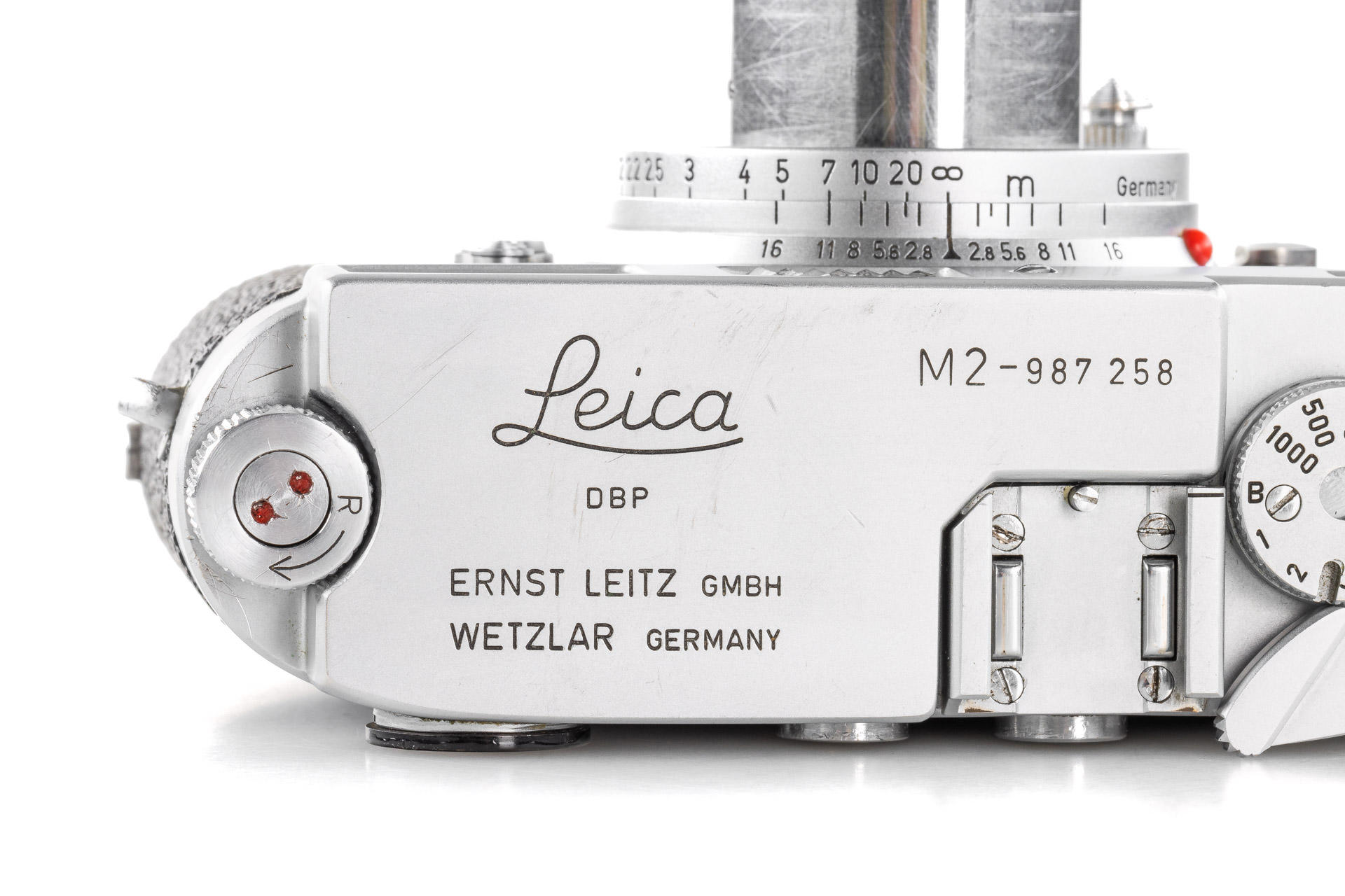Very rare Leica M2 produced in Canada, engraved "Ernst Leitz GMBH Wetzlar Germany" on the top plate, note the different 'M2' engraving, in good cosmetic condition and working order. Only about 1,500 units of the Leica M2 were assembled at the Leitz plant in Canada, while the total production number was more than 76.000. Together with Elmar 2.8/50mm no.1820307 (1962), with very unusual 'Leica Canada' front lens cap (E39 threaded)