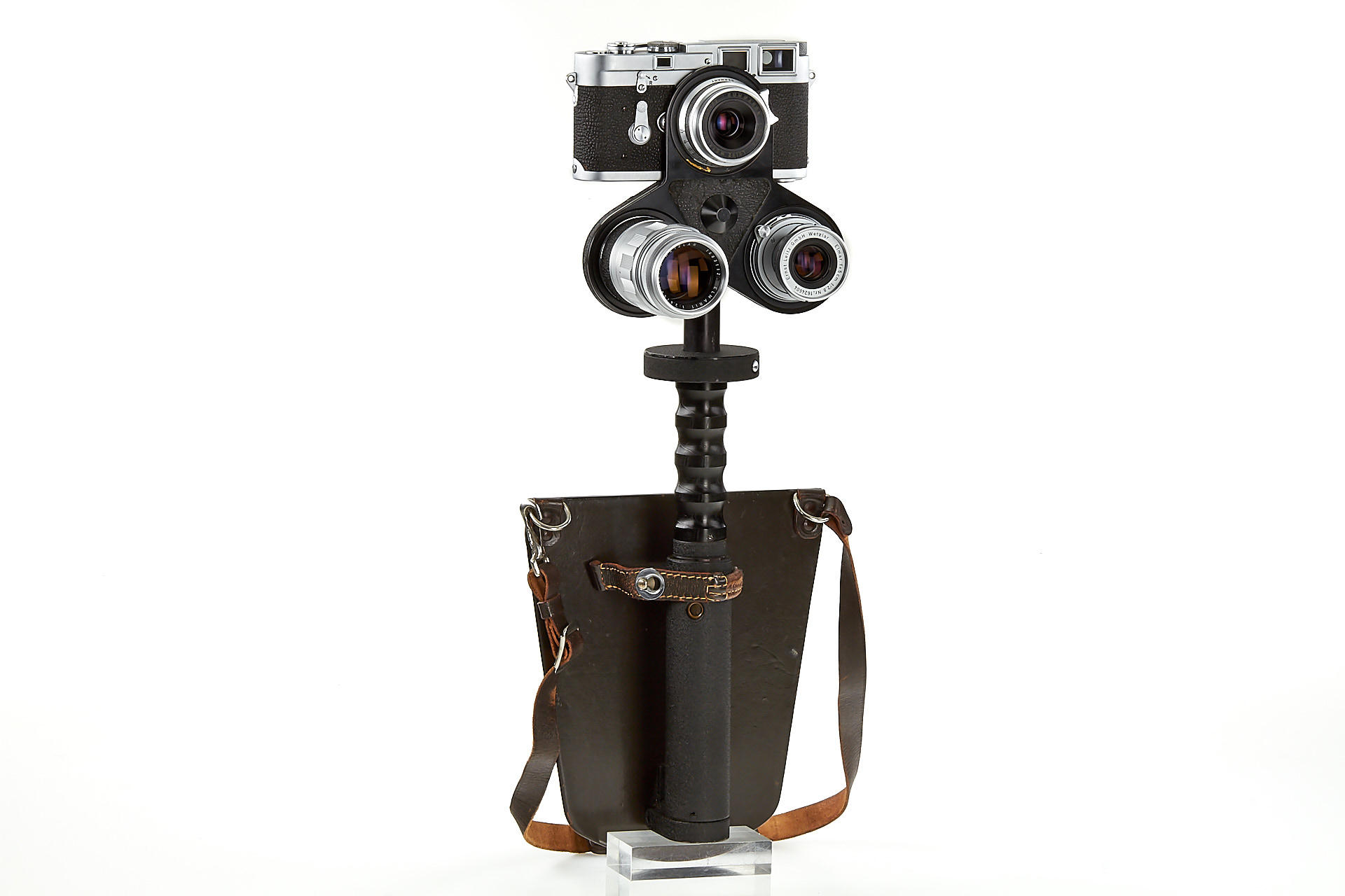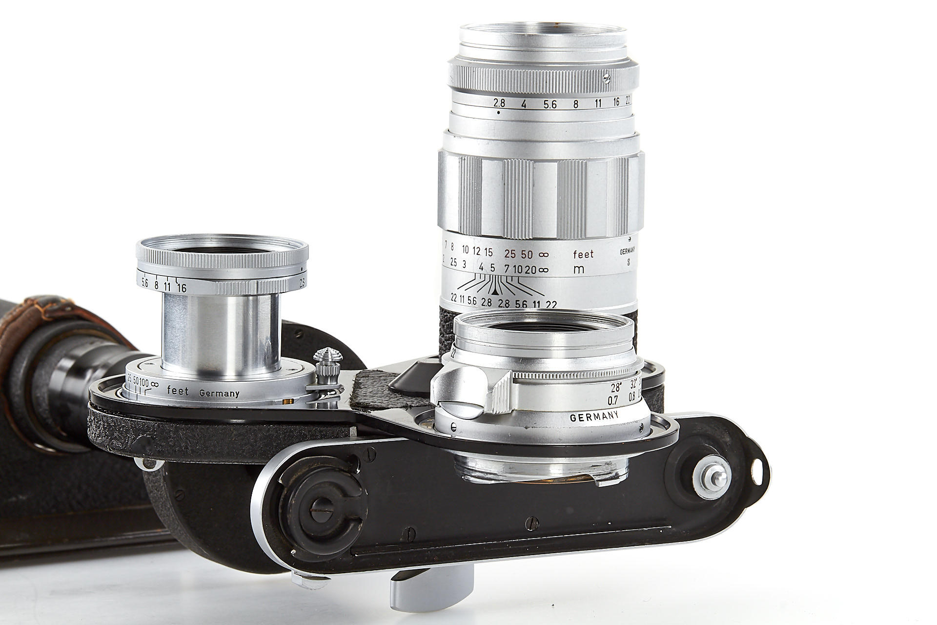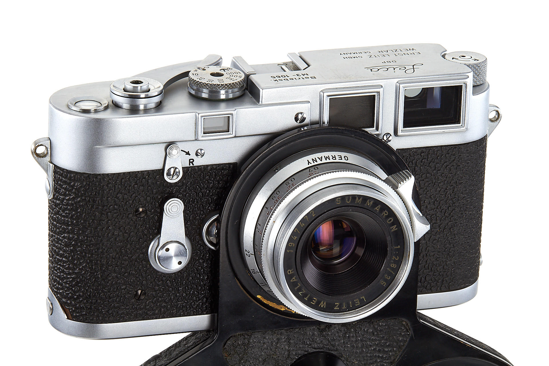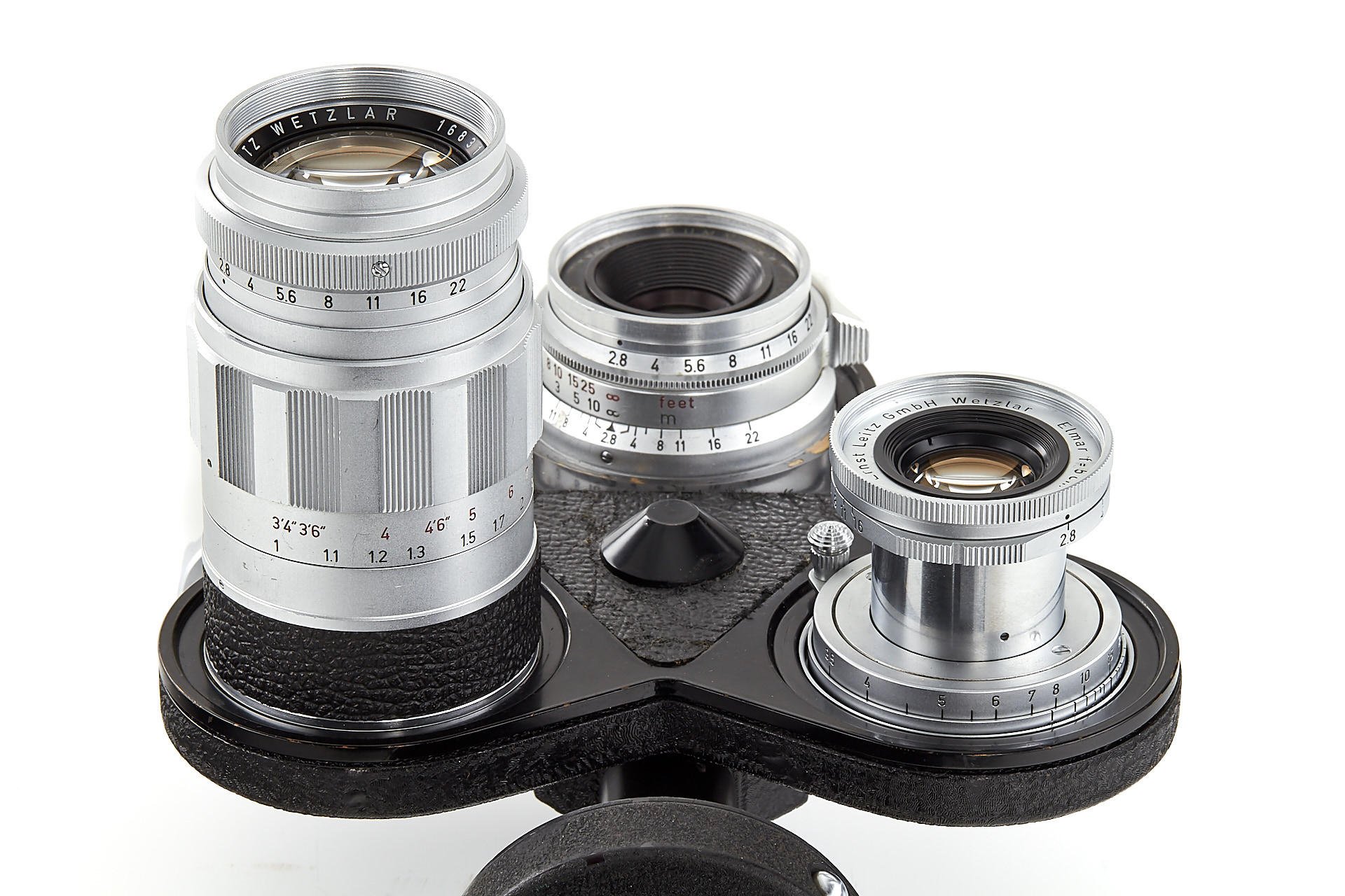 an original Leica M3 Betriebskamera (for internal use in the Leitz factory), in excellent condition and good working order, with very rare variation of OROLF lens turret - with special breast tripod, inclusive 3 screw-mount lenses: (1) Summaron 2.8/35mm no.1947472 (very good optics, with only few hairline marks), (2) Elmar 2.8/50mm no.1624604 (cond. A/B, clean optics), (3) near mint Elmarit 2.8/90mm no.1683112; a very impressive ensemble!