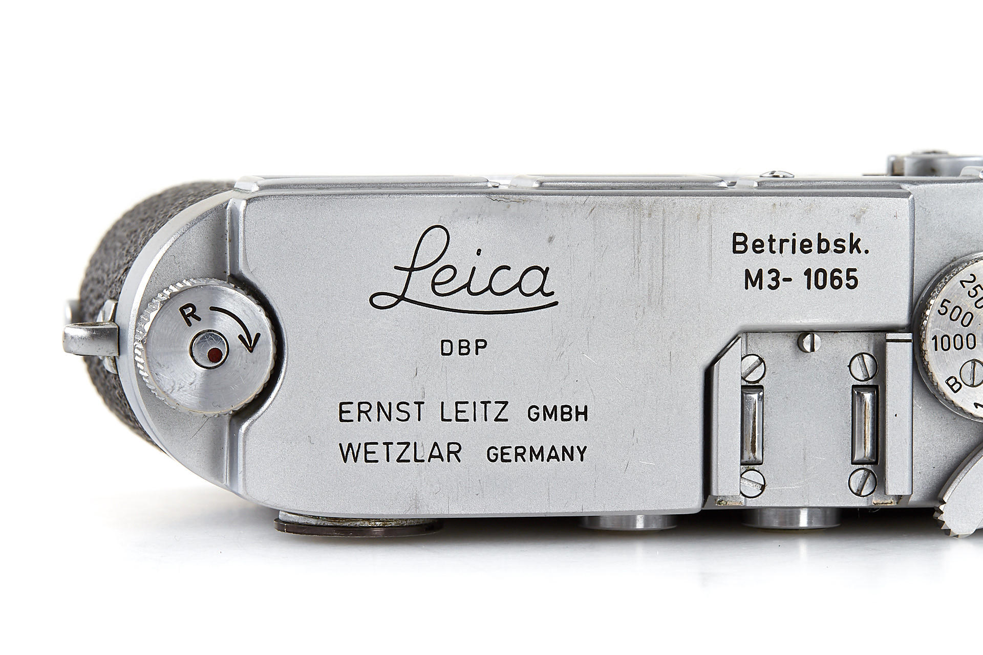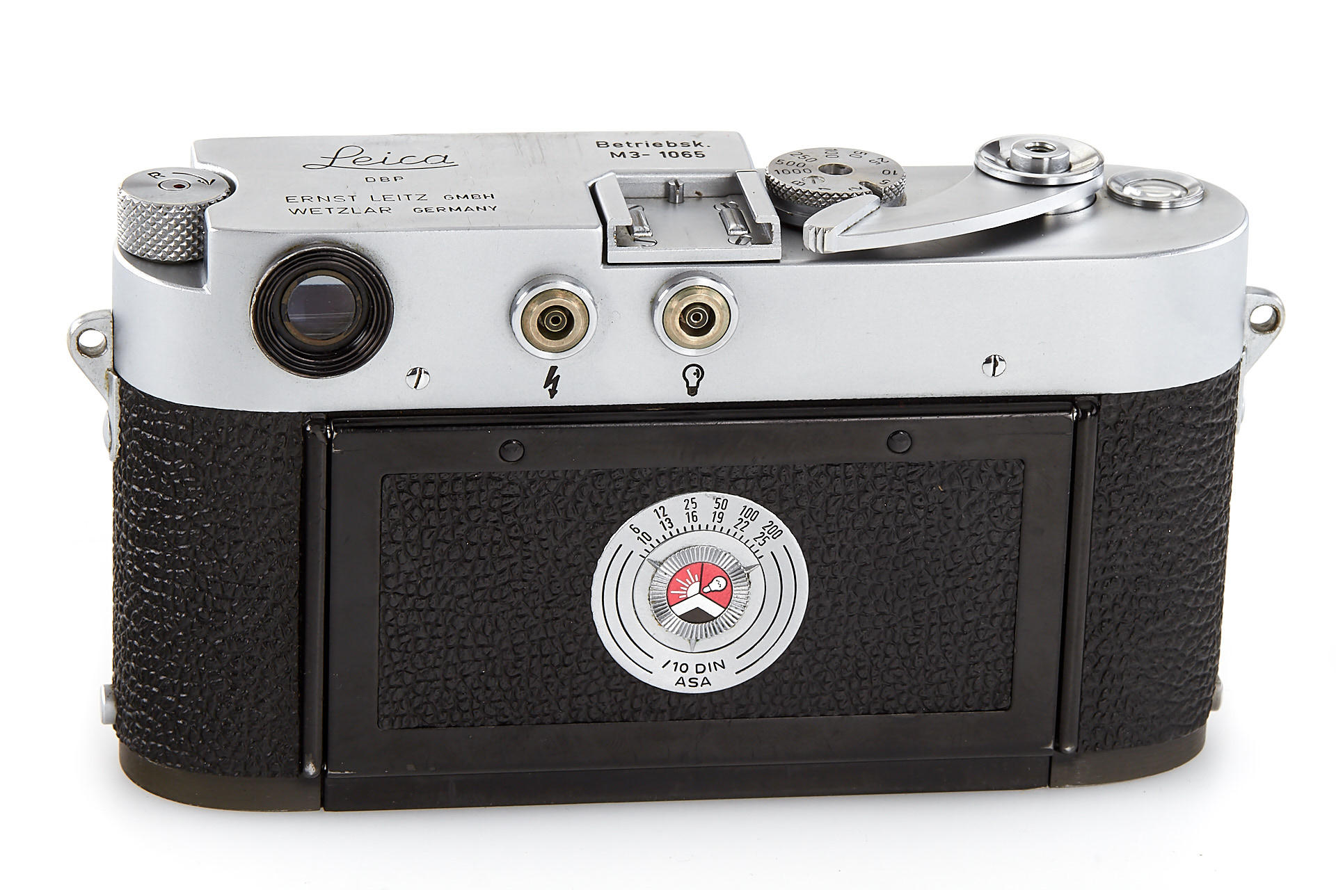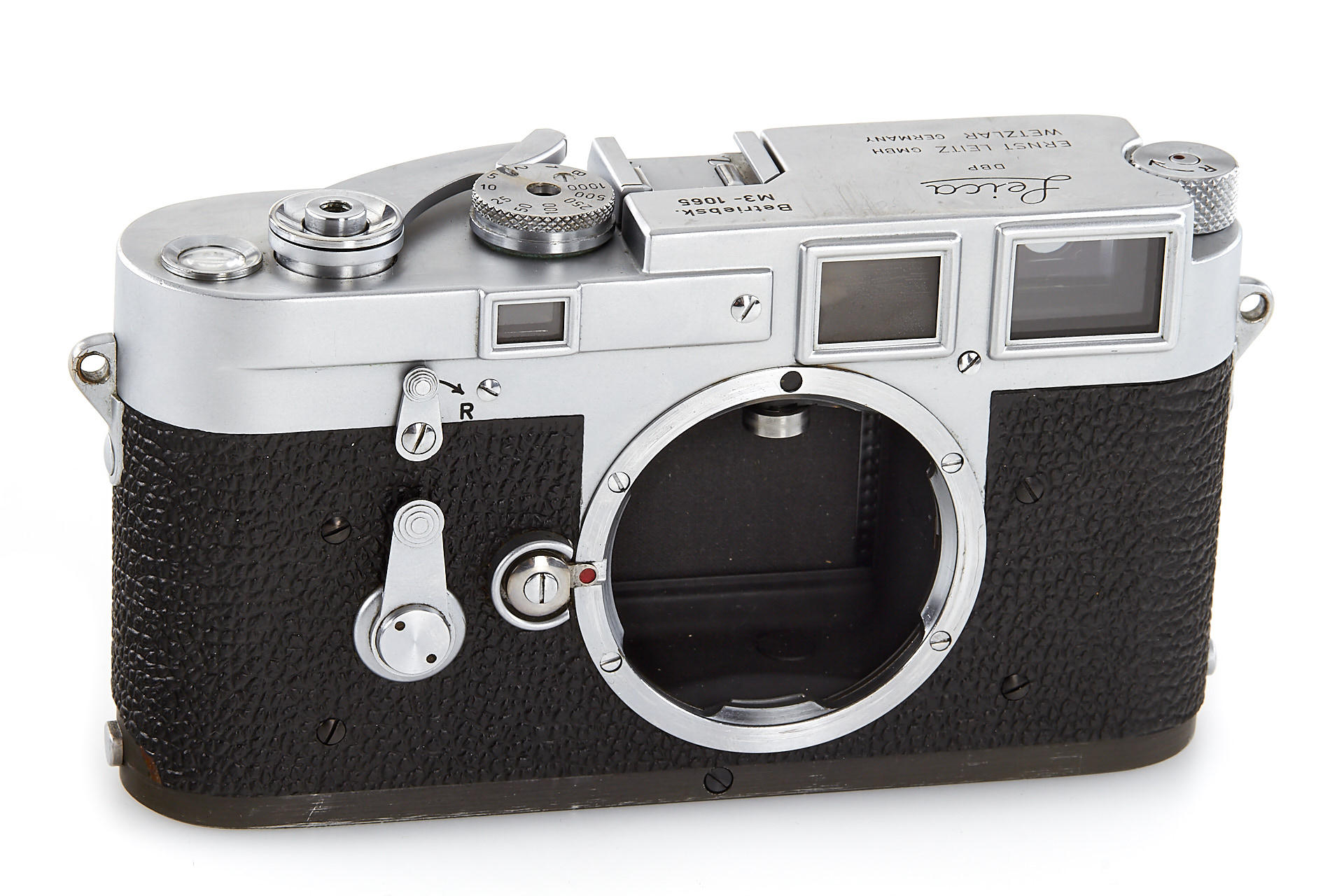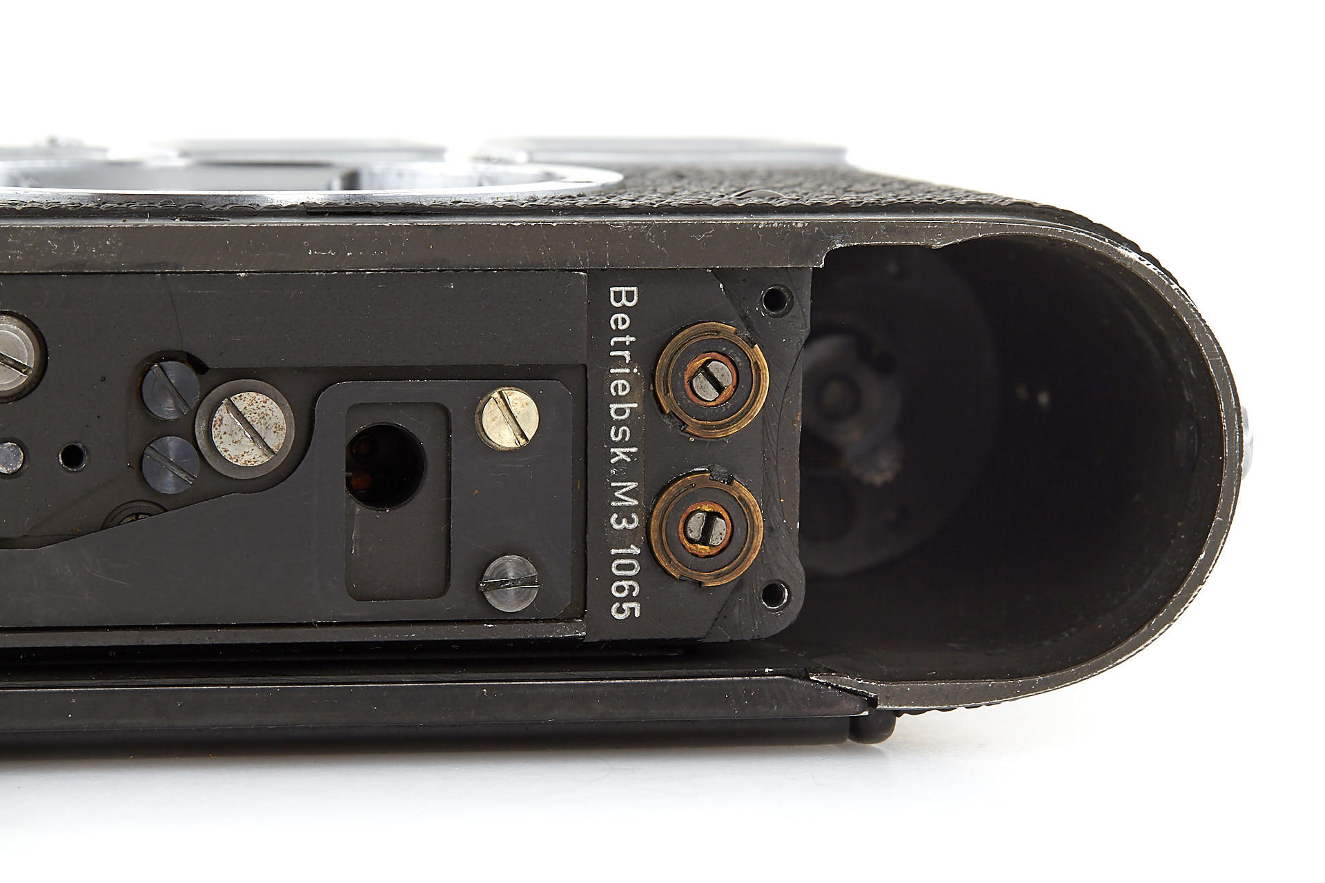 an original Leica M3 Betriebskamera (for internal use in the Leitz factory), in excellent condition and good working order, with very rare variation of OROLF lens turret - with special breast tripod, inclusive 3 screw-mount lenses: (1) Summaron 2.8/35mm no.1947472 (very good optics, with only few hairline marks), (2) Elmar 2.8/50mm no.1624604 (cond. A/B, clean optics), (3) near mint Elmarit 2.8/90mm no.1683112; a very impressive ensemble!