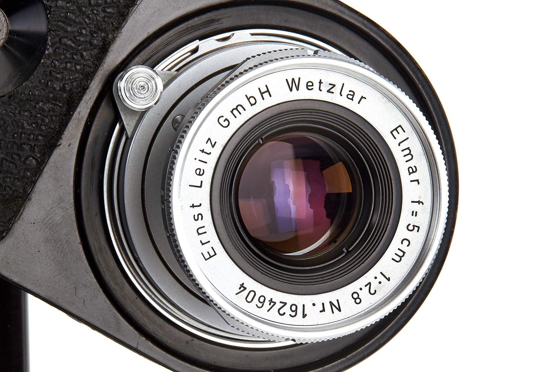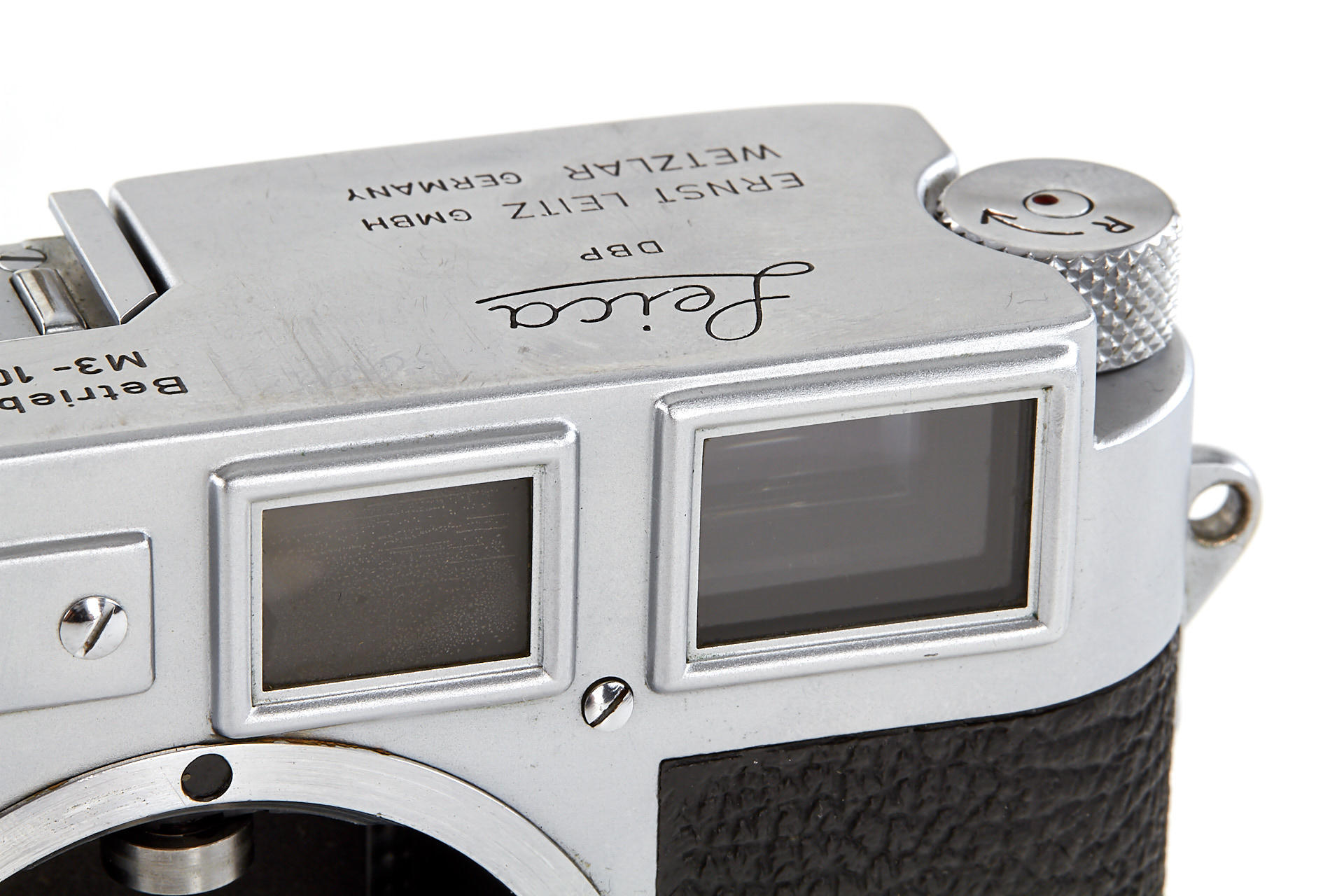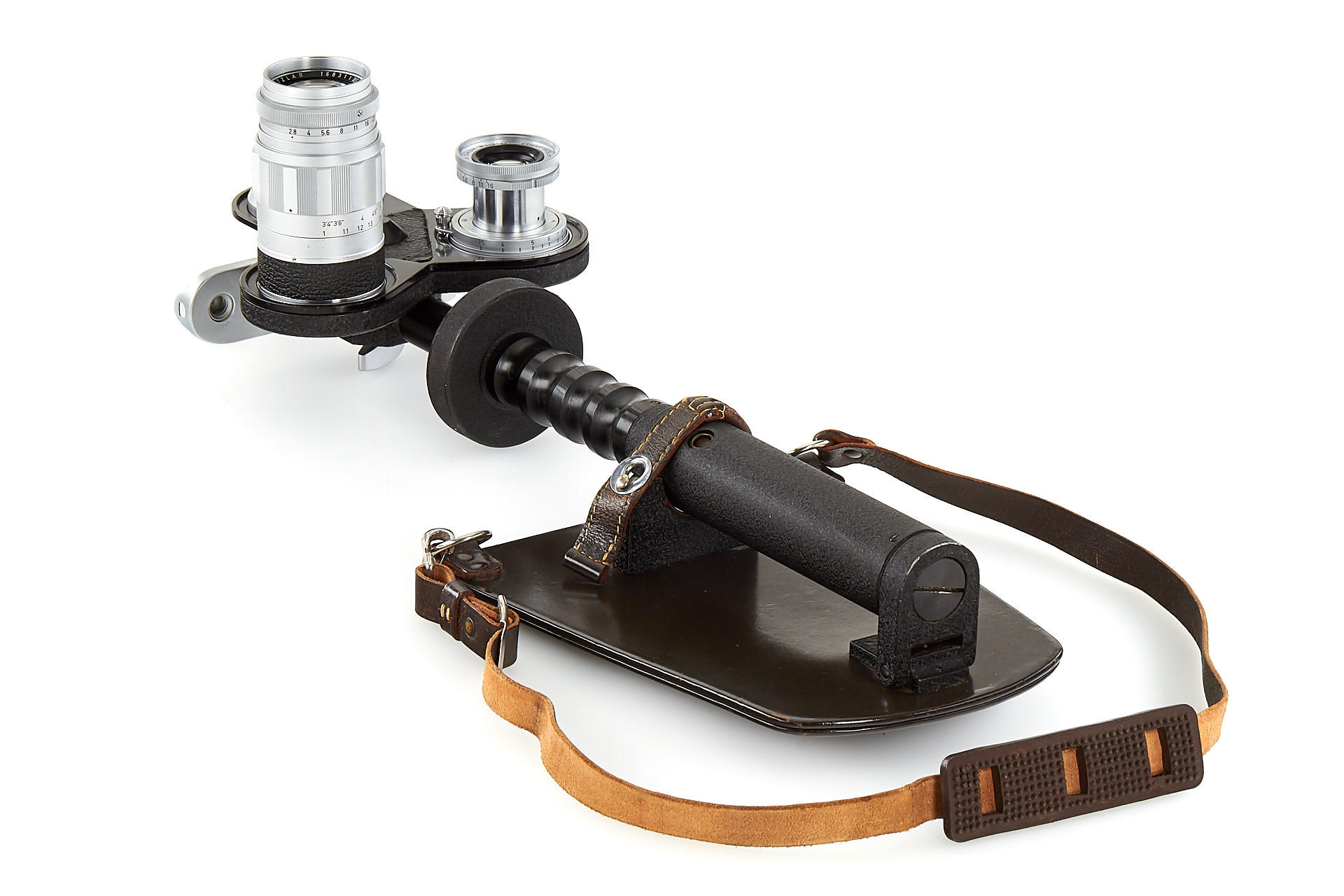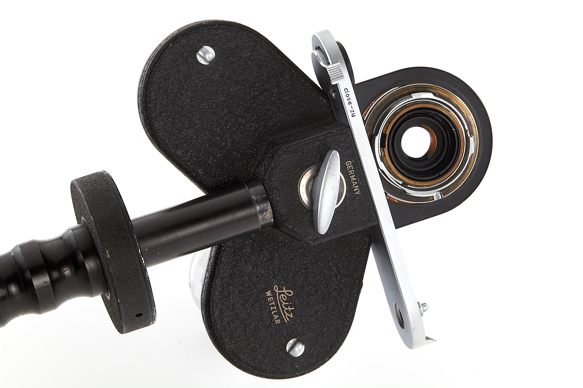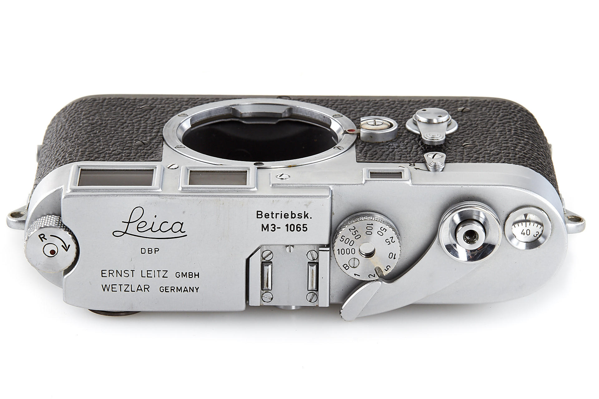 an original Leica M3 Betriebskamera (for internal use in the Leitz factory), in excellent condition and good working order, with very rare variation of OROLF lens turret - with special breast tripod, inclusive 3 screw-mount lenses: (1) Summaron 2.8/35mm no.1947472 (very good optics, with only few hairline marks), (2) Elmar 2.8/50mm no.1624604 (cond. A/B, clean optics), (3) near mint Elmarit 2.8/90mm no.1683112; a very impressive ensemble!