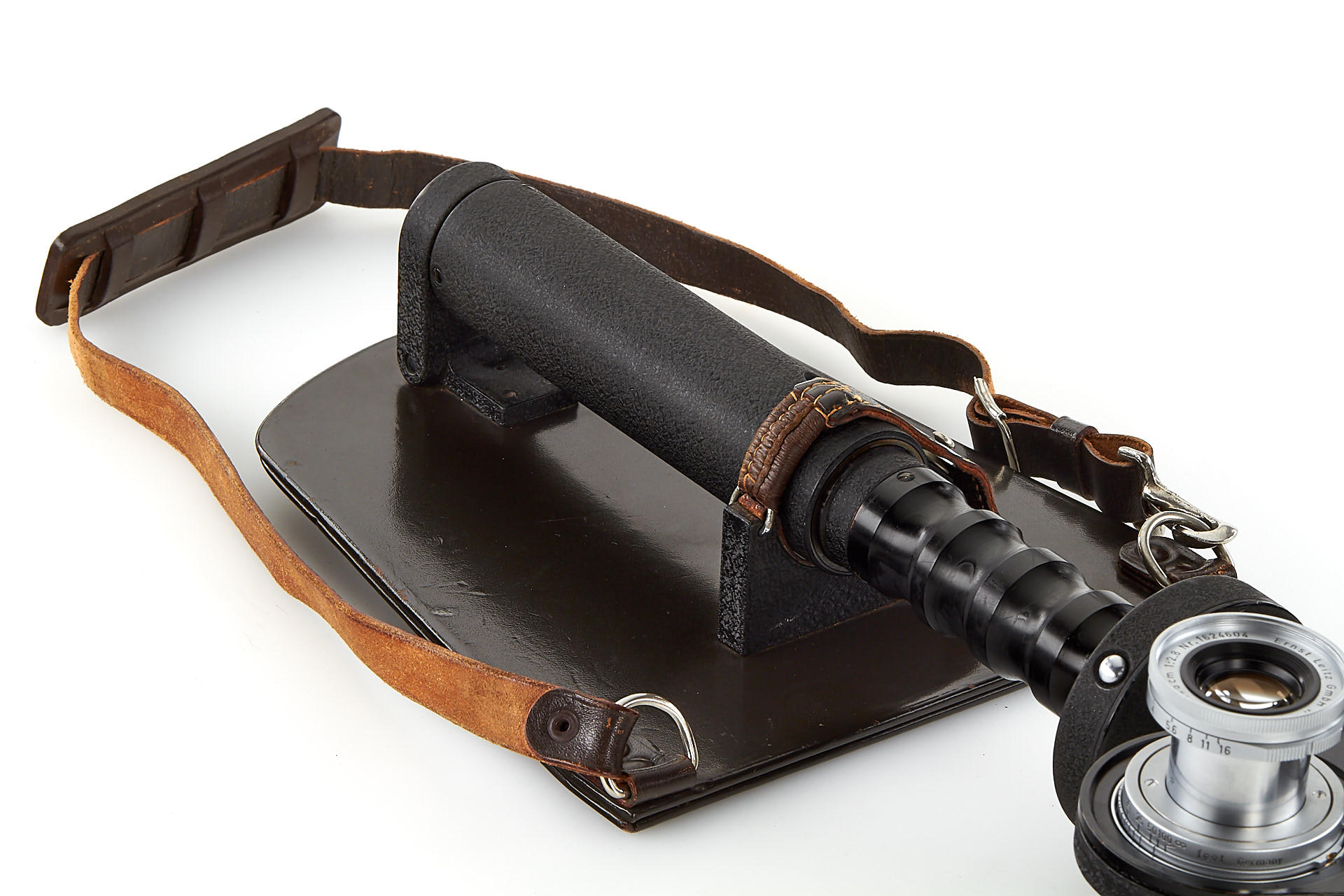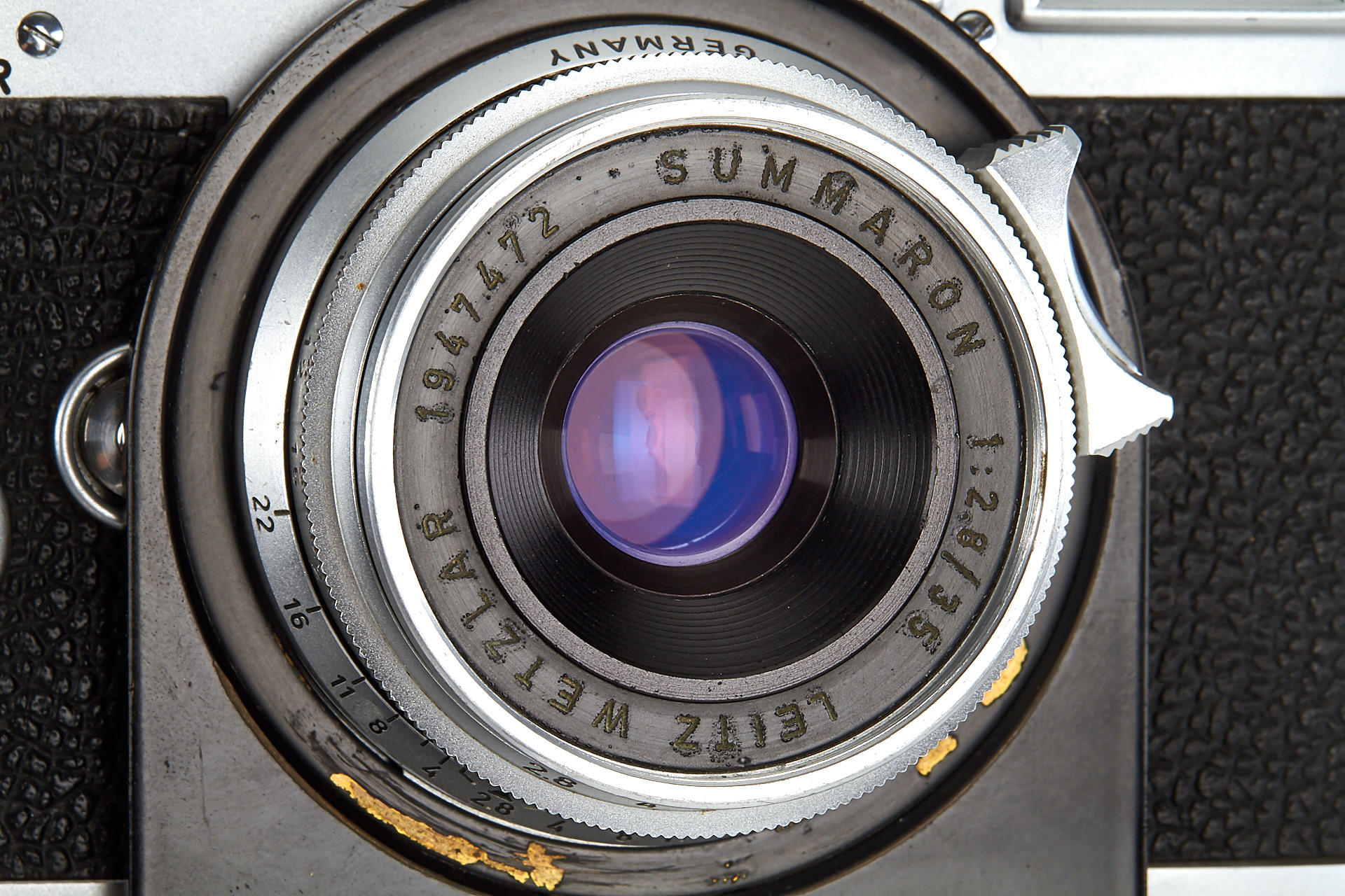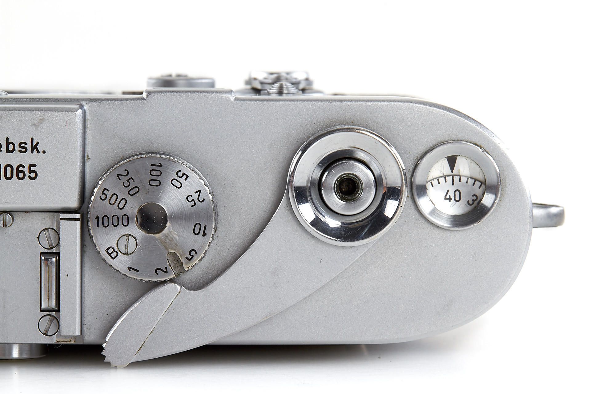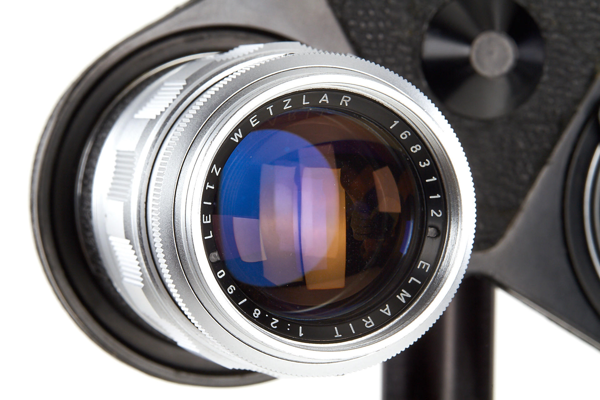 an original Leica M3 Betriebskamera (for internal use in the Leitz factory), in excellent condition and good working order, with very rare variation of OROLF lens turret - with special breast tripod, inclusive 3 screw-mount lenses: (1) Summaron 2.8/35mm no.1947472 (very good optics, with only few hairline marks), (2) Elmar 2.8/50mm no.1624604 (cond. A/B, clean optics), (3) near mint Elmarit 2.8/90mm no.1683112; a very impressive ensemble!