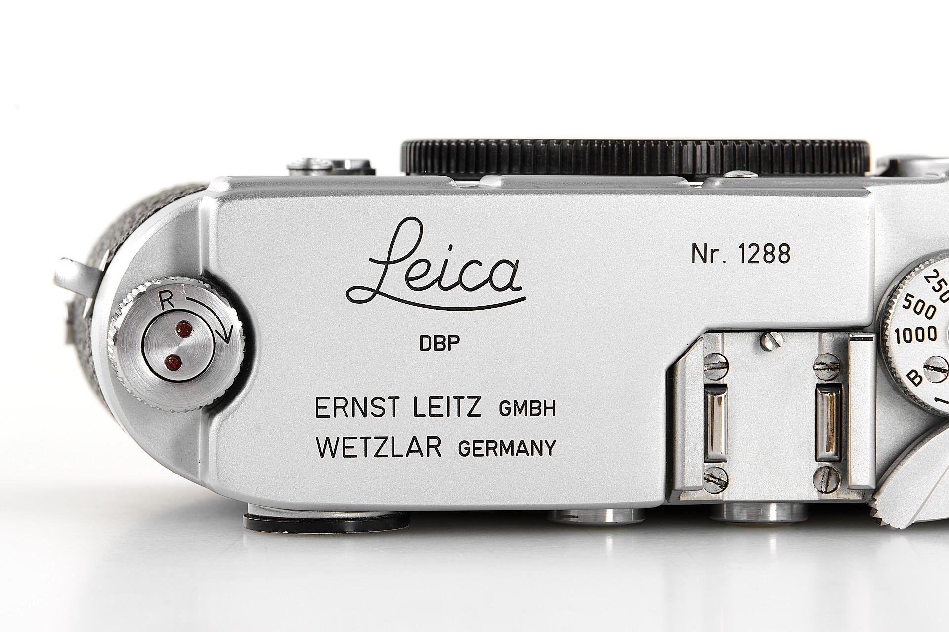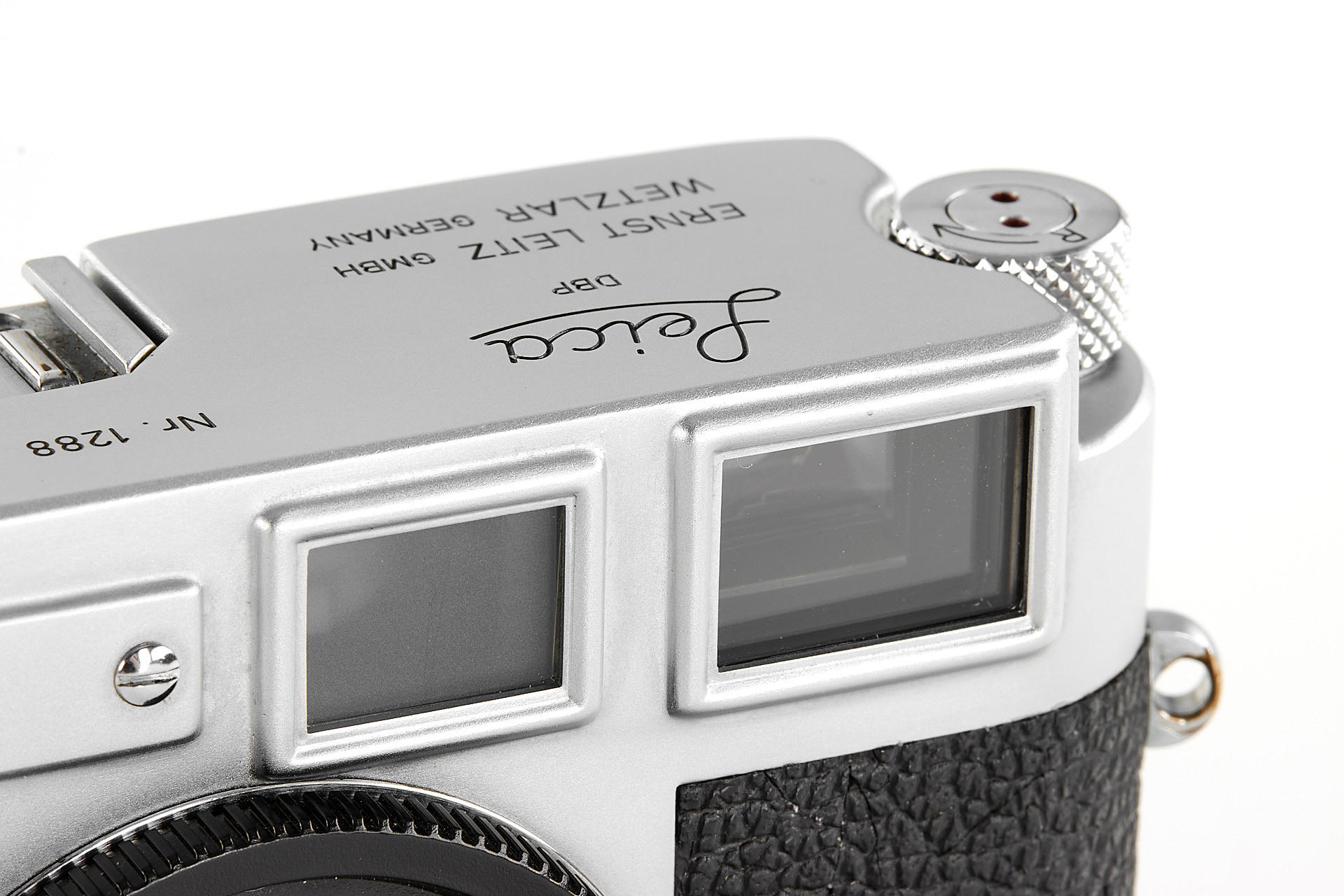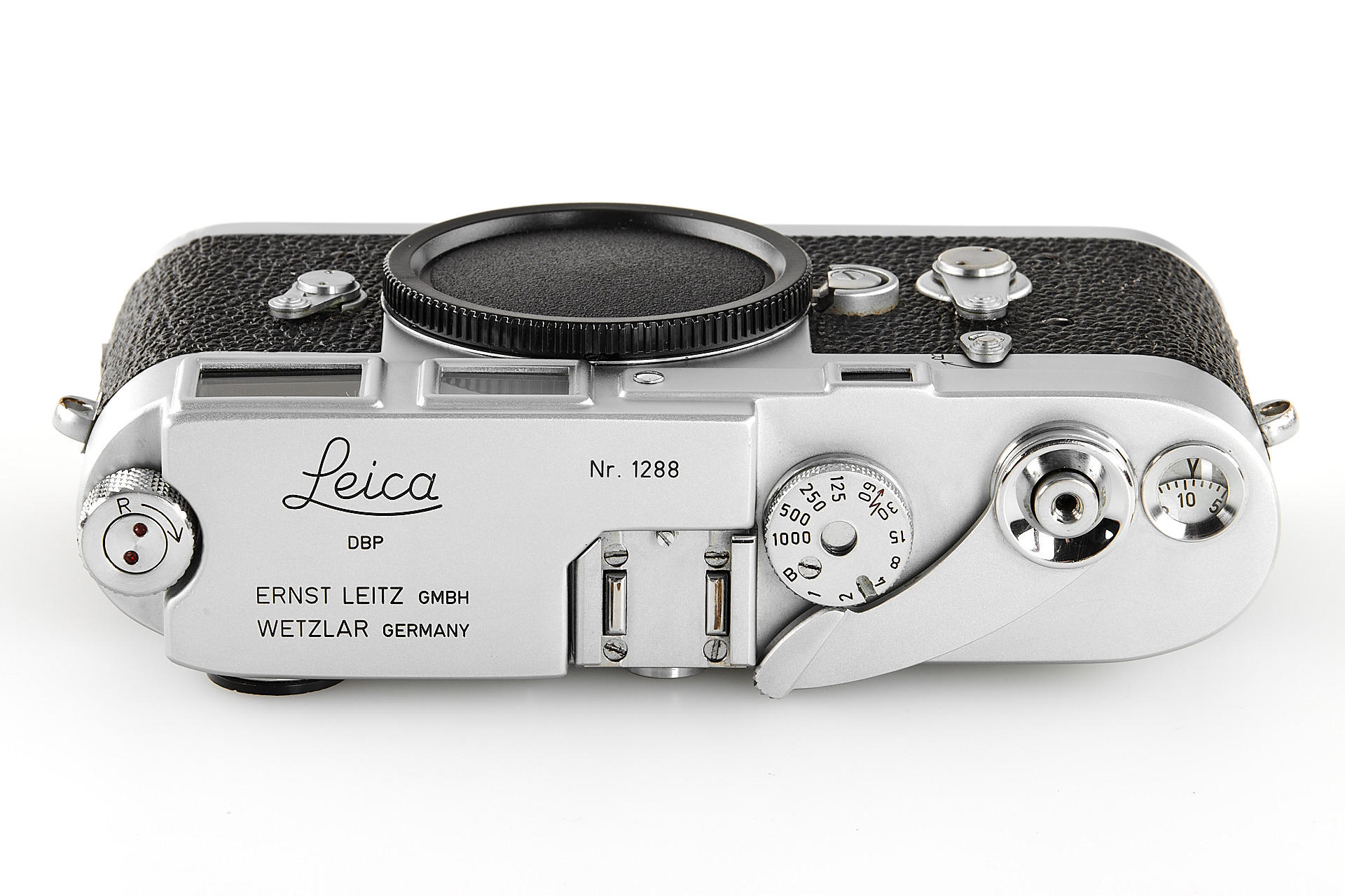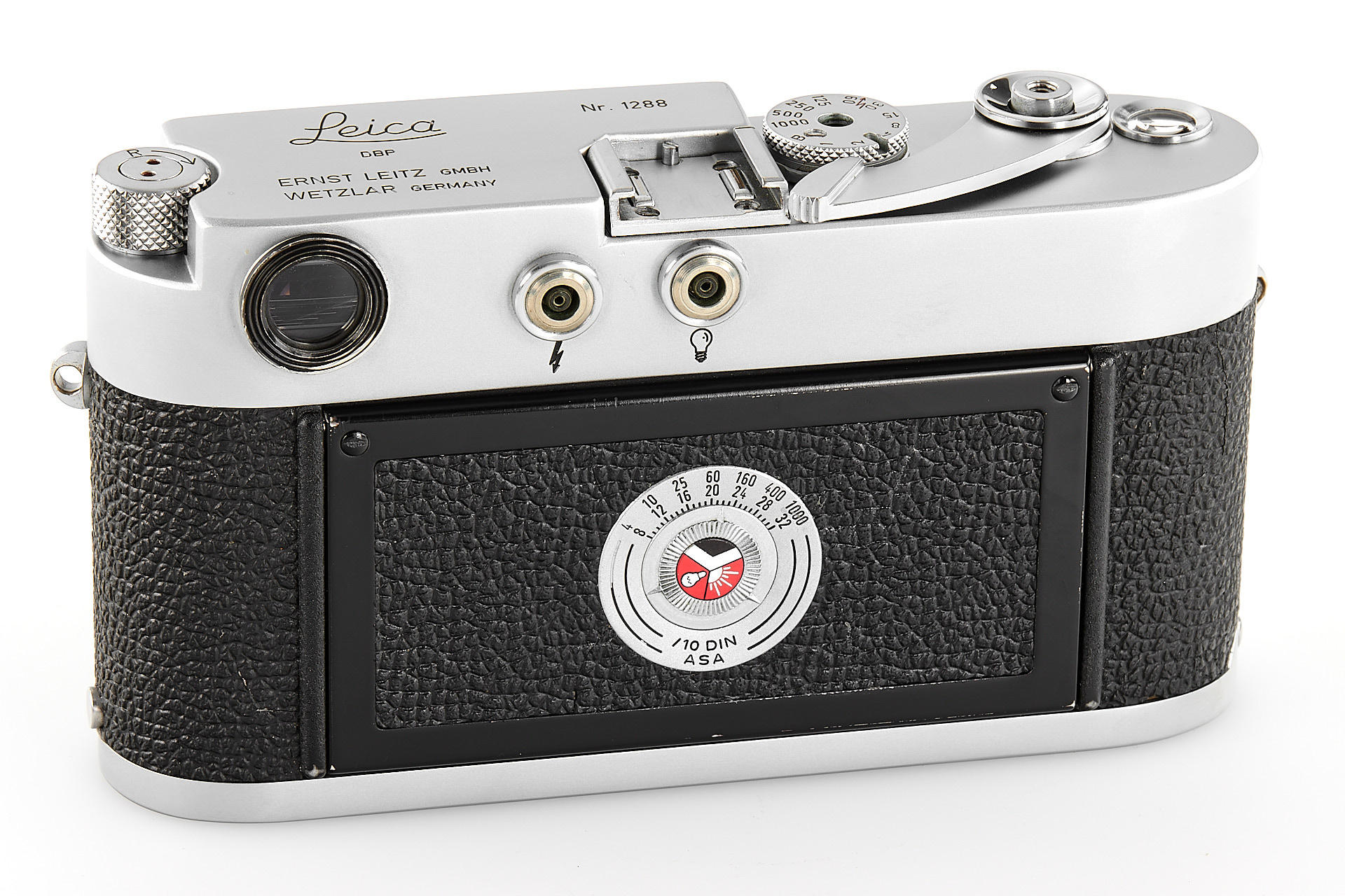 Very rare and unusual M3 chrome single stroke 'Betriebskamera' in near mint condition, made for internal use in the Leica factory, not intended to be sold to the public, only engraved 'Nr. 1288' on the top plate (no 'M3' or 'Betriebskamera') and 'P1288' on the chassis, showing late features such as round lugs, frame selector, standardized speed progression and short rewind knob, earlier 1000 ASA back and uncommon standard flash sync attachment, with body cap, this is a good opportunity for every Leica collector
