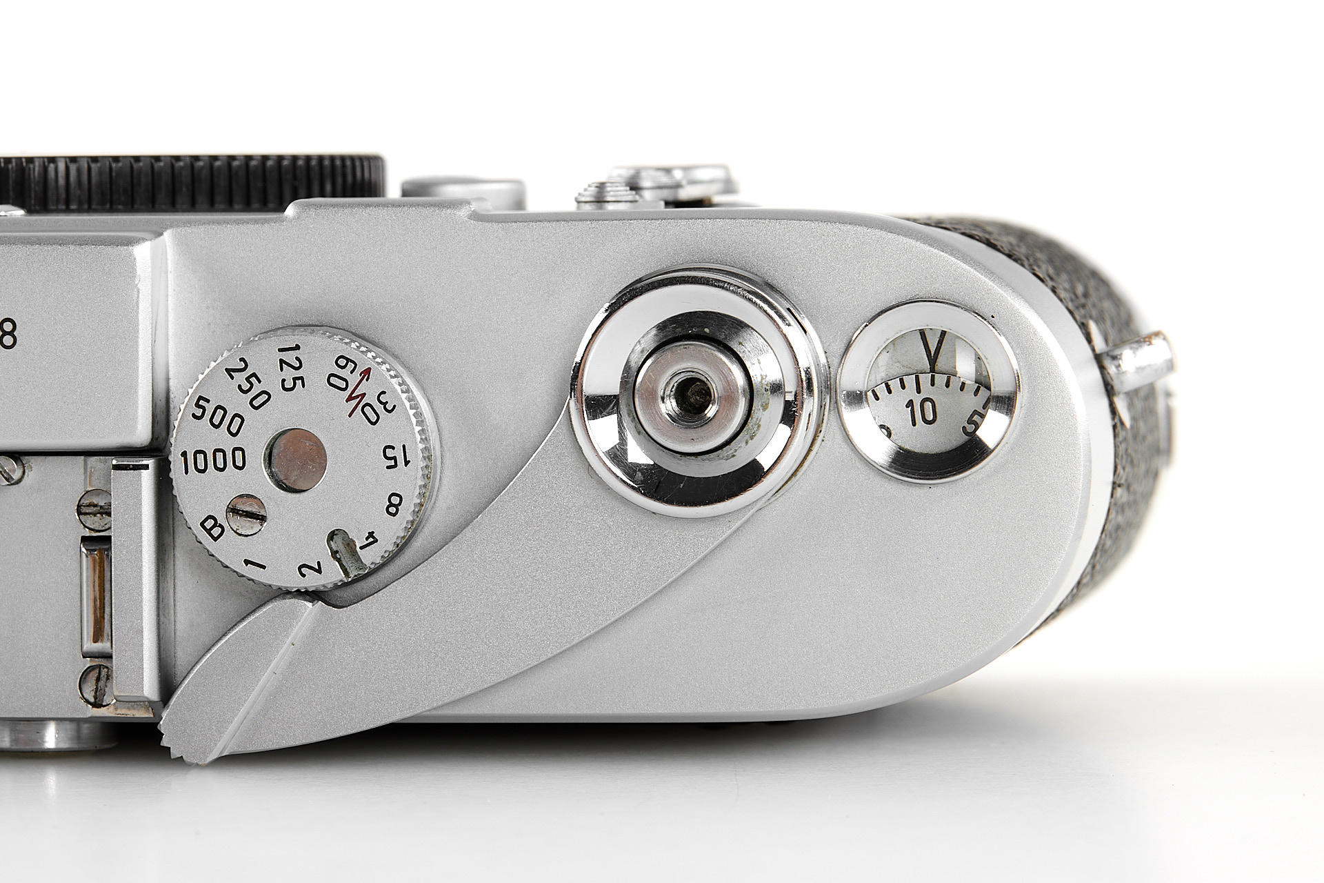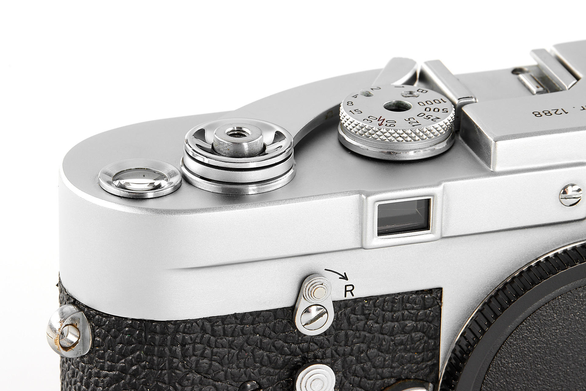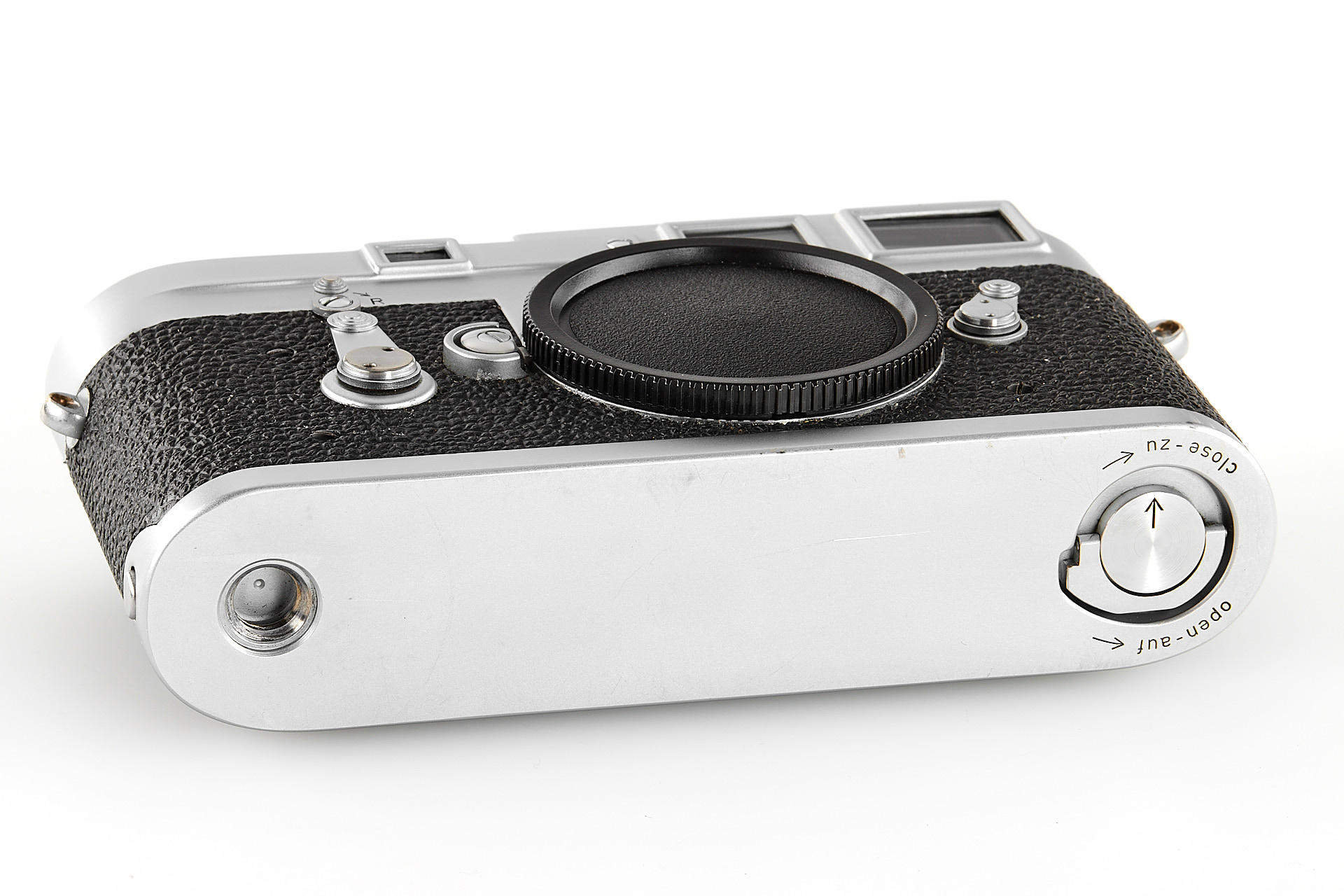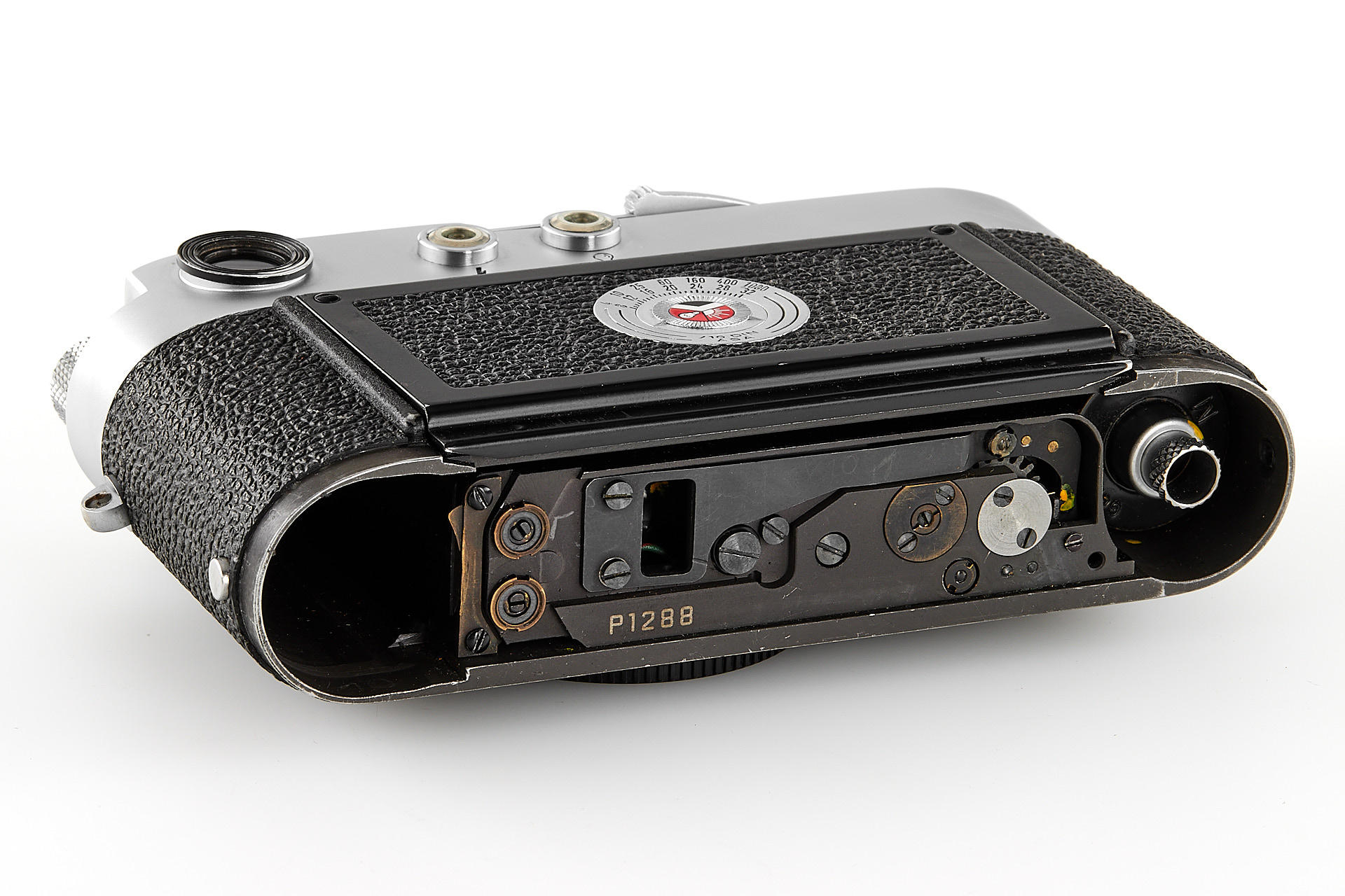 Very rare and unusual M3 chrome single stroke 'Betriebskamera' in near mint condition, made for internal use in the Leica factory, not intended to be sold to the public, only engraved 'Nr. 1288' on the top plate (no 'M3' or 'Betriebskamera') and 'P1288' on the chassis, showing late features such as round lugs, frame selector, standardized speed progression and short rewind knob, earlier 1000 ASA back and uncommon standard flash sync attachment, with body cap, this is a good opportunity for every Leica collector