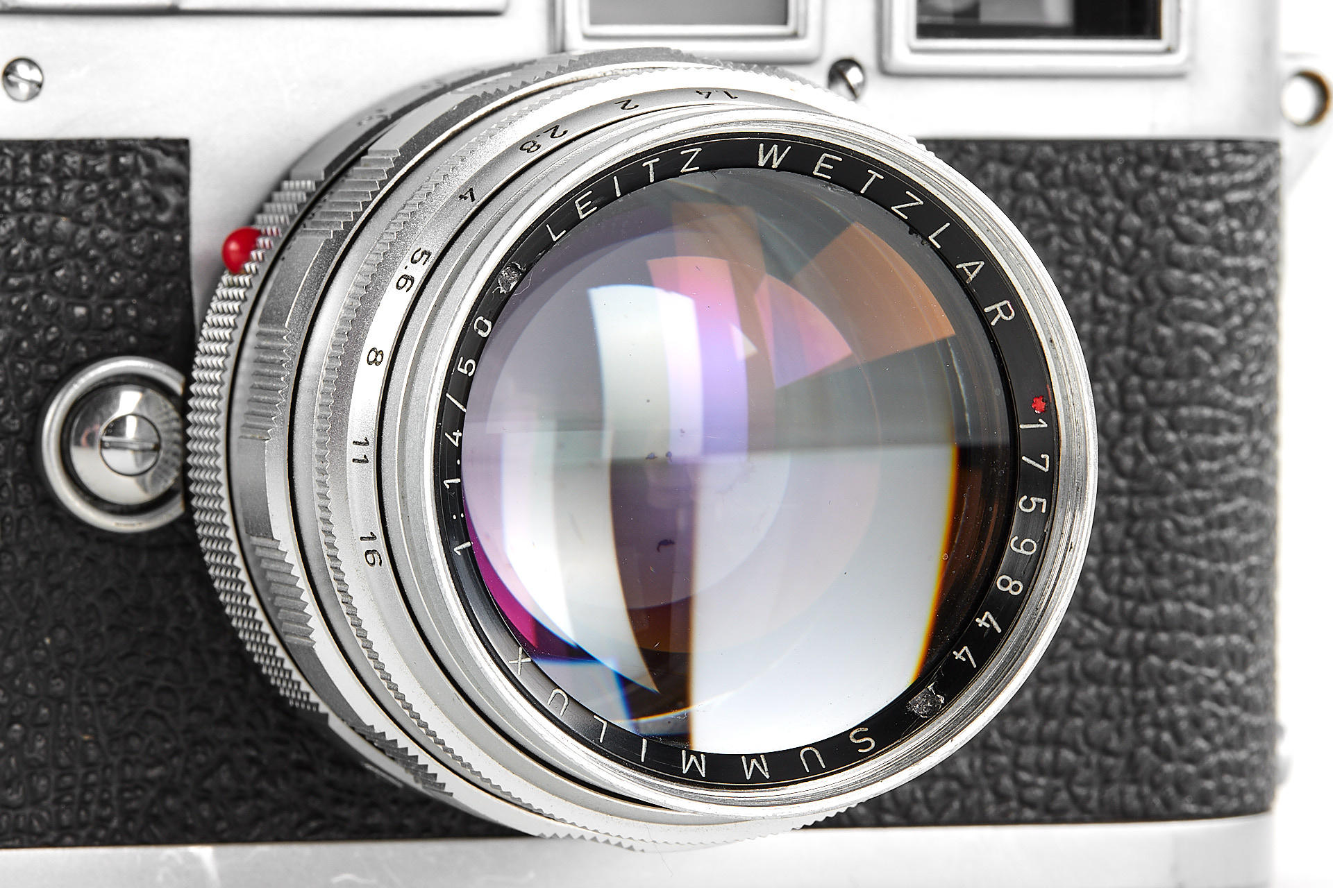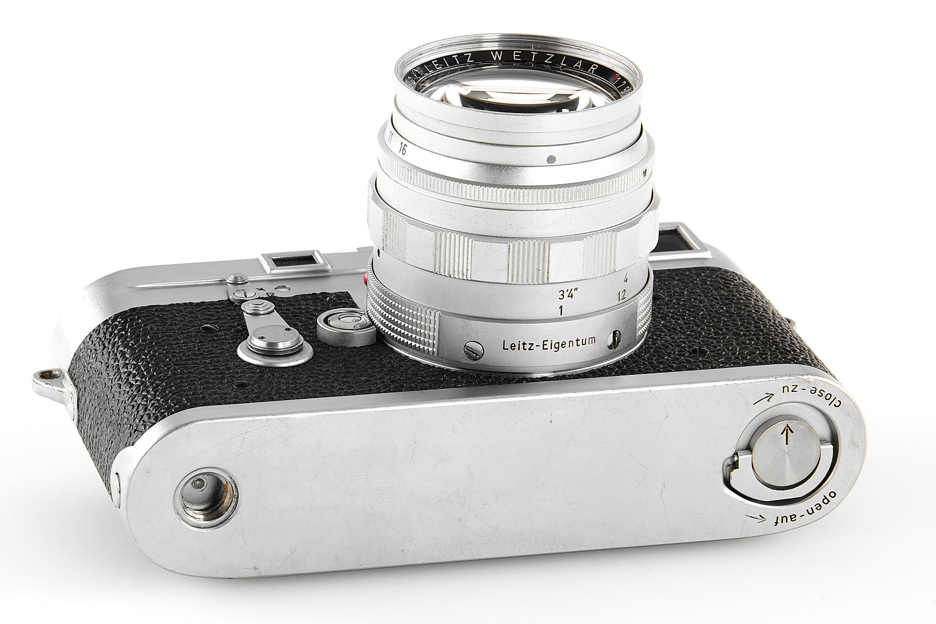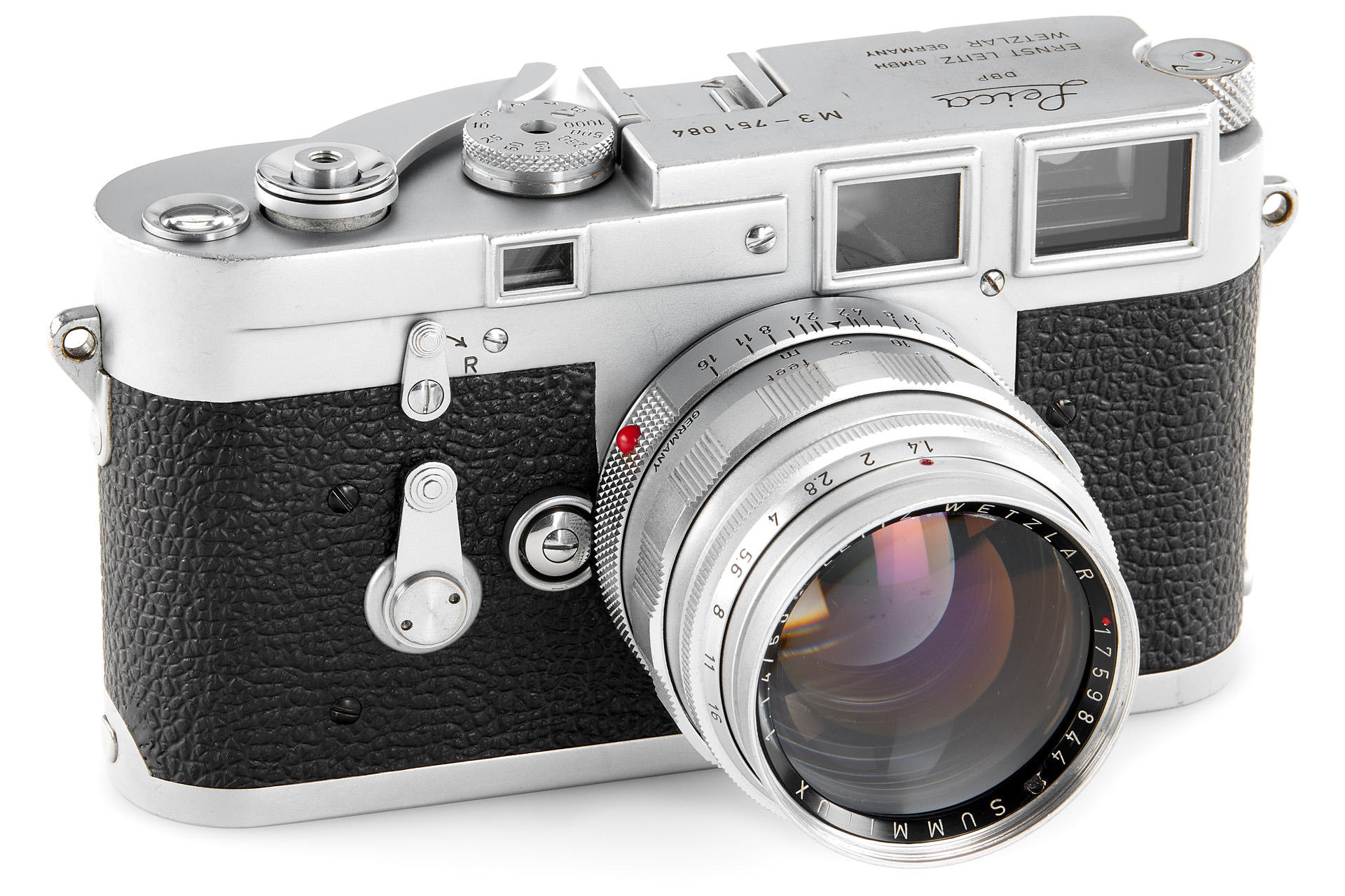 a very rare, orginal 'Leitz-Eigentum' Leica M3 (property of Leitz), in good condition and working order, the originality of the camera has been confirmed by an entry in the Leitz Archives Control Book, including an interesting Summilux 1.4/50mm no.1759844, also engraved with 'Leiz-Eigentum' and with a small red asterisk near the serial number