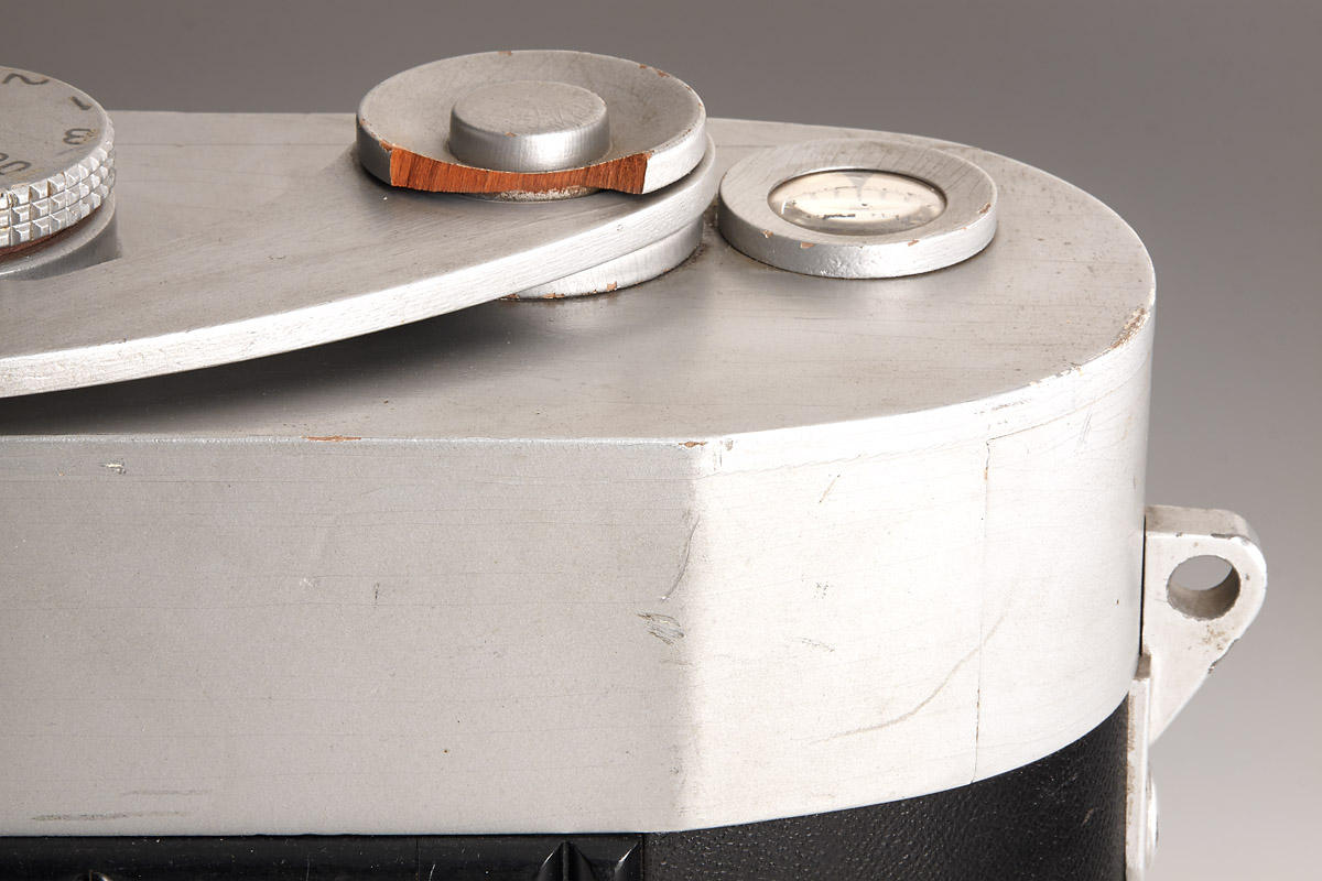 First version original giant display model of Leica M3 with corner in top plate, with 5cm Summarit f/1.5 no. 000000. Very rare and attractive. LITERATURE James L. Lager (ed.), Leica Illustrated History, Vol. III, 1998, p. 321 Giant wooden display models of Leica cameras were occasionally officially produced by Leitz since approximately the late 1920s. Examples of Leica camera models IA (A), III (F), IIIf as well as M3 have been reported. Furthermore, several custom-made giant models exist, but the original versions are exceedingly rare. Of the Leica M3 giant models, there even are a number of variations, made at different moments during the long production period of the M3. The first original giant display model of the Leica M3 was made for presentation of the then new camera in April 1954 at Photokina in Cologne. Großmodelle aus Holz wurden für Ausstellungszwecke von der Firma Leitz offiziell seit etwa Ende der 1920er Jahre vereinzelt hergestellt. Es sind Exemplare der Leica IA, III, IIIf und M3 bekannt. Es existieren daneben auch eine Reihe solcher Großmodelle von dritter Hand, jedoch sind die Originalversionen um ein Vielfaches seltener. Von der Leica M3 wurden während der langen Produktionszeit dieser Kamera sogar eine Reihe verschiedener Versionen von Großmodellen gefertigt. Die erste davon entstand zum Zwecke der Präsentation der neuen Leica M3 anlässlich der Photokina in Köln im April 1954.