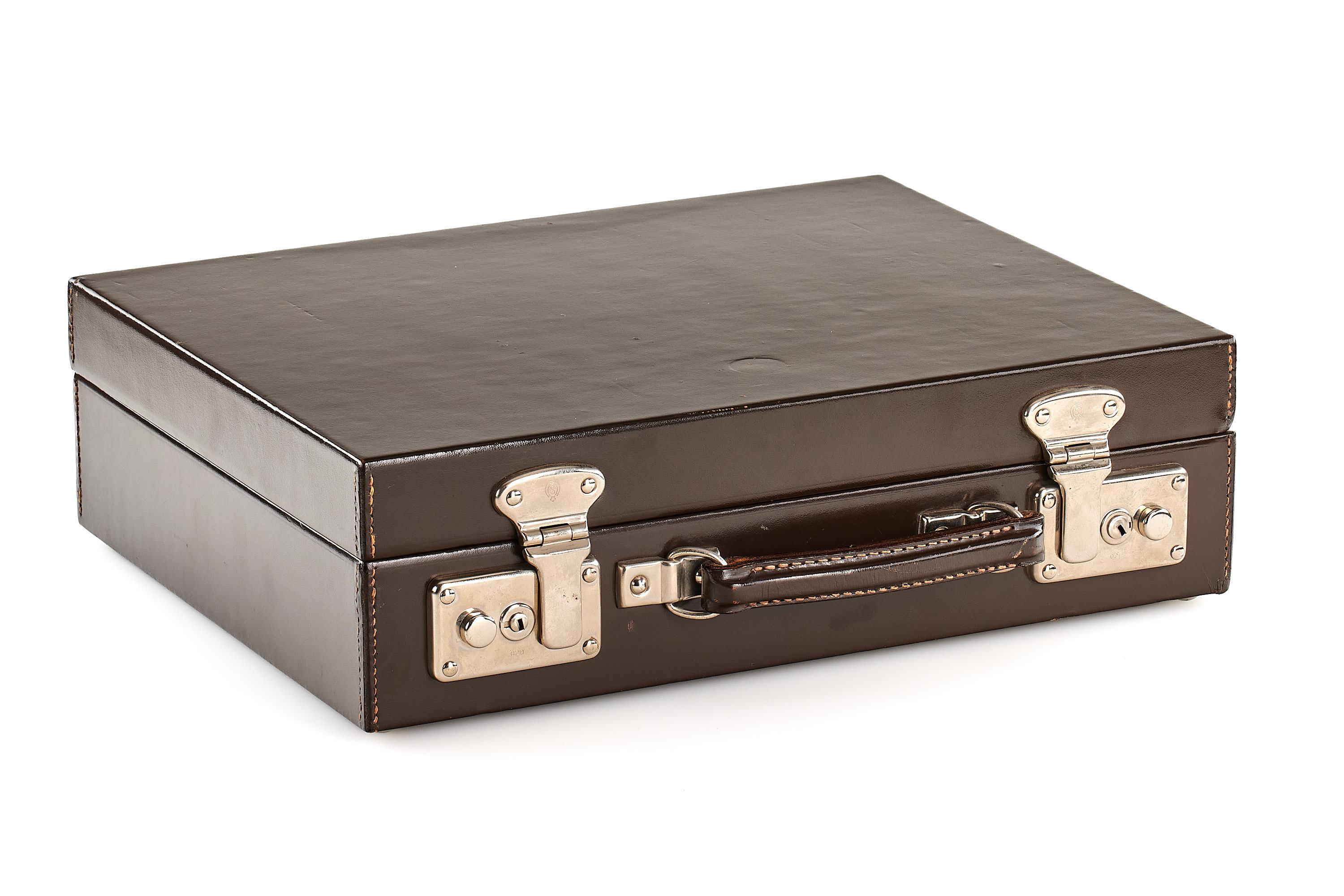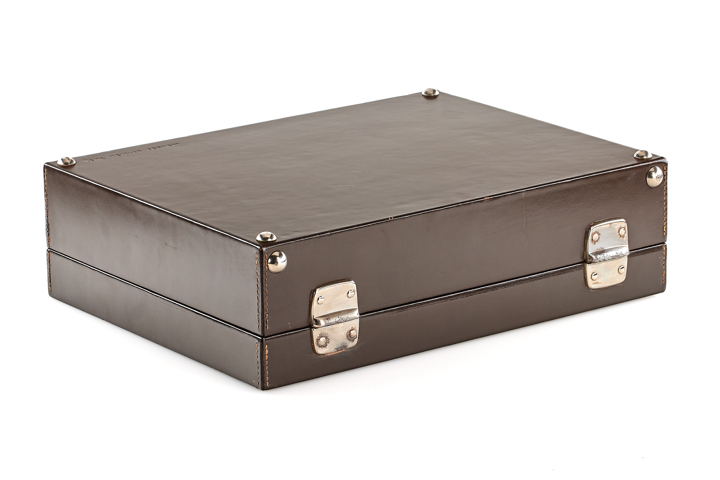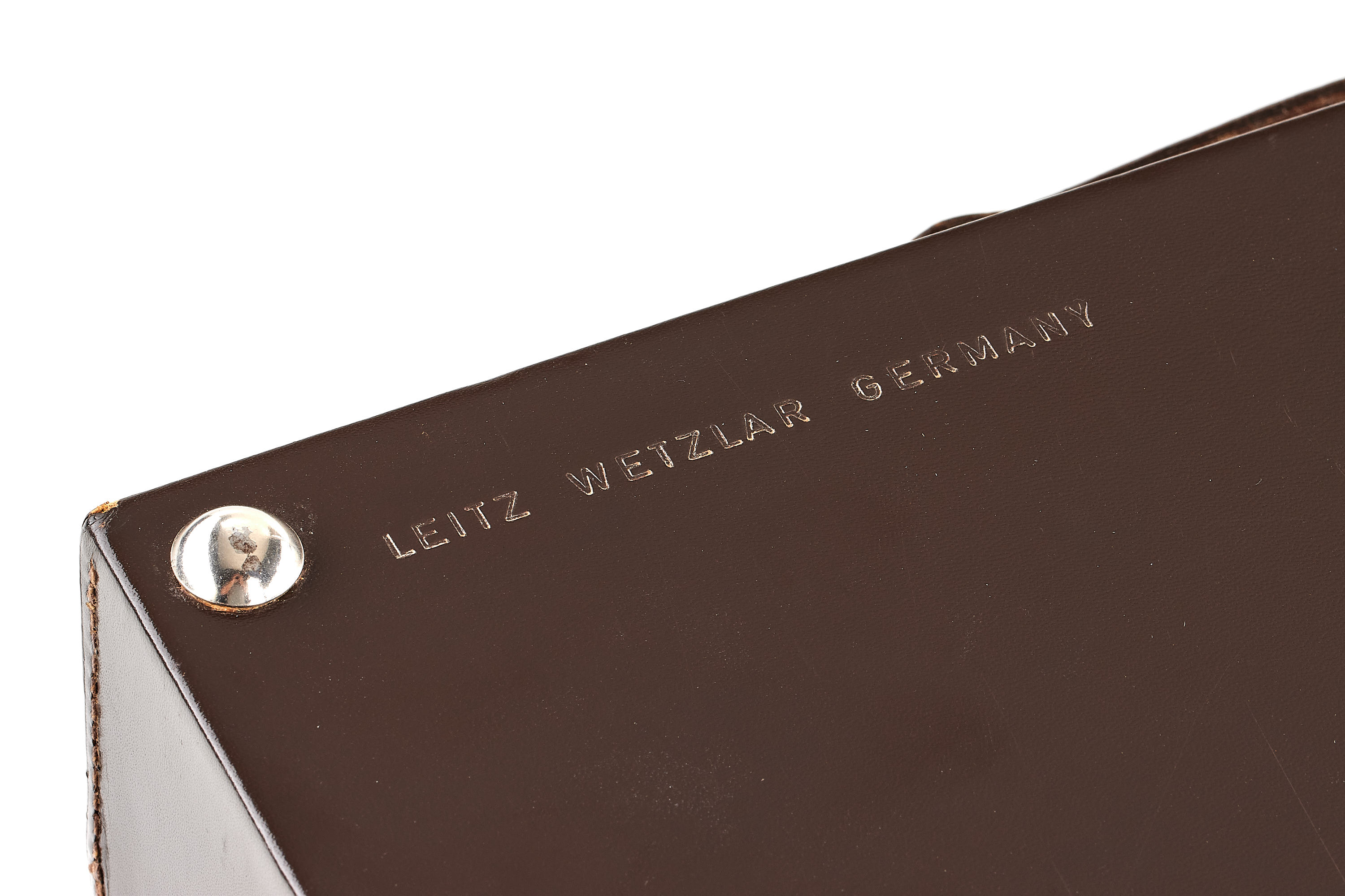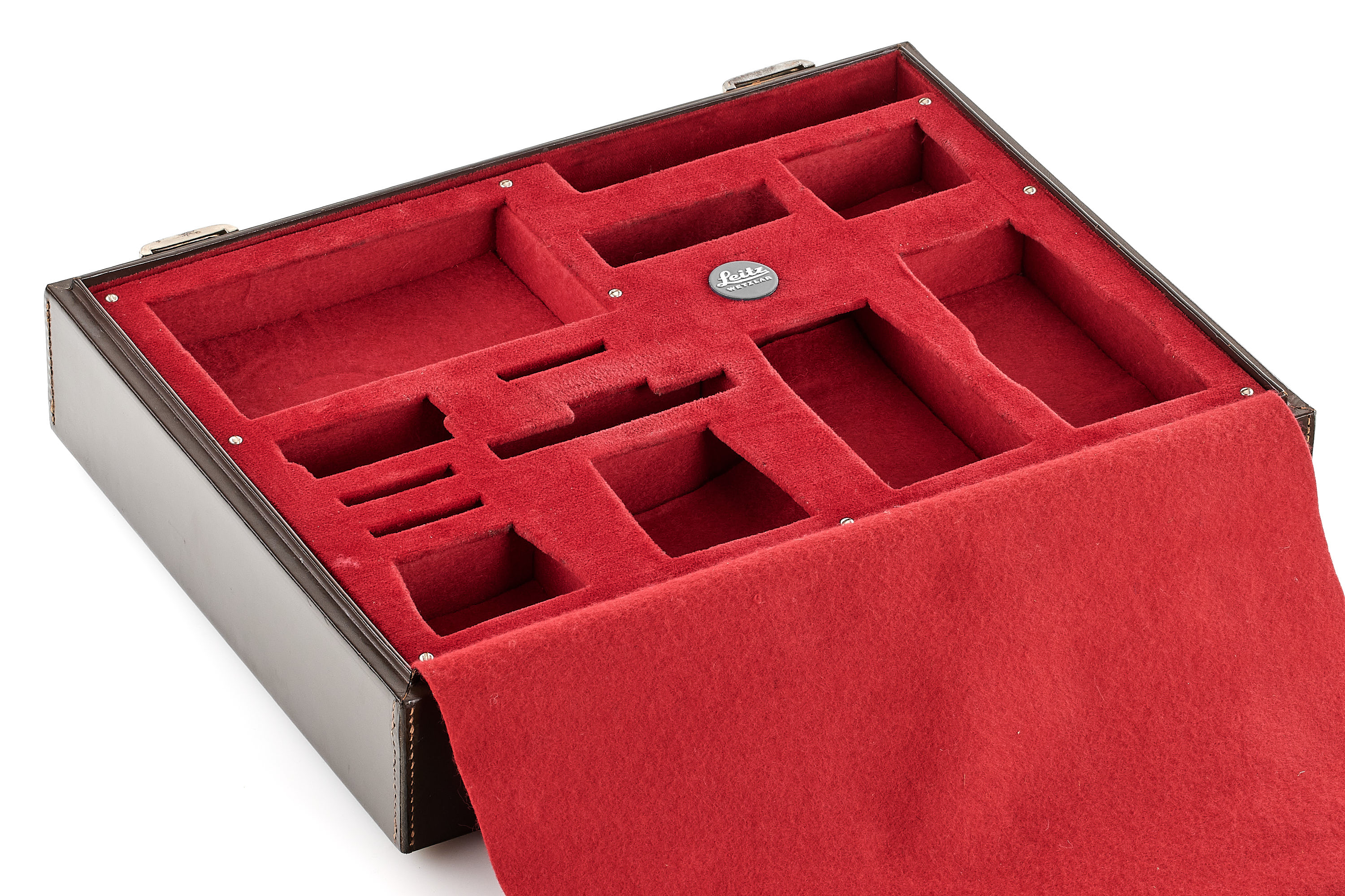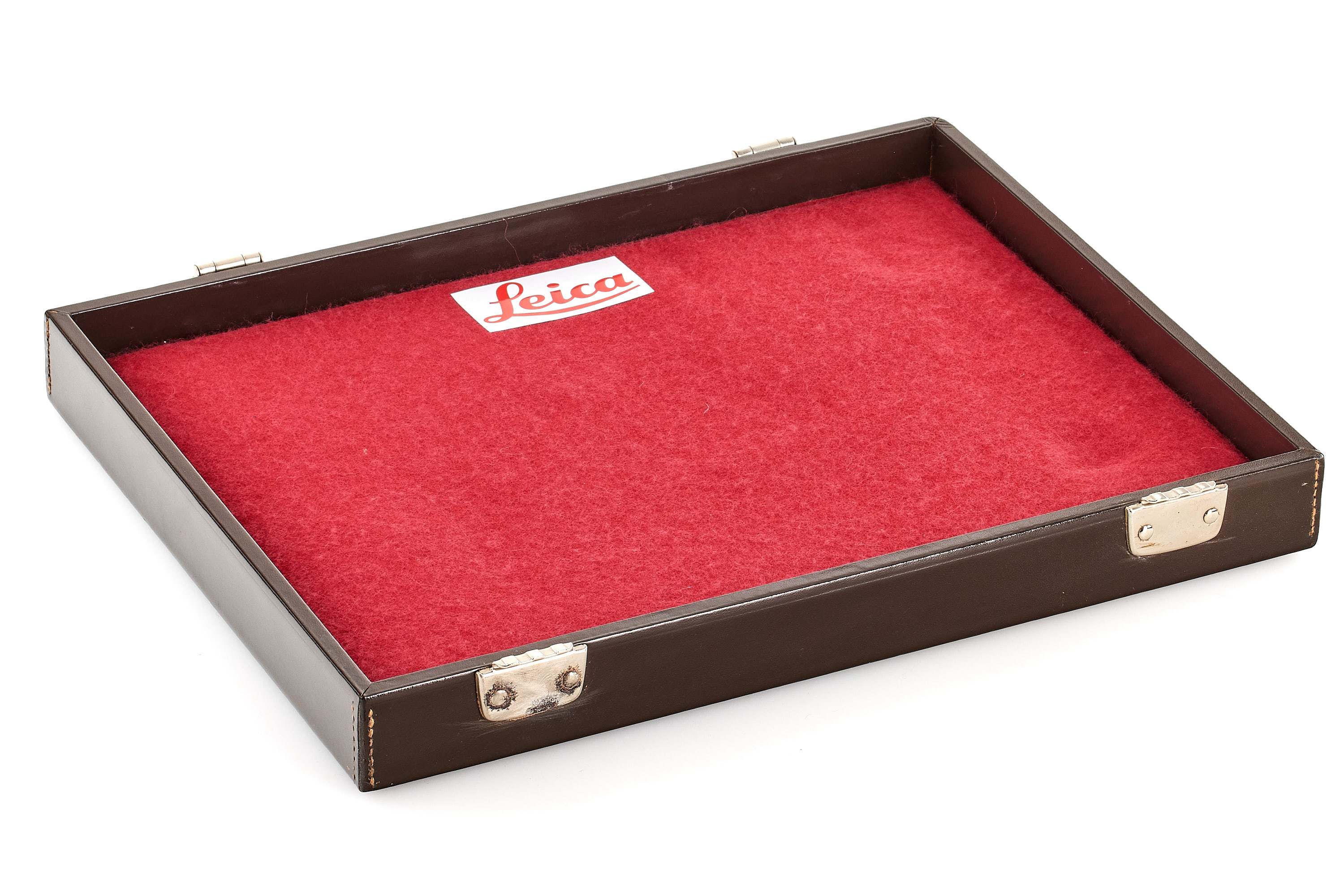 Very rare Leitz dealer's early Leica M presentation leather case, designed to contain 1 body, 4x lenses (35 - 50 + goggles - 90 - 135mm), hoods, filters and strap, in very good condition.
