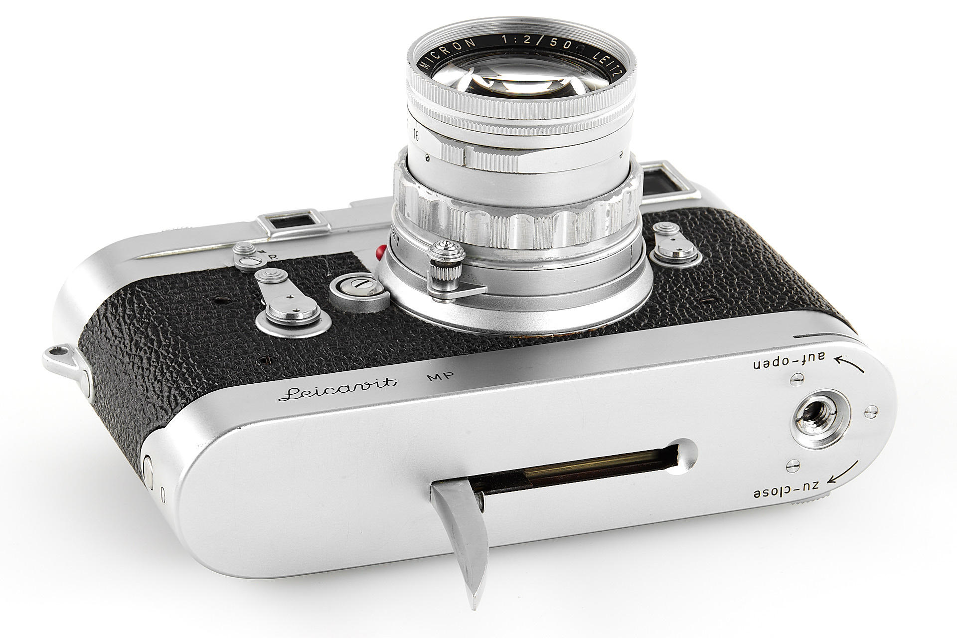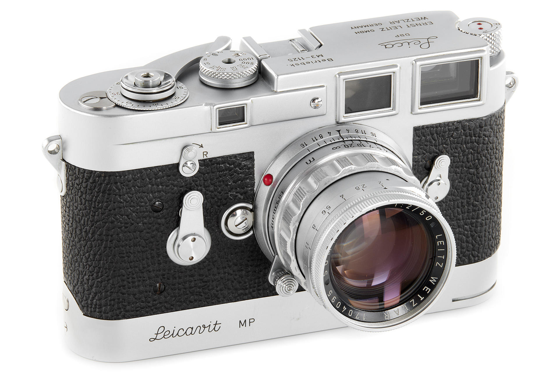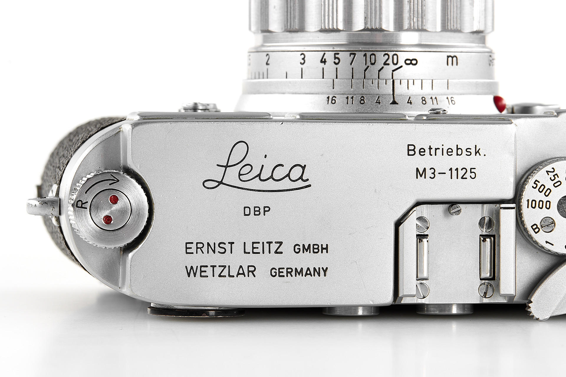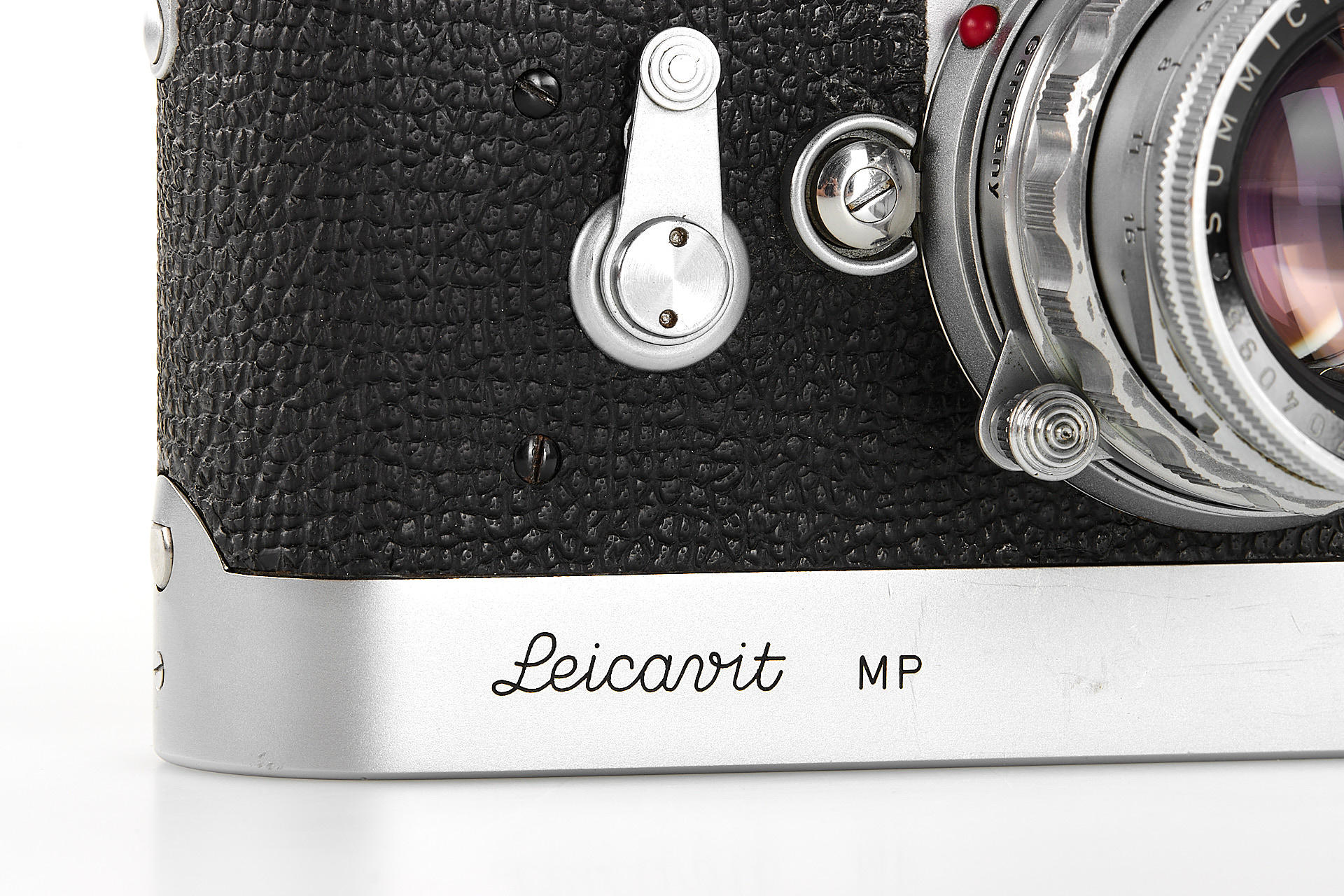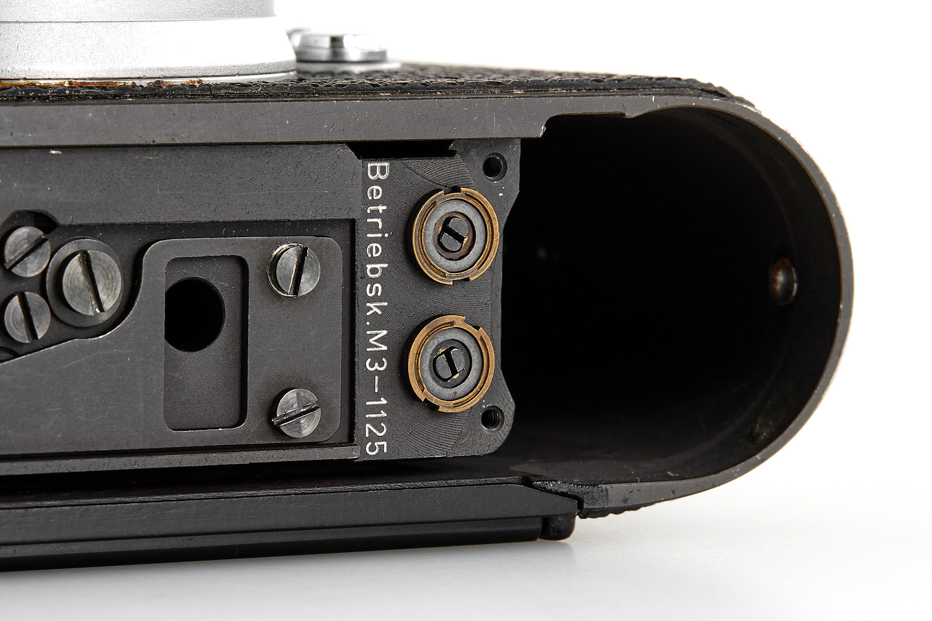 a special M3 Betriebskamera showing features of a Leica MP, this special camera is equipped with MP chassis (cast number 92176), modified MP top plate, Leicavit coupling, it is engraved on the top plate and on the chassis with 'Betriebsk. M3-1125', a similar camera, engraved 'Betriebsk. MP-1167' can be seen in J. Lager 'Leica, An Illustrated History' Vol.1 on page 198, included with the camera is a rigid Summicron 2/50mm no.1704095 and Leicavit MP