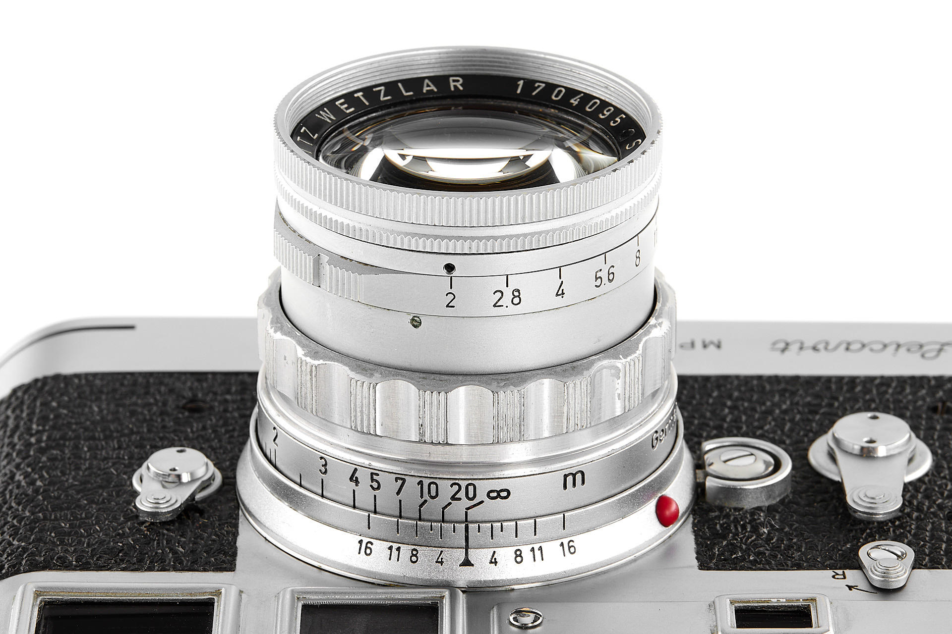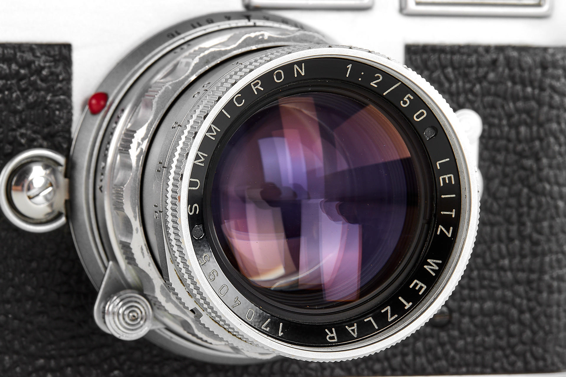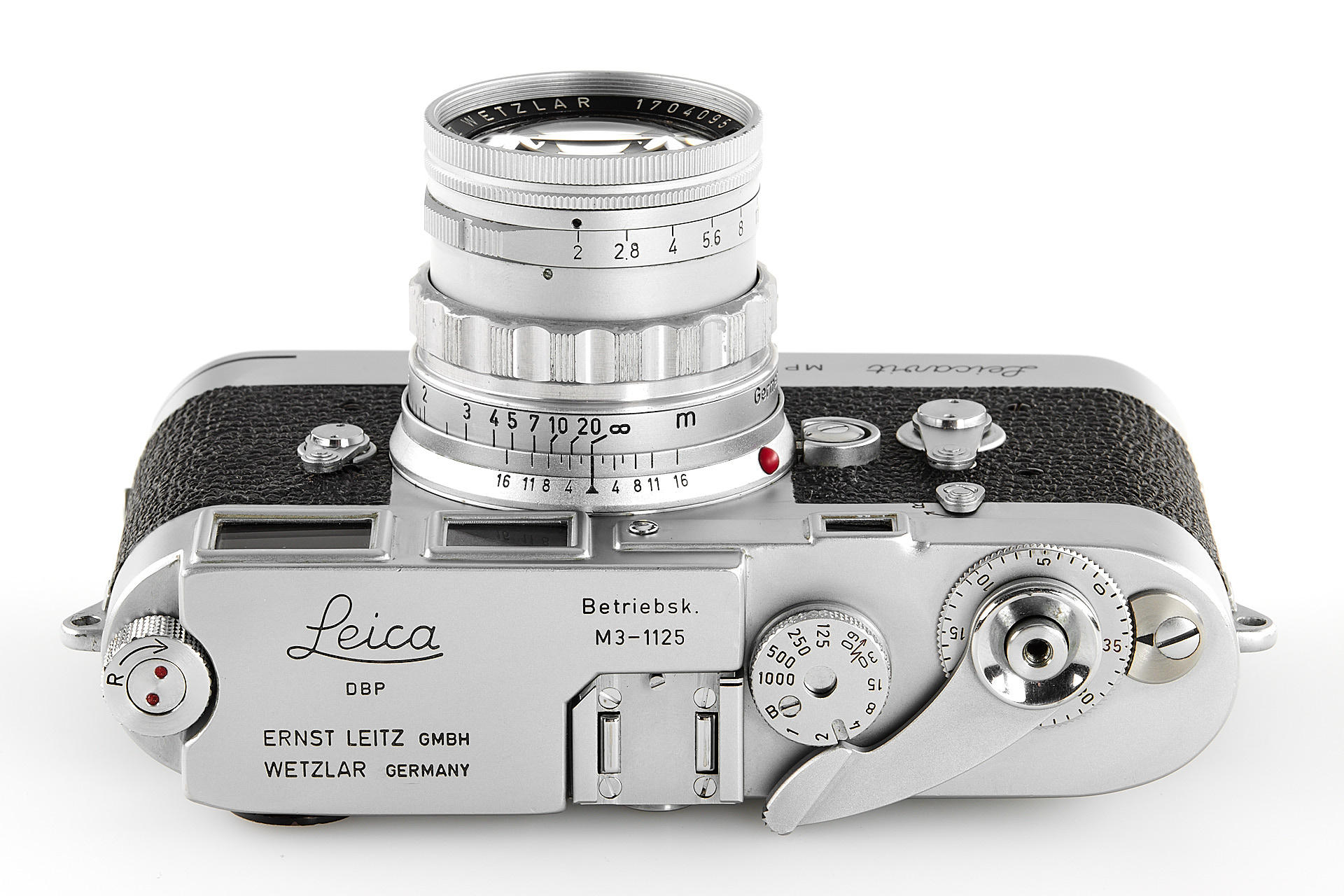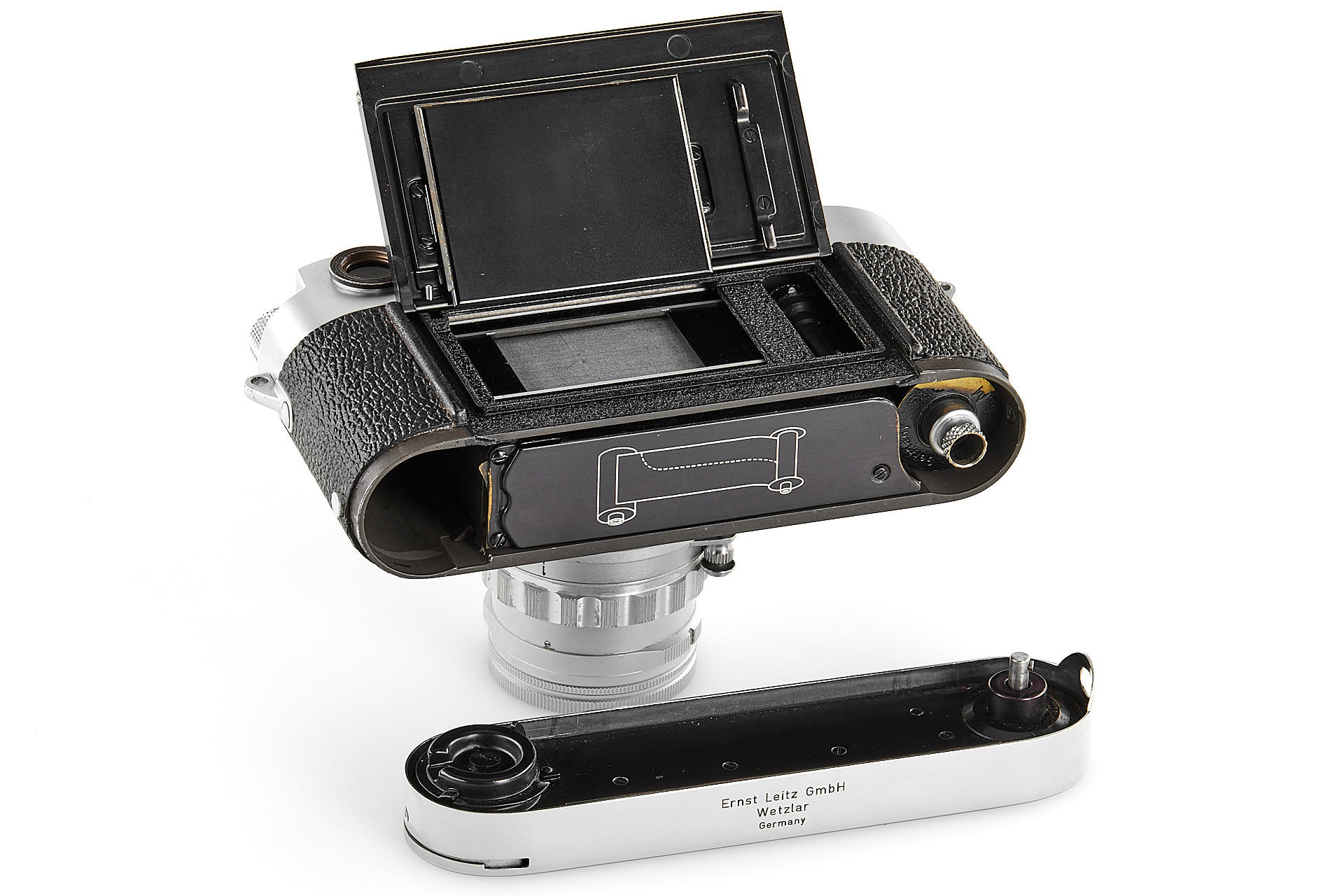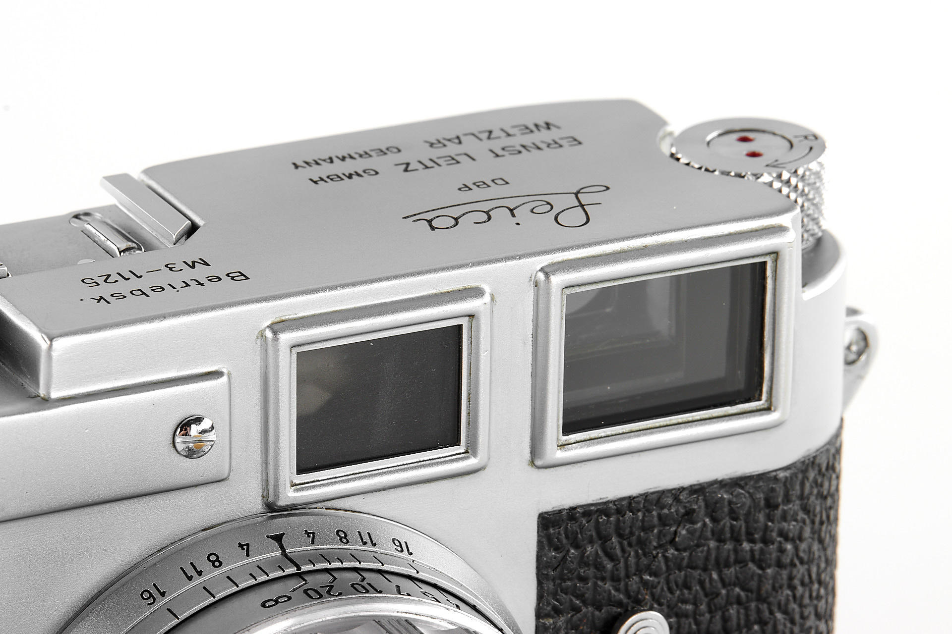 a special M3 Betriebskamera showing features of a Leica MP, this special camera is equipped with MP chassis (cast number 92176), modified MP top plate, Leicavit coupling, it is engraved on the top plate and on the chassis with 'Betriebsk. M3-1125', a similar camera, engraved 'Betriebsk. MP-1167' can be seen in J. Lager 'Leica, An Illustrated History' Vol.1 on page 198, included with the camera is a rigid Summicron 2/50mm no.1704095 and Leicavit MP