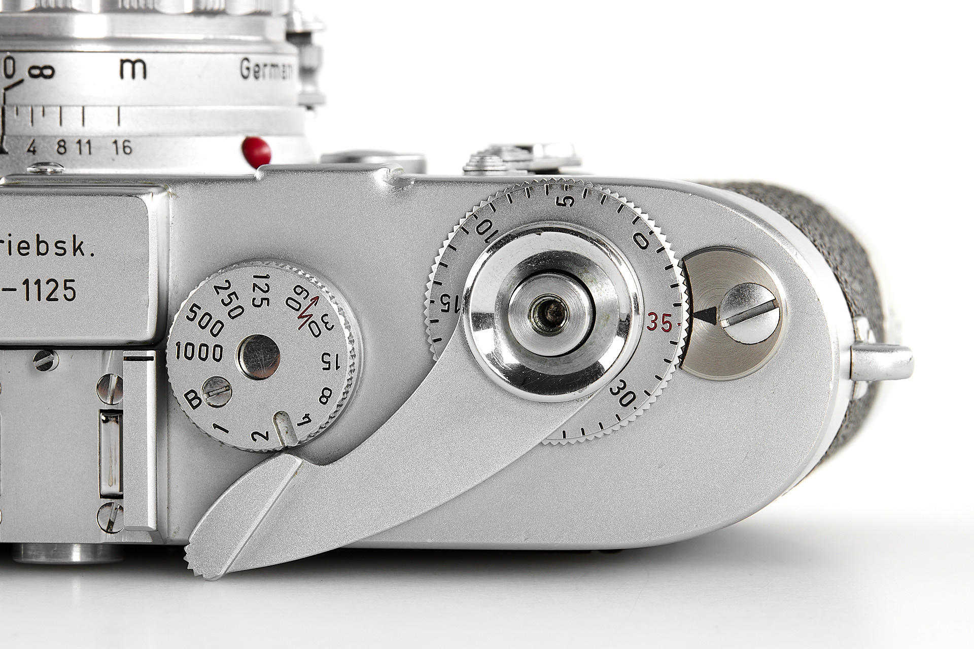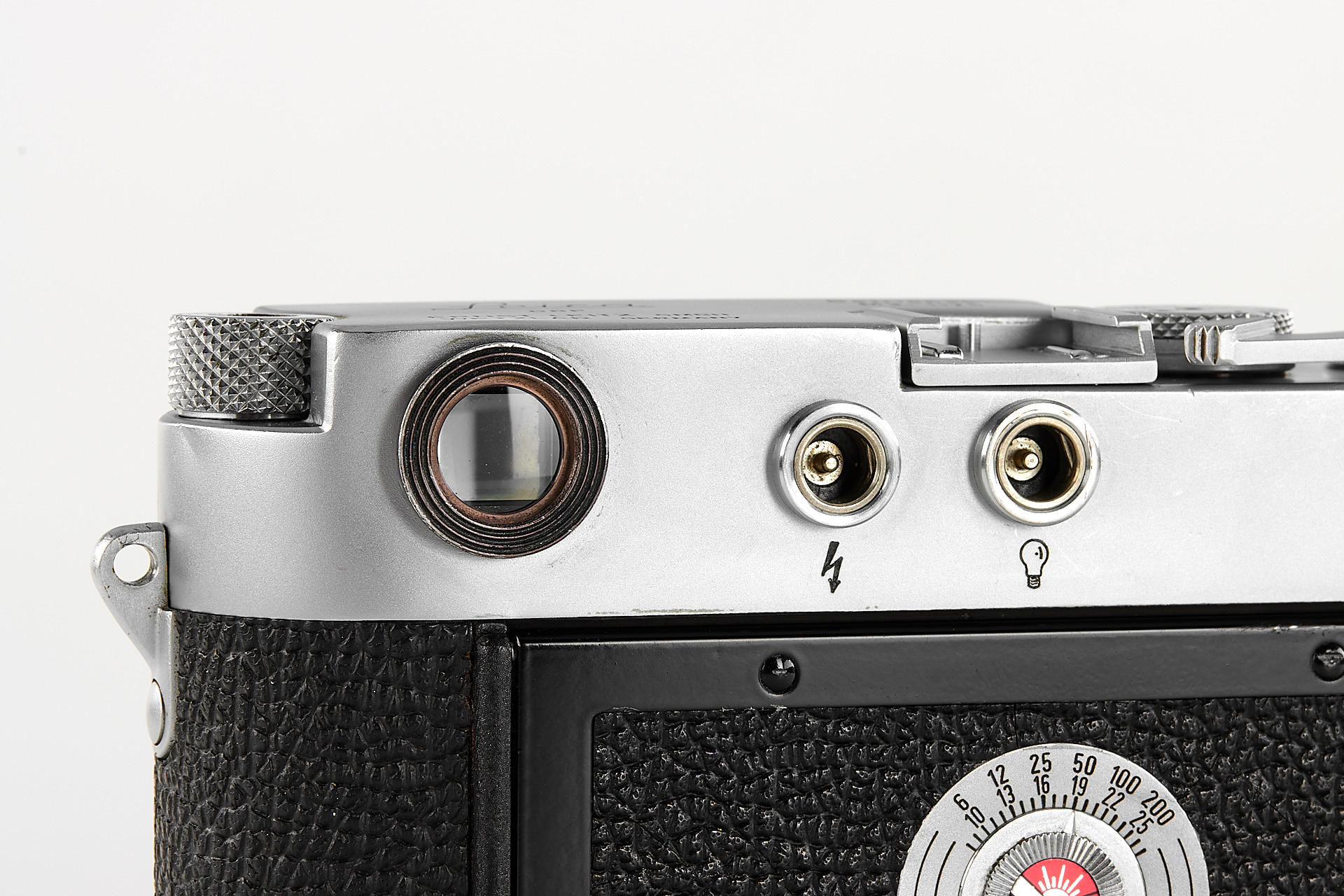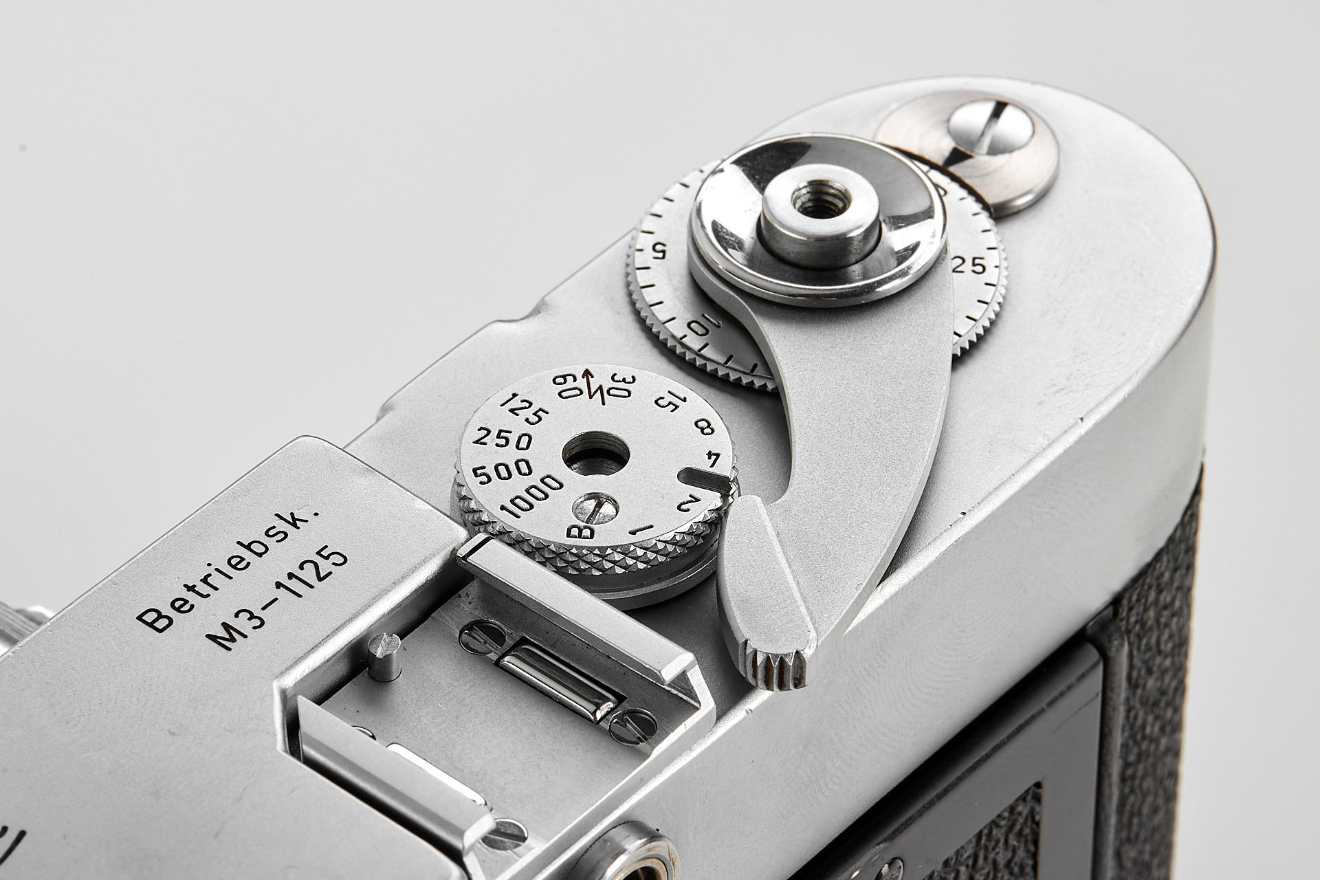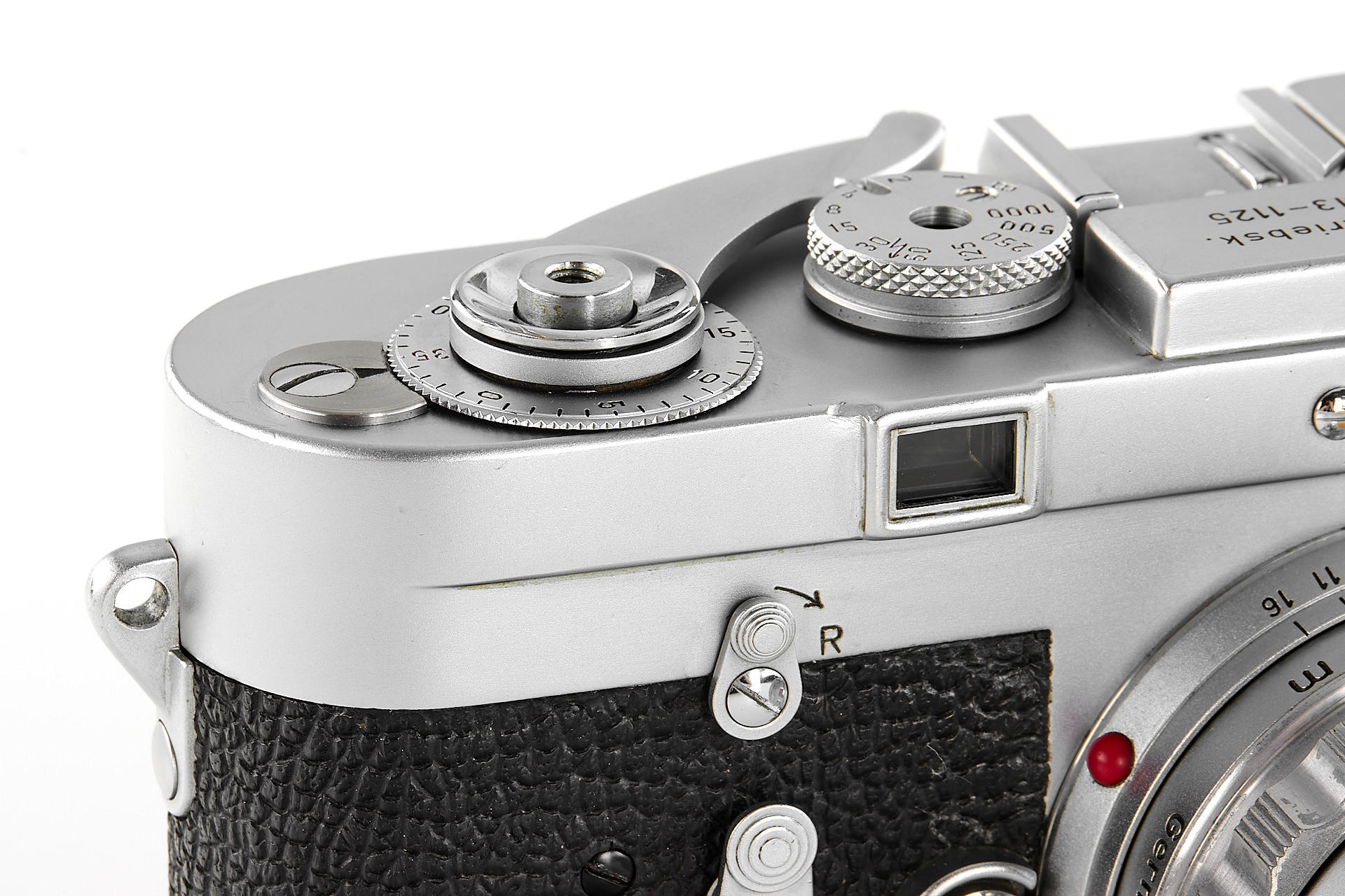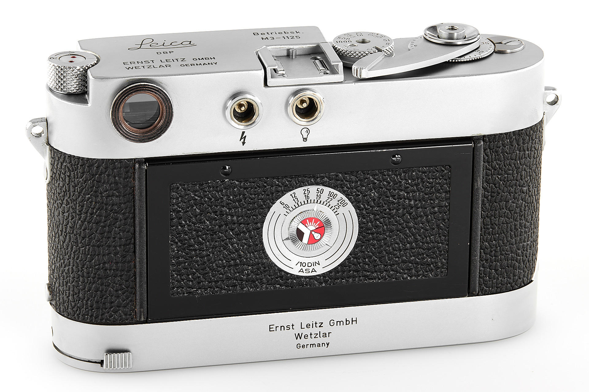 a special M3 Betriebskamera showing features of a Leica MP, this special camera is equipped with MP chassis (cast number 92176), modified MP top plate, Leicavit coupling, it is engraved on the top plate and on the chassis with 'Betriebsk. M3-1125', a similar camera, engraved 'Betriebsk. MP-1167' can be seen in J. Lager 'Leica, An Illustrated History' Vol.1 on page 198, included with the camera is a rigid Summicron 2/50mm no.1704095 and Leicavit MP