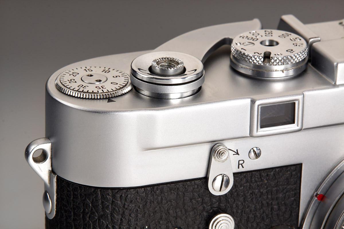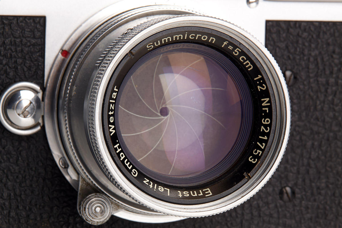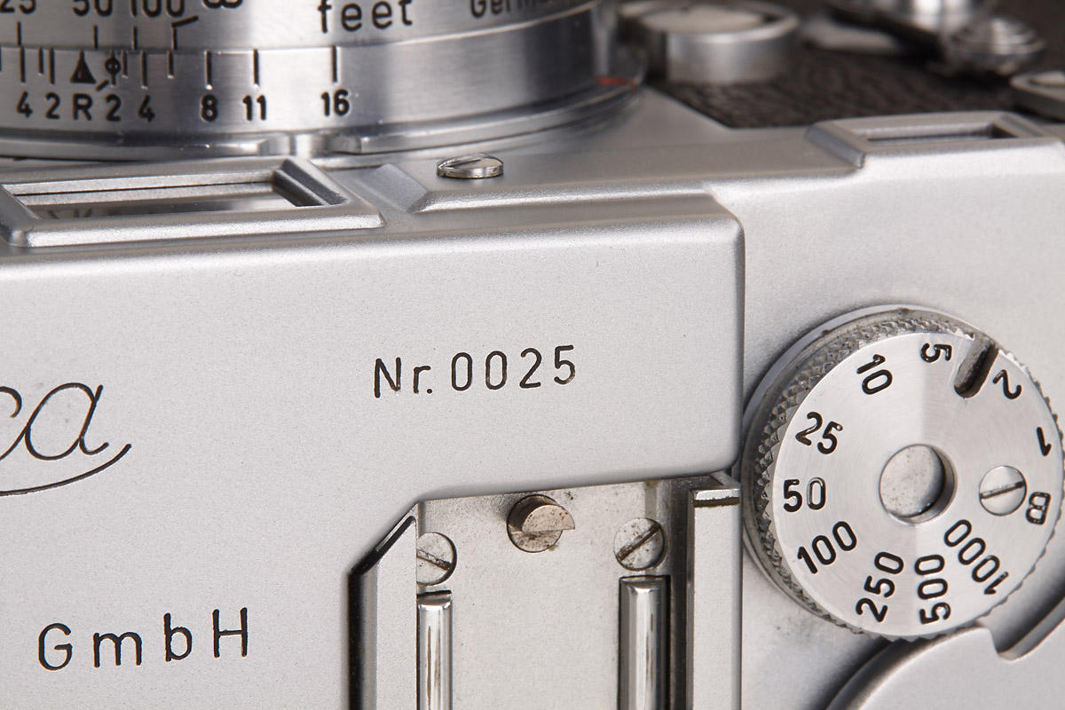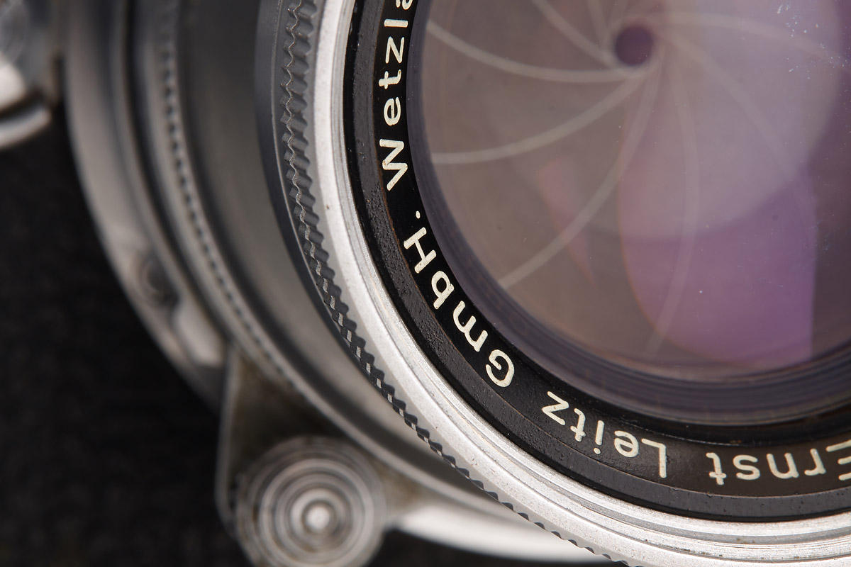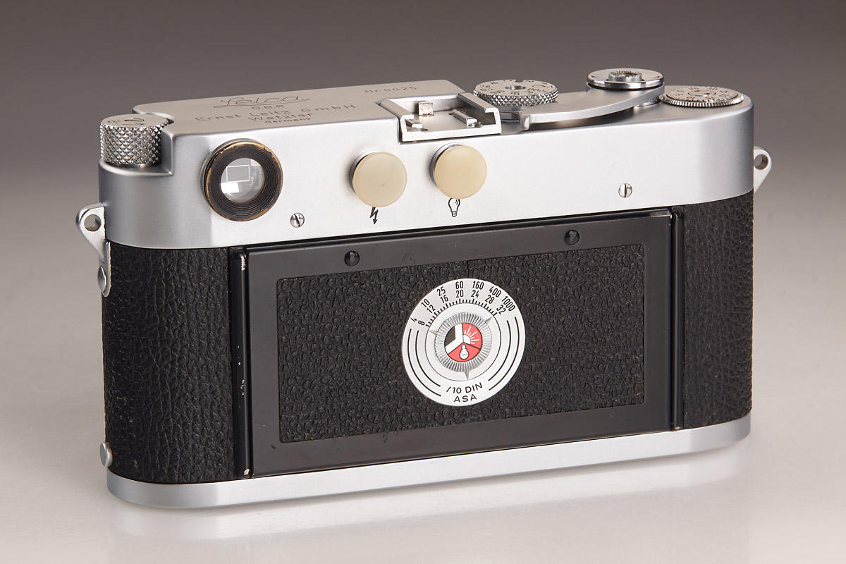 Extremely rare Leica M3 With very early screw mount 5 cm Summicron f/2 no. 921753 with bayonet adaptor. LITERATURE Paul-Henry van Hasbroeck (ed.), Leica, a history illustrating every model and accessory, p. 154-156. Approximately 65 units of the Leica M3 pre-series camera were produced for testing purposes in 1953, and only a very few have survived. There are quite some differences in design still from the first serial production M3s. Cameras Nos. 005, 0041, 0043 and 0056 are illustrated in Lager, Leica Illustrated History, Vol. I, p.173-175. Extremely rare Leica M3 prototype camera in perfect working condition. All typical features (except a later rear door), including differently designed film advance lever, speed dial, self-timer, reversed direction rewind knob, external frame counter and release-button lockable at “B“. The camera is in fantastic, almost mint condition – original top and bottom plate were previously re-chromed. This is a rare opportunity to acquire one of the most important cameras in the history of the Leica M. Im Jahr 1953 wurden etwa 65 Vorserienkameras der Leica M3 für Erprobungszwecke gefertigt, von denen nur wenige überlebt haben. Diese Kameras weisen noch einige konstruktive Unterschiede zu den ersten Serienkameras der M3 auf. Die Kameras mit den Nummern 005, 0041, 0043 und 0056 sind abgebildet in Lager, Leica Illustrated History, Band I, S. 173-175. Extrem seltener Leica M3 Prototyp in voll funktionsfähigem Zustand. Alle typischen Merkmale (mit Ausnahme einer späteren Rückwand), wie unterschiedlich ausgeführtem Schnellschalthebel, Zeitenknopf, Rückwicklung mit umgekehrter Drehrichtung, außenliegendem Bildzählwerk und Auslöseknopf, der auf „B“ verriegelt werden konnte. Die Kamera befindet sich in einem fantastischen, fast neuwertigen Zustand – original Deckkappe und Bodendeckel wurden in früherer Zeit einmal neu verchromt. Dies ist eine seltene Gelegenheit zum Erwerb einer der wichtigsten Kameras in der Geschichte der Leica M.