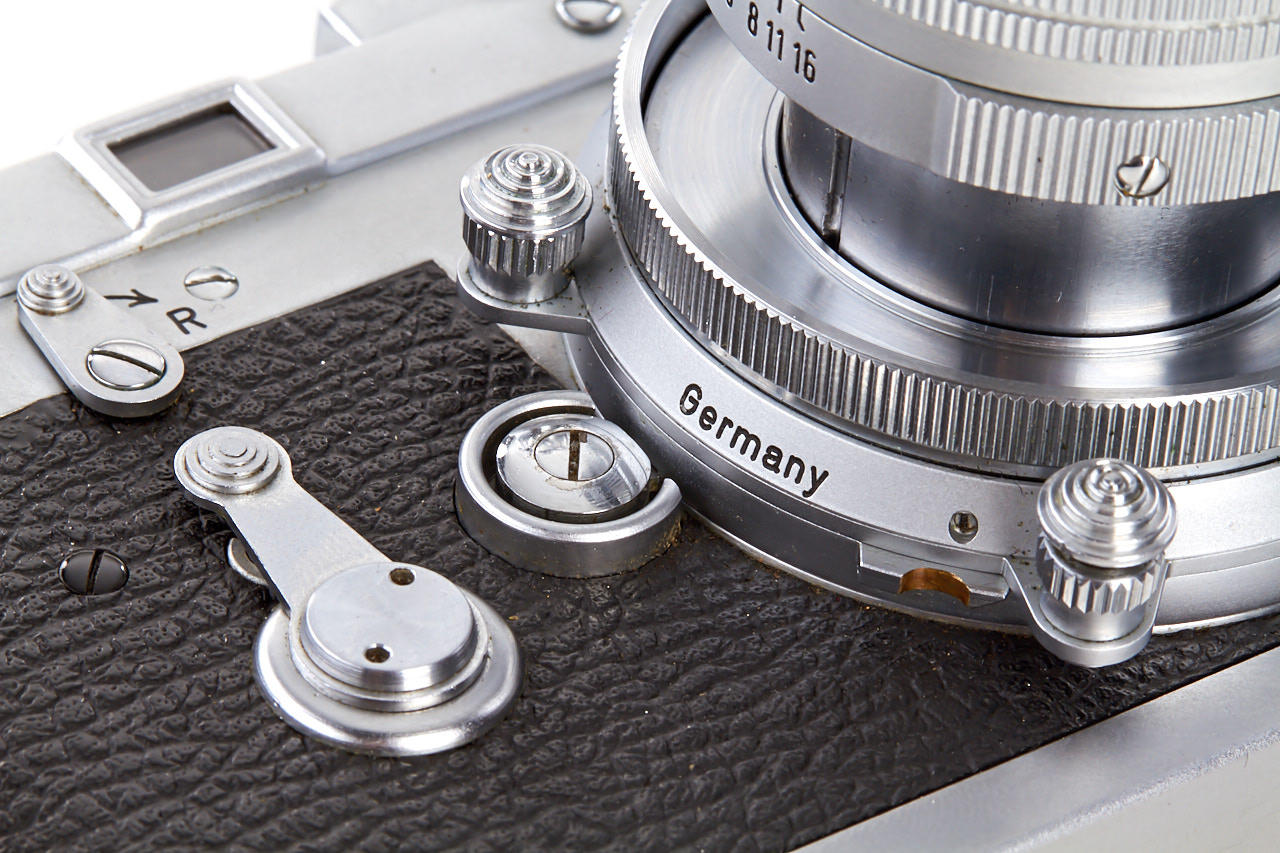 Extremely rare M3 prototype (pre-series, produced as test camera in 1952/53). The camera is in almost mint original and perfect working condition, with all original features including film advance lever, external frame counter, early speed dial, shape of self timer, backdoor with film marker punch and ceramic pressure plate, shutter release and rewind knob (see Lager I, p.173-175). With rare dual-lever prototype Summicron 2/5cm no.920290 in perfect condition. Rare opportunity to acquire one of the most important cameras in Leica's history in fantastic condition, the camera was never offered in auction before. The camera is illustrated in Paul-Henry van Hasbroeck 'Leica in Colour' p.64 + 'Leica A History illustrating every Model and Accessory' colour plate XXVI