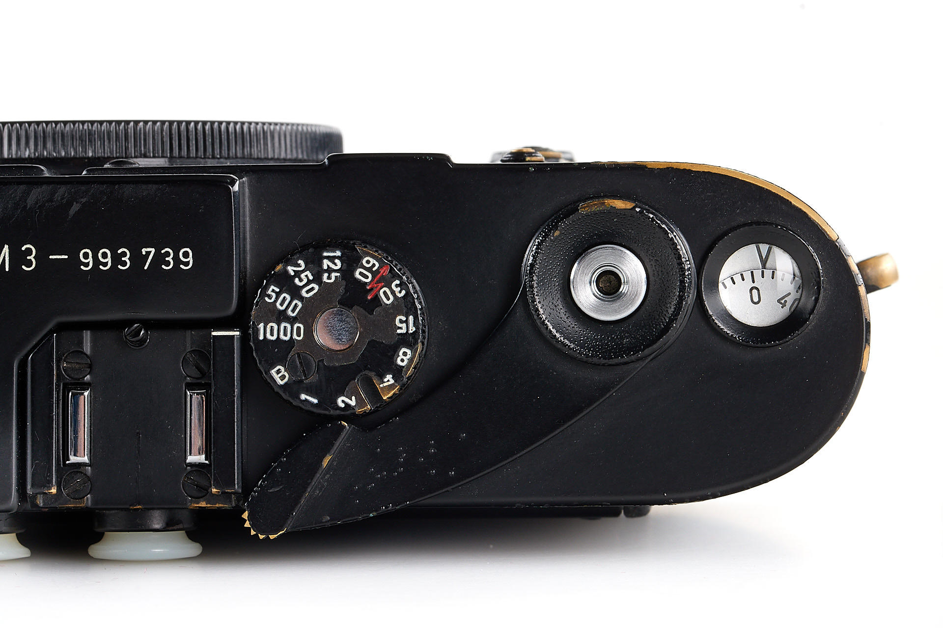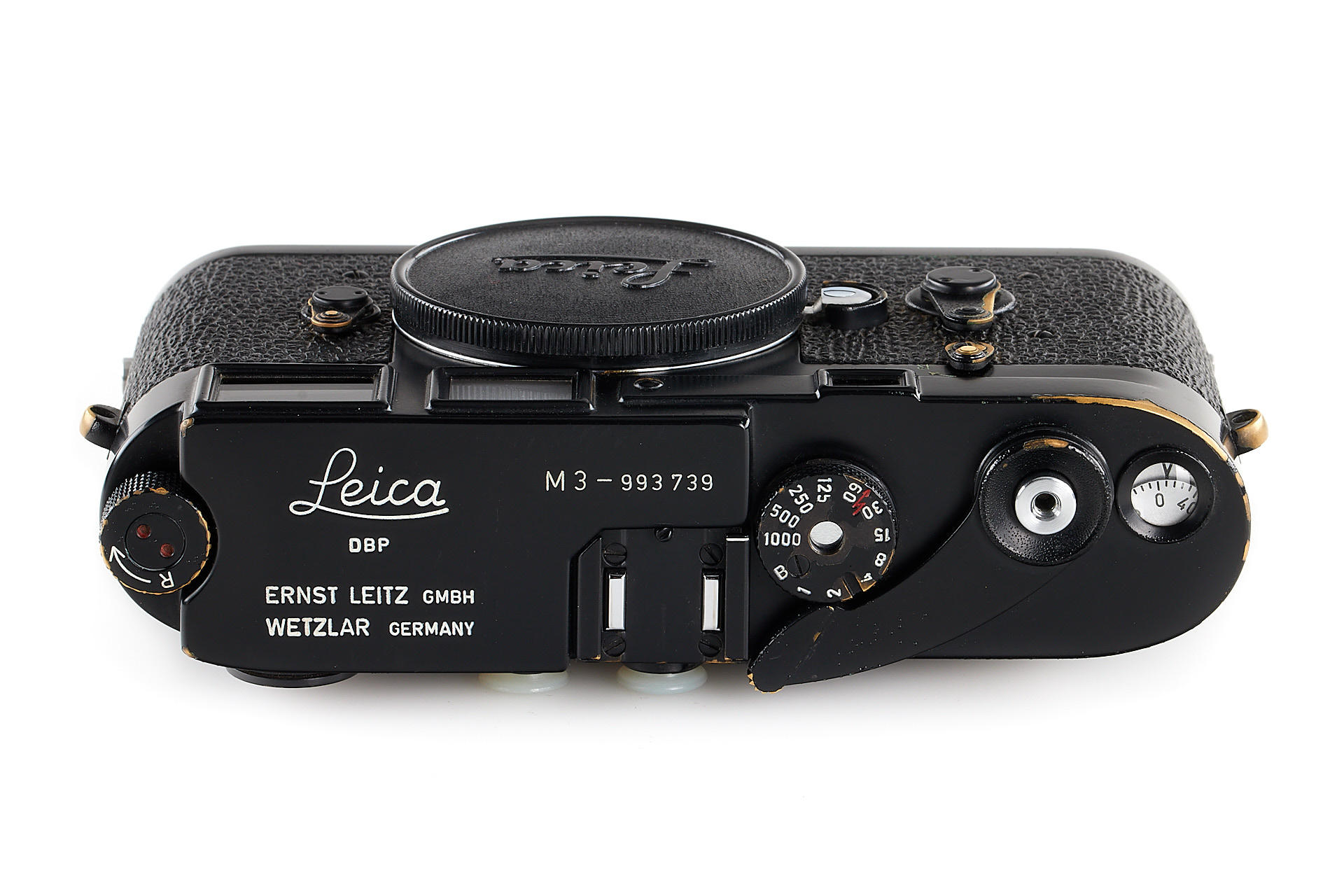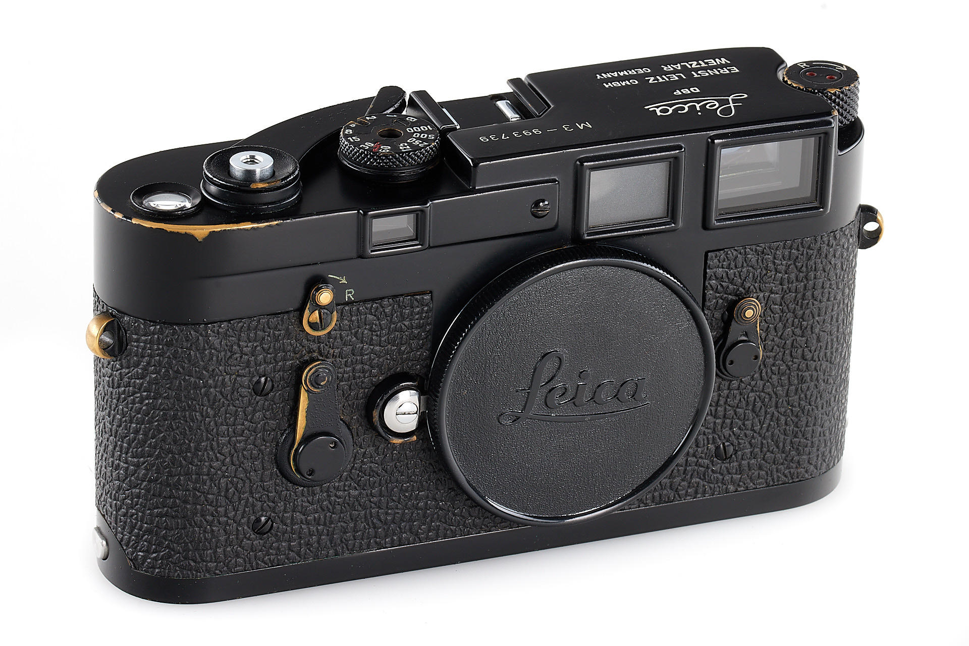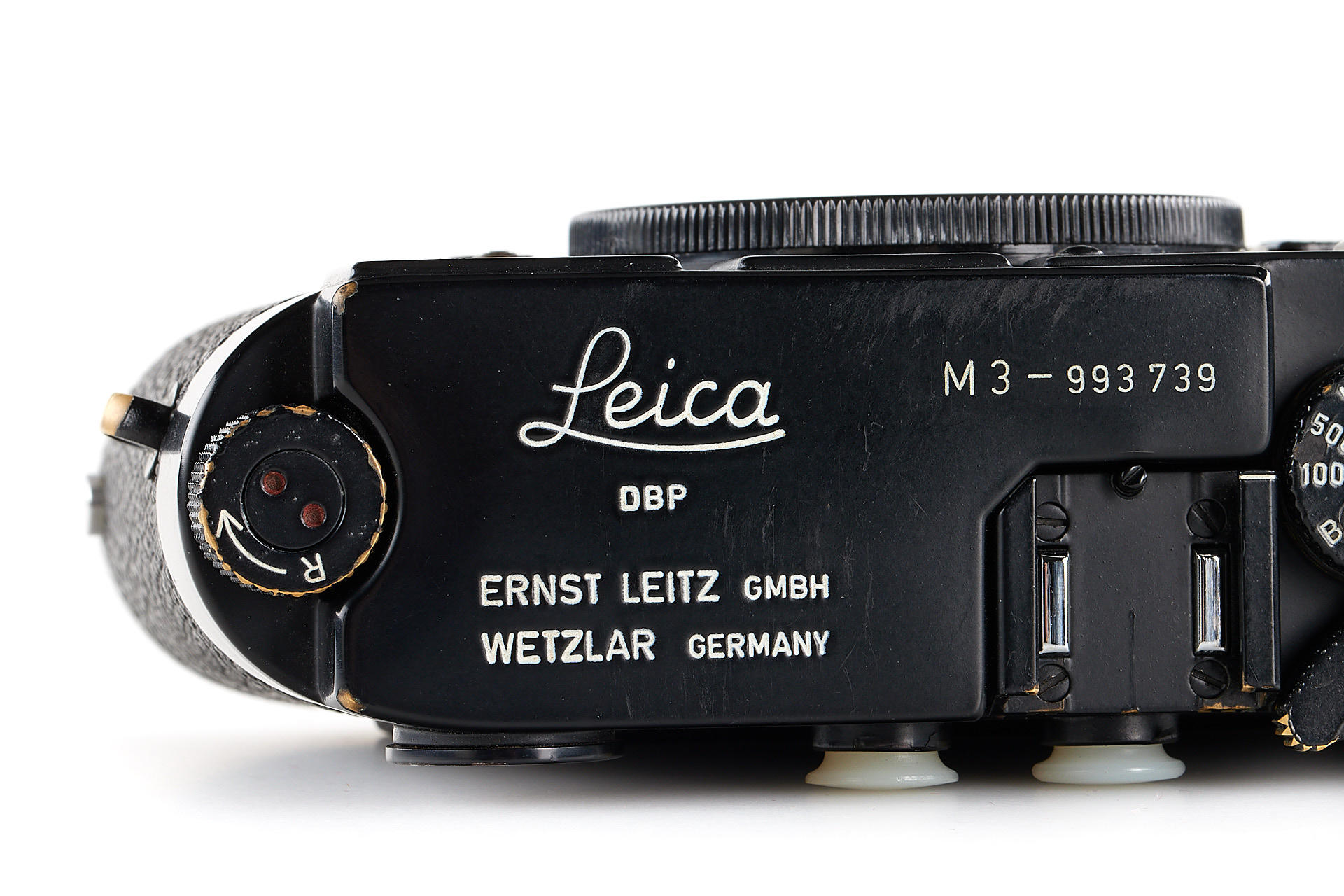 sought-after, original black paint M3 in excellent cosmetic condition, from the official batch of 250 cameras issued in 1960, the body still 'L'-sealed, with slight patina around the edges and small bubbles appearing in the paint, including maker's box with matching number, leather case, original body cap, Swedish instructions and black paint Leica-Meter MC