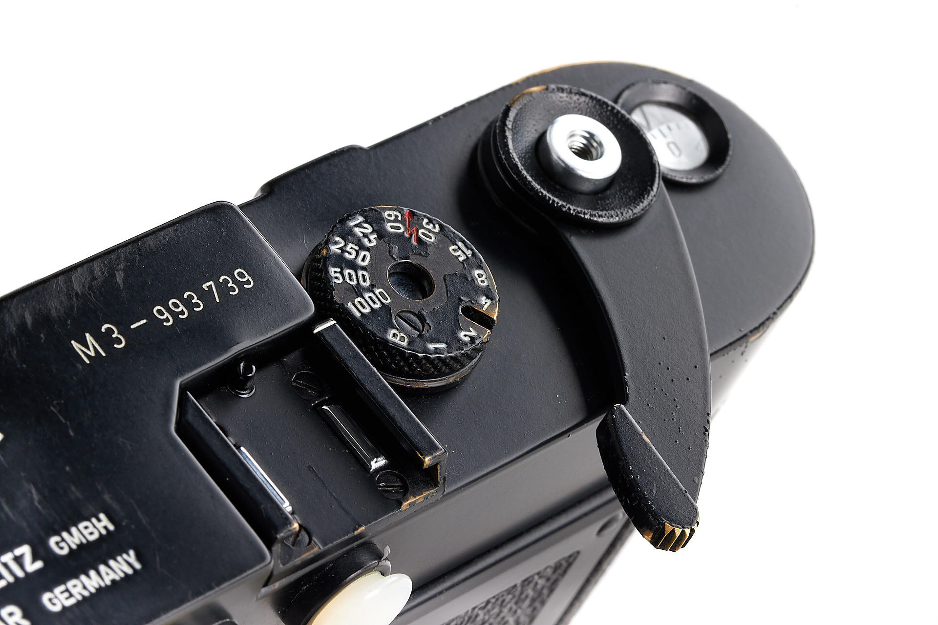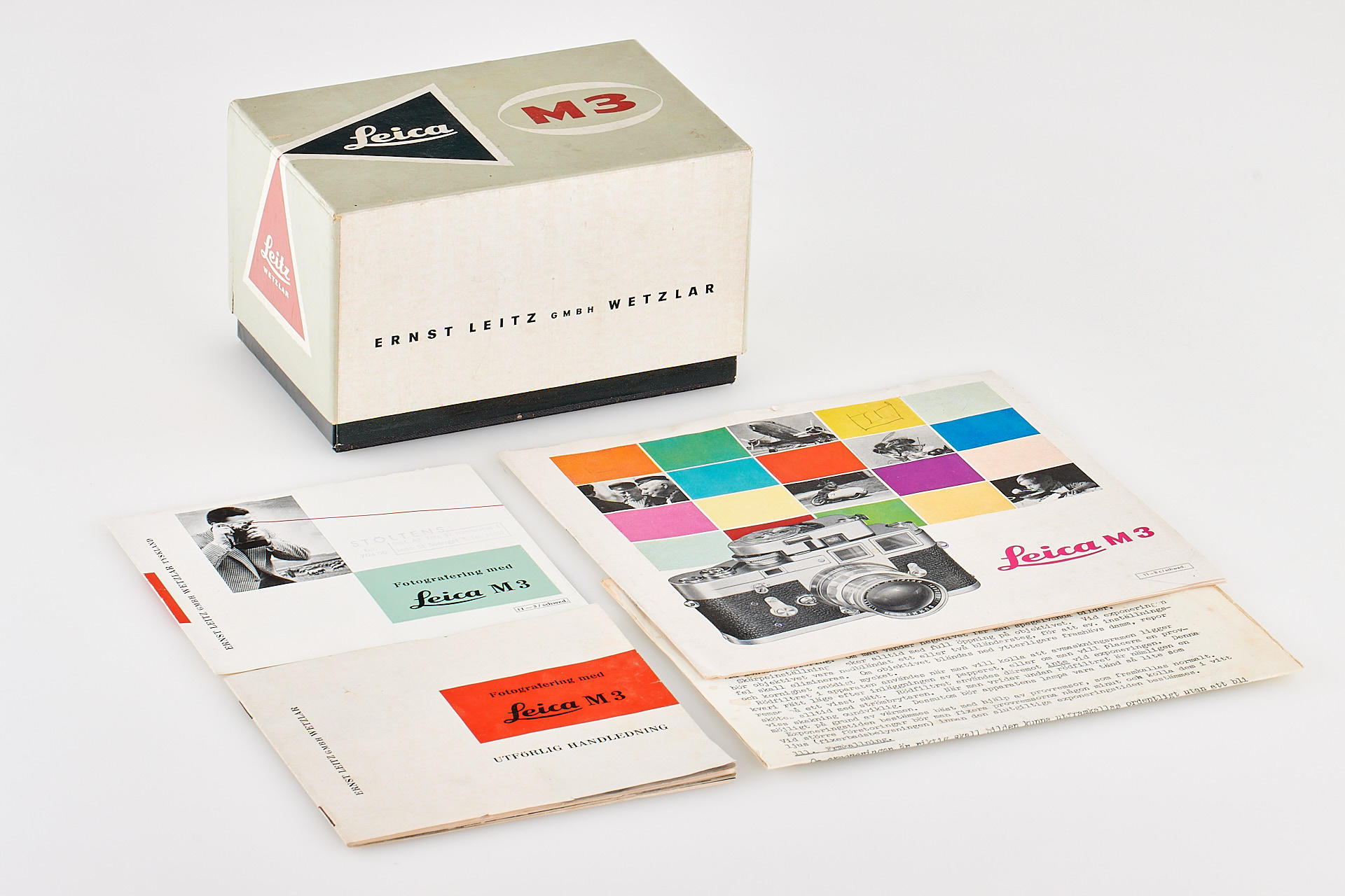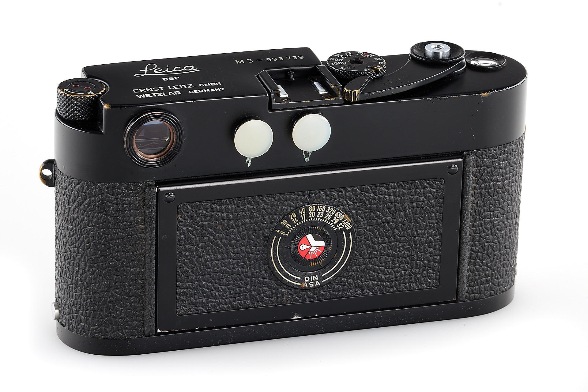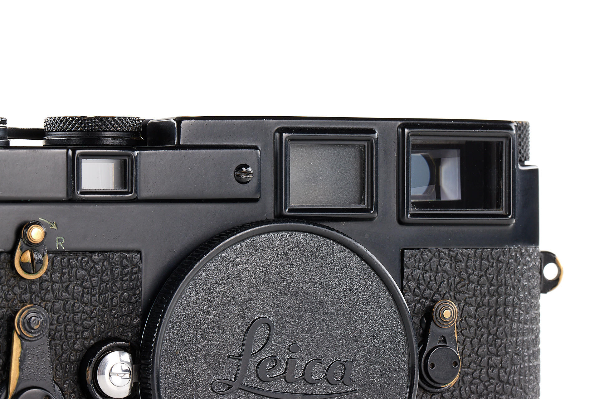 sought-after, original black paint M3 in excellent cosmetic condition, from the official batch of 250 cameras issued in 1960, the body still 'L'-sealed, with slight patina around the edges and small bubbles appearing in the paint, including maker's box with matching number, leather case, original body cap, Swedish instructions and black paint Leica-Meter MC