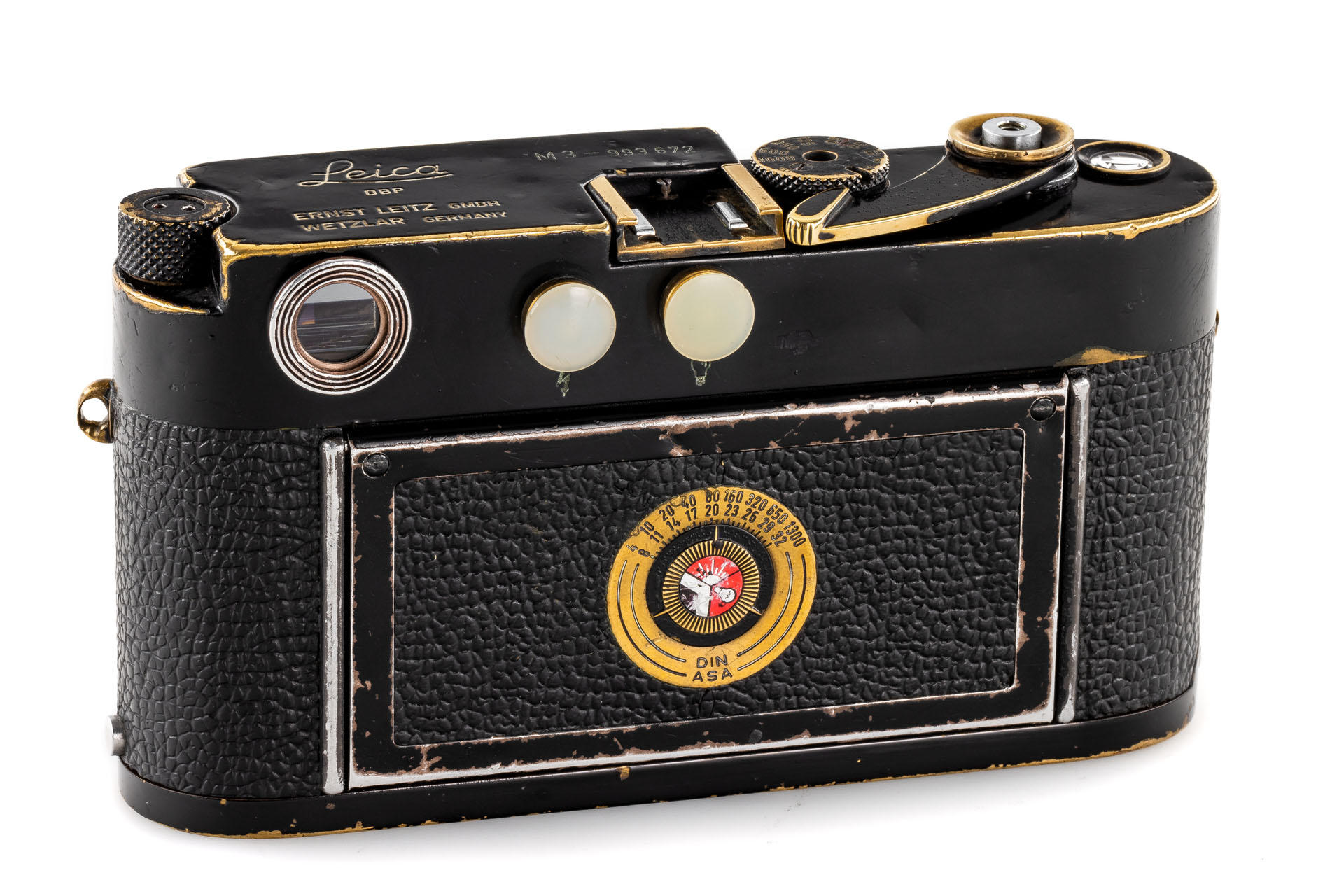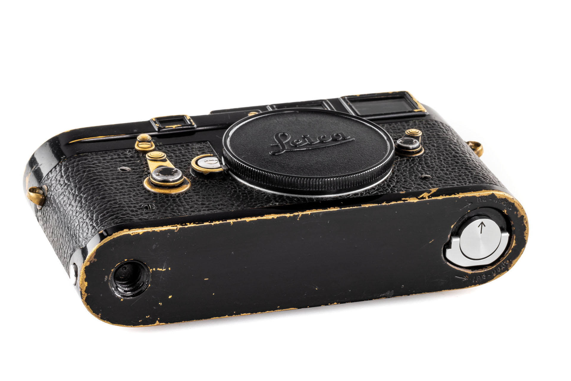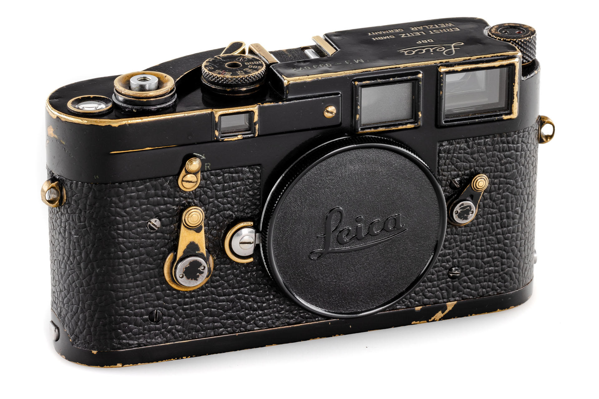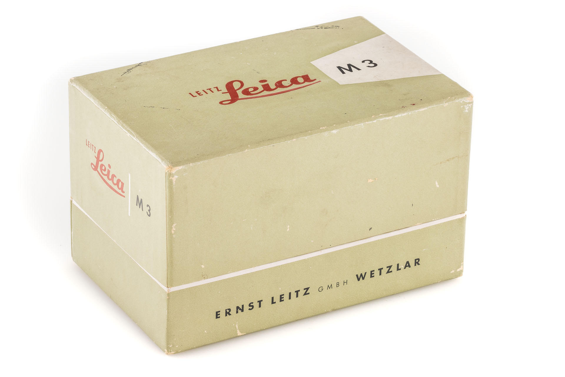 sought-after, original Leica M3 black paint from the second official production batch issued in 1960, in very good condition, an attractive patina of use around the edges, perfect working order, with an unnumbered M3 box and German instructions, the camera was delivered to Brandt, Sweden, on 14.04.1960.