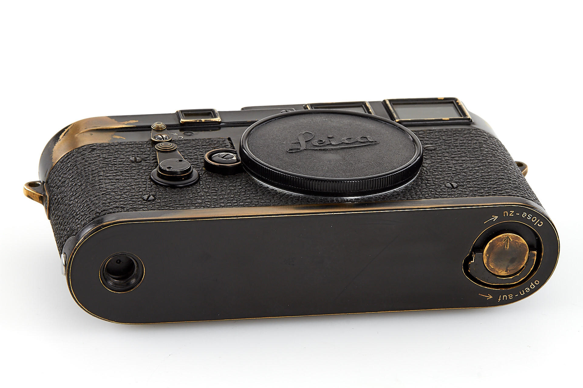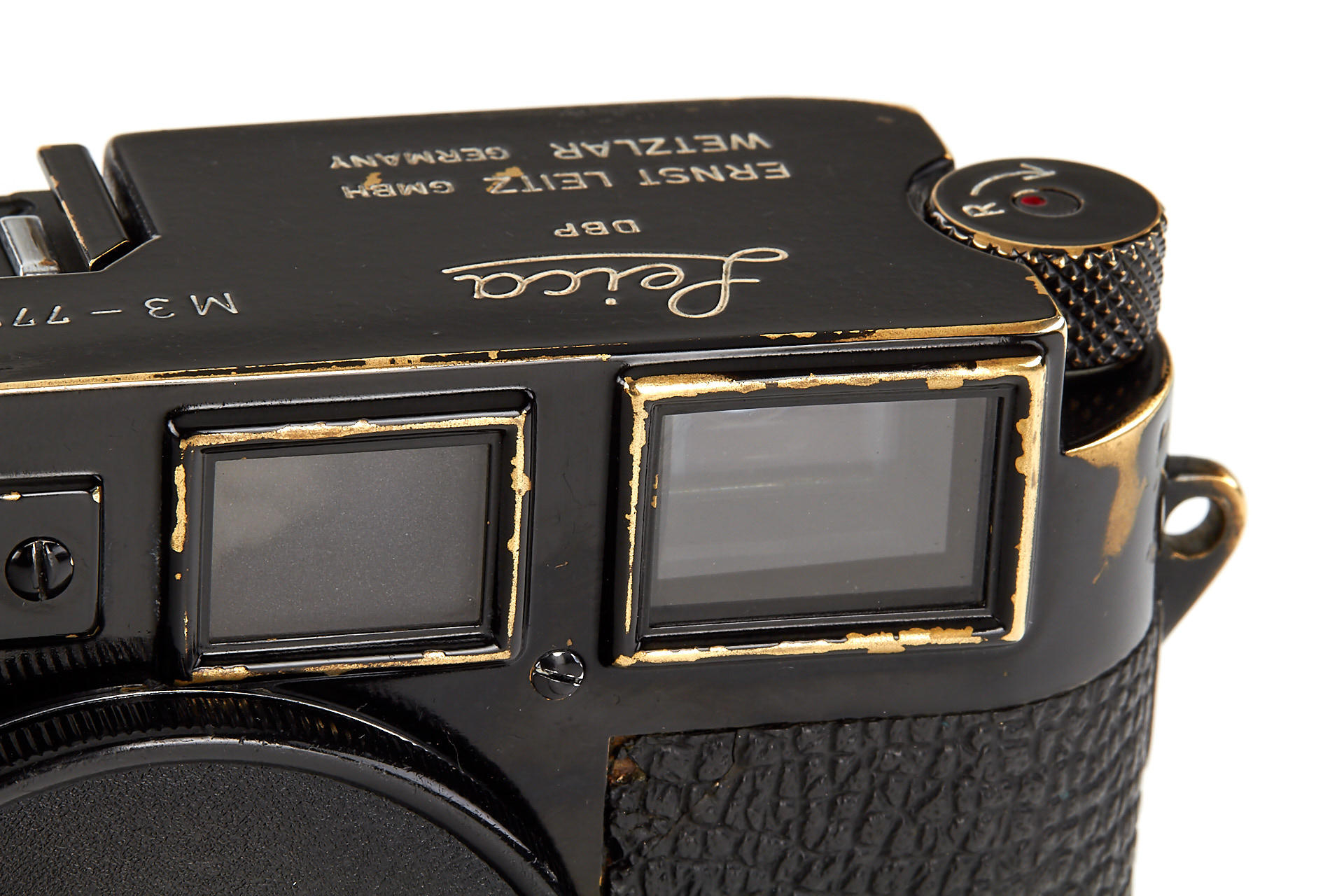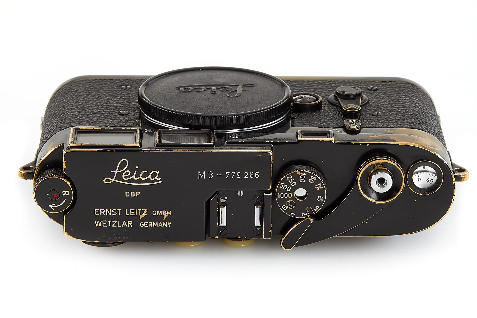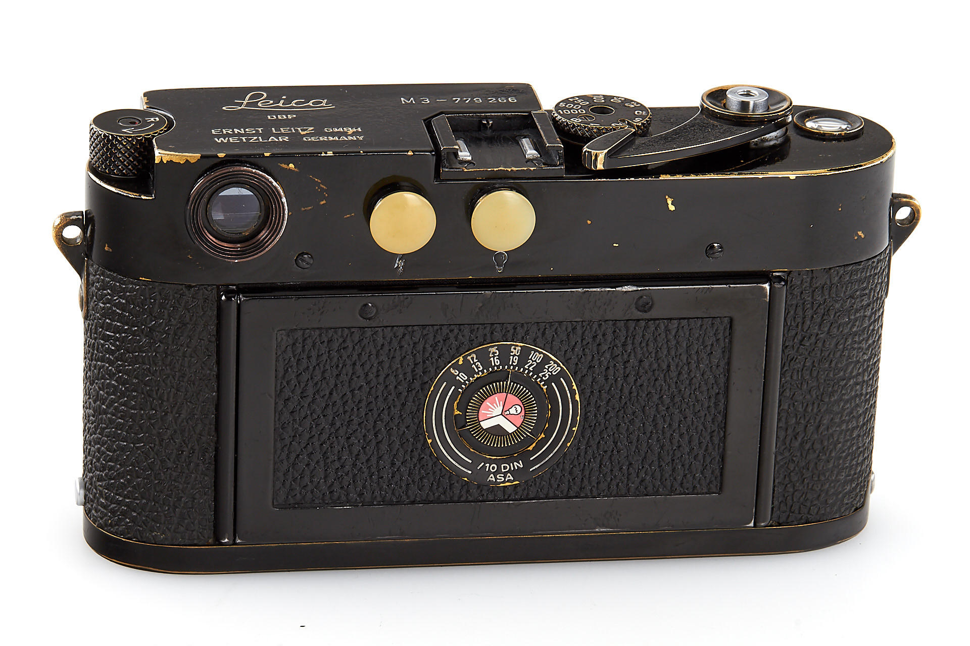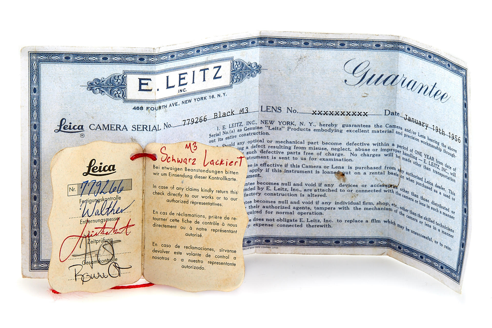 double stroke M3, converted by Leitz NY on customer's order to black paint, in fine condition, and very good working order, with leather case, control tag, Leitz NY warranty card from 1956 with the matching serial number and 'Black M3' note