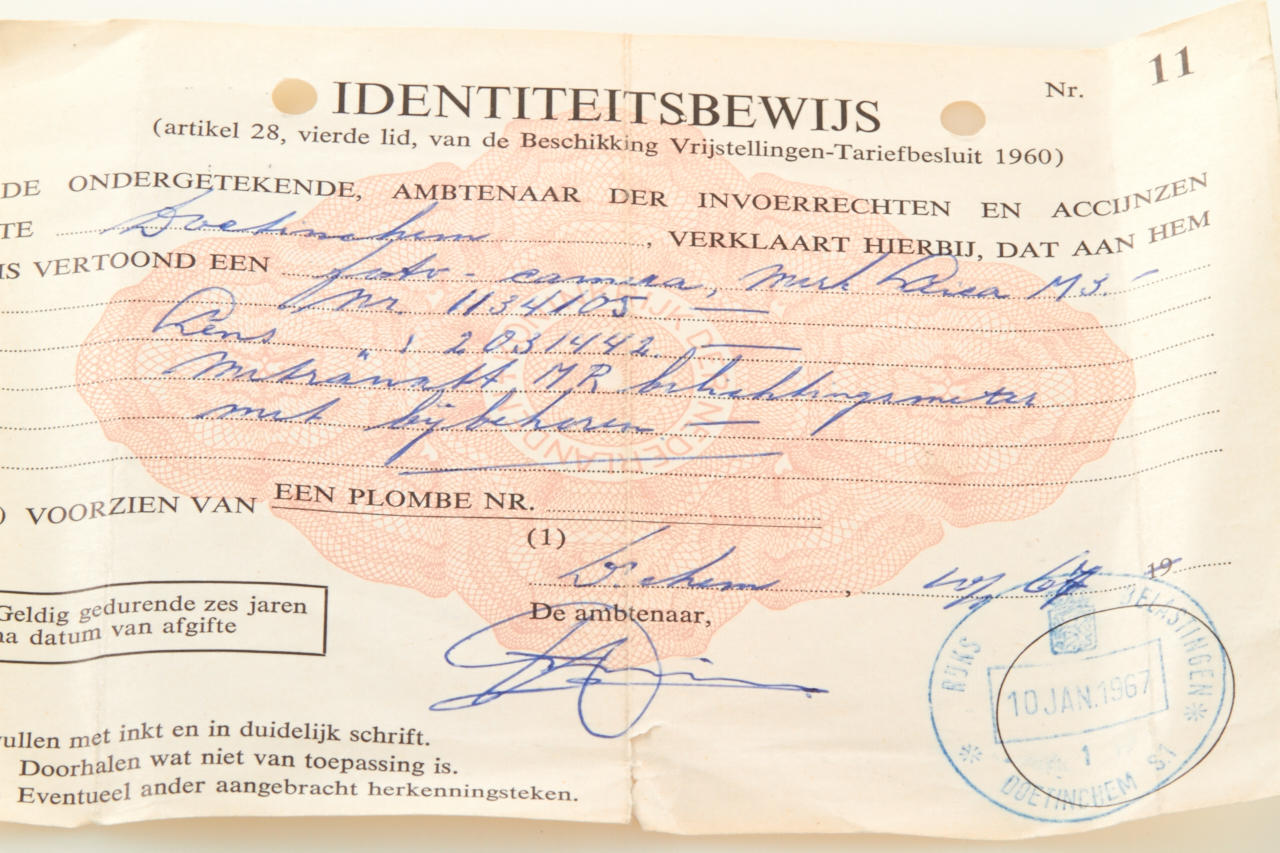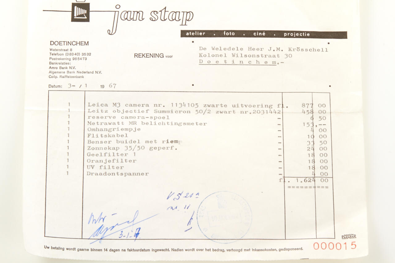 Extremely rare first owner outfit including a beautiful late production black paint M3 body no.1134105 (B+ condition, in perfect original and good working order, clean finder, perfect vulcanite, 'L' seal), original (!) M3 maker's box with matching number and instructions, black paint Summicron 2/50mm no.2031442 (in fine original B condition with clean lenses, cap, hood, original '11117 A' maker's box with matching number), black paint Leica-Meter MR no.26579 with maker's box, three filters - the outfit comes with the Leica Service Card with matching numbers for camera and lens, the Dutch 'IDENTITEITSBEWIJS' for camera and lens + the original sales invoice by Jan Stap in Doetinchem, The Netherlands listing the complete outfit in detail with prices - we have never seen such complete set of a black M3!