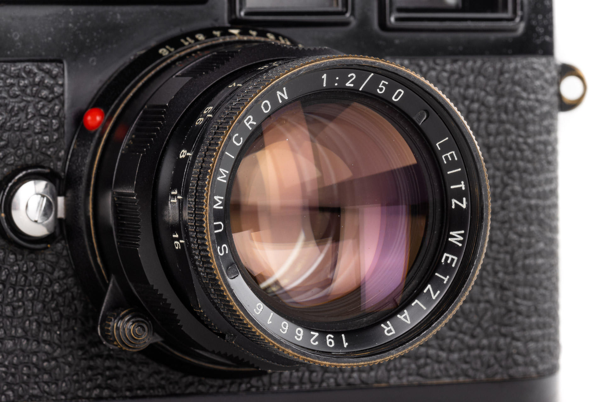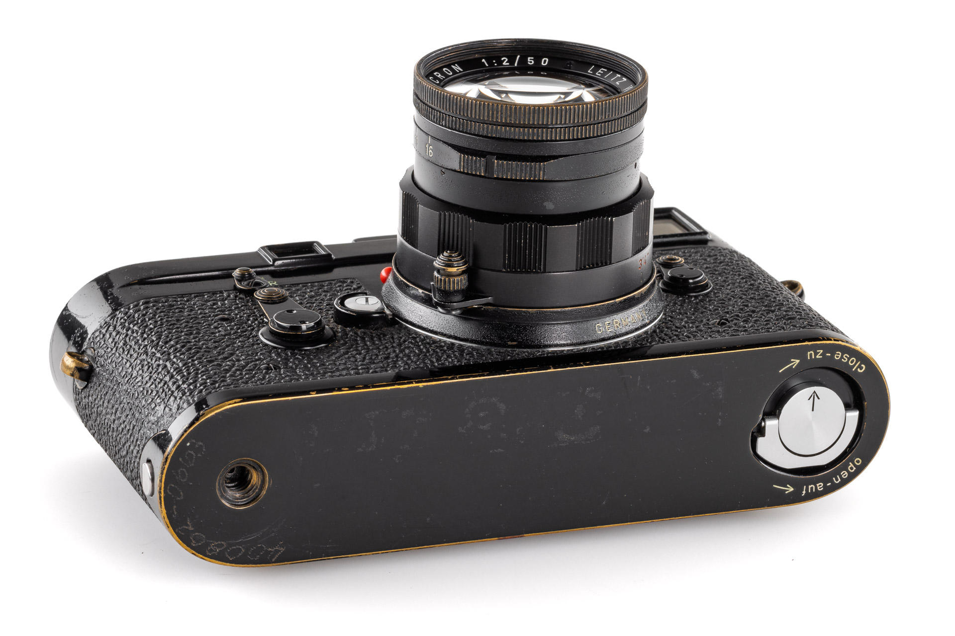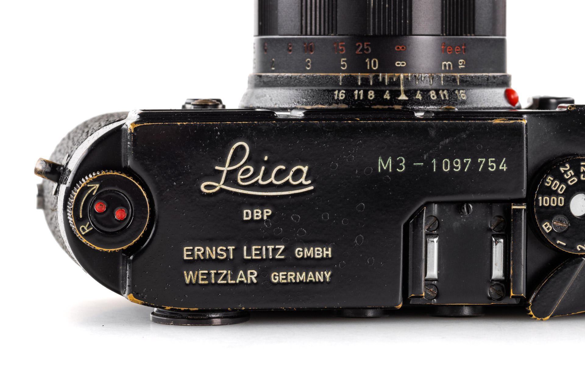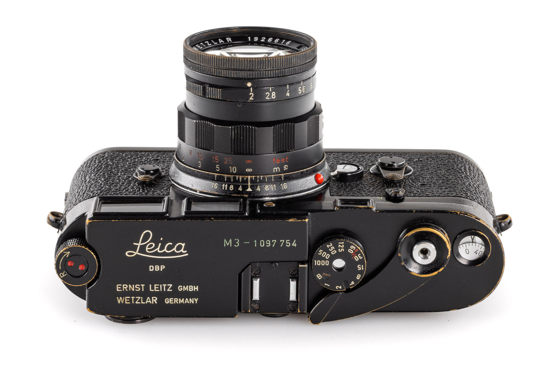A black paint M3 from an official batch of 150 cameras delivered in 1964 (nos.1097701-1097850), in beautiful and original condition with its most desirable patina showing the typical bubbles appearing in the paint, a reference number hand-engraved on the bottom plate, with a beautiful, matching black paint Summicron 2/50mm no.1926616 issued in 1962, with very good optics including a black paint lens cap, a truly classic and sought-after combination, the camera was initially delivered to Brandt, Sweden, on 18.08.1965, the lens to Copenhagen, on 12.07.1966