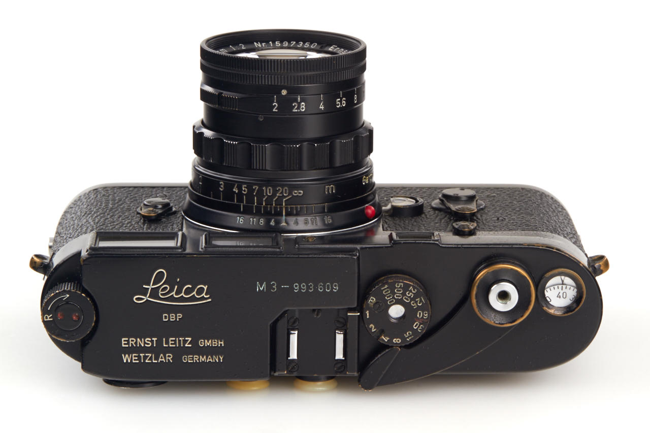 rare black paint M3 body in beautiful and 100% original condition, never repainted or restored, clean finder, perfect shutter, 'L' sealed, made in a batch of 250 cameras (nos.993501-993750) in 1960, with matching and original black paint Summicron 2/5cm no.1597350 (also in excellent condition with clean optics, black lens mount, black cap)