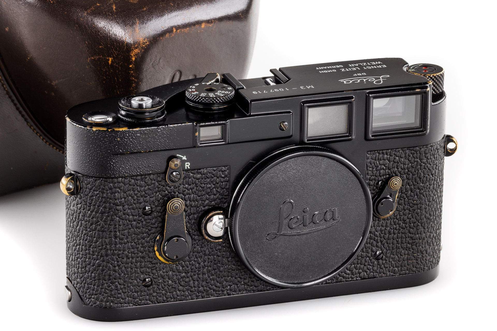 a sought-after, original black paint Leica M3, in beautiful condition with only minimal patina around the edges and typical bubbles appearing in the paint in all the right places, with leather case and body cap, the camera was delivered to Tiranty, Paris, on 13.08.1965